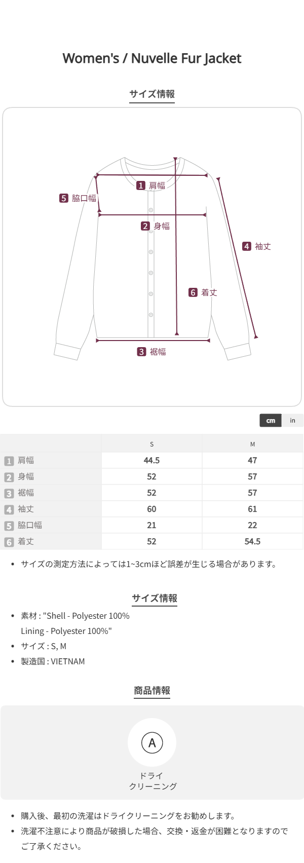※ ファー特性により、保管および着用時に毛抜けが発生する場合がありますので、洗濯後の着用をおすすめします。