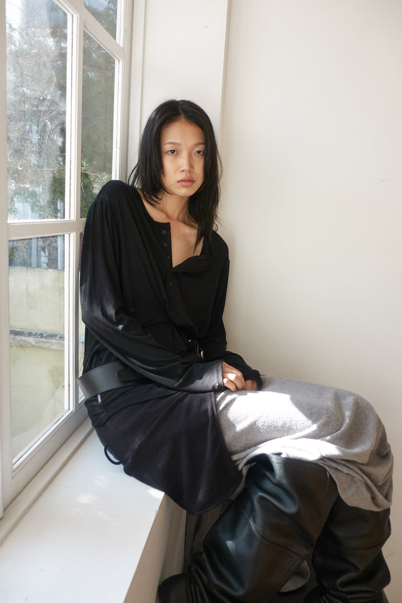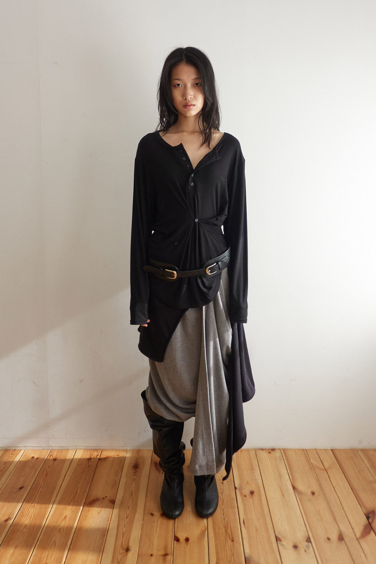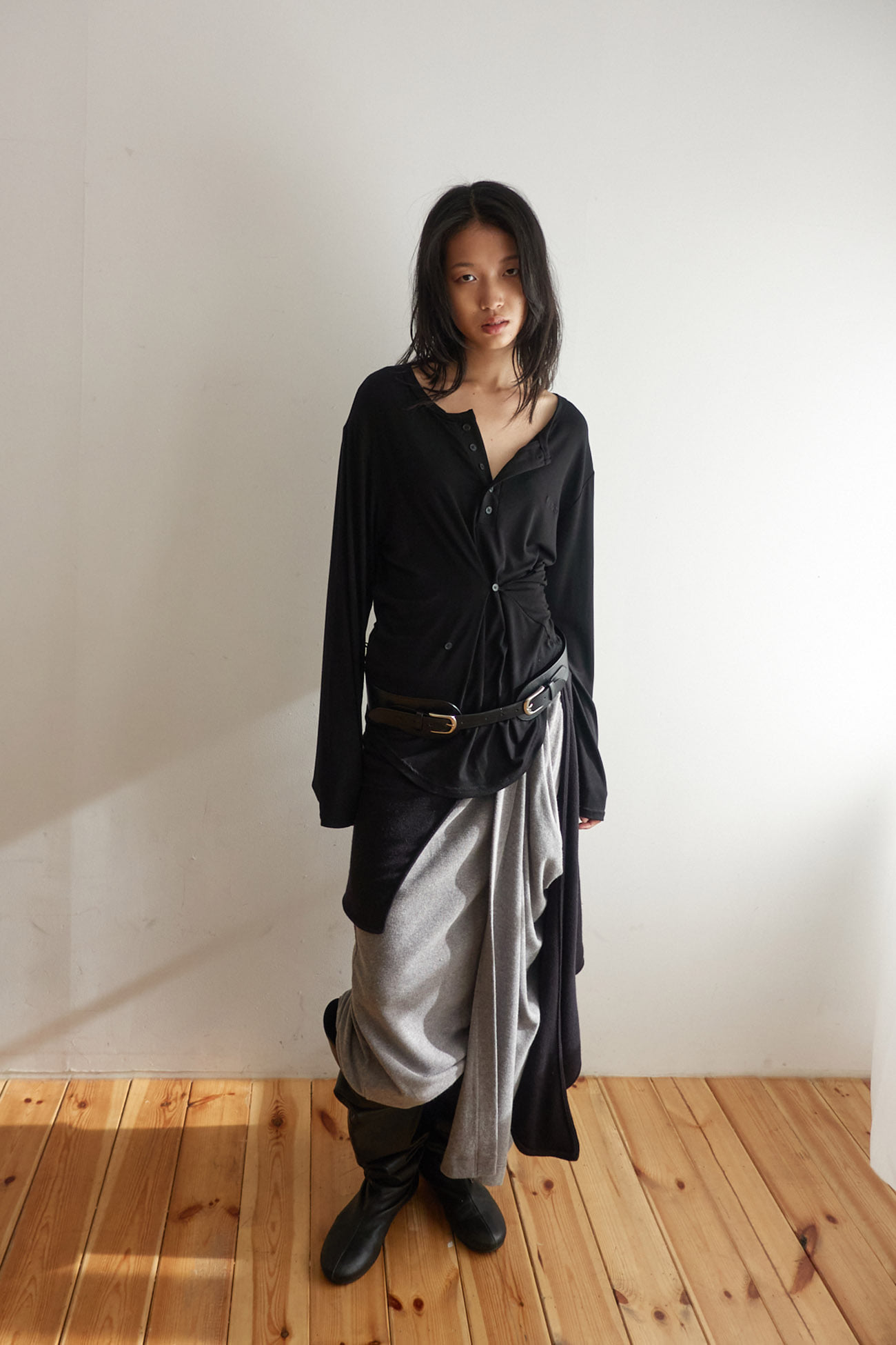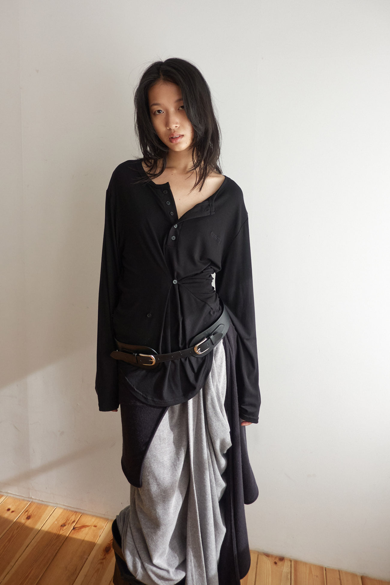 BUTTON HENLEY NECK TOP / BLACK