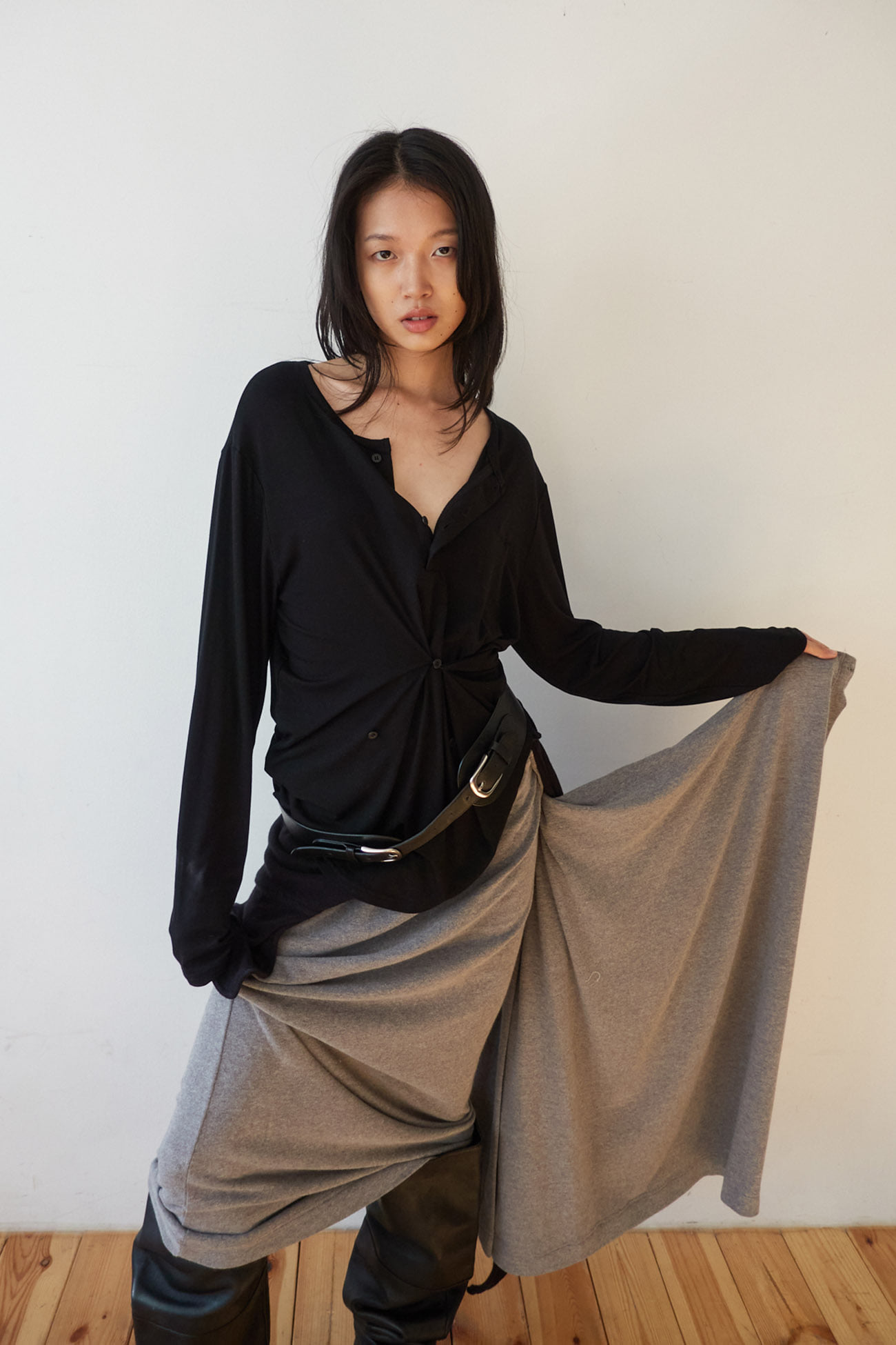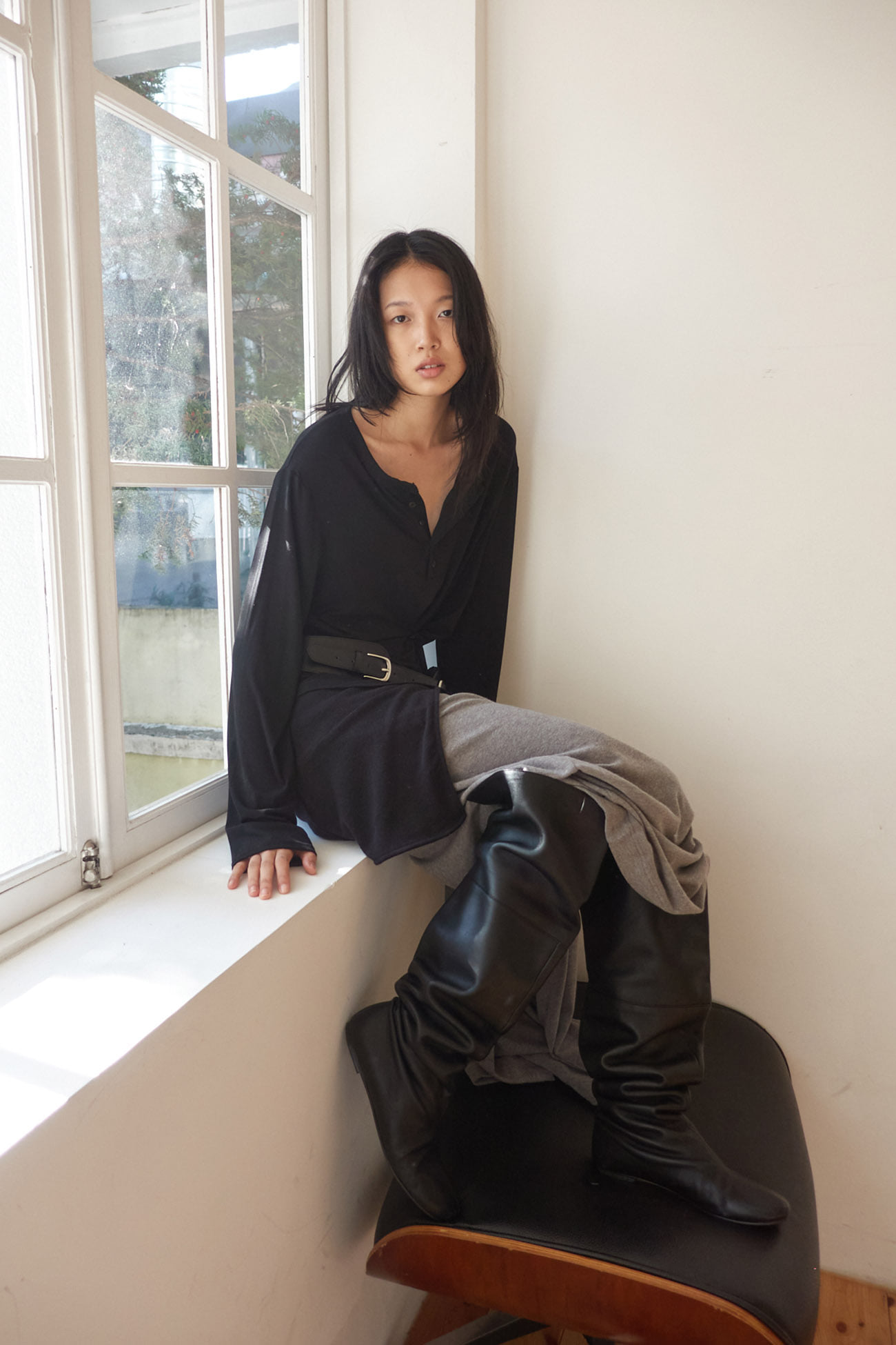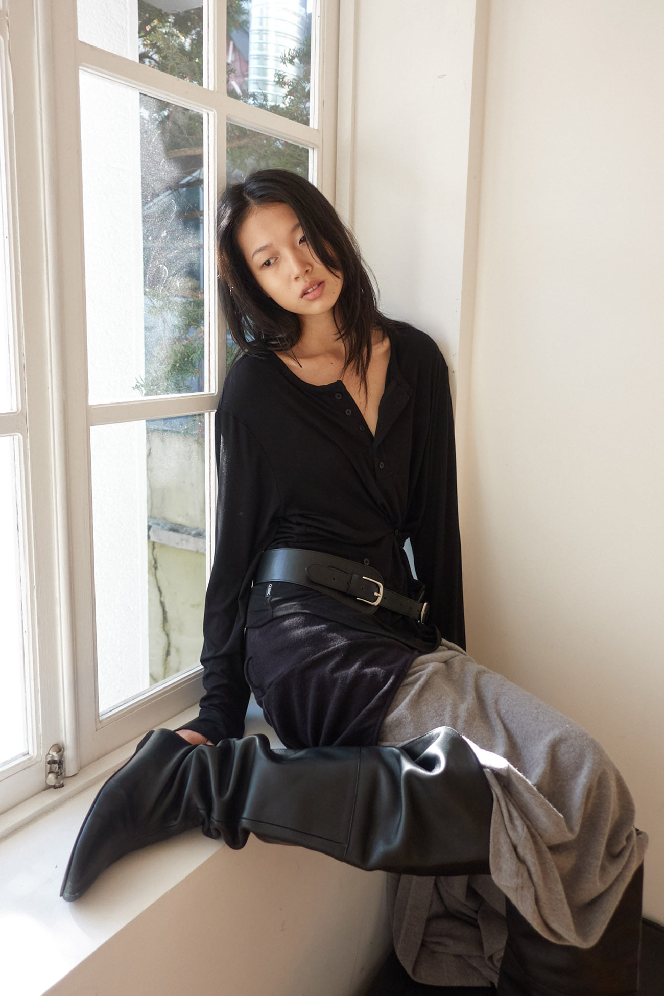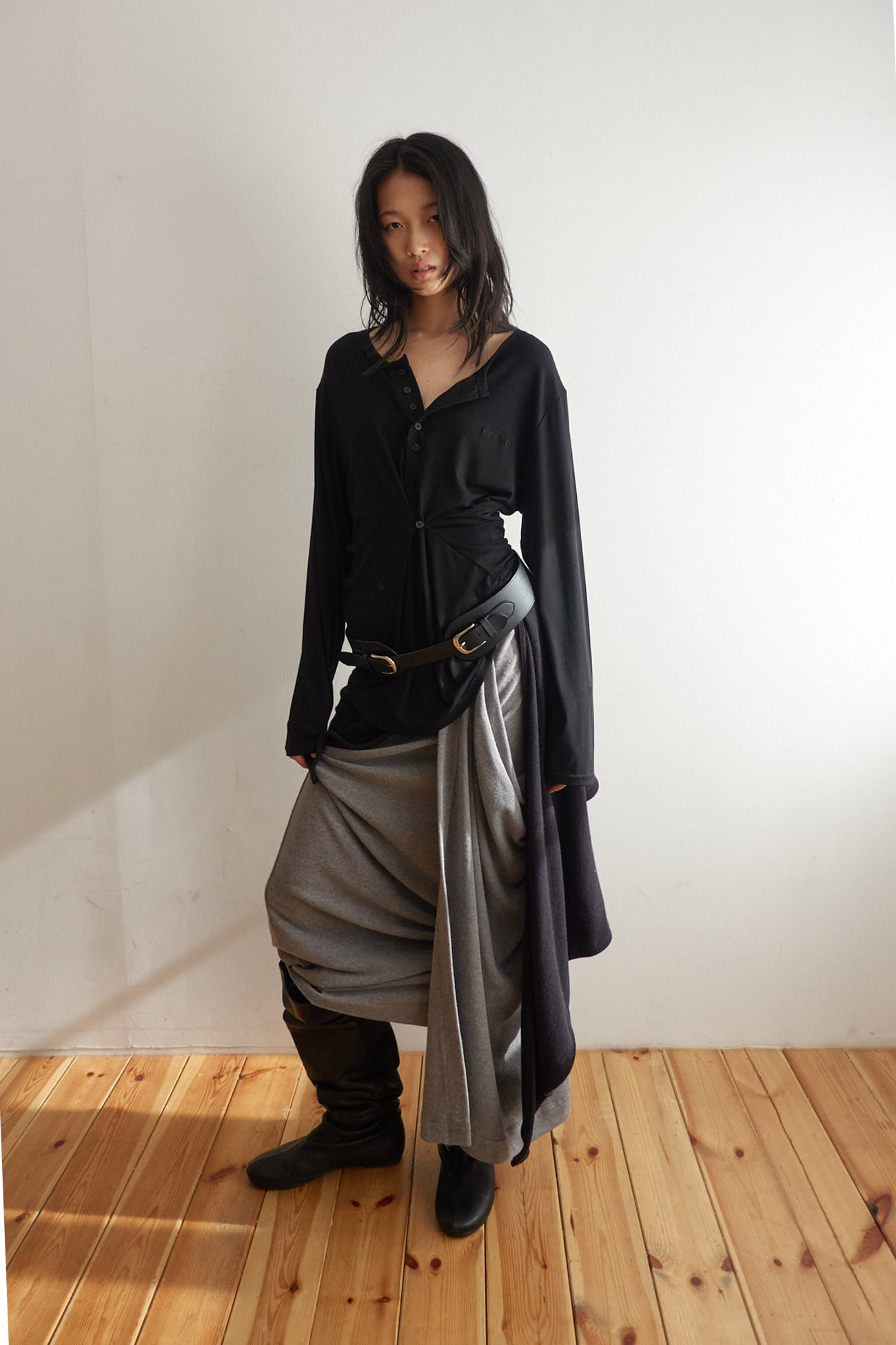 BUTTON HENLEY NECK TOP / BLACK