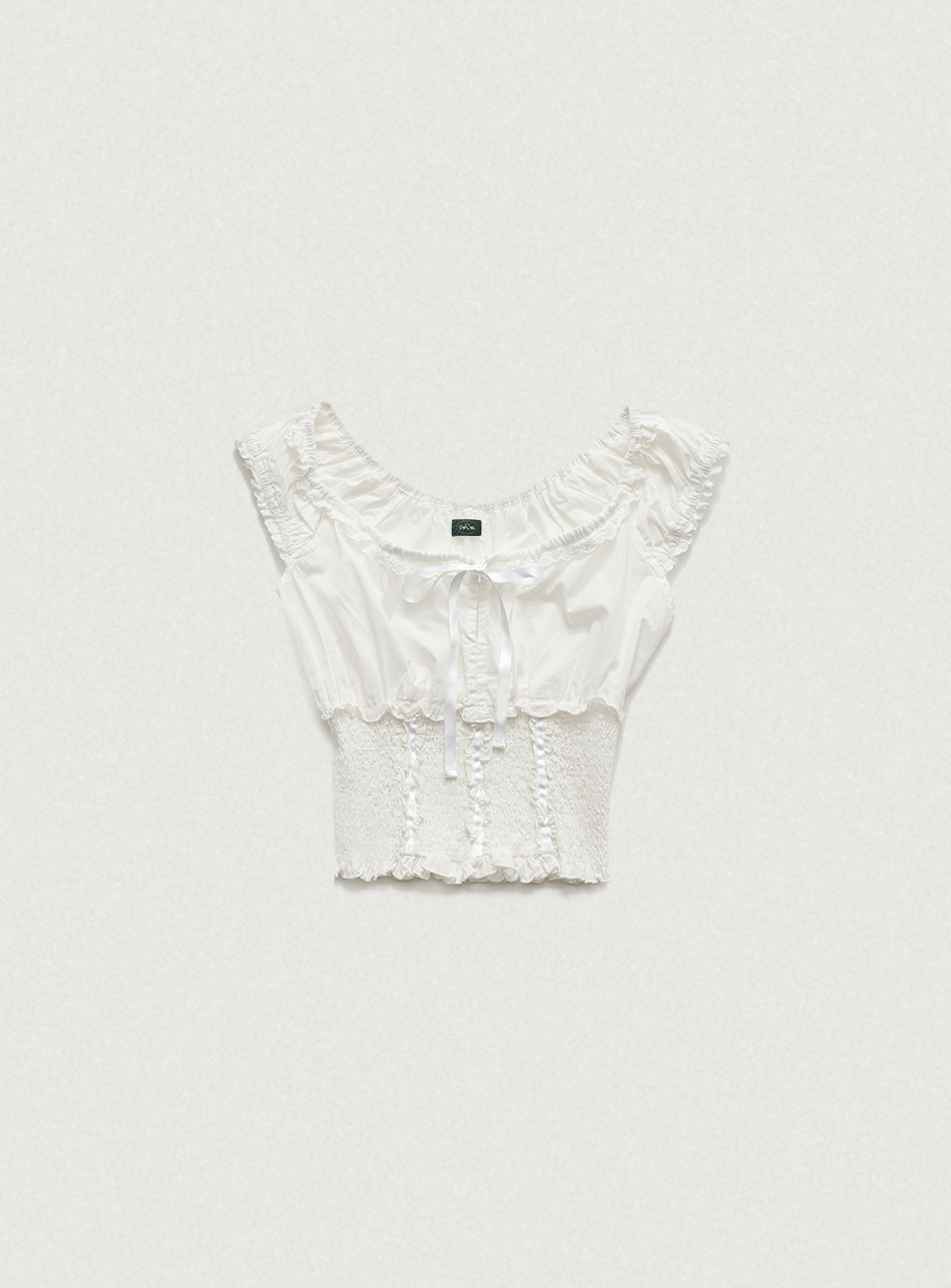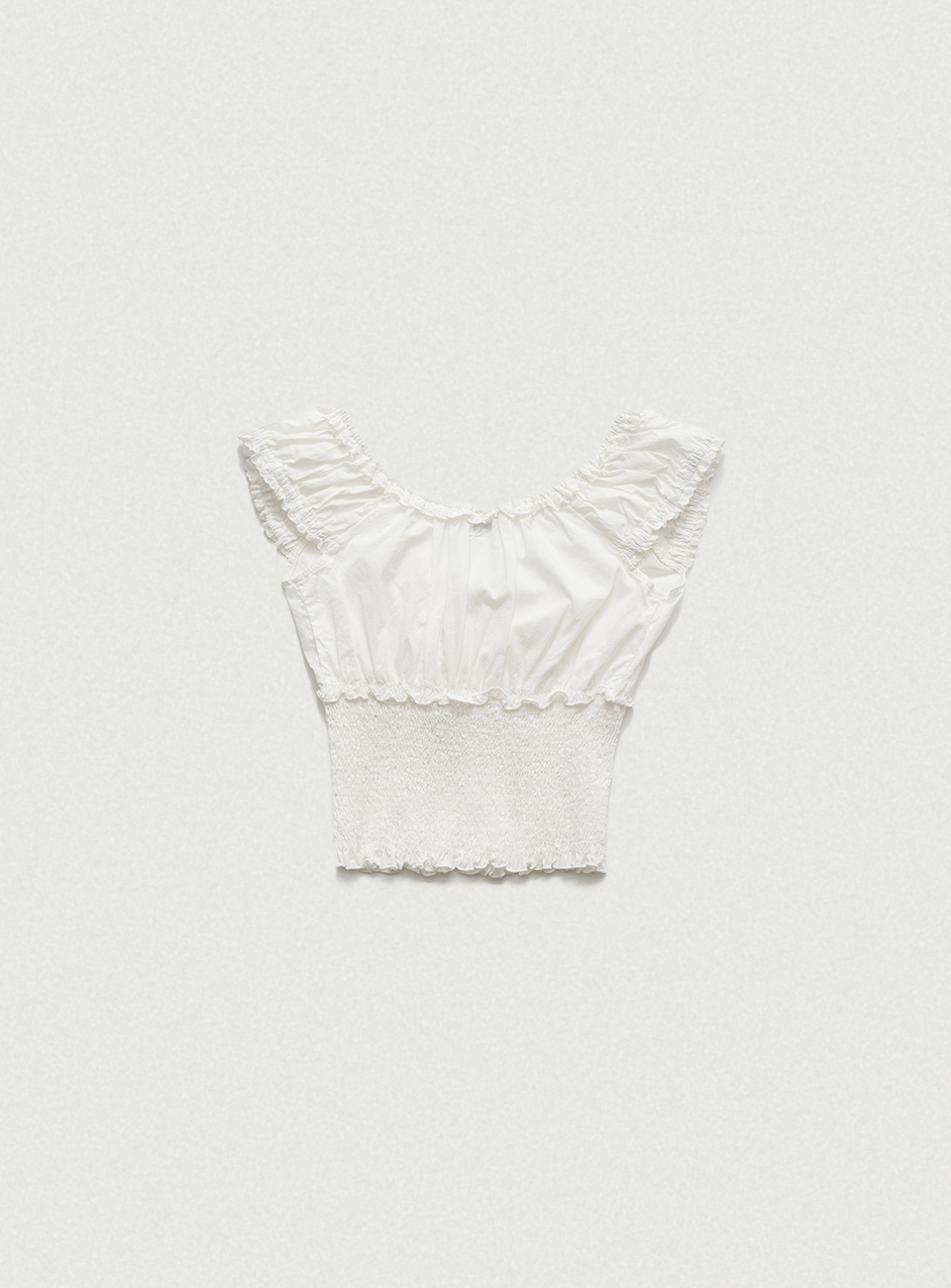 クロップド丈でオフショルダーとしても着用可能なブラウスタイプ。