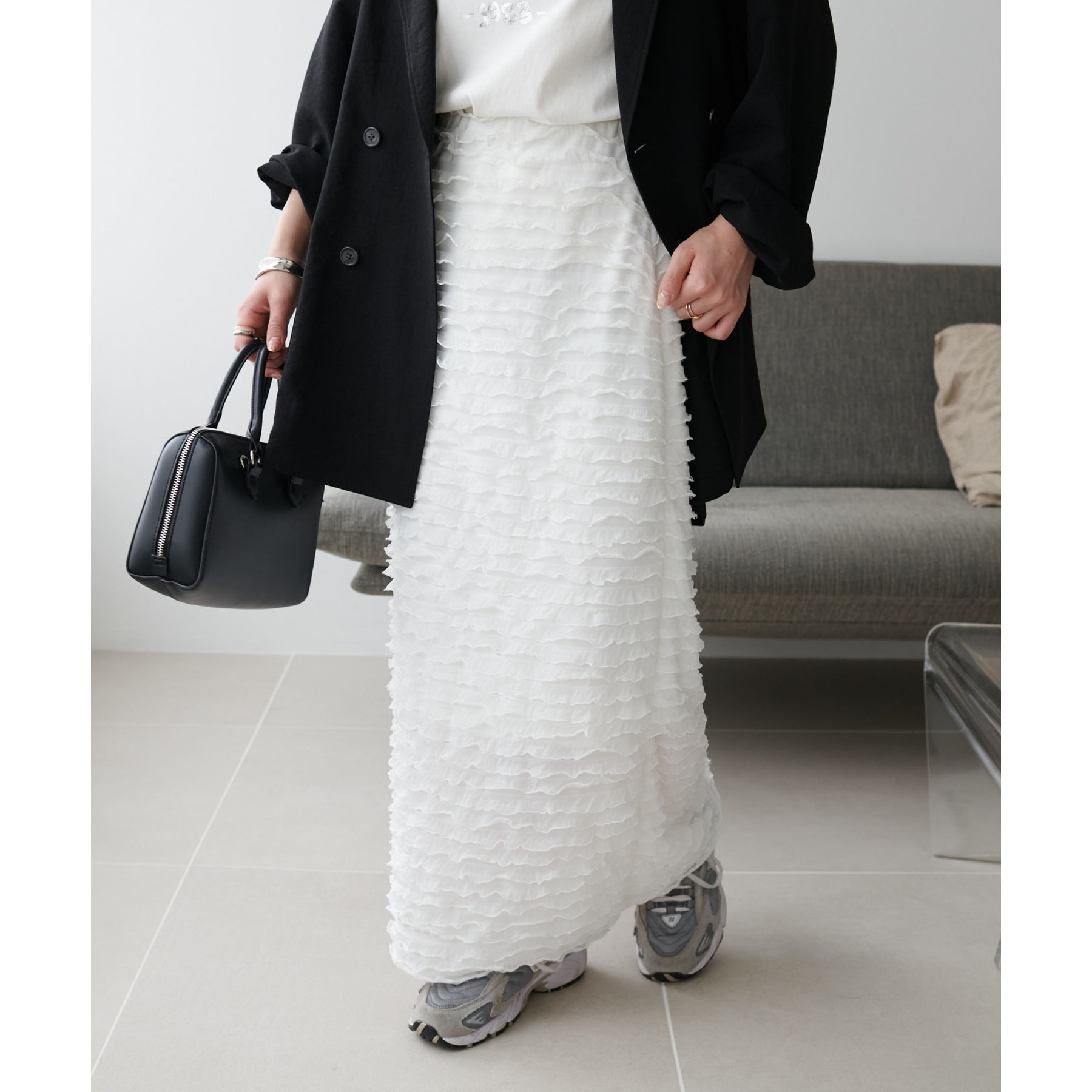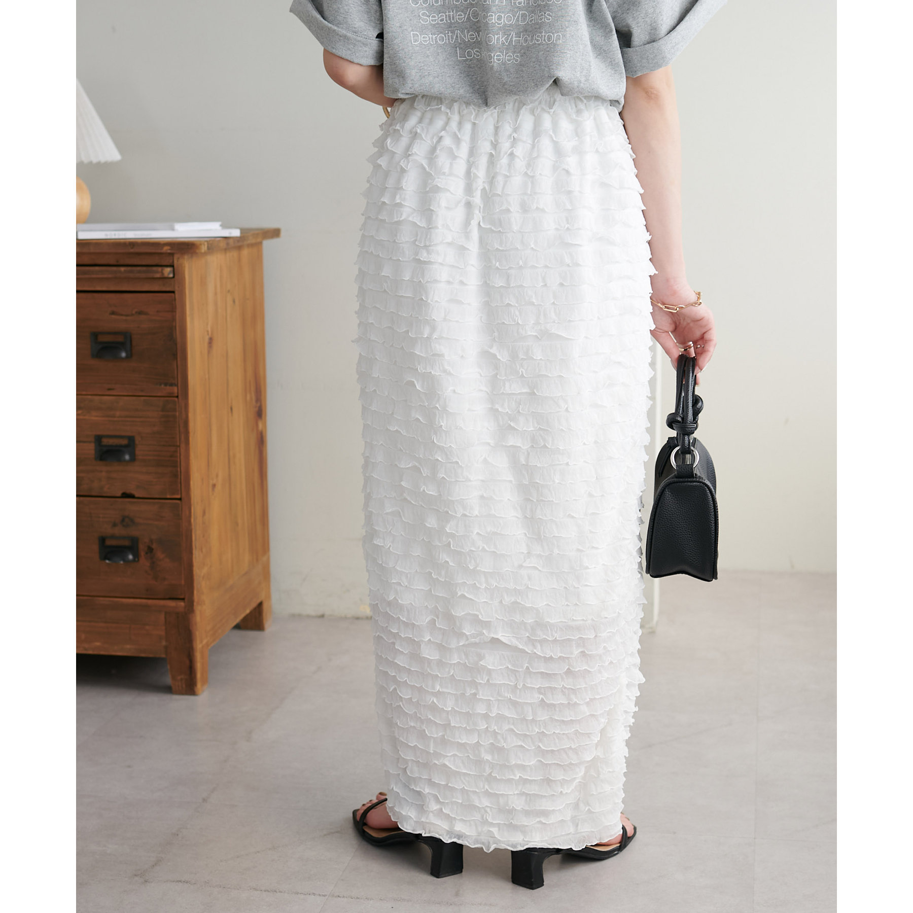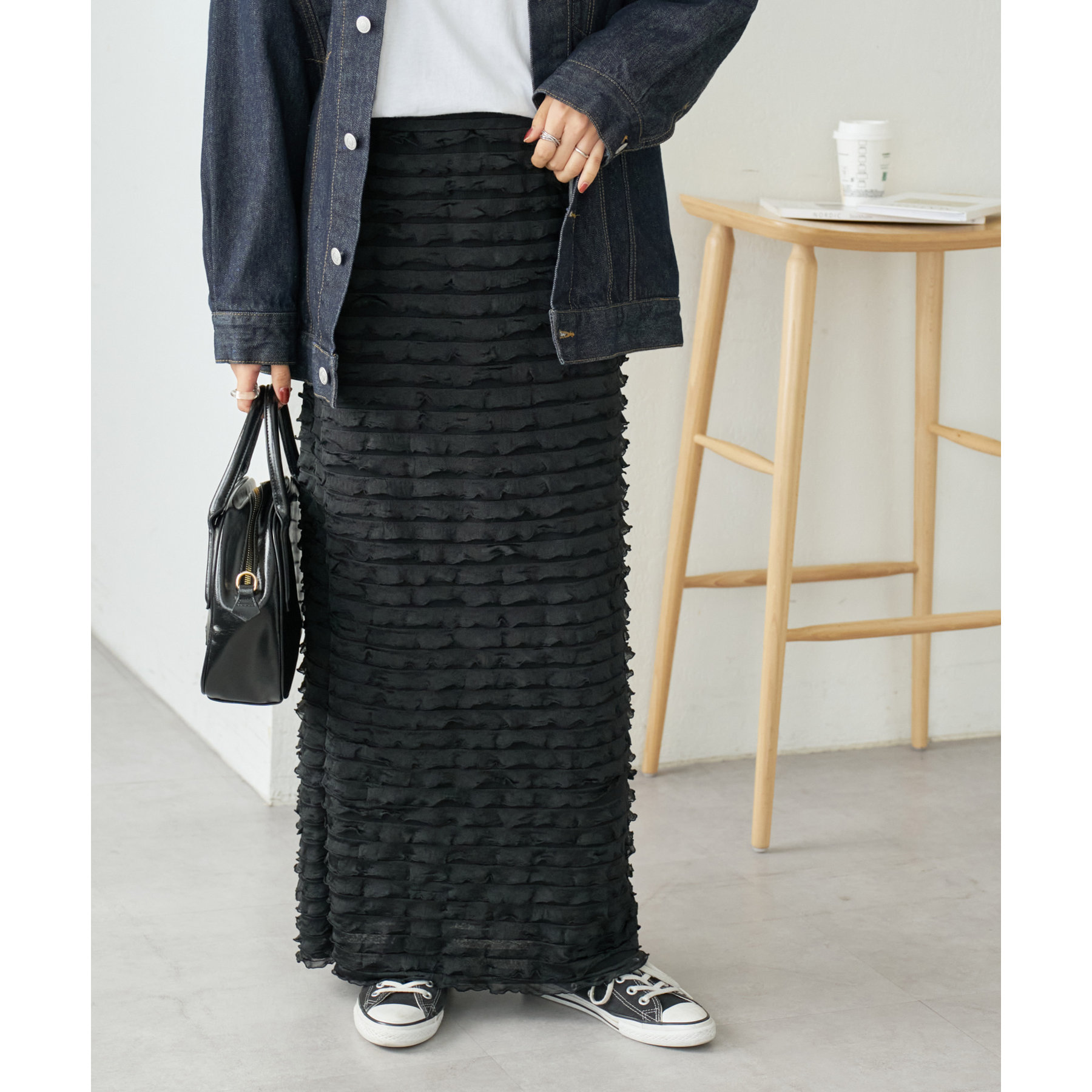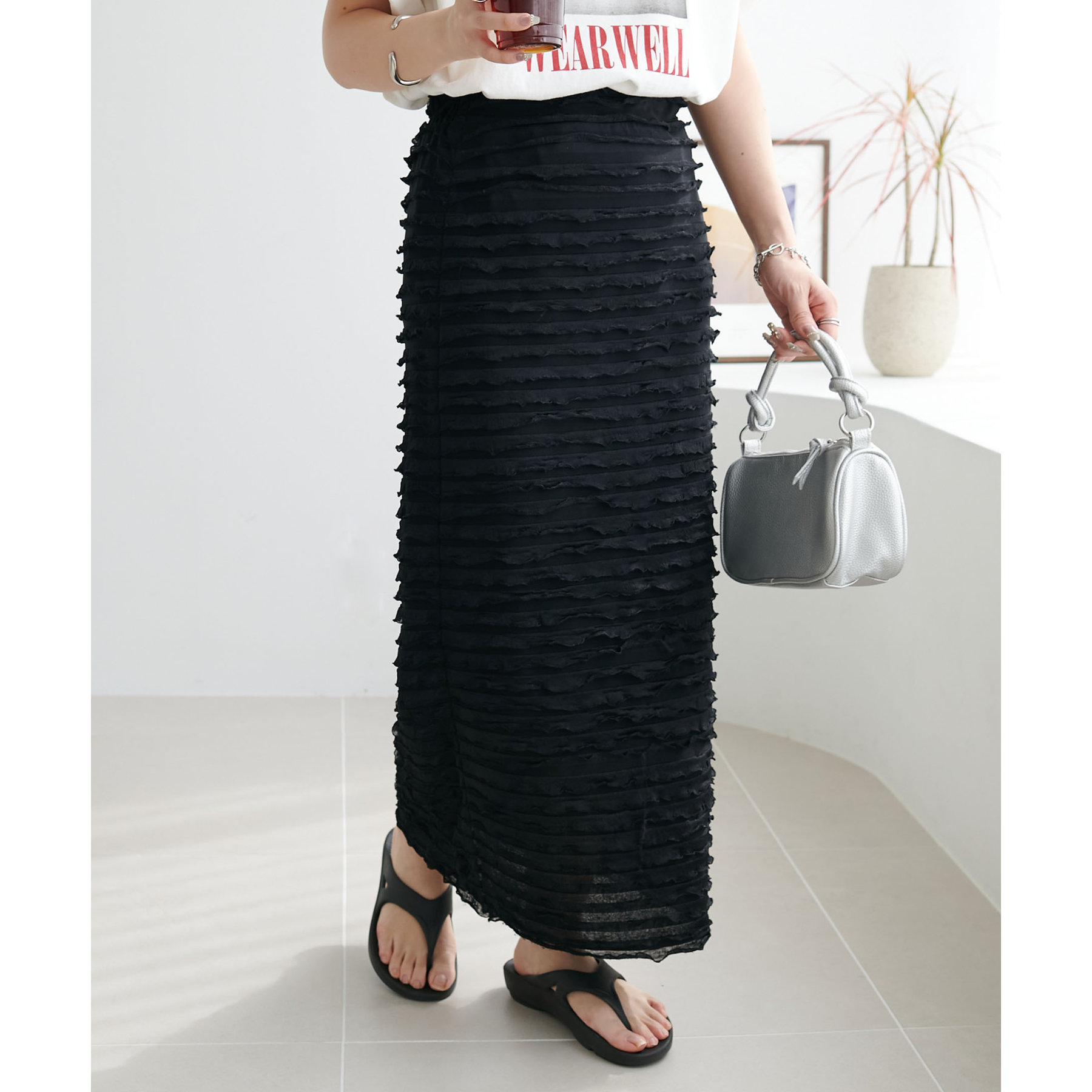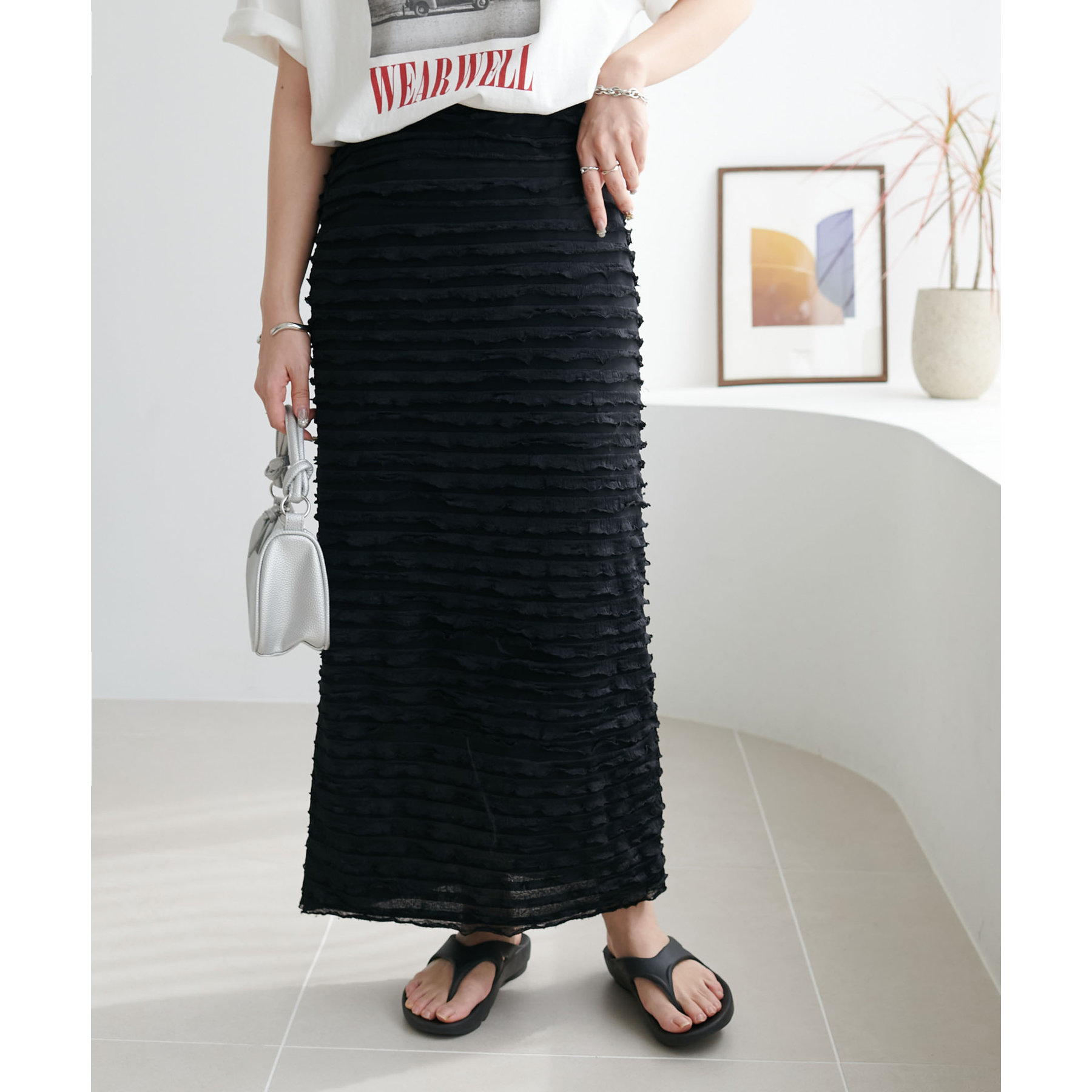 表面変化のあるフリルティアードがアクセントになり、シンプルコーデでも映えるスカート。