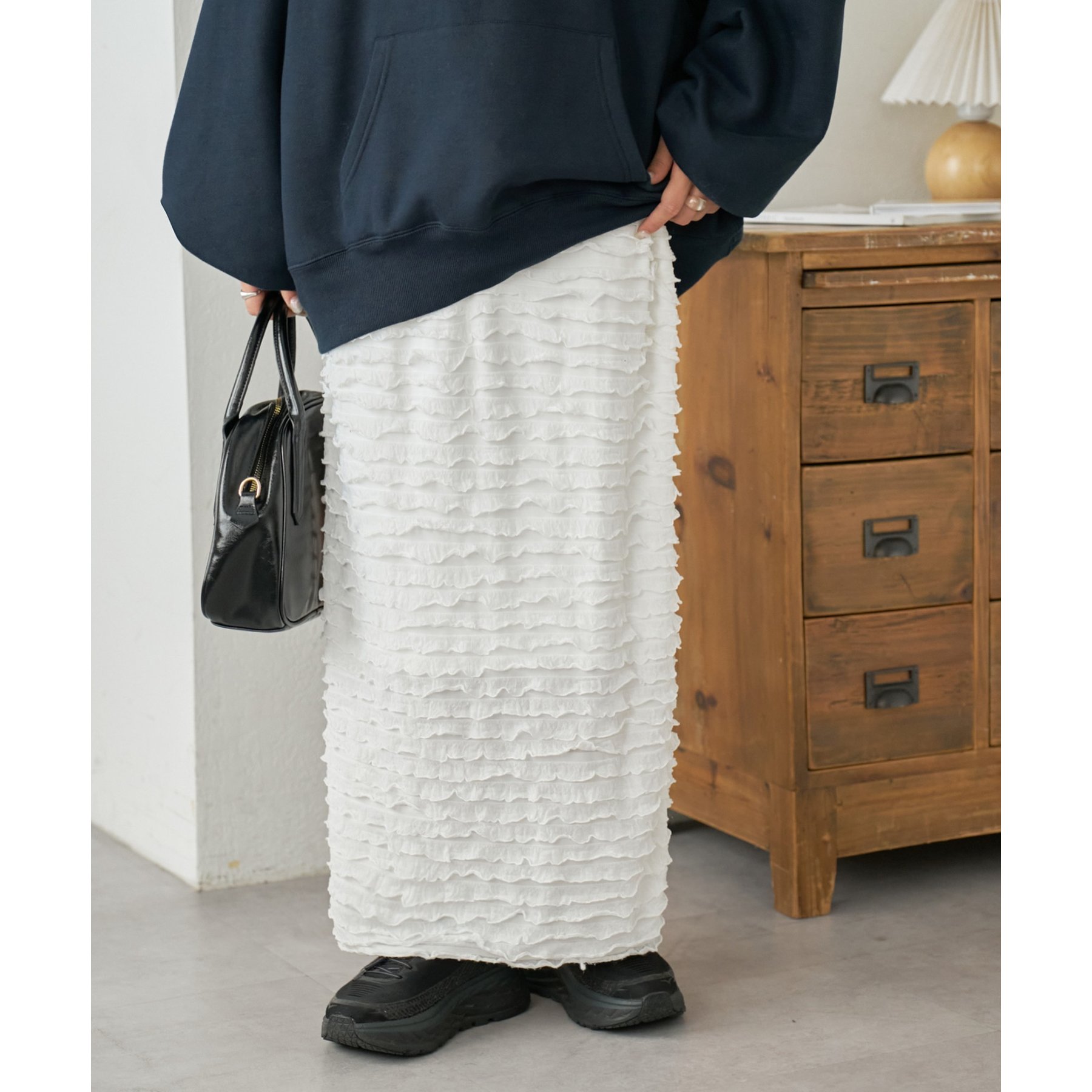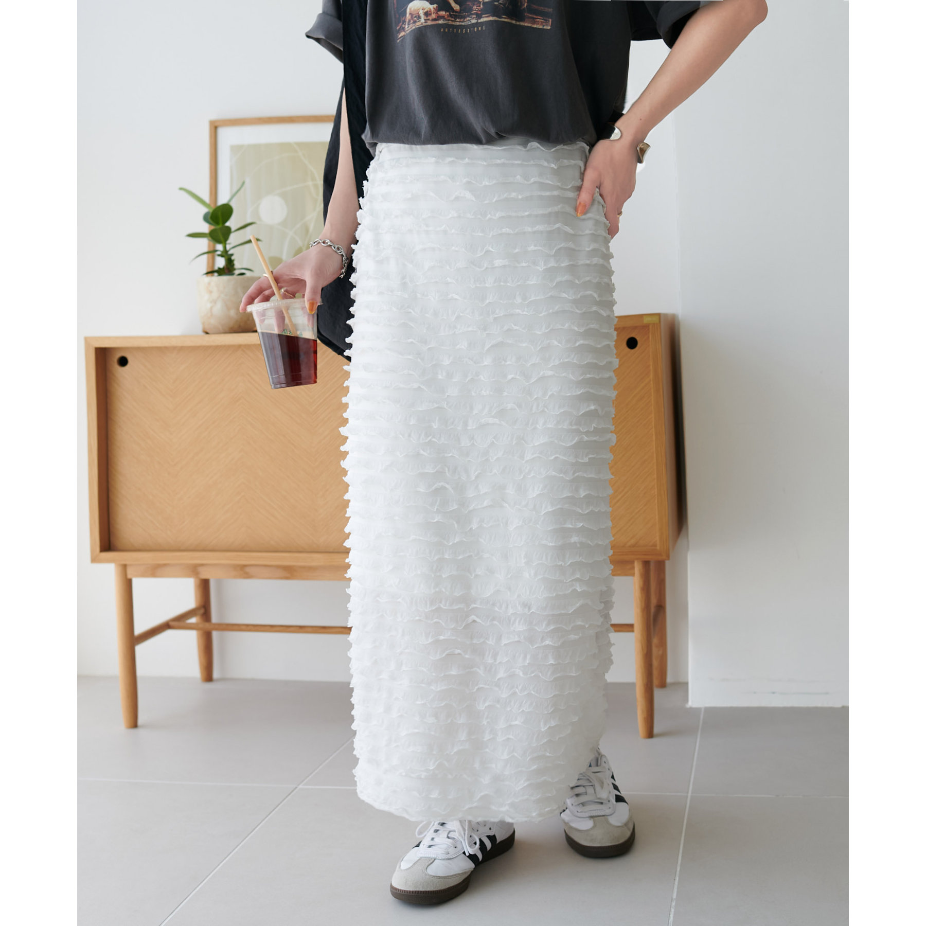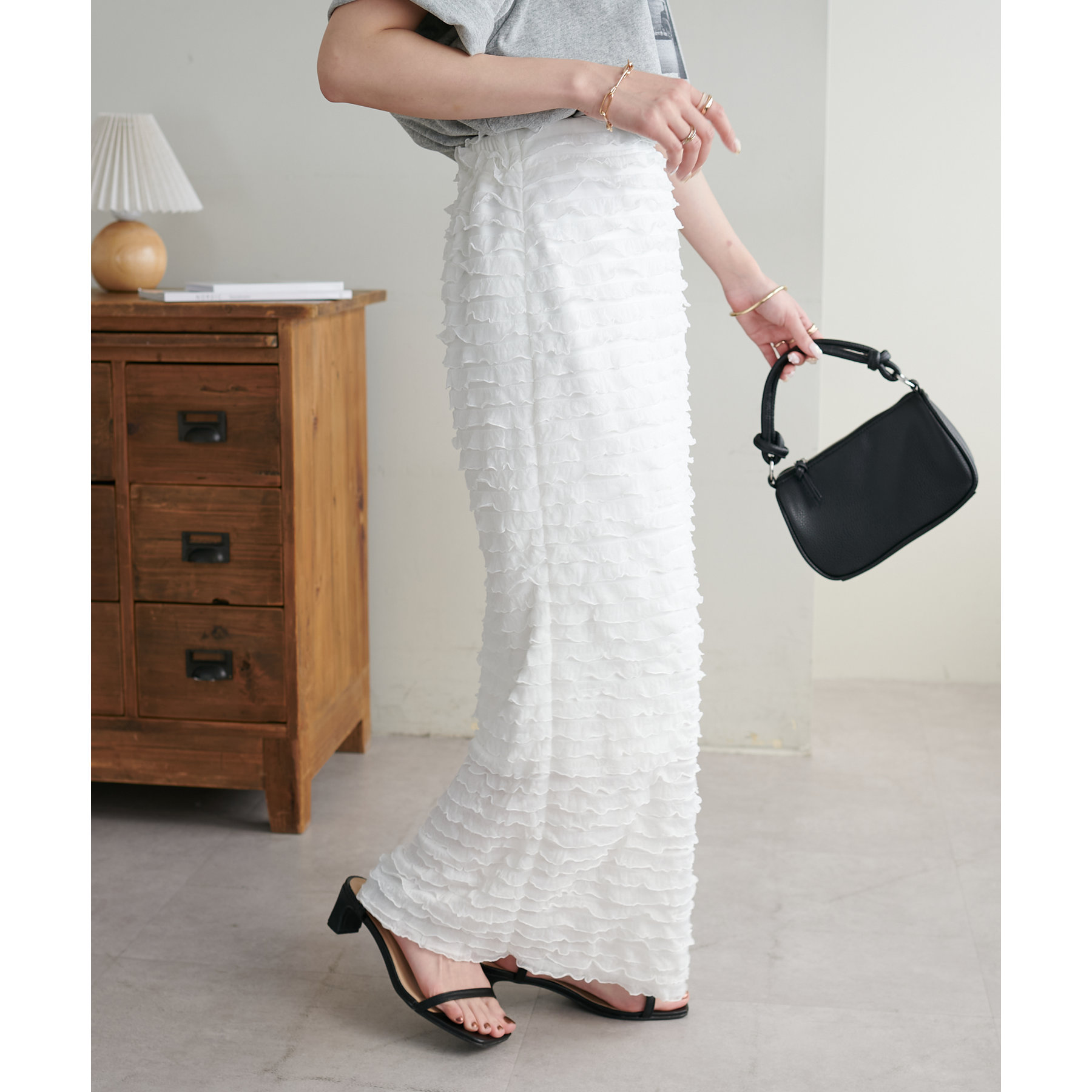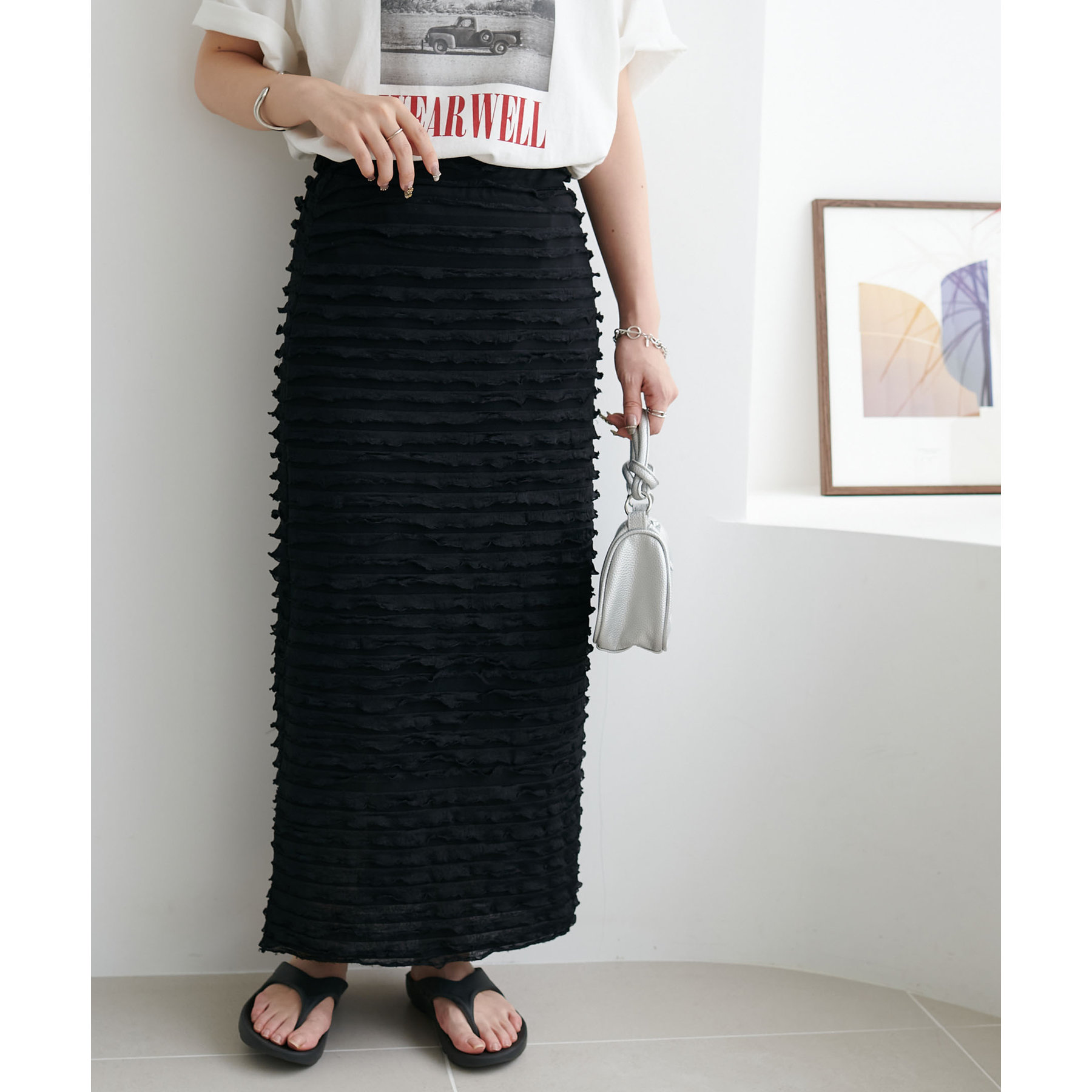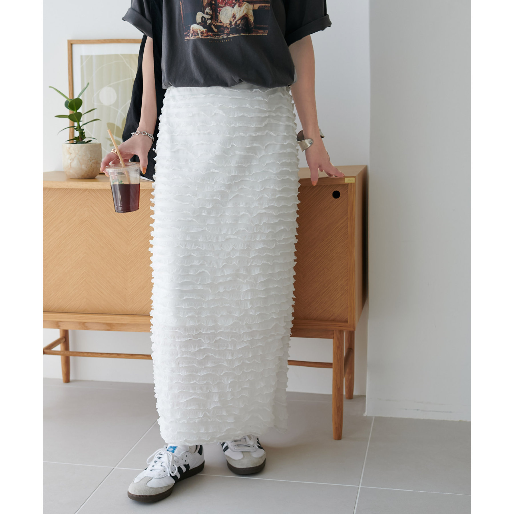 表面変化のあるフリルティアードがアクセントになり、シンプルコーデでも映えるスカート。