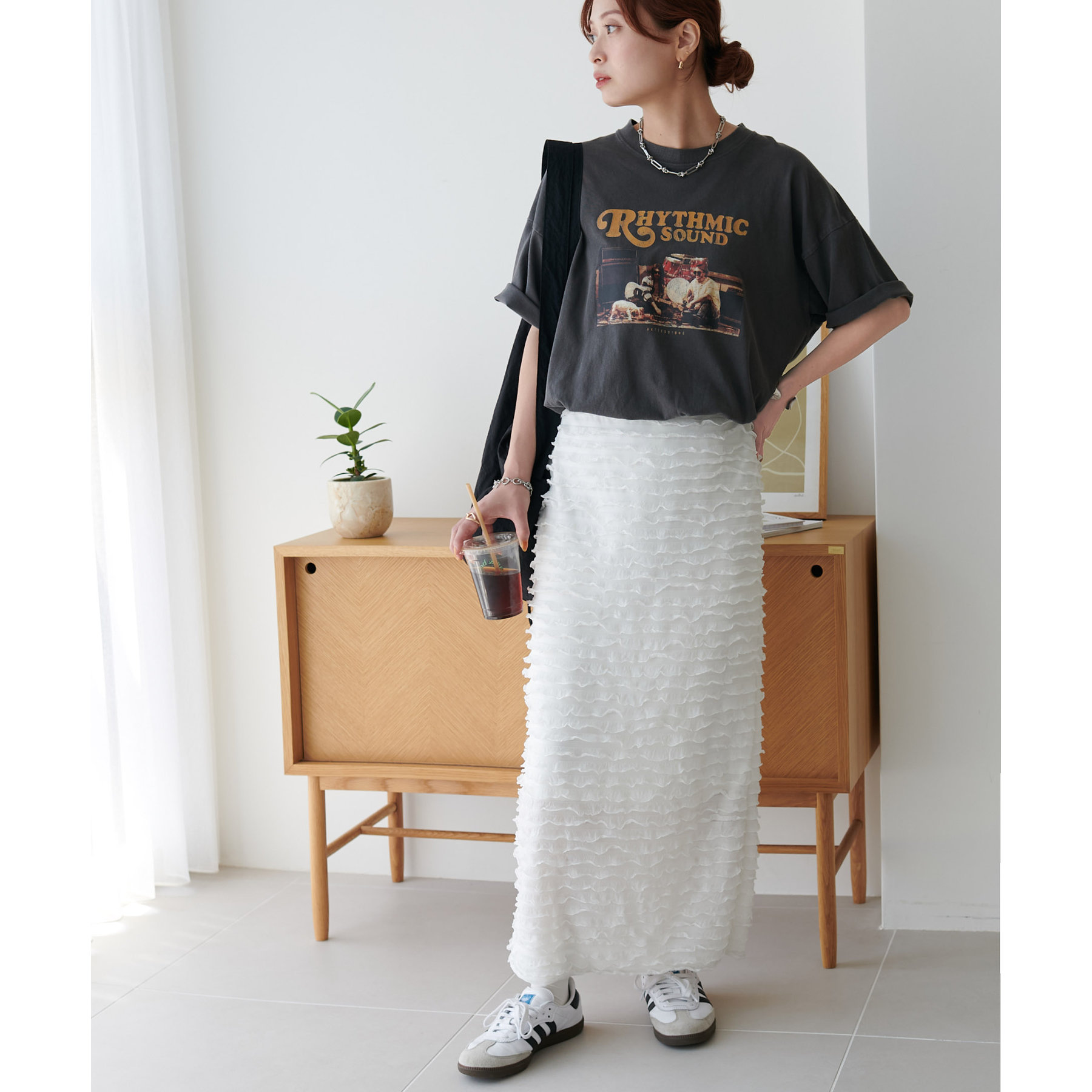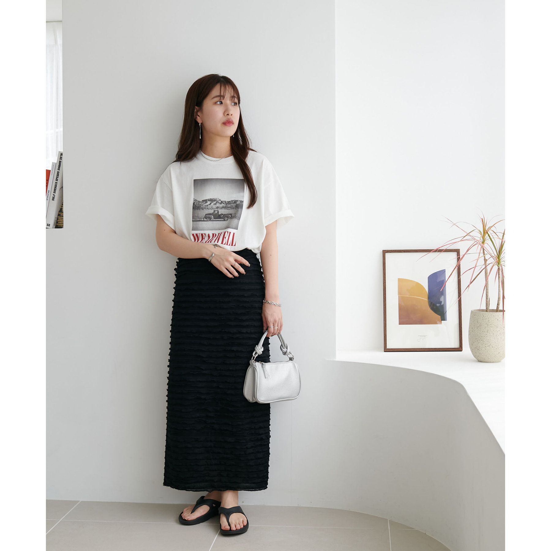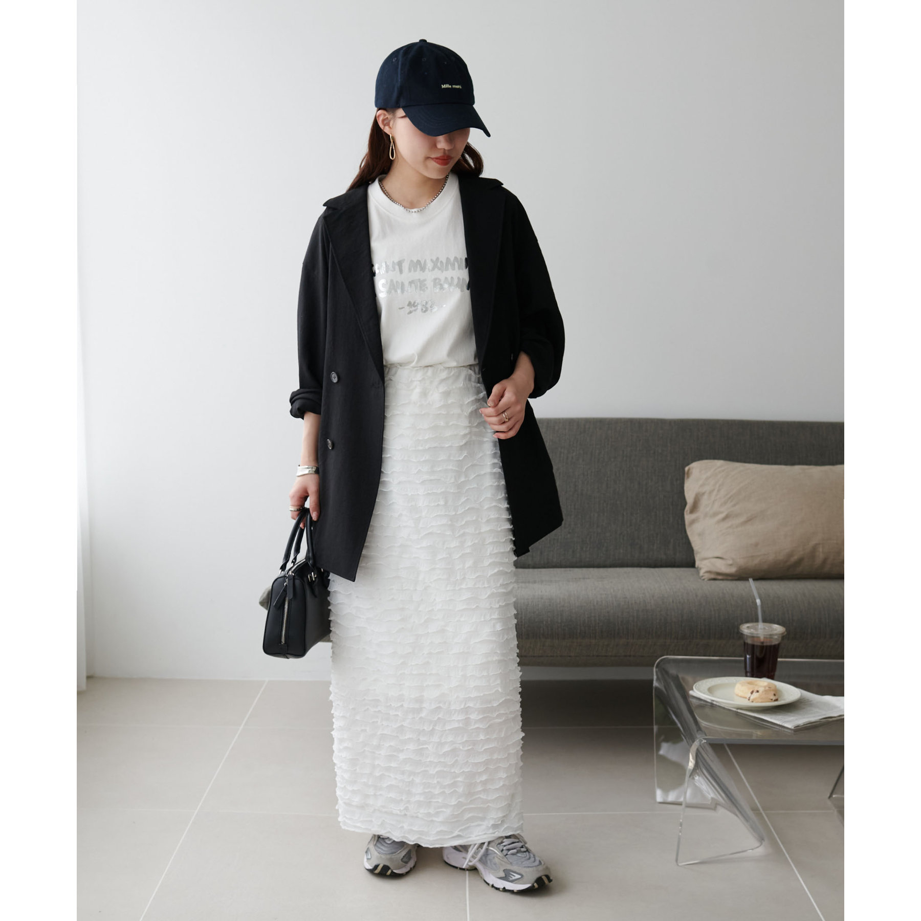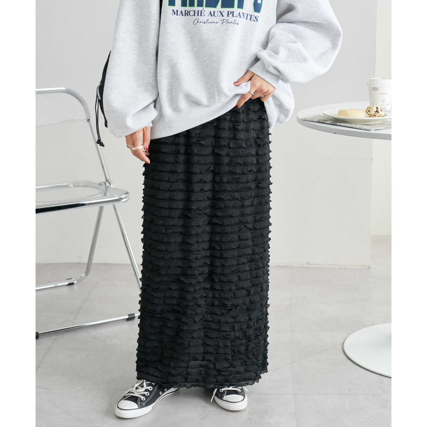 表面変化のあるフリルティアードがアクセントになり、シンプルコーデでも映えるスカート。