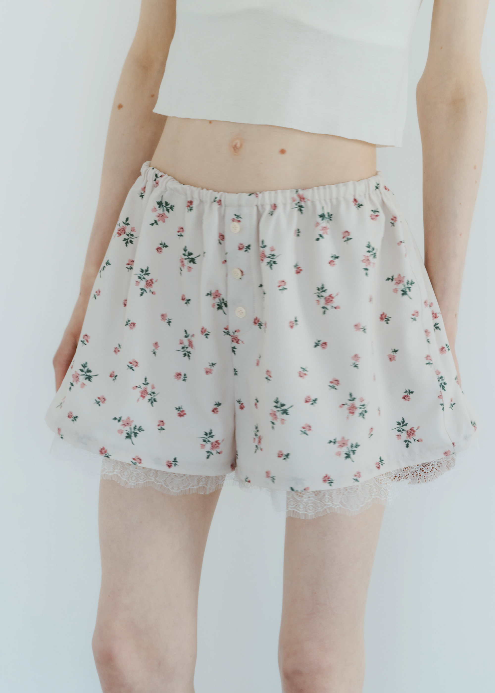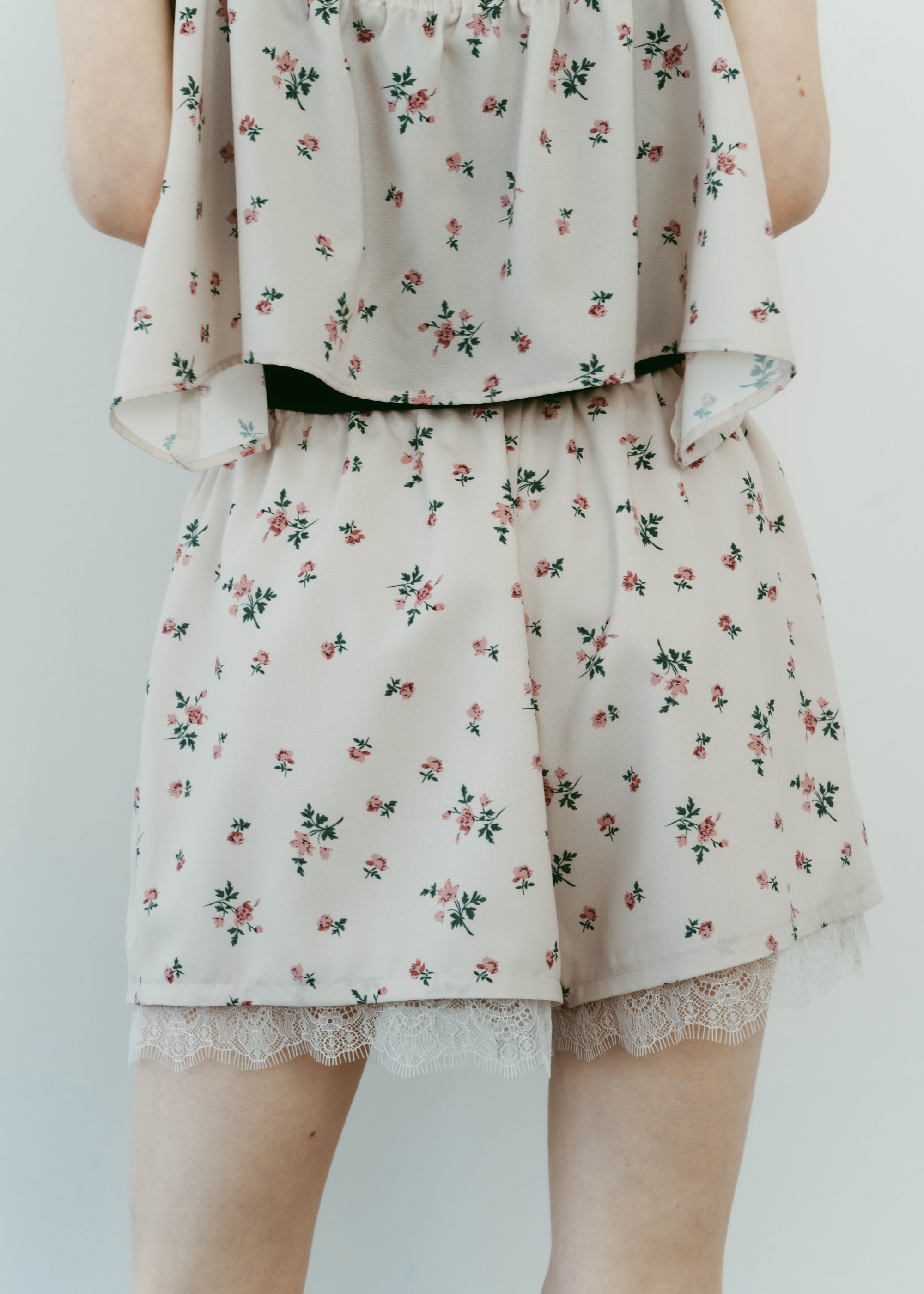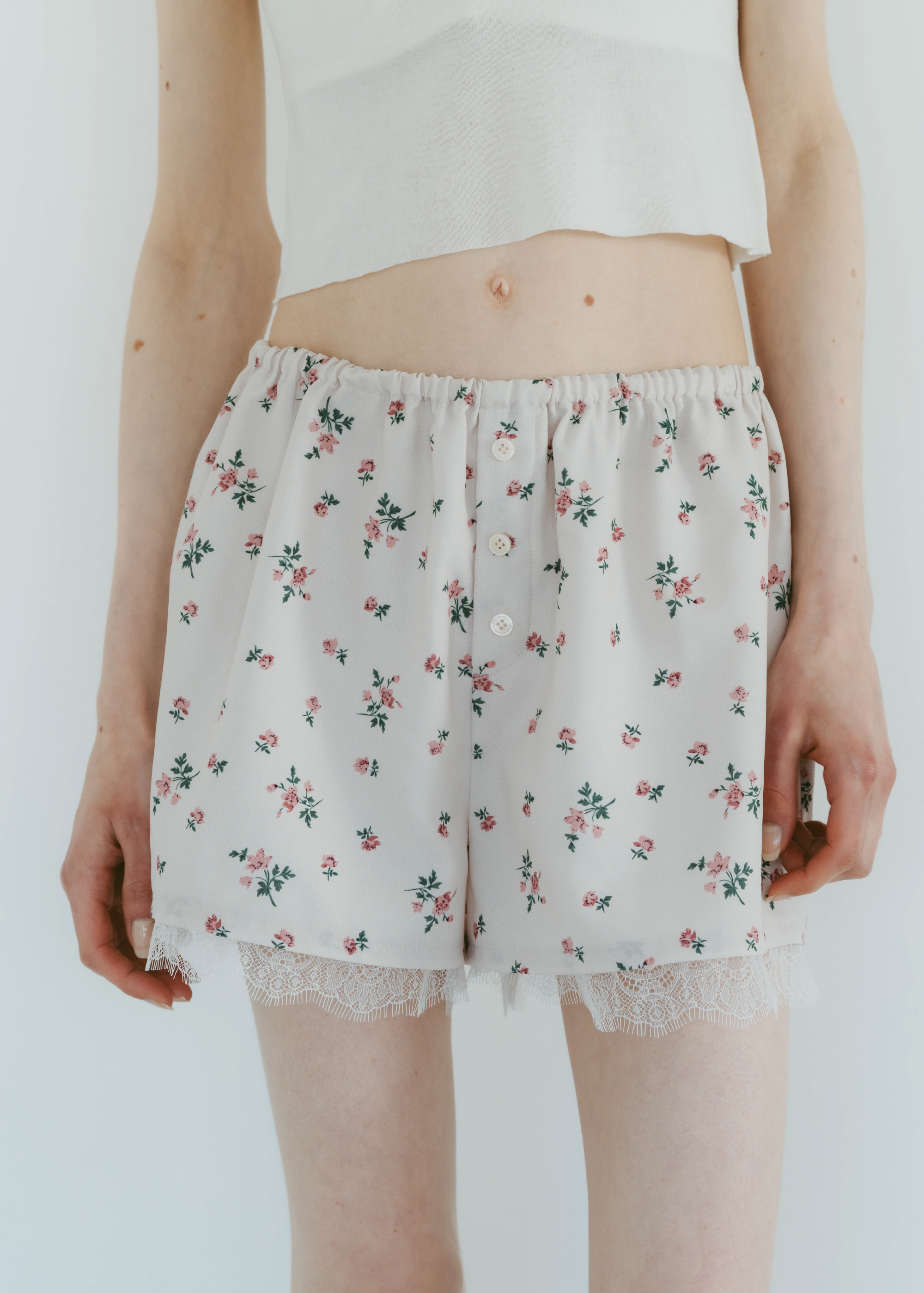 ヴィンテージ感のある小花柄が印象的なフローラルショーツ。