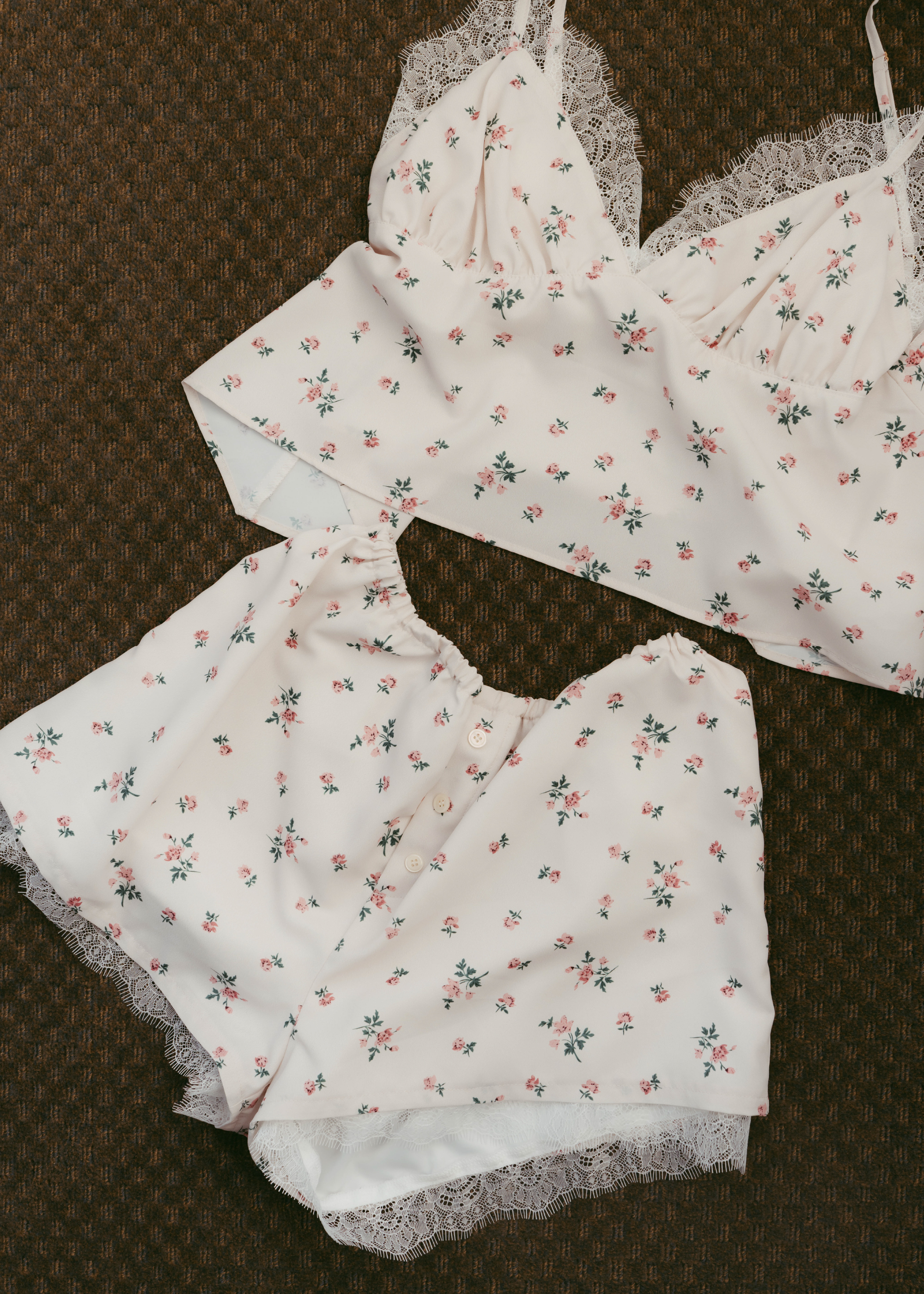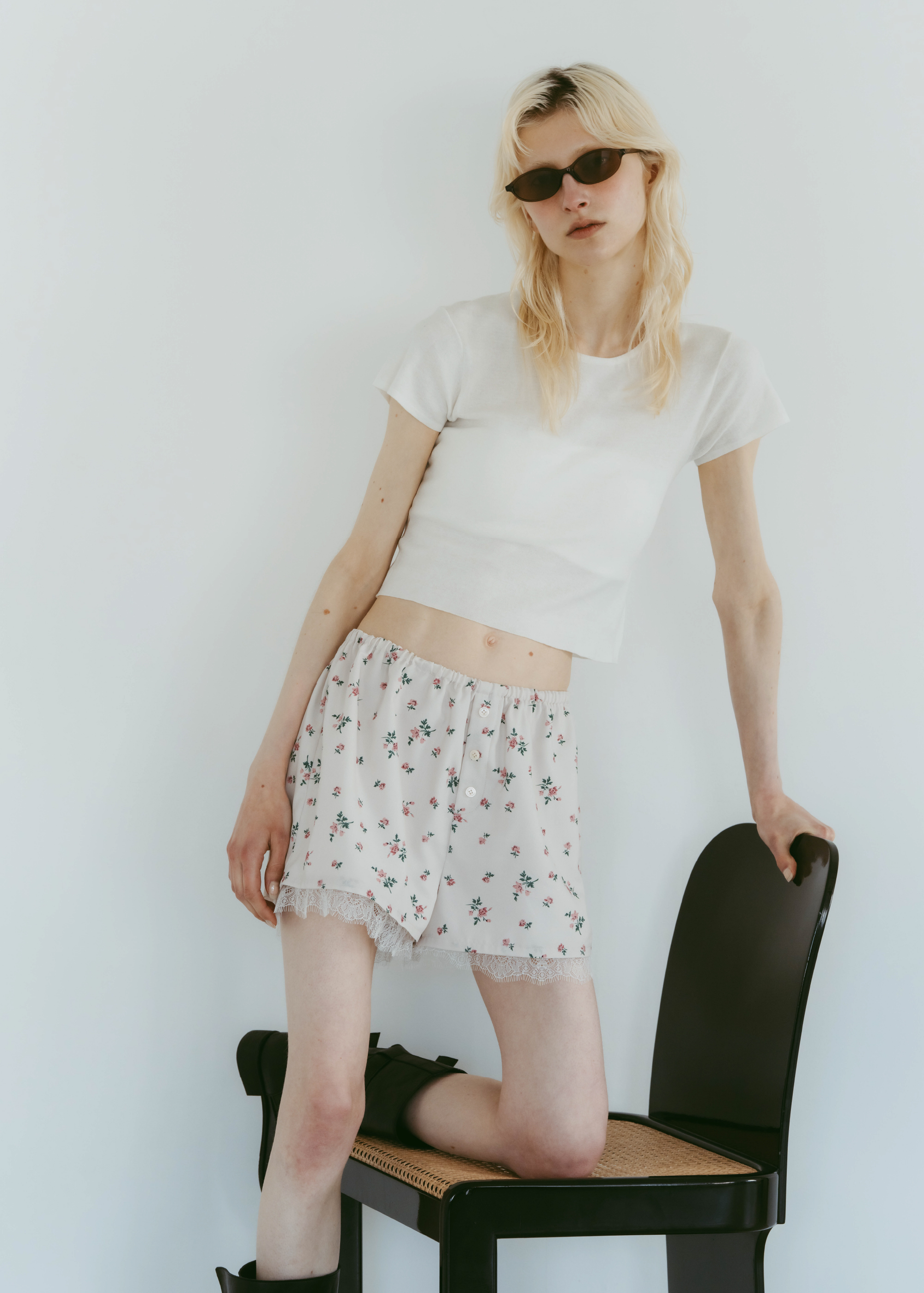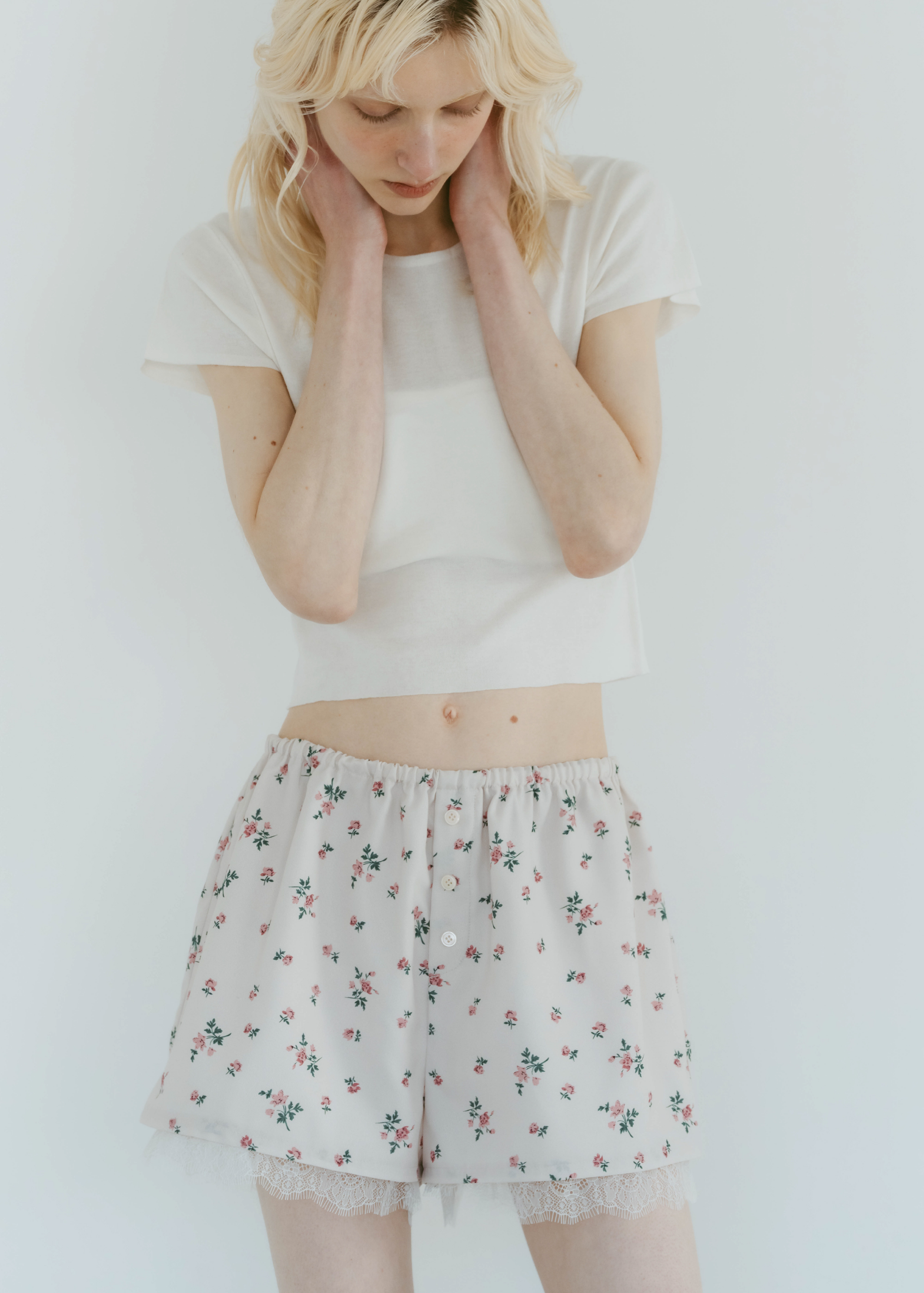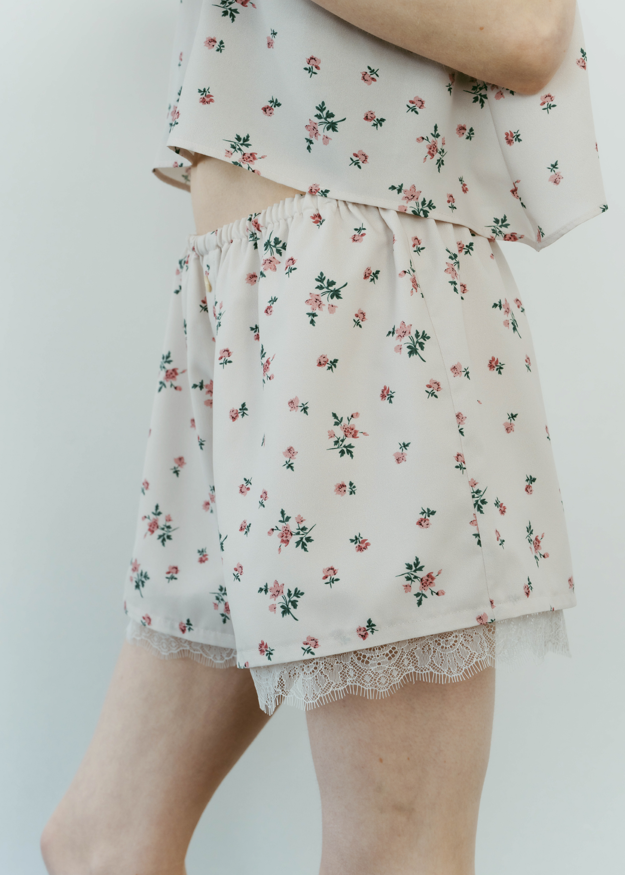 ヴィンテージ感のある小花柄が印象的なフローラルショーツ。