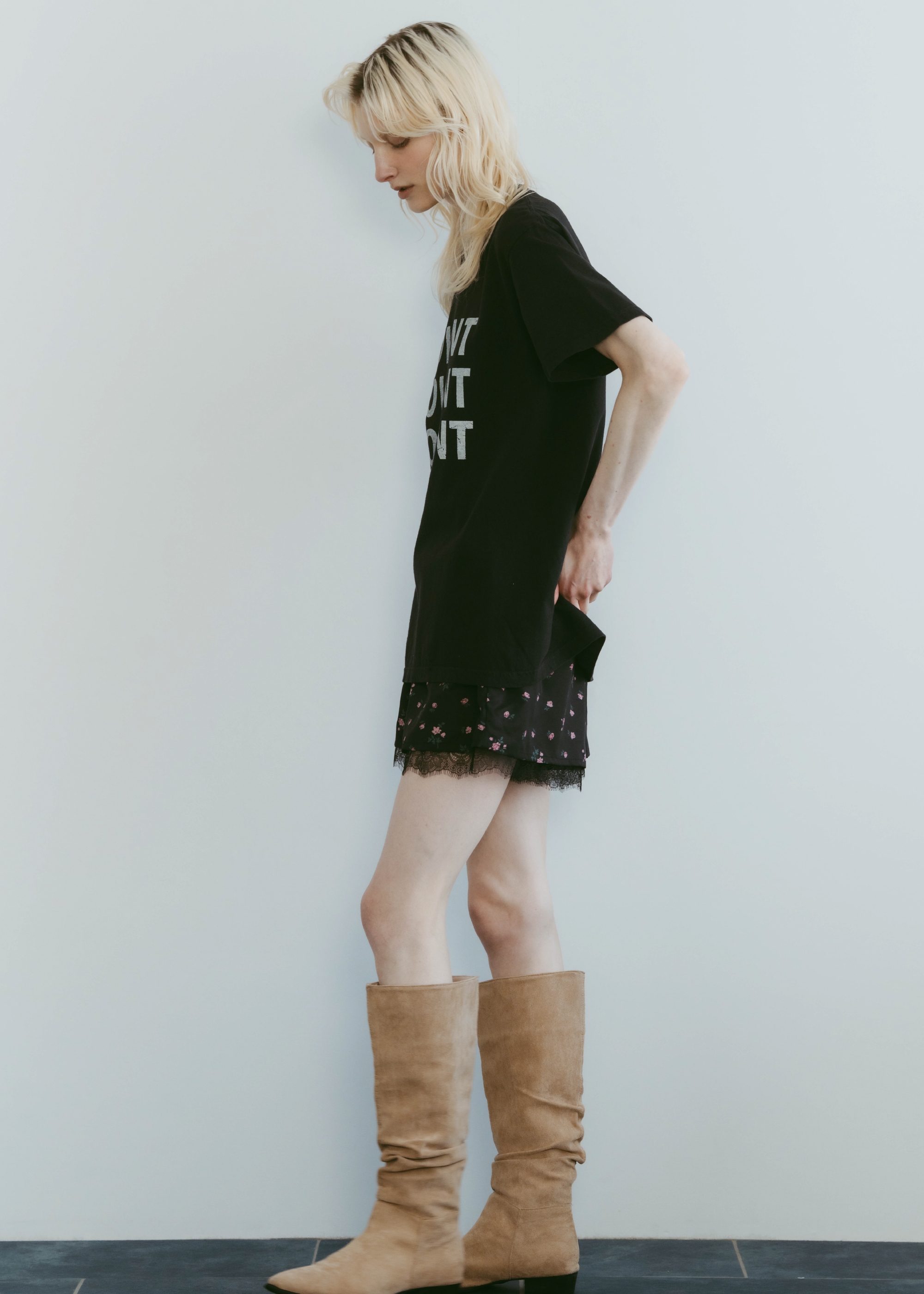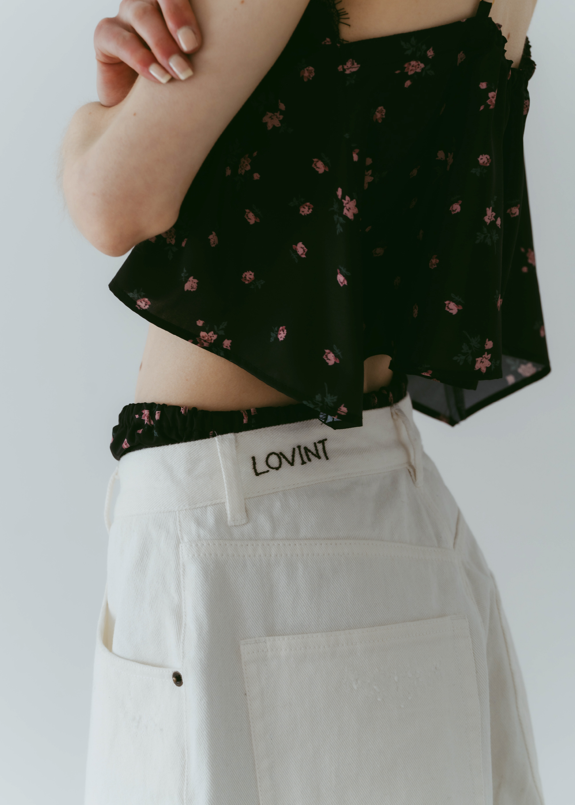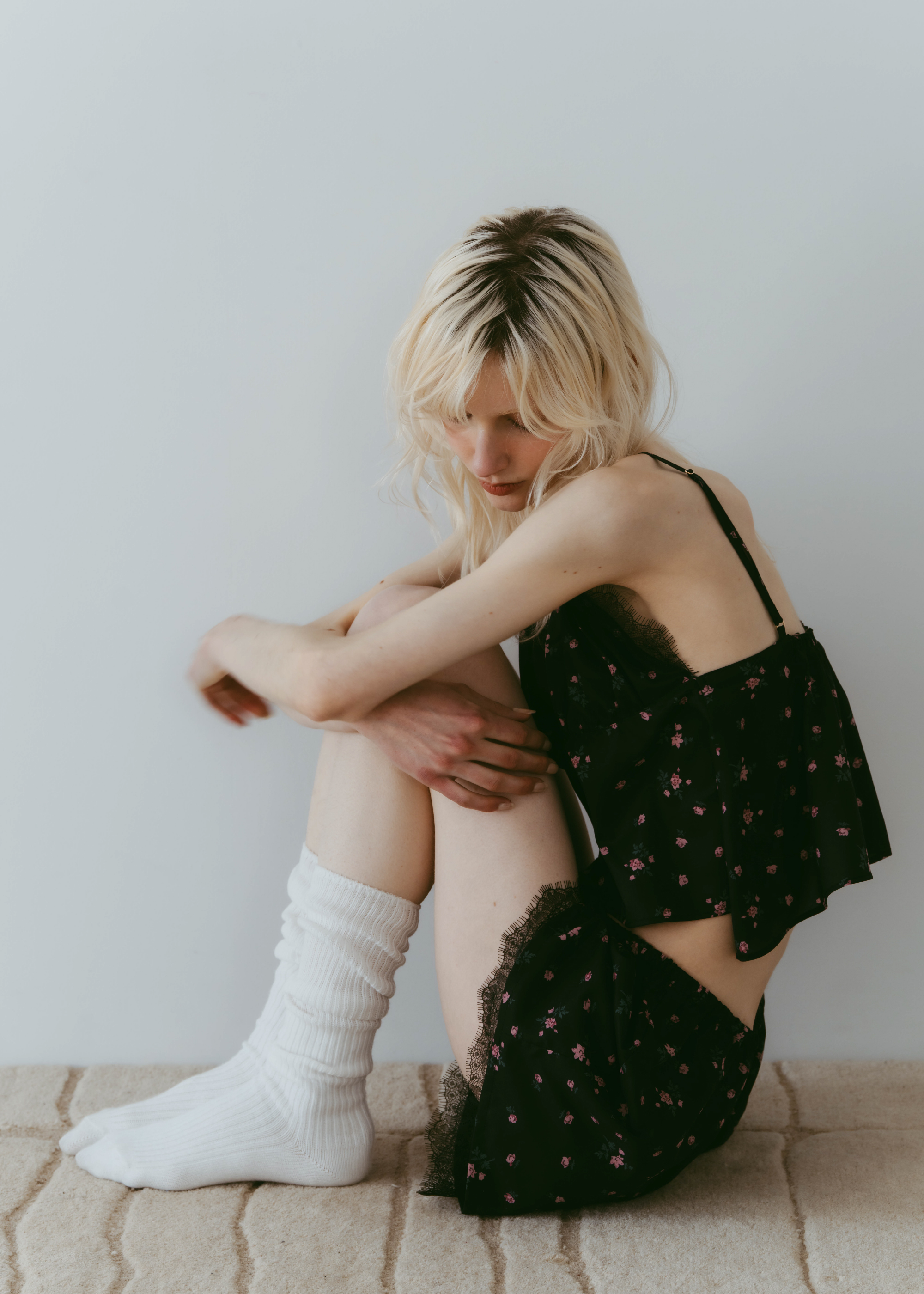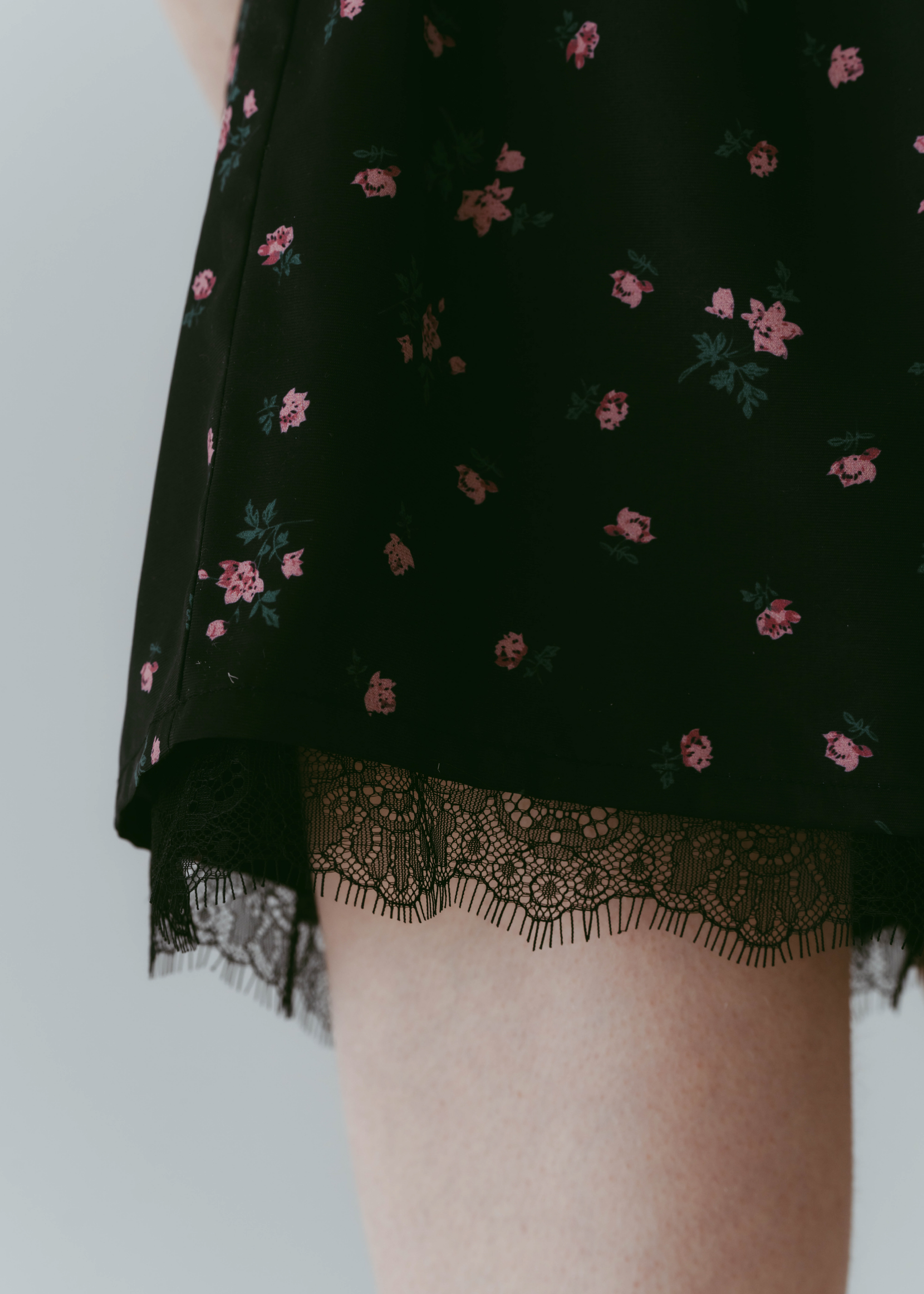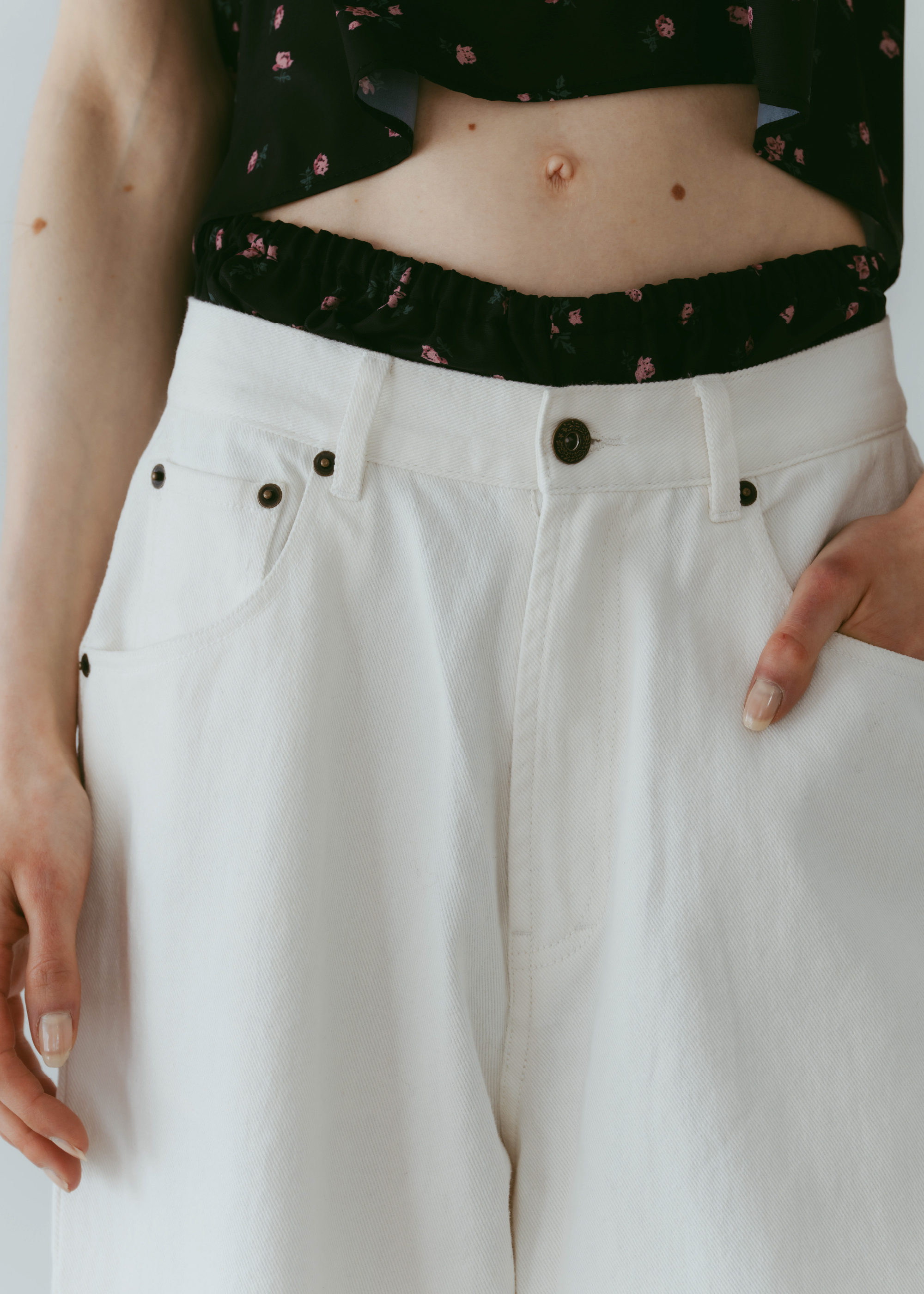 裾には繊細なレースをあしらい、さりげないフェミニンさをプラスしました。