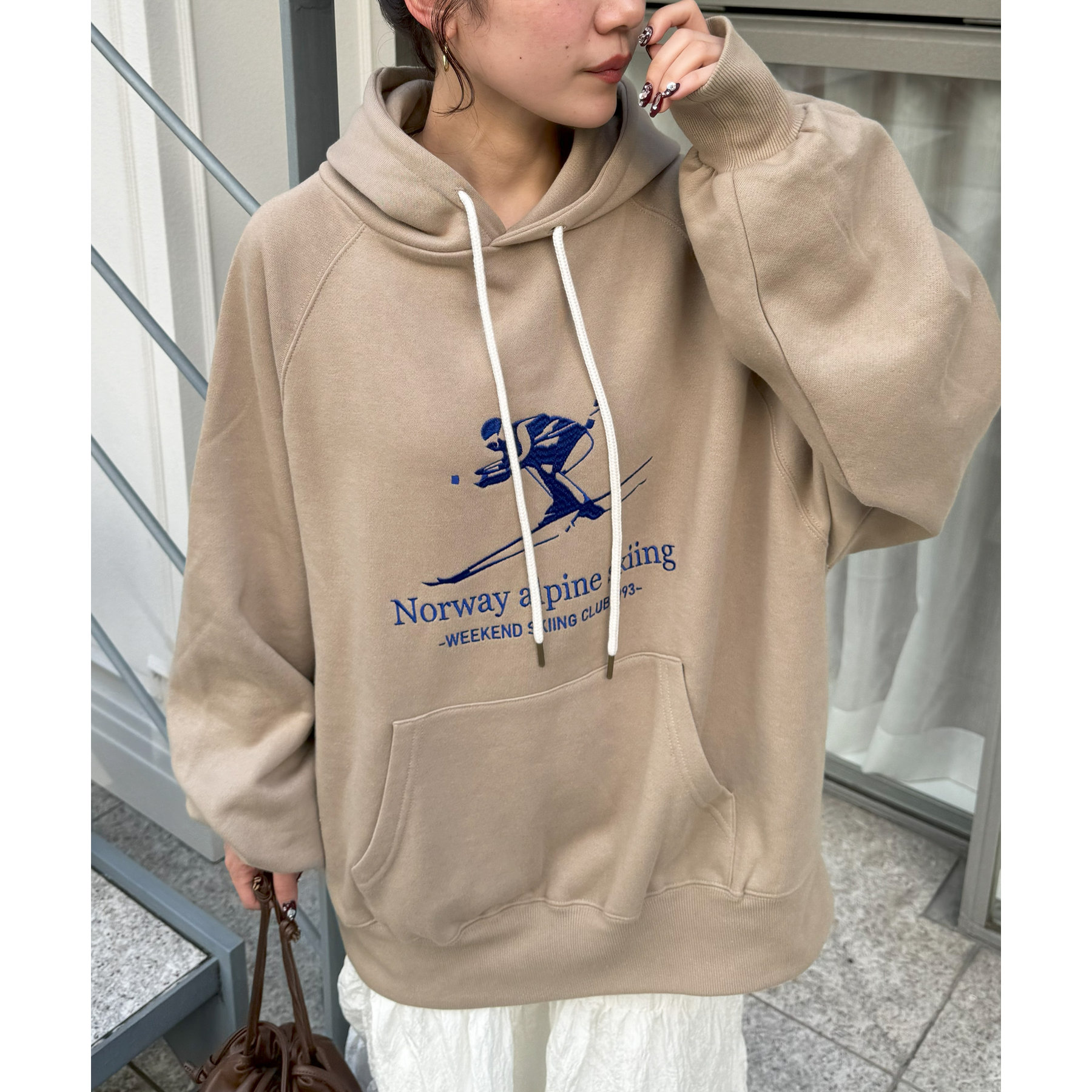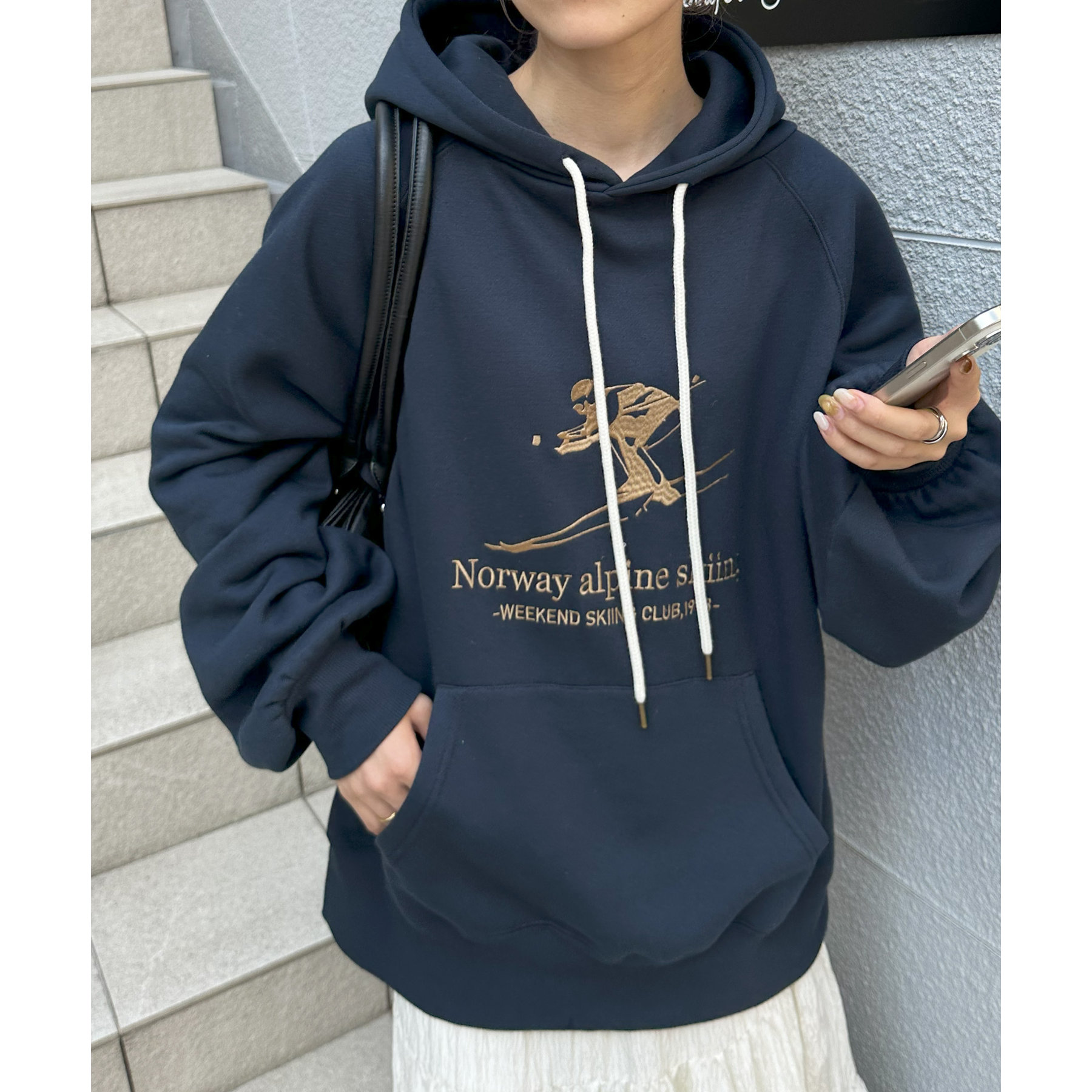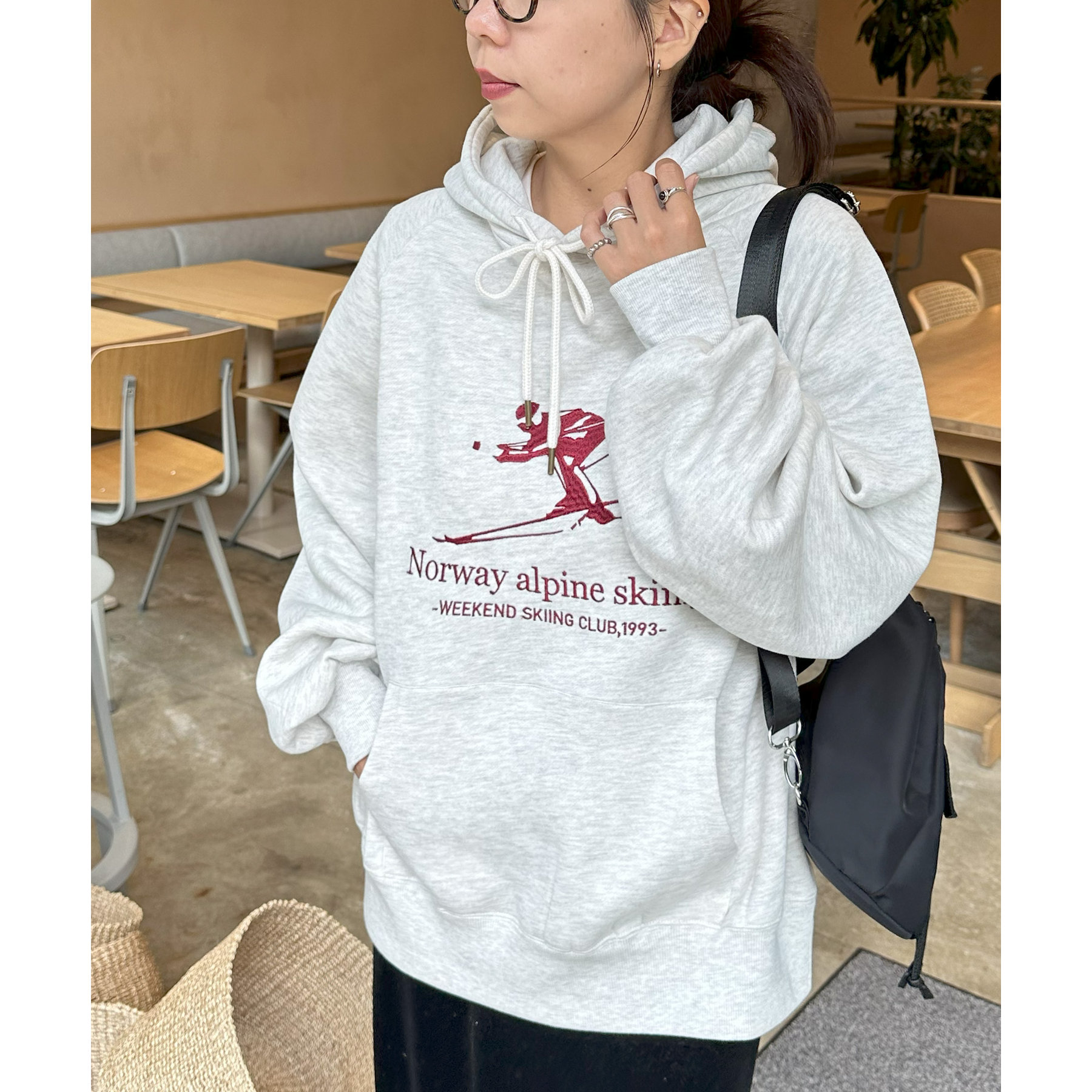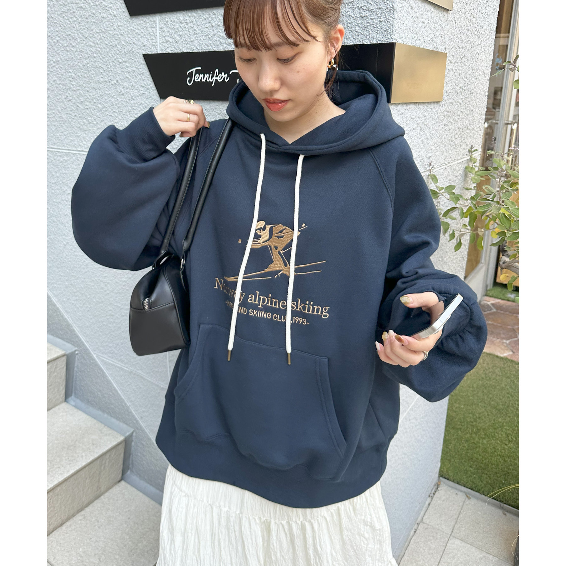 袖のボリューム感や刺繍ロゴのデザイン、太めのフード紐などこだわりが詰まったアイテムです。
