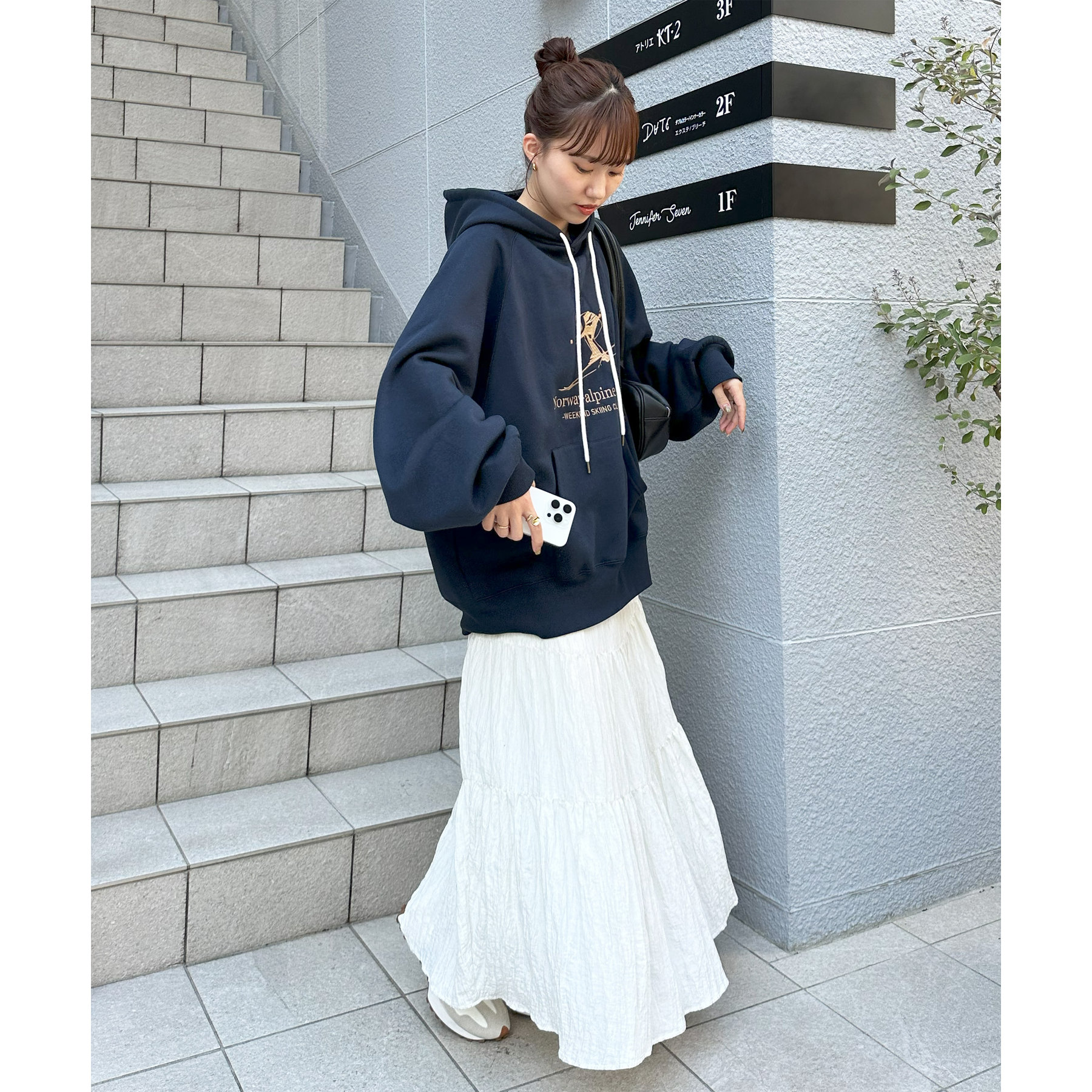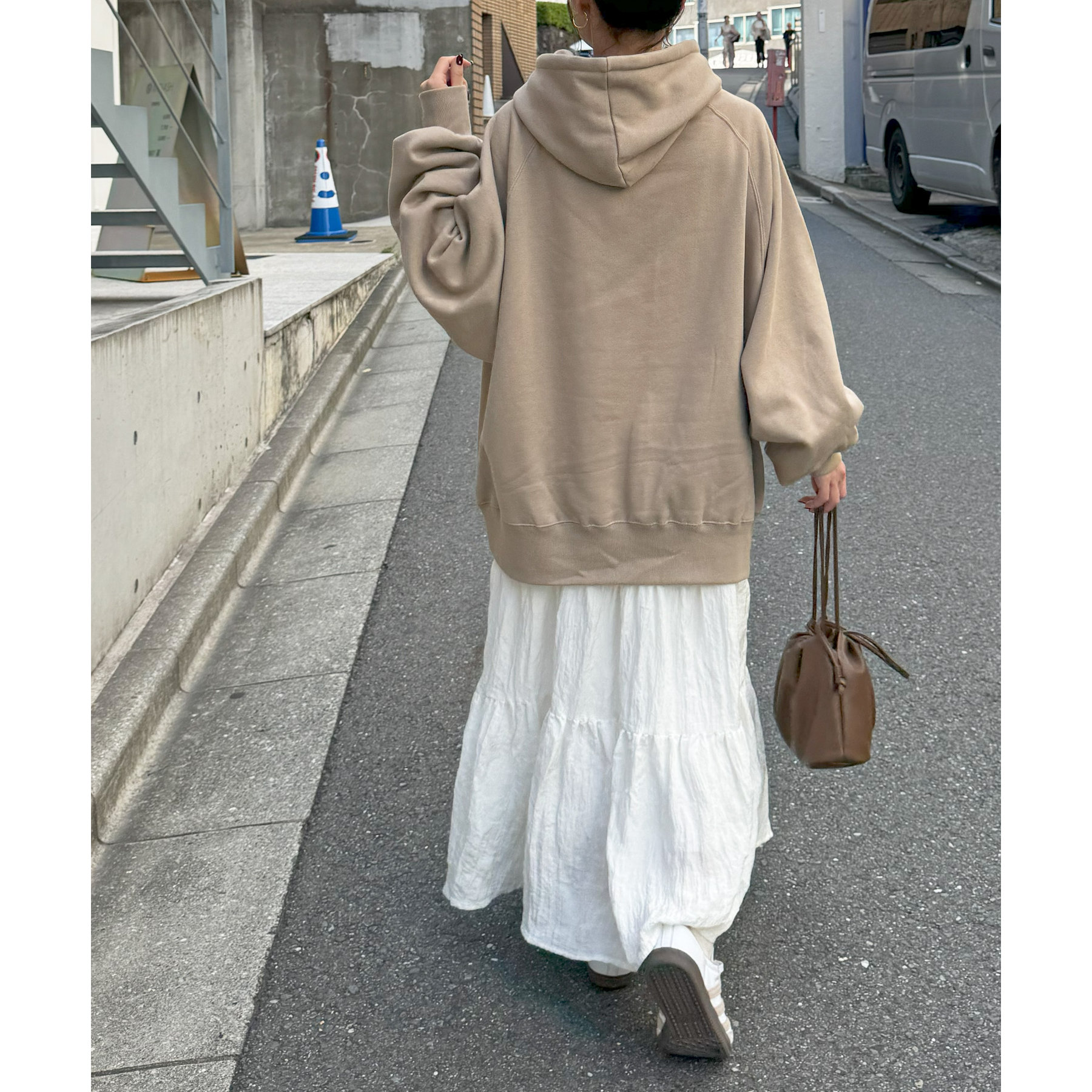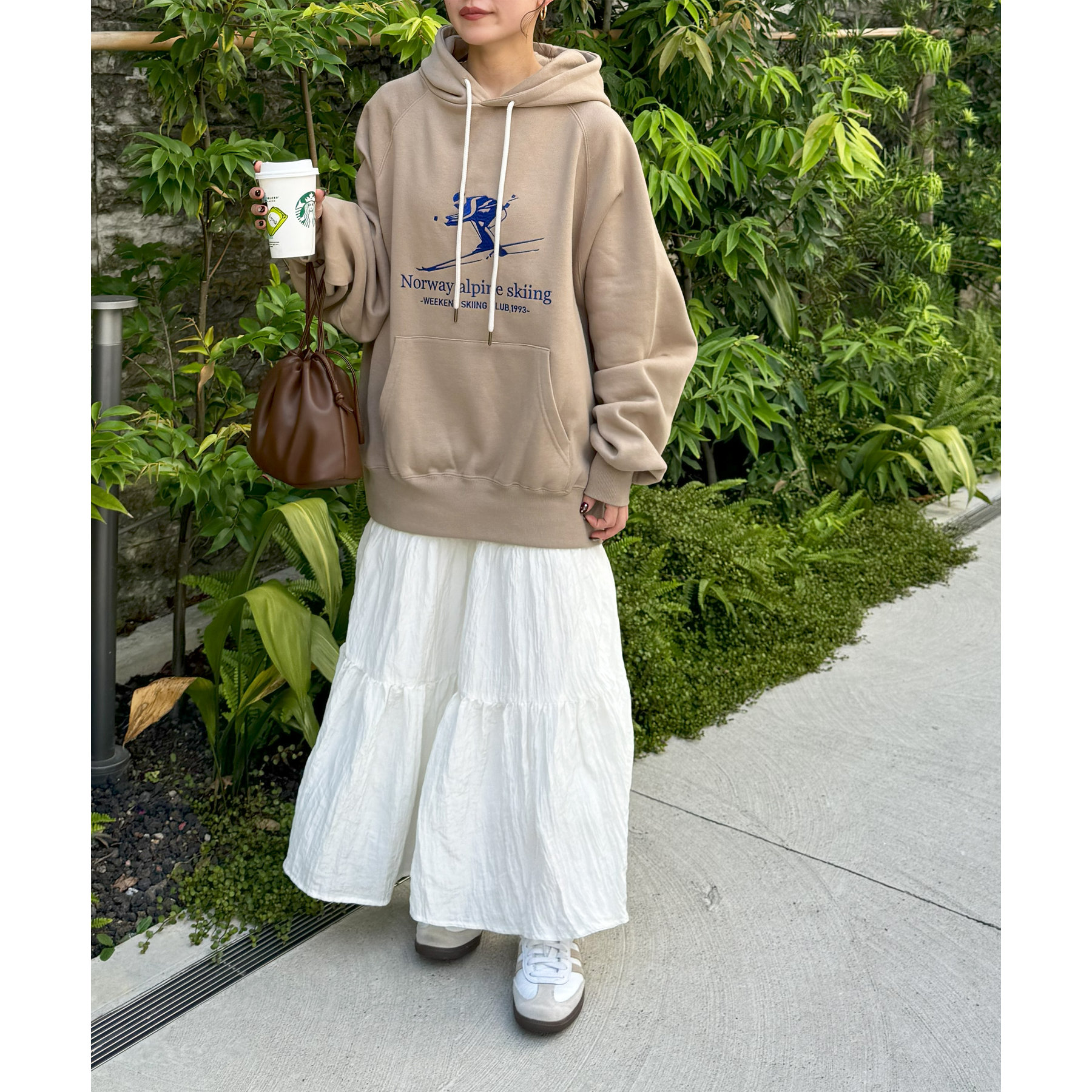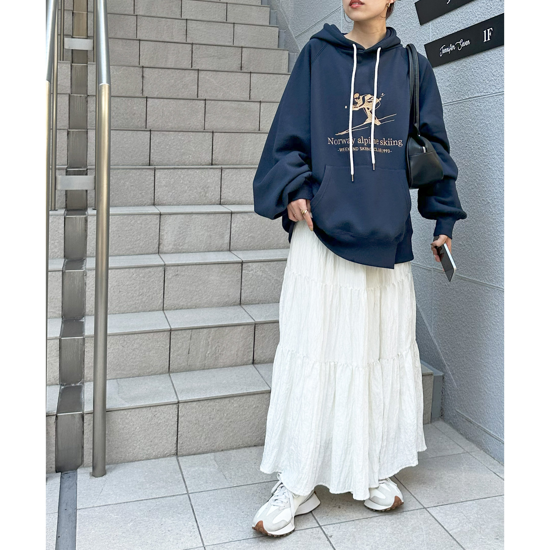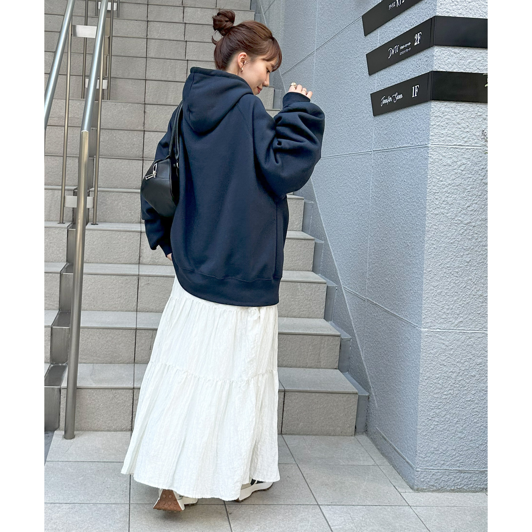 メンズライクなパーカーはカジュアルコーデはもちろん、ナロースカートやティアードスカートと合わせたコーデもおすすめ。