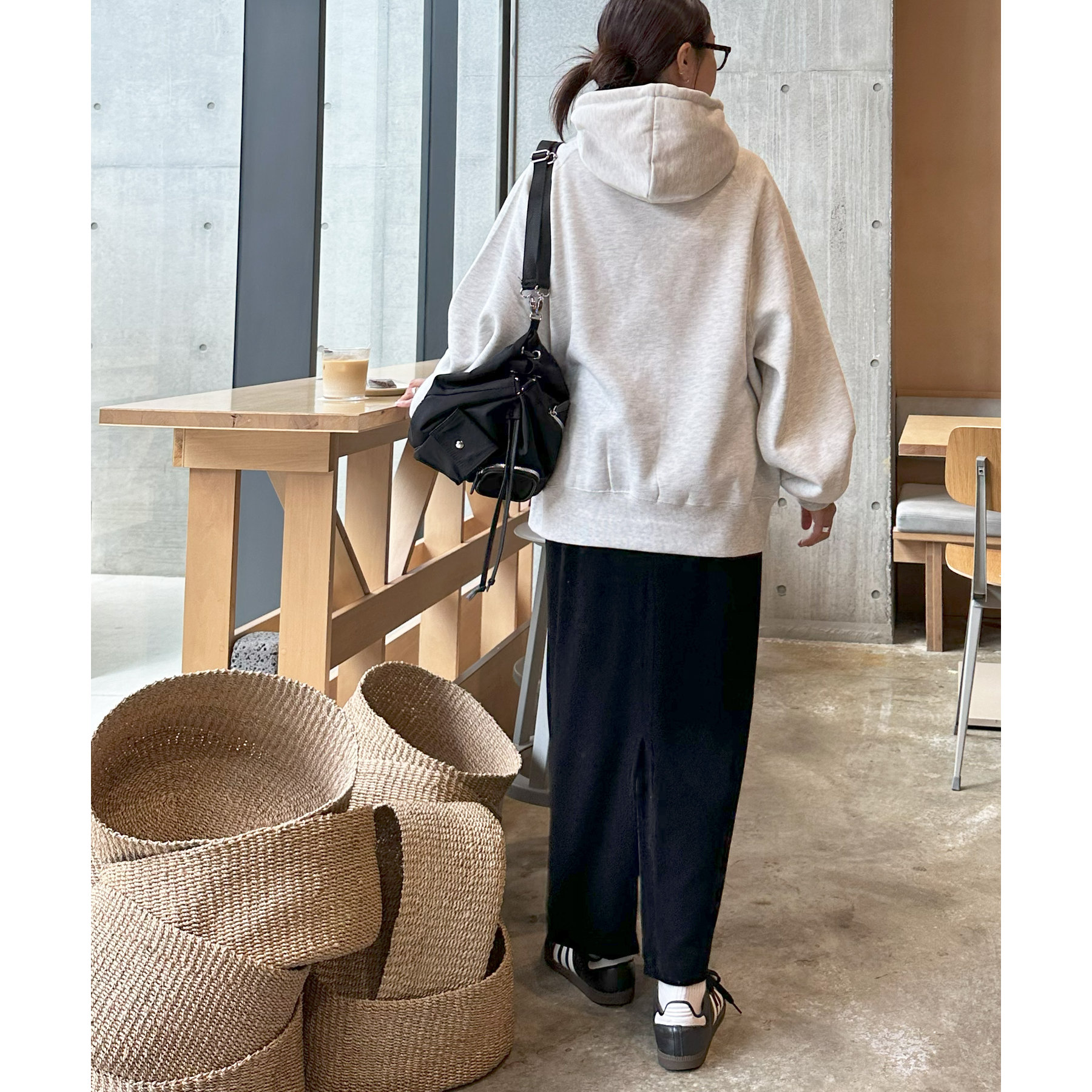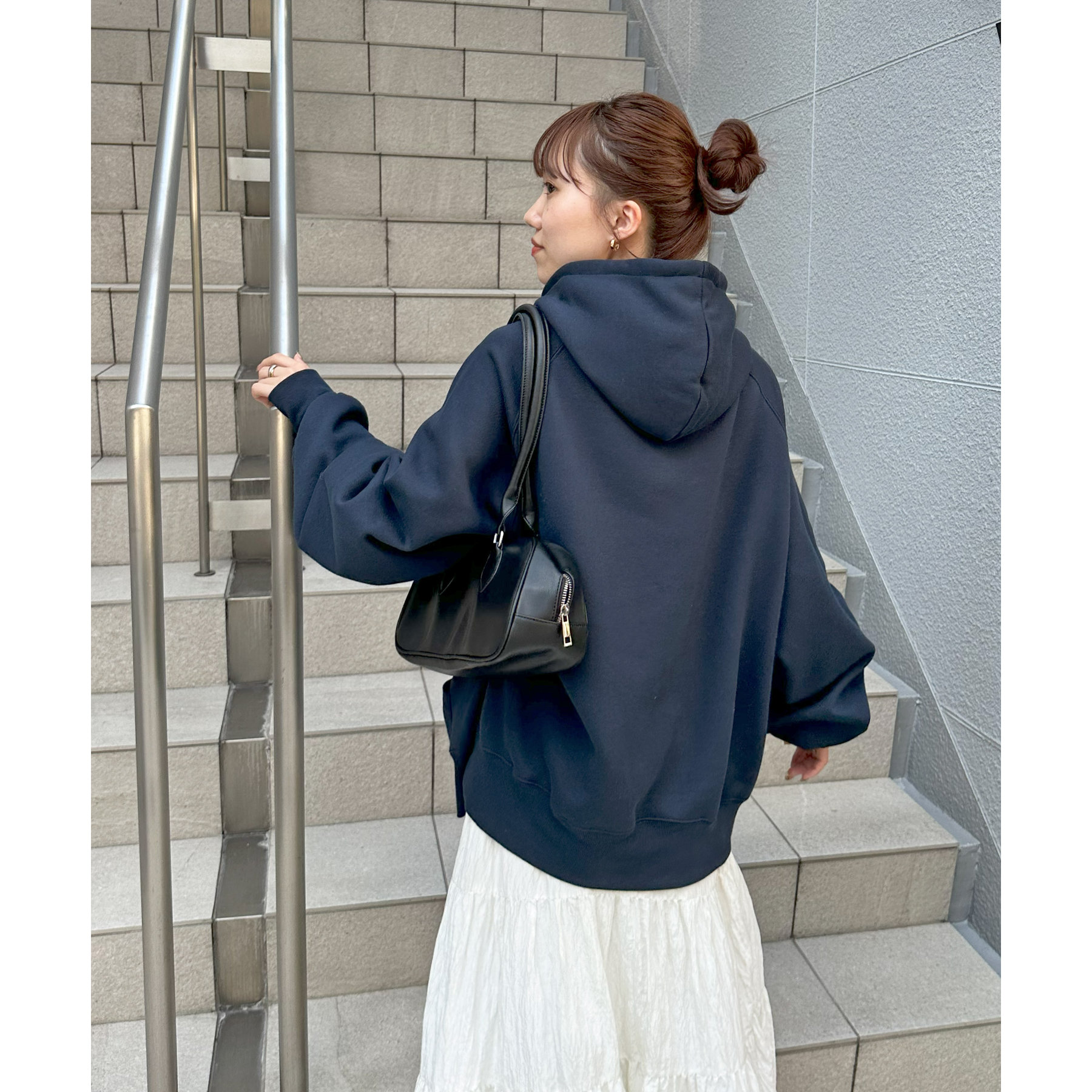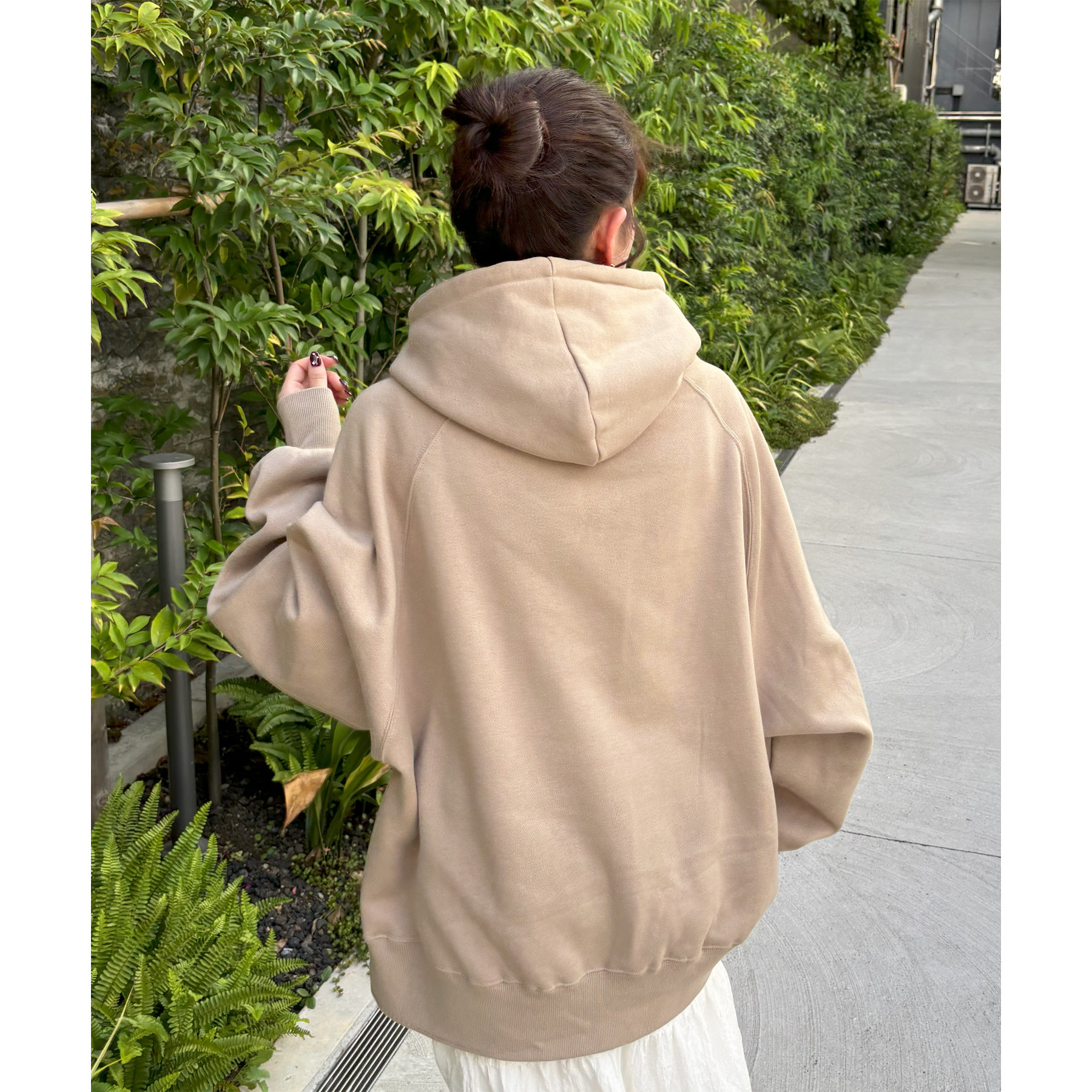 フード紐が太めでロゴが上目にあるので、目線が上がりオーバーサイズでも重たく見えにくいアイテムです!