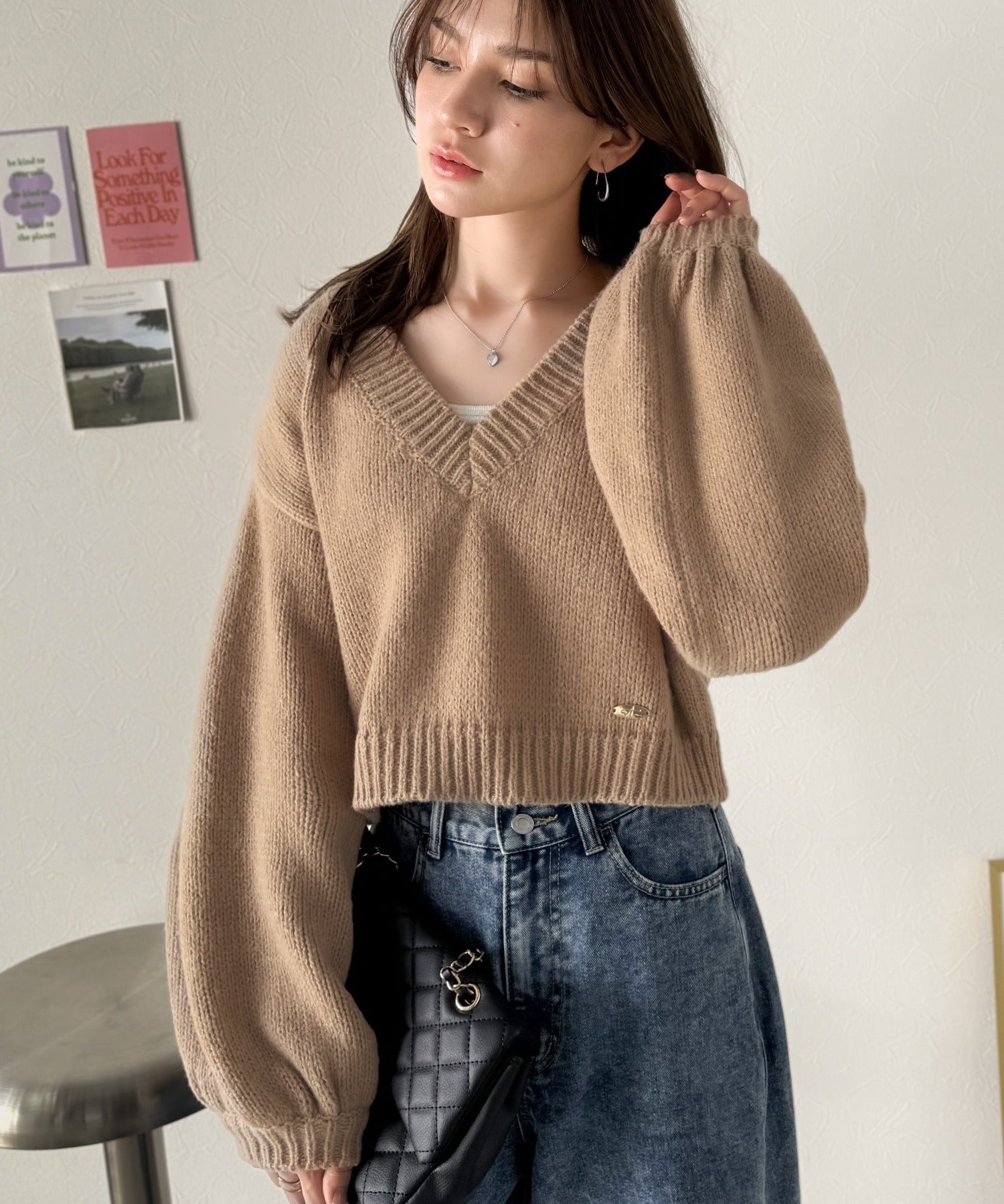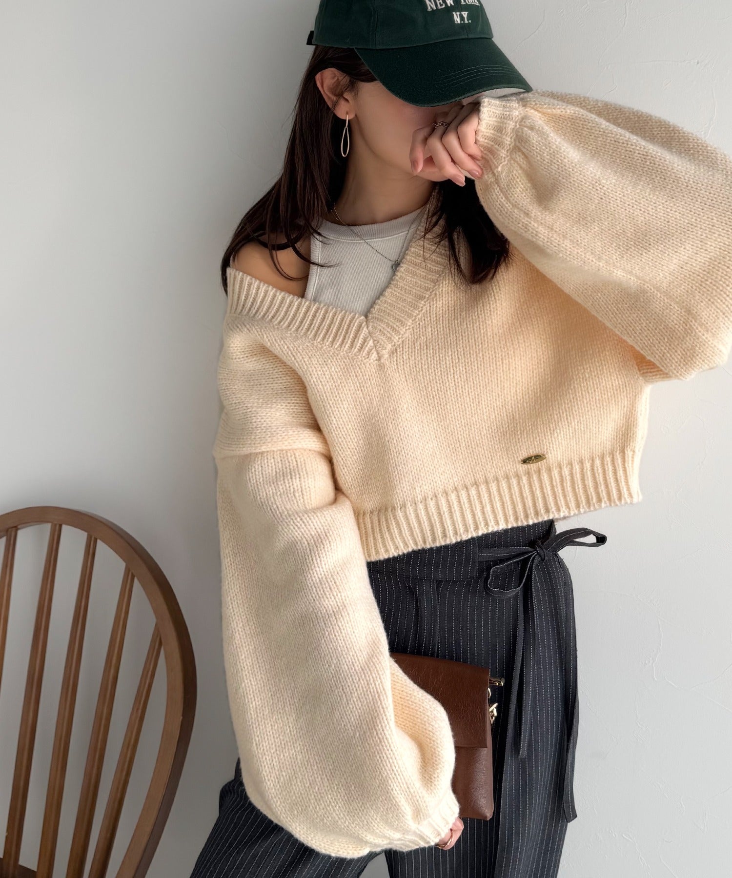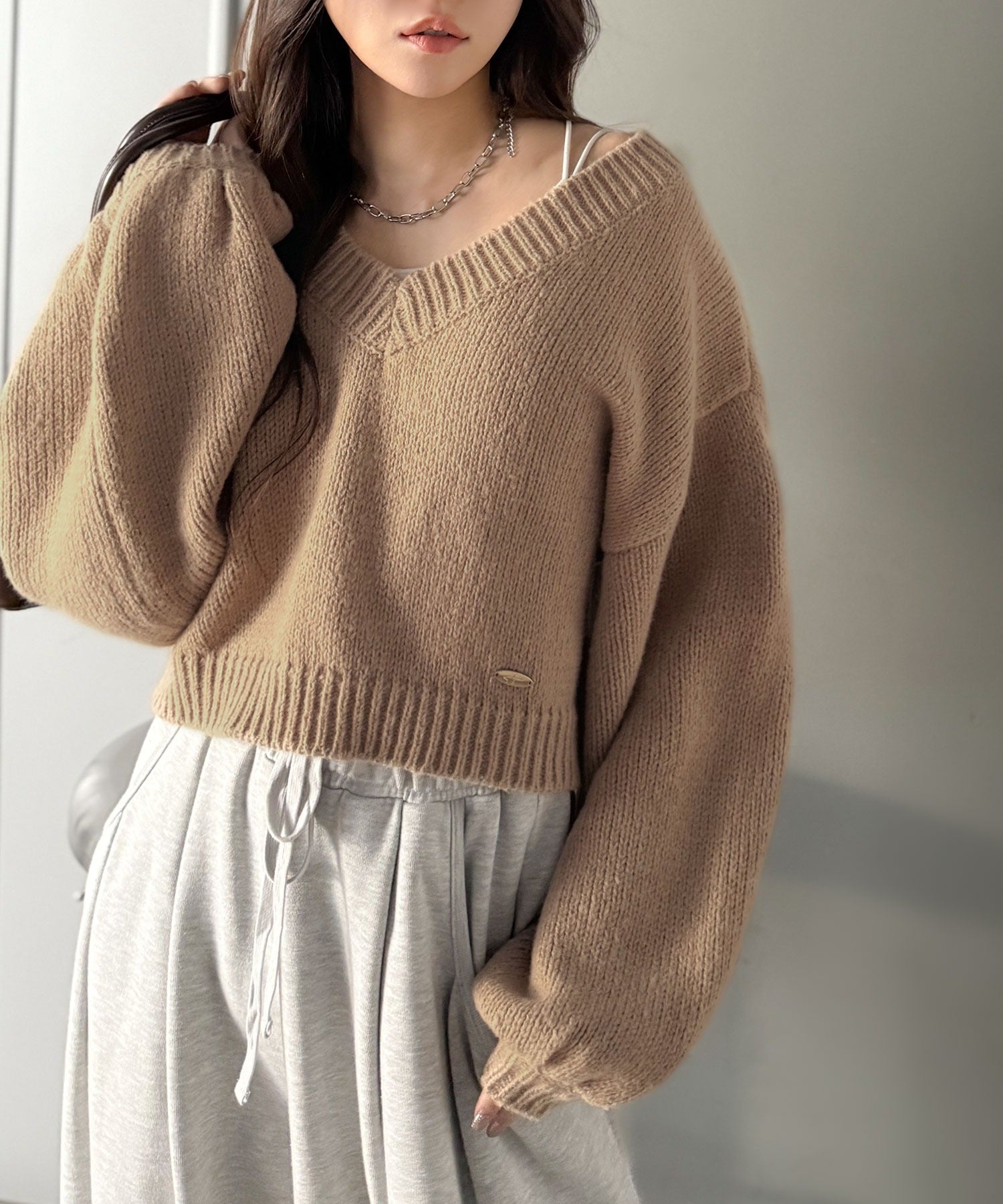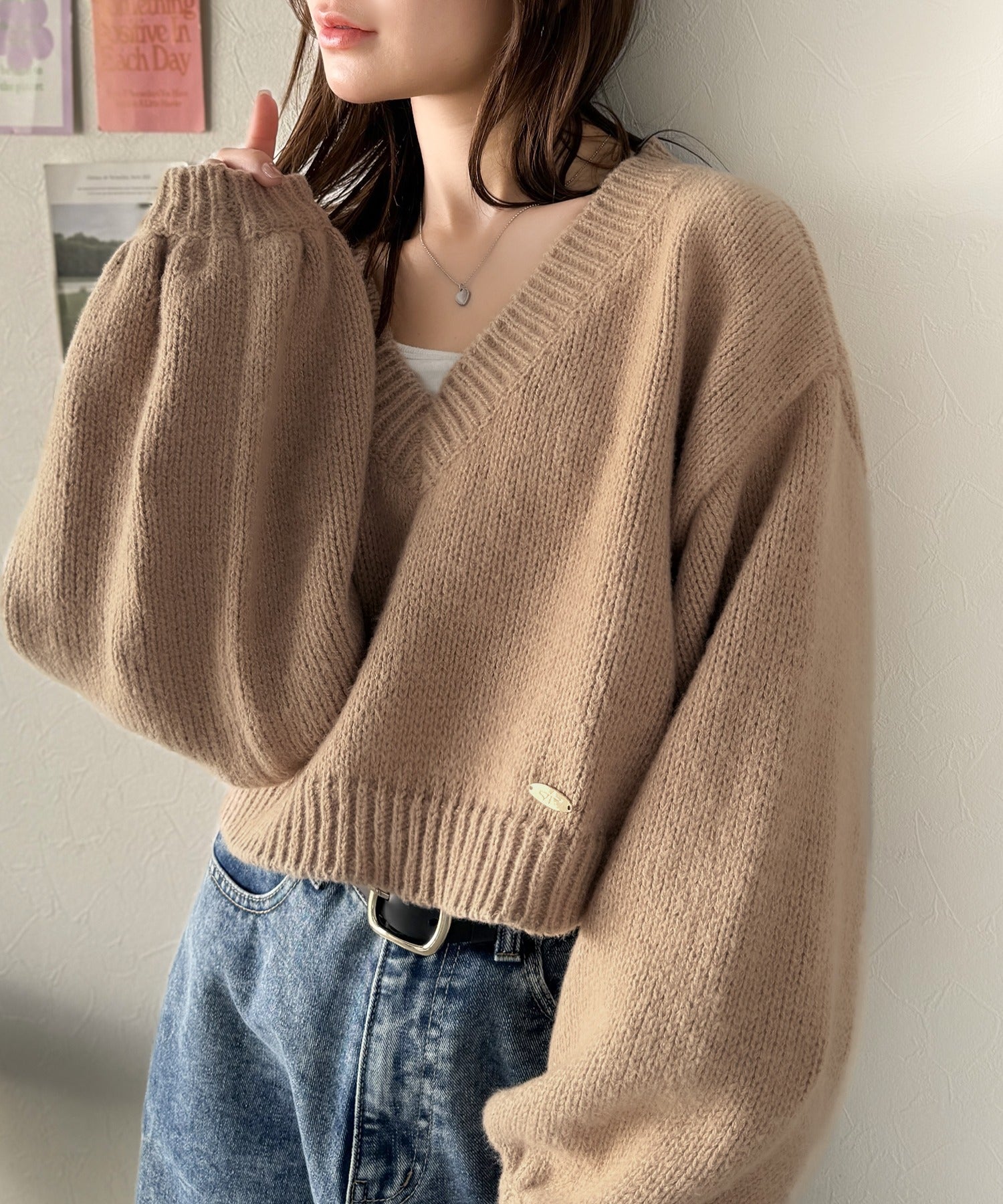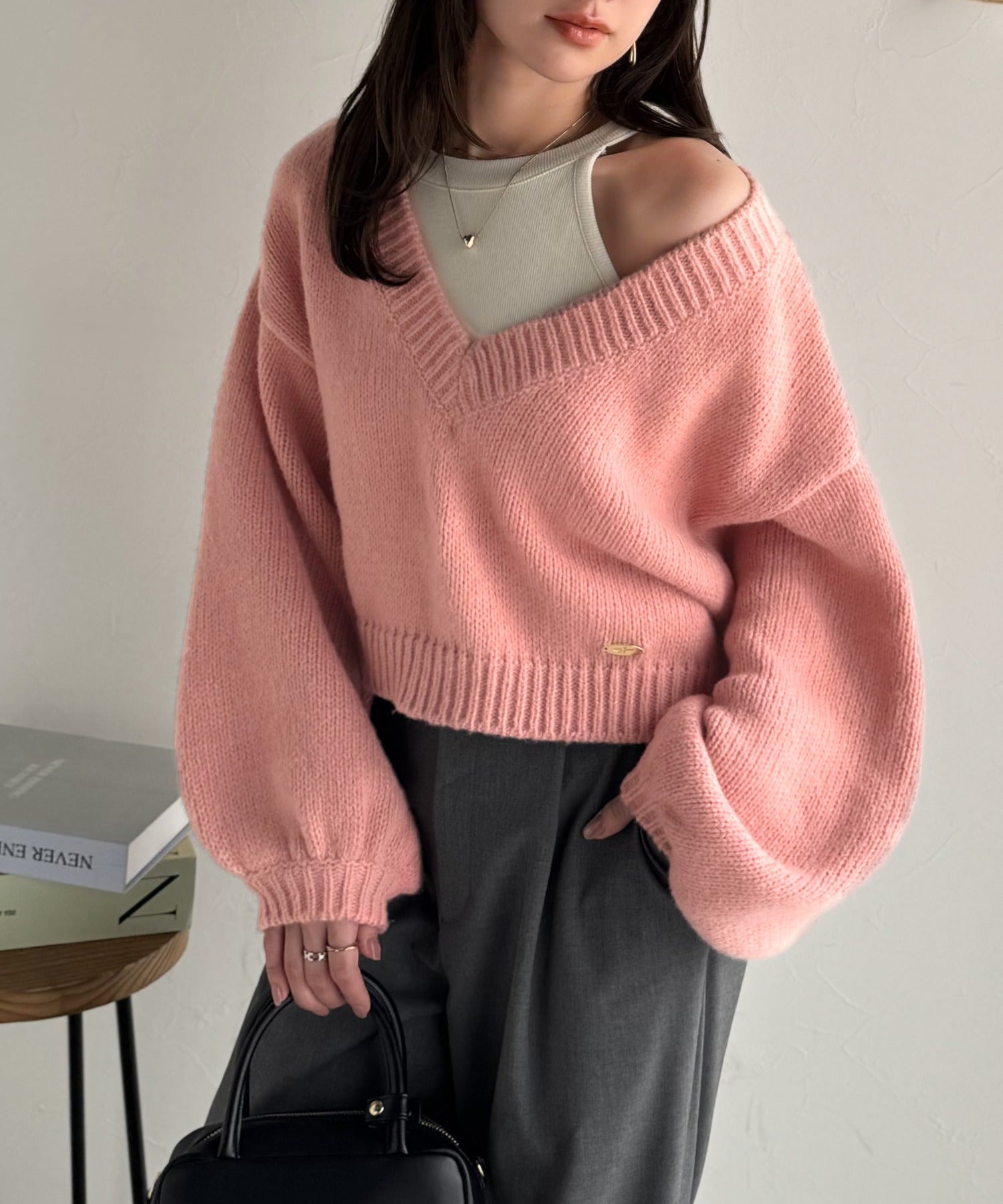 《AYA×クラシカルエルフコラボ》ふんわり可愛く、きらっと上品。プレート付きクロップドローゲージVネックニット(長袖) ce1010523