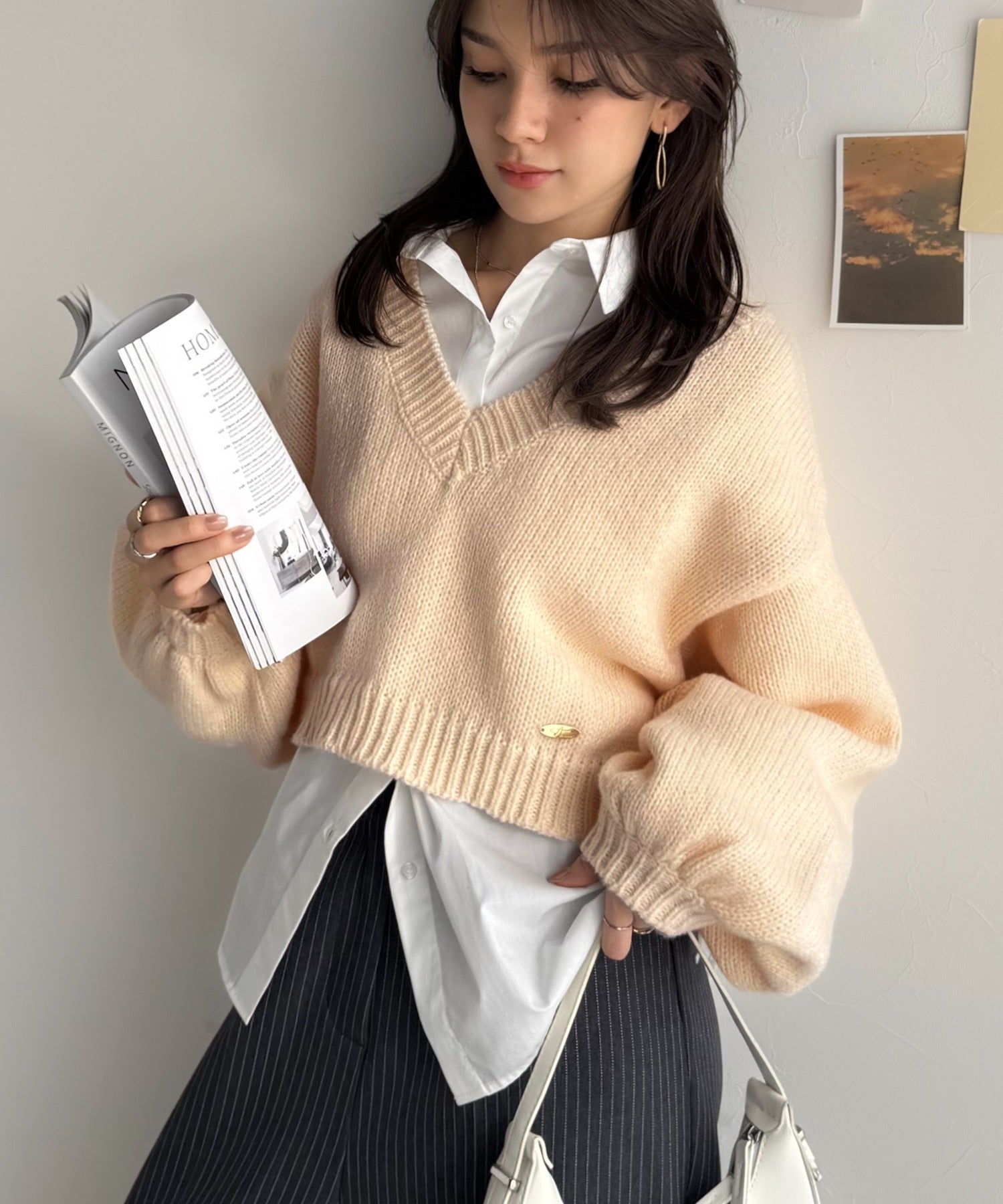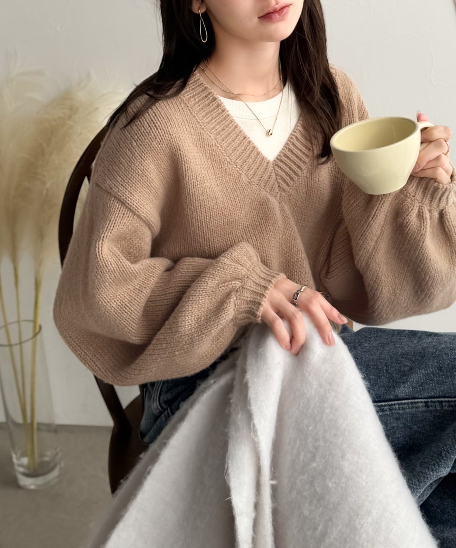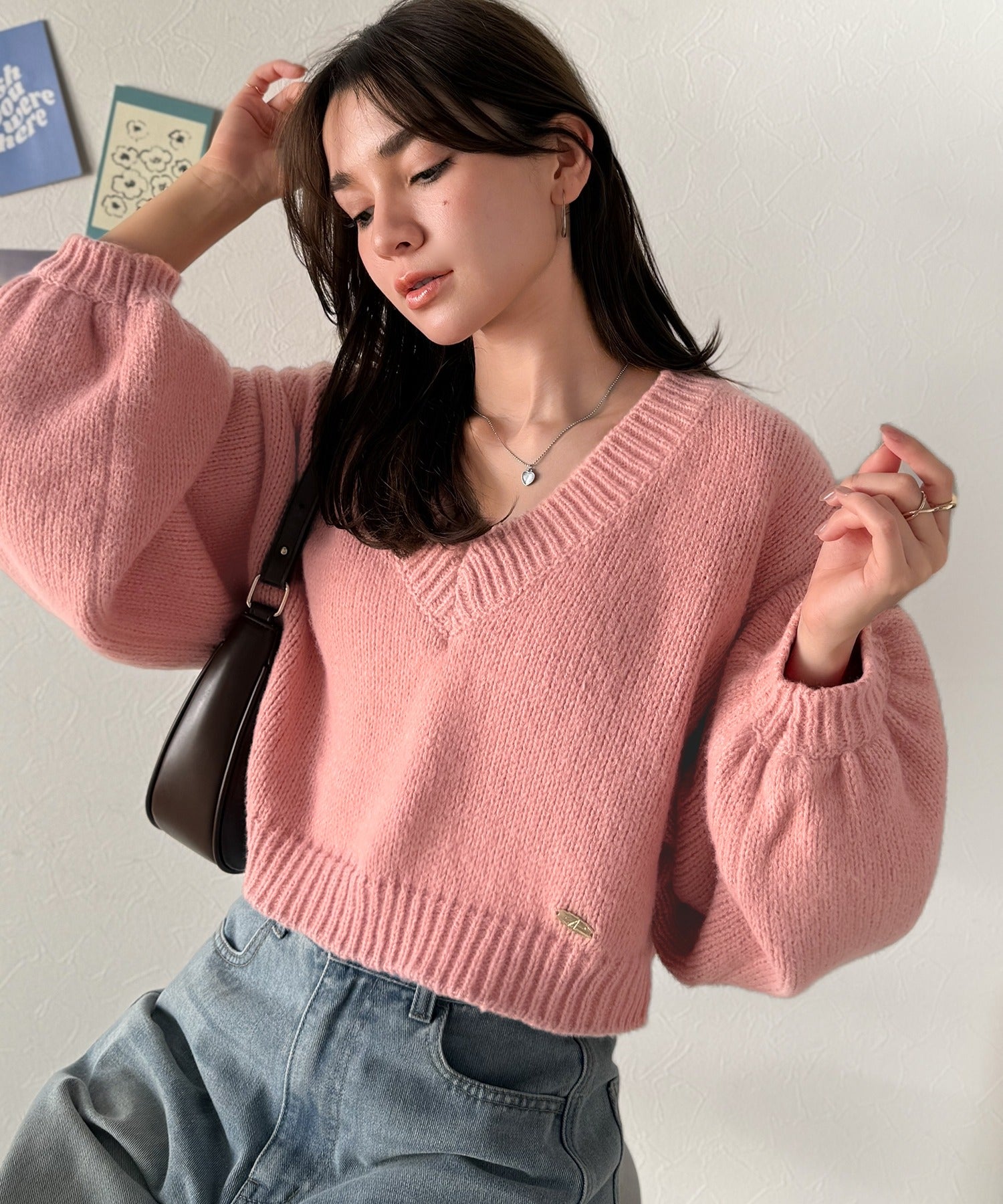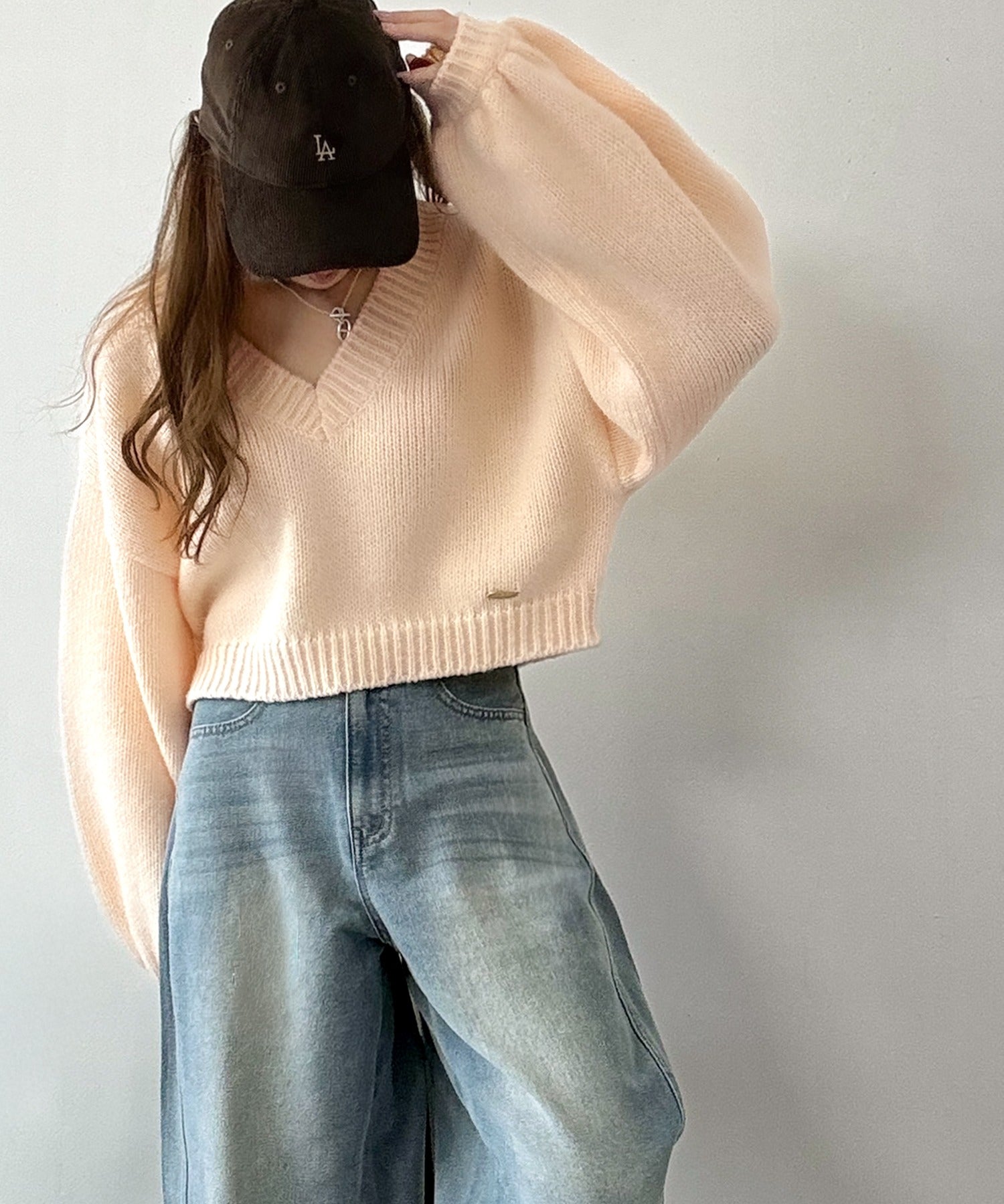 《AYA×クラシカルエルフコラボ》ふんわり可愛く、きらっと上品。プレート付きクロップドローゲージVネックニット(長袖) ce1010523