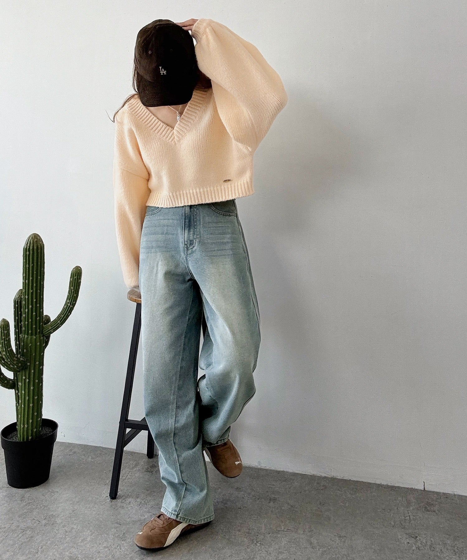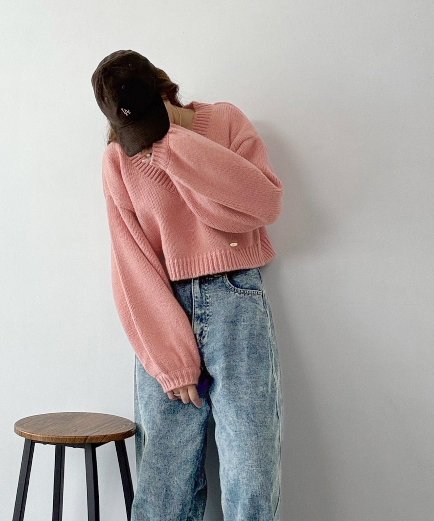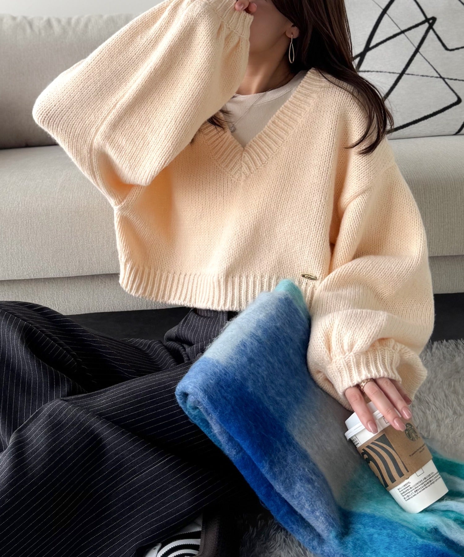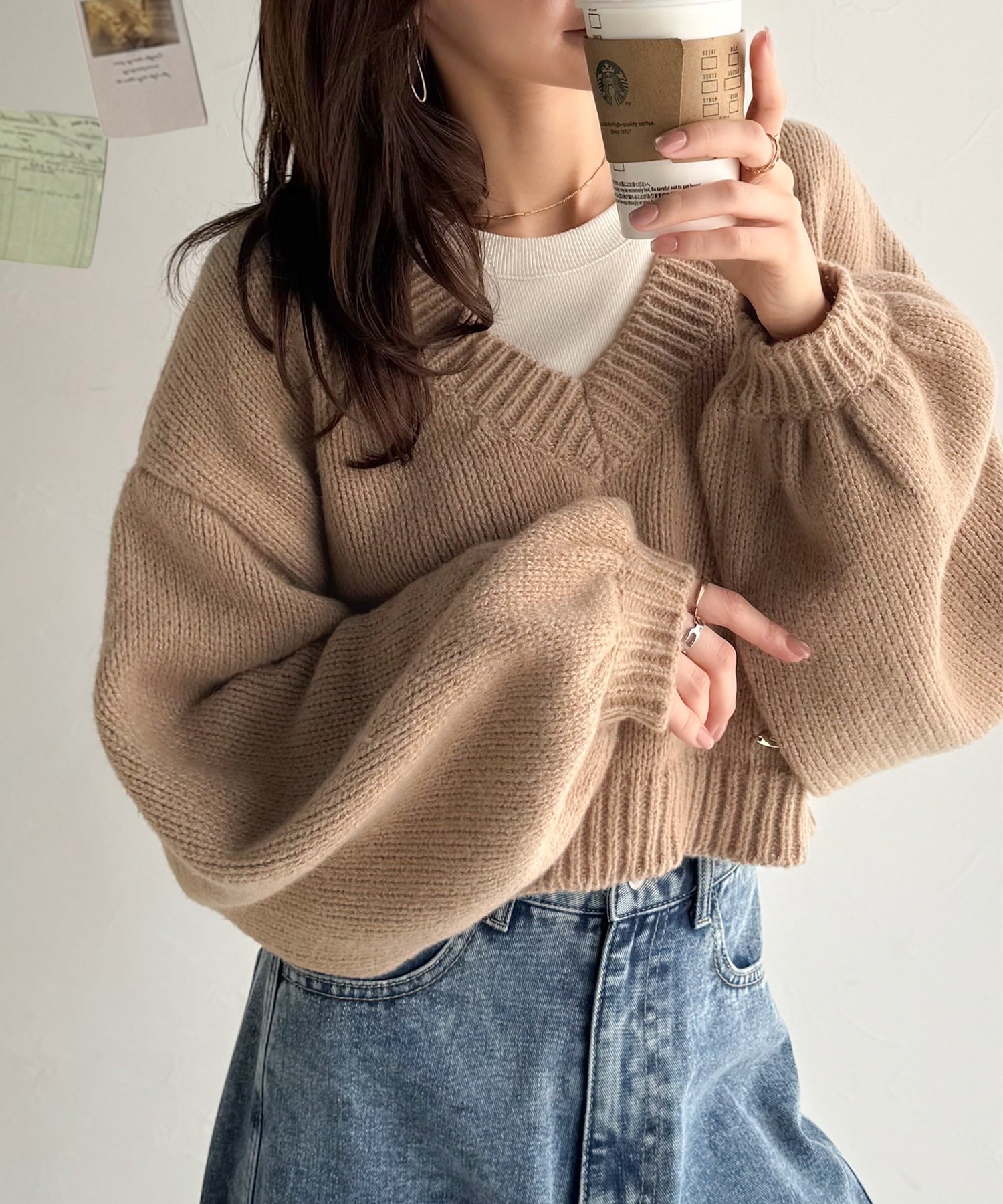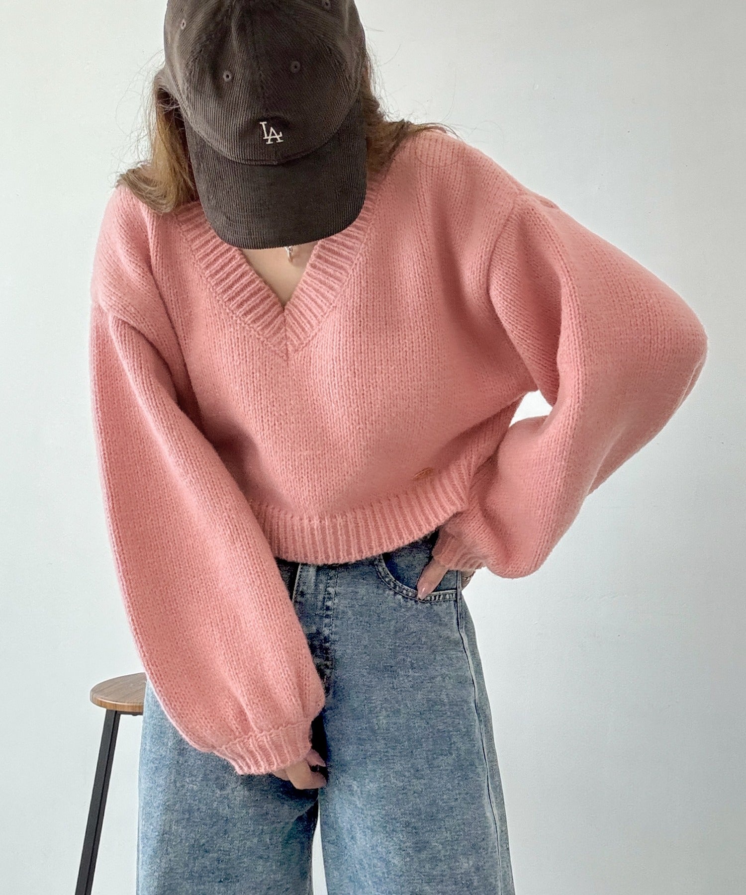 《AYA×クラシカルエルフコラボ》ふんわり可愛く、きらっと上品。プレート付きクロップドローゲージVネックニット(長袖) ce1010523