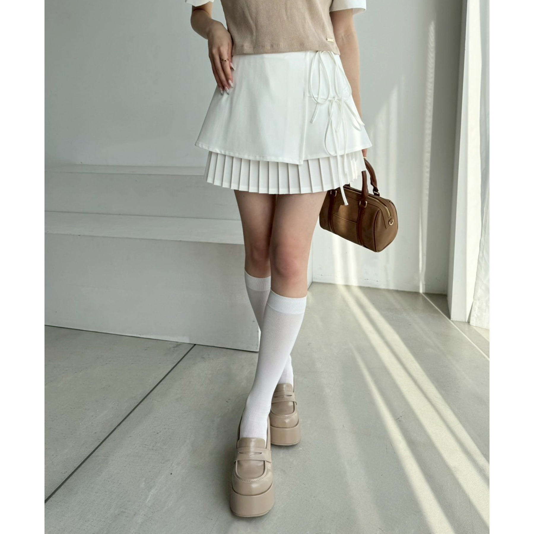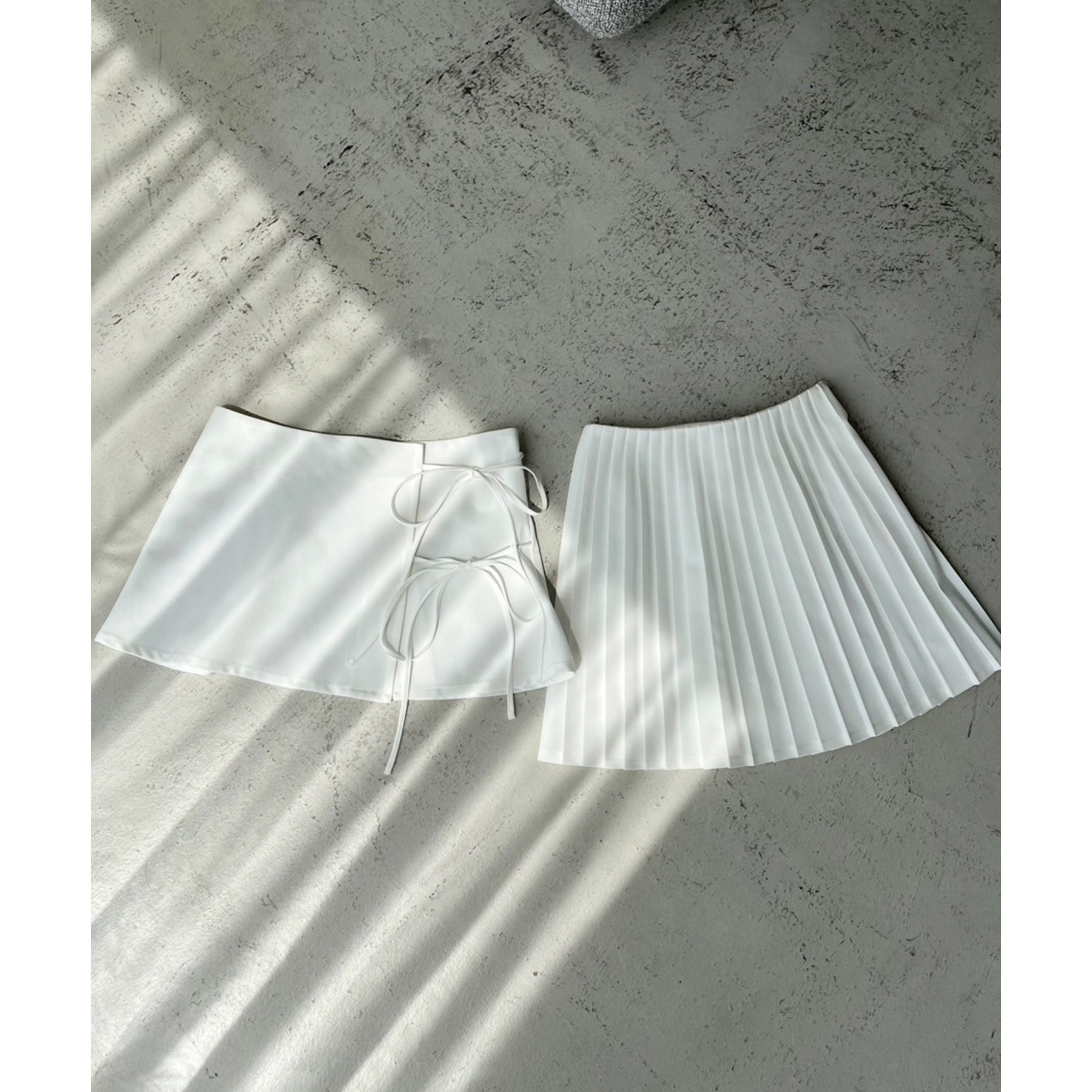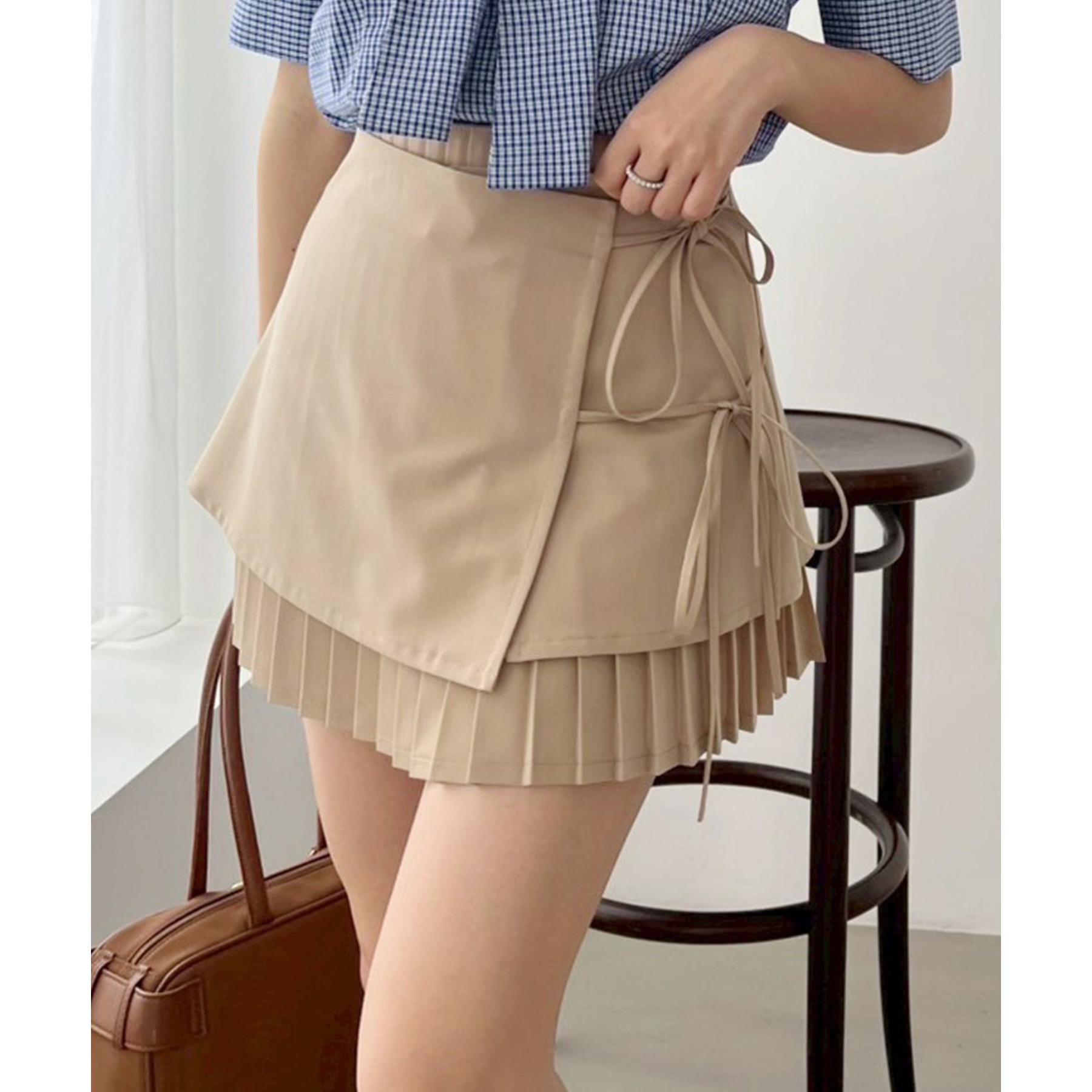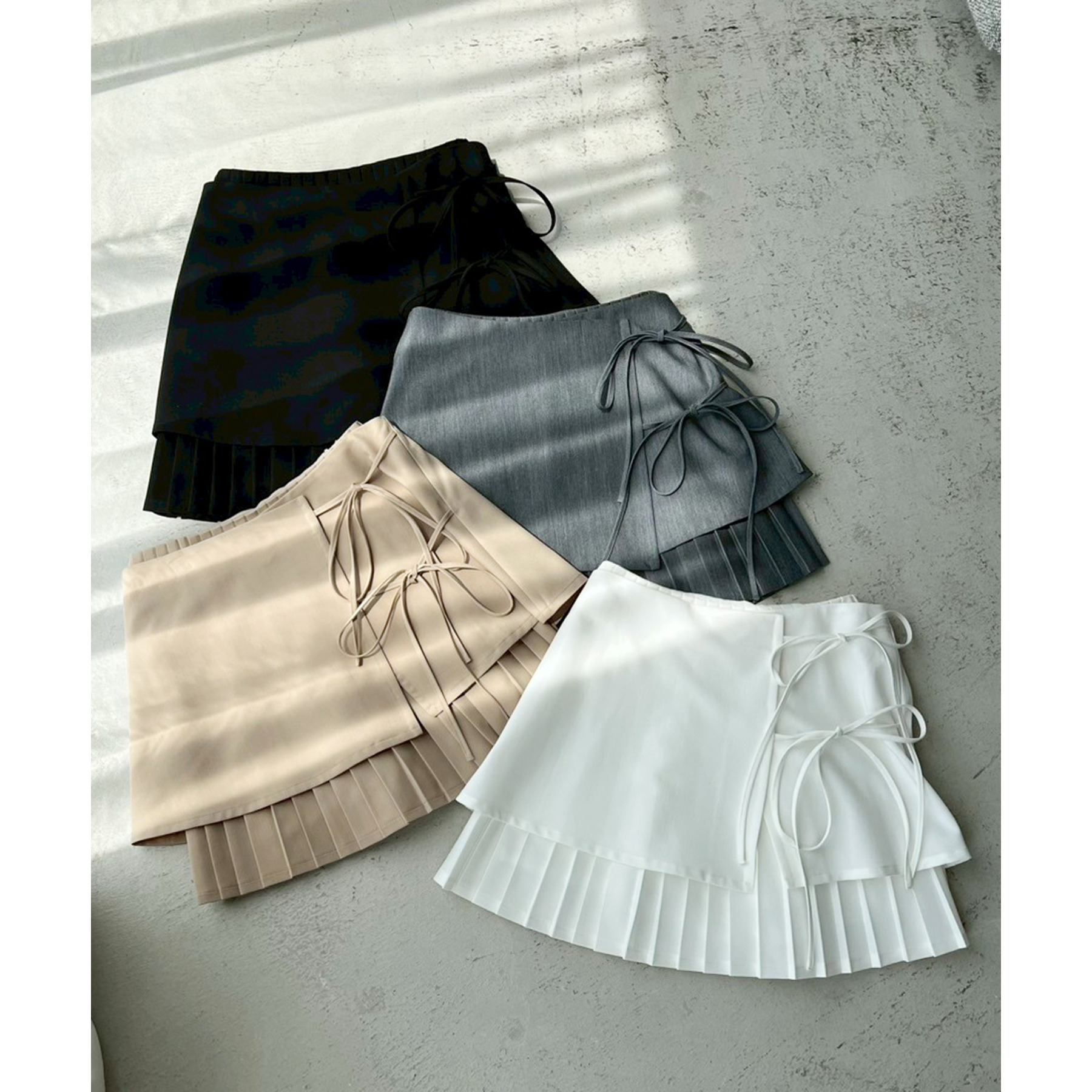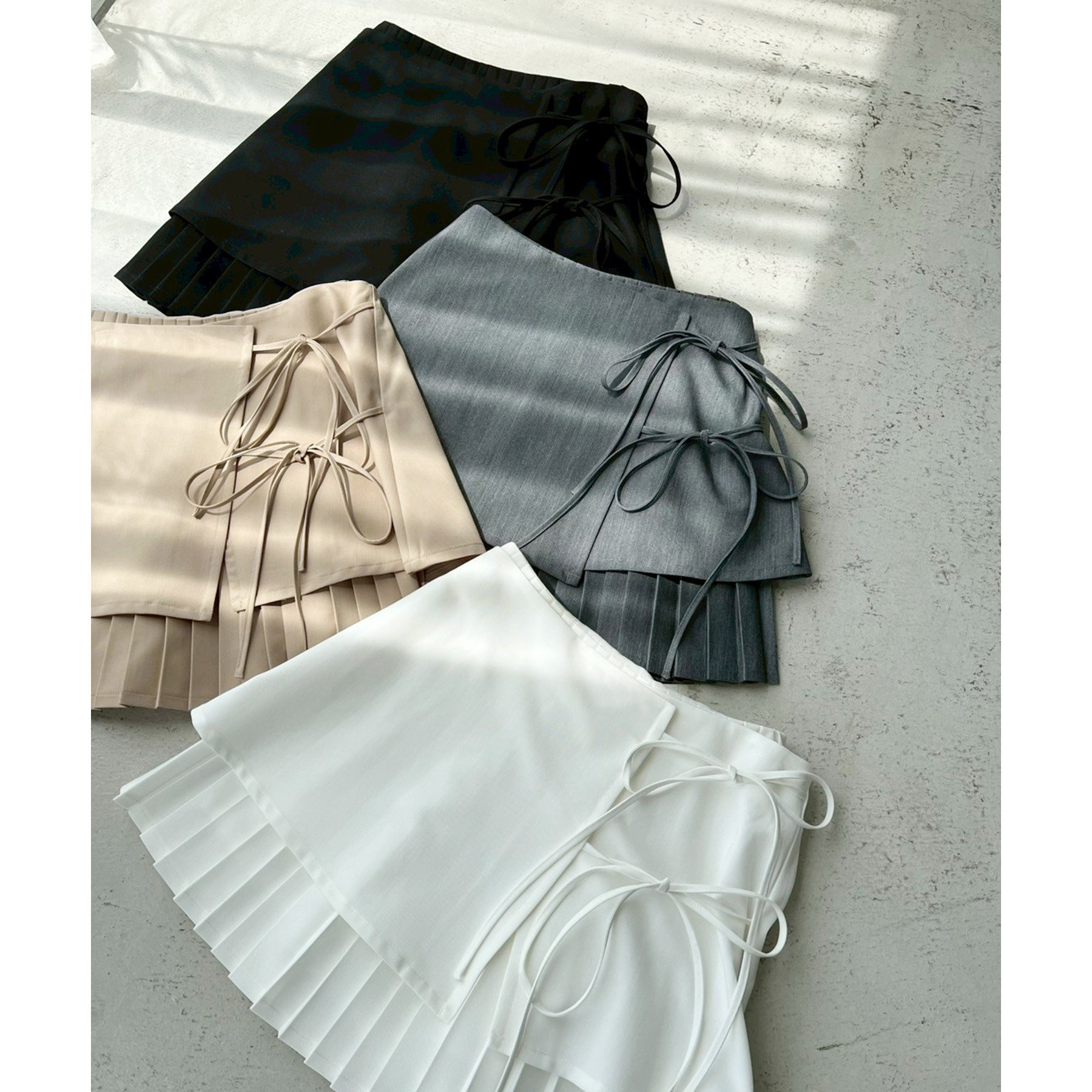 腰にリボンを付けたラップデザインのスカートと細プリーツスカートがセットになったアイテム