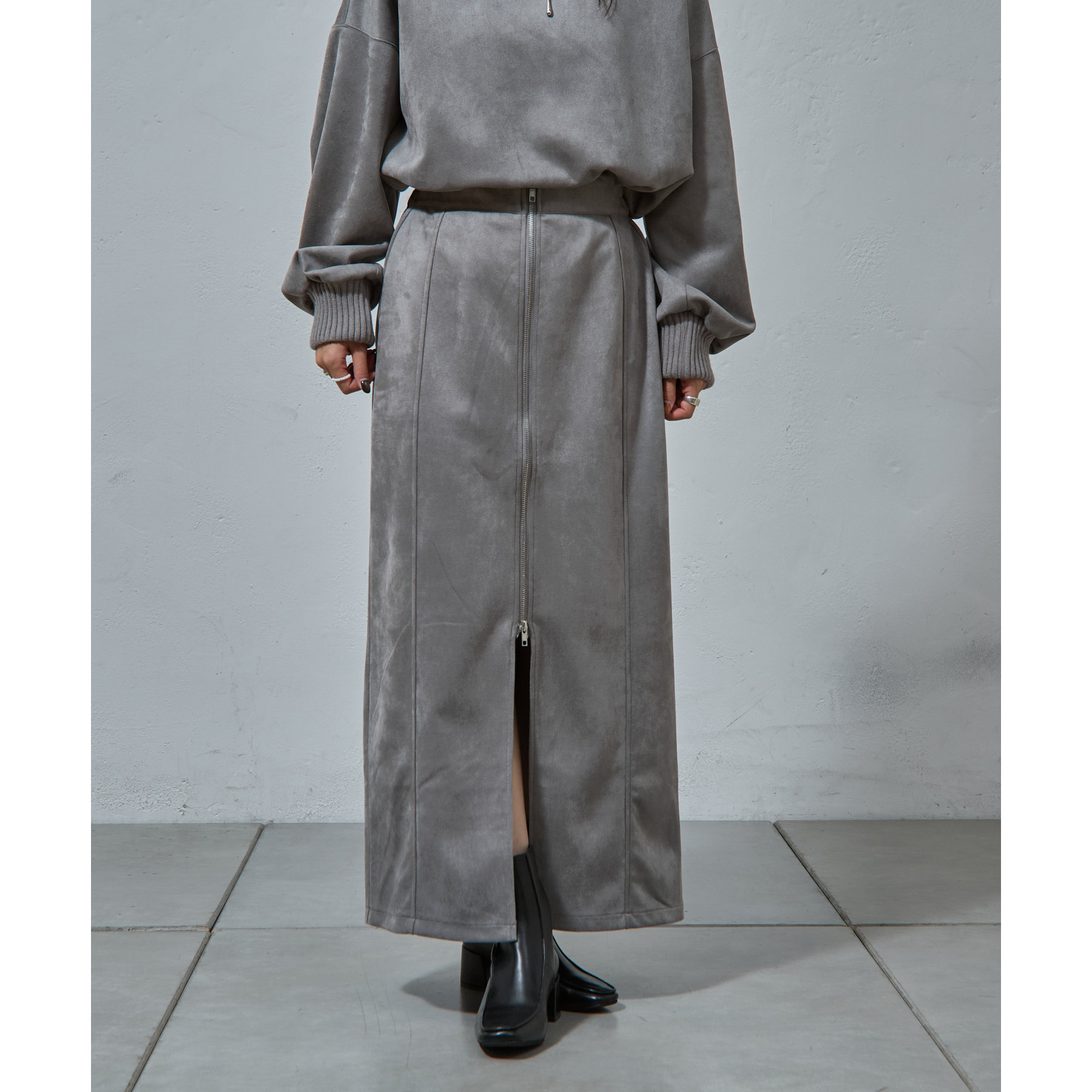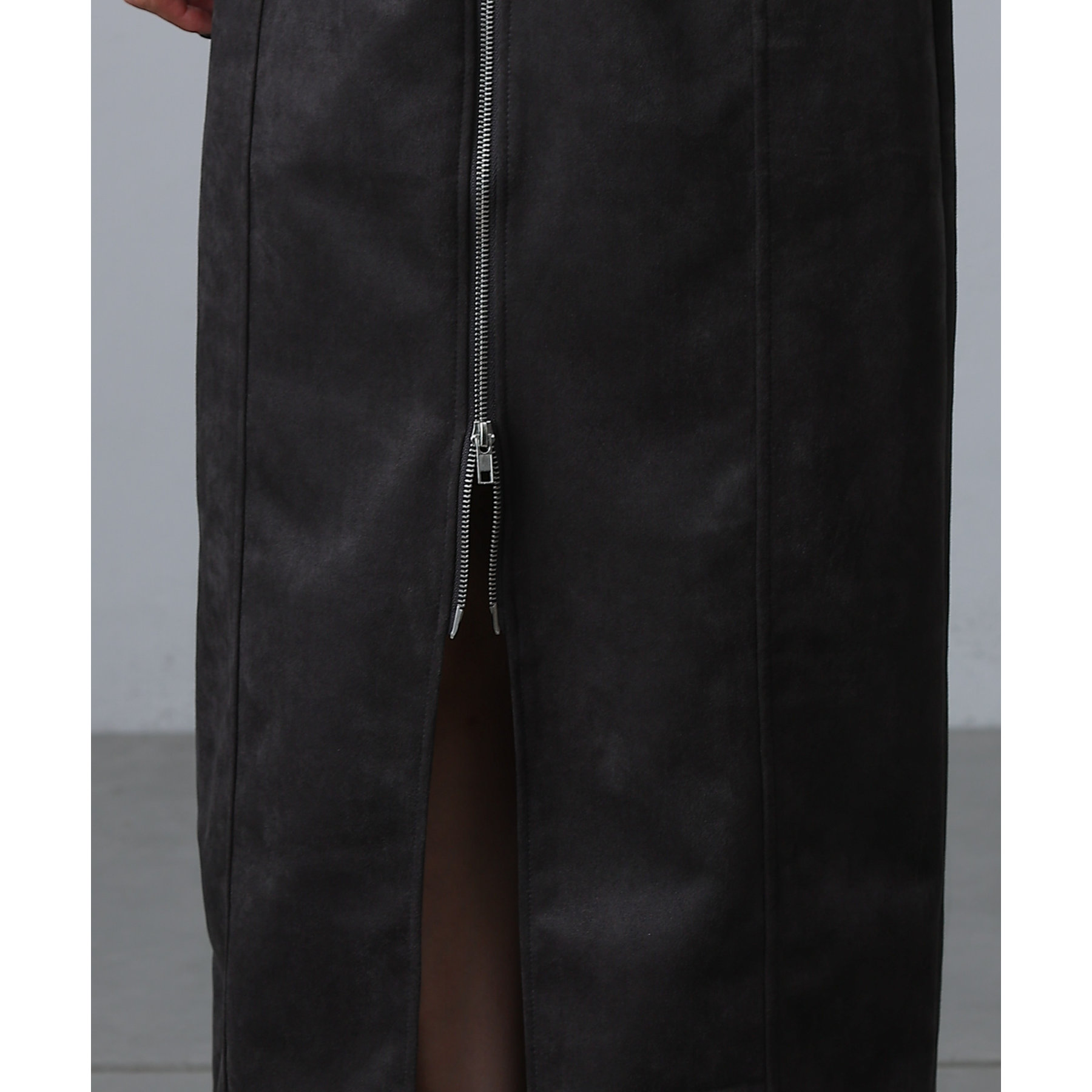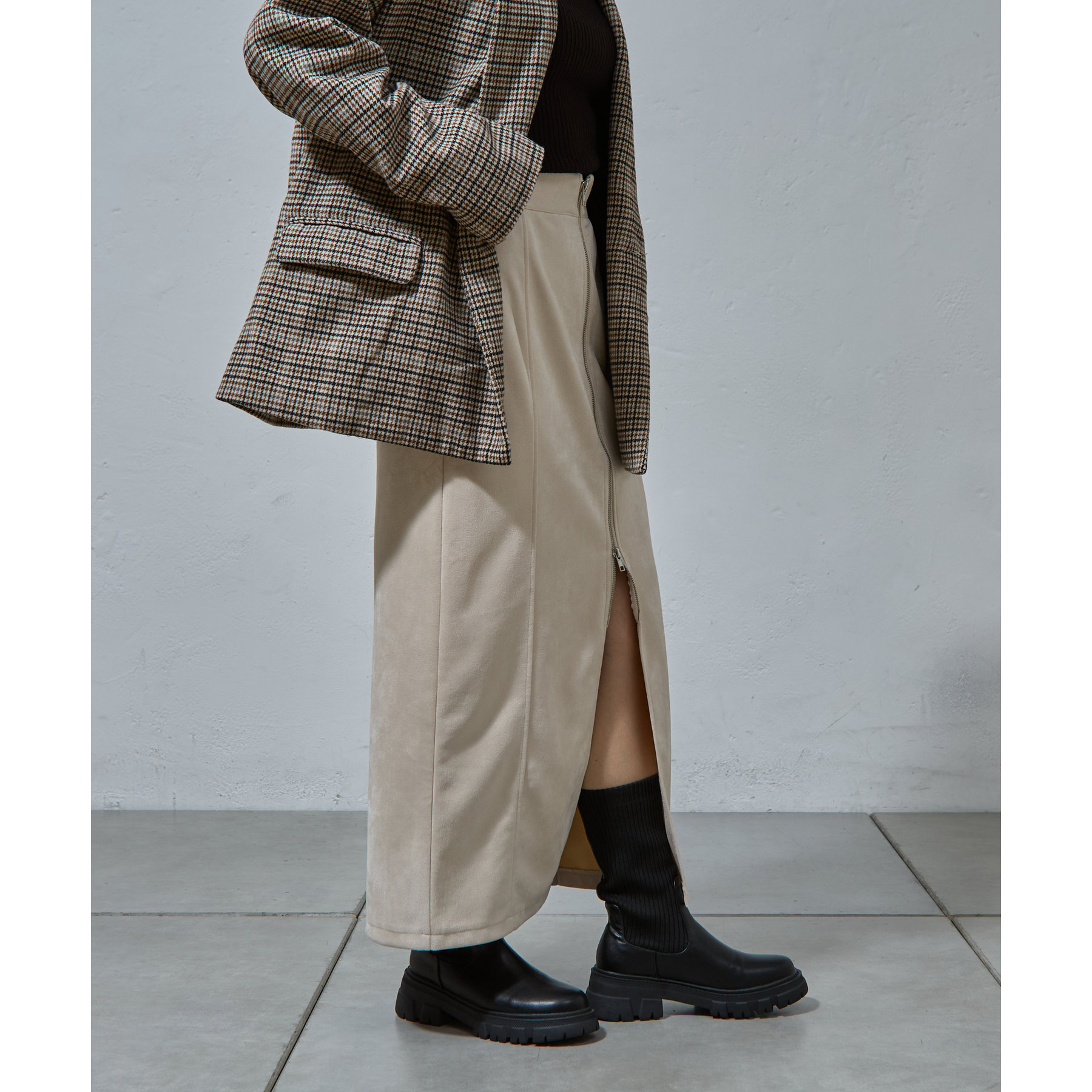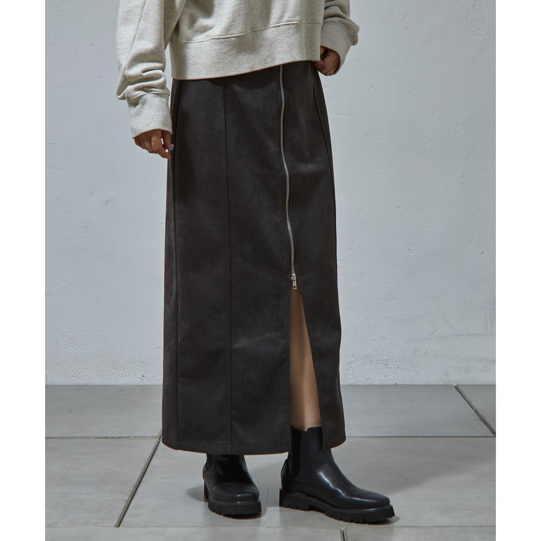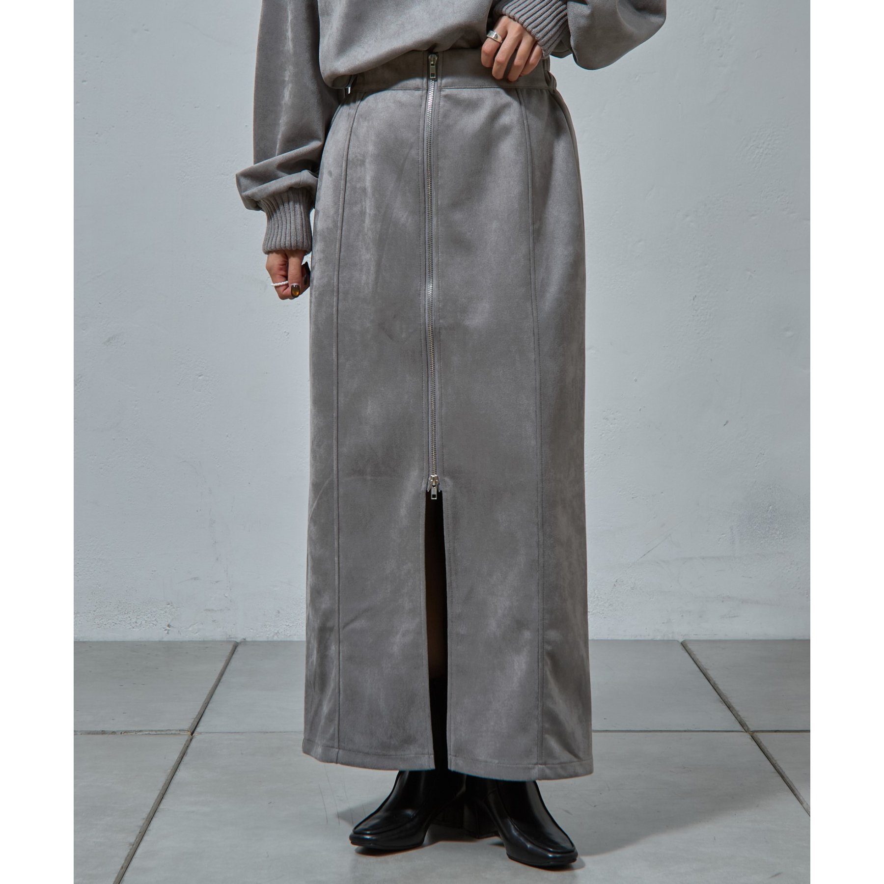 フロントについたダブルジップがポイントなスエードポンチスカート