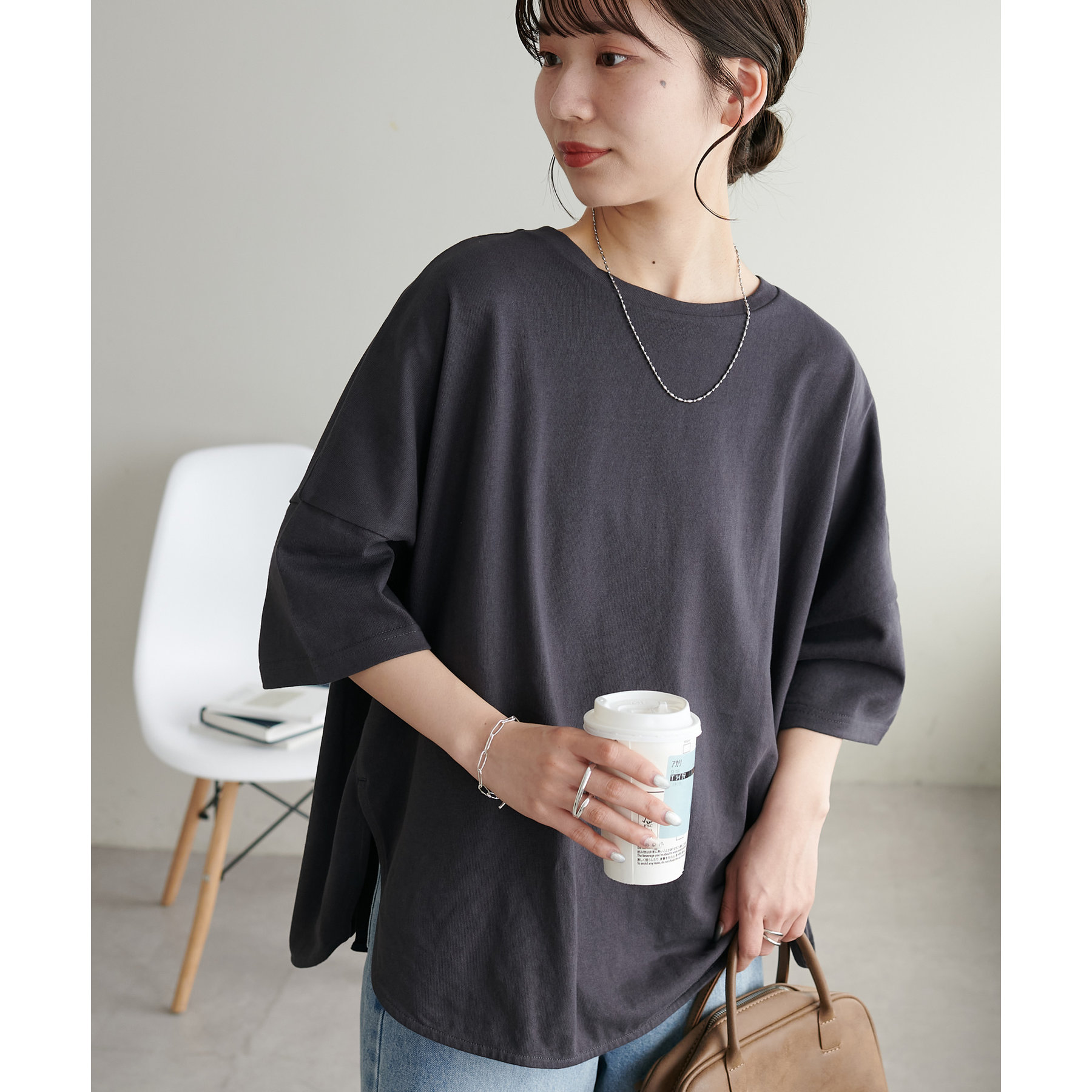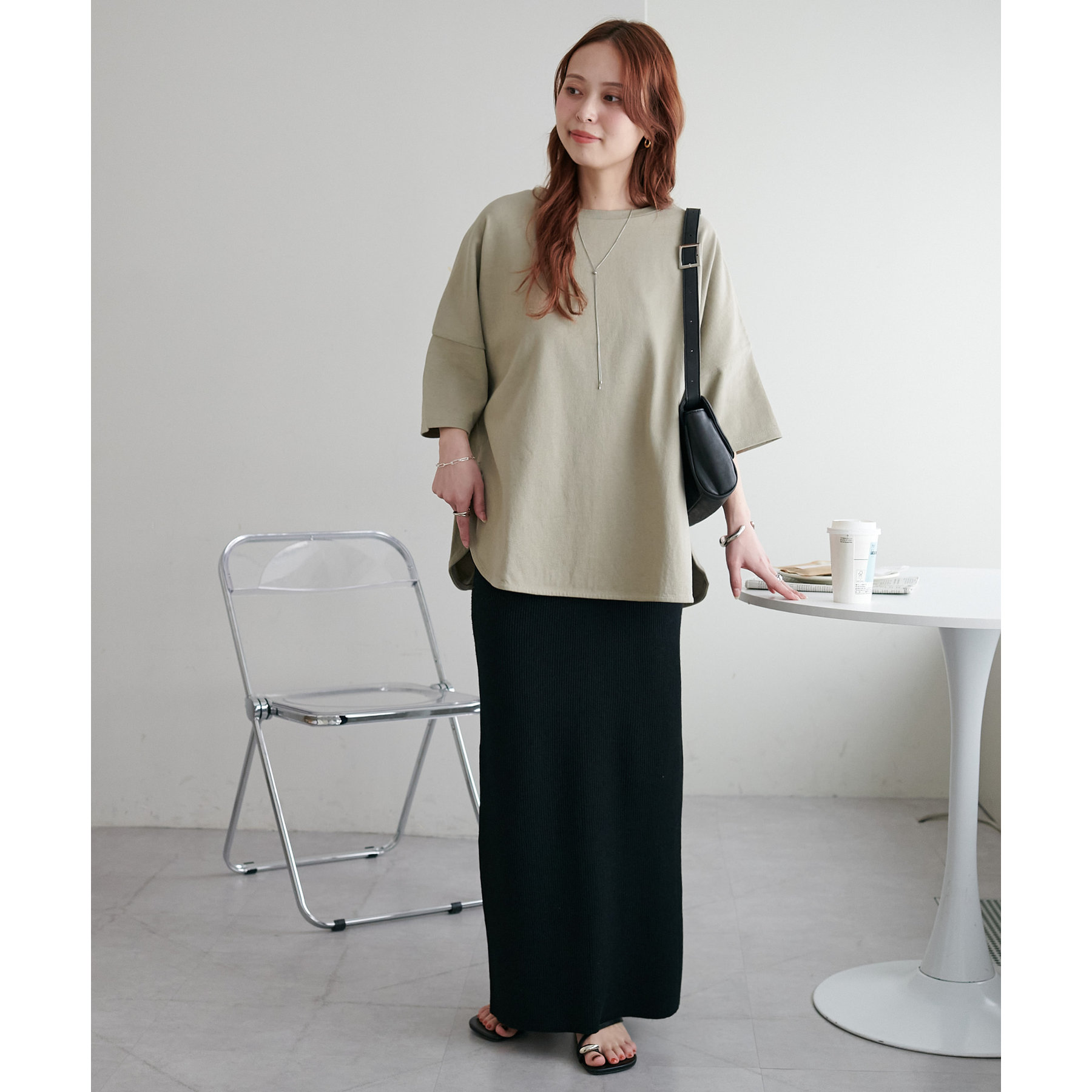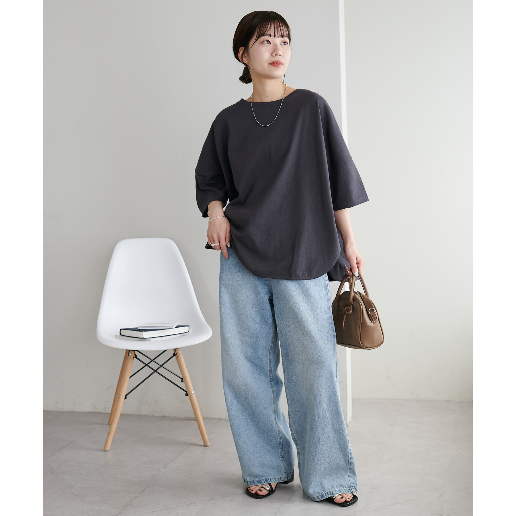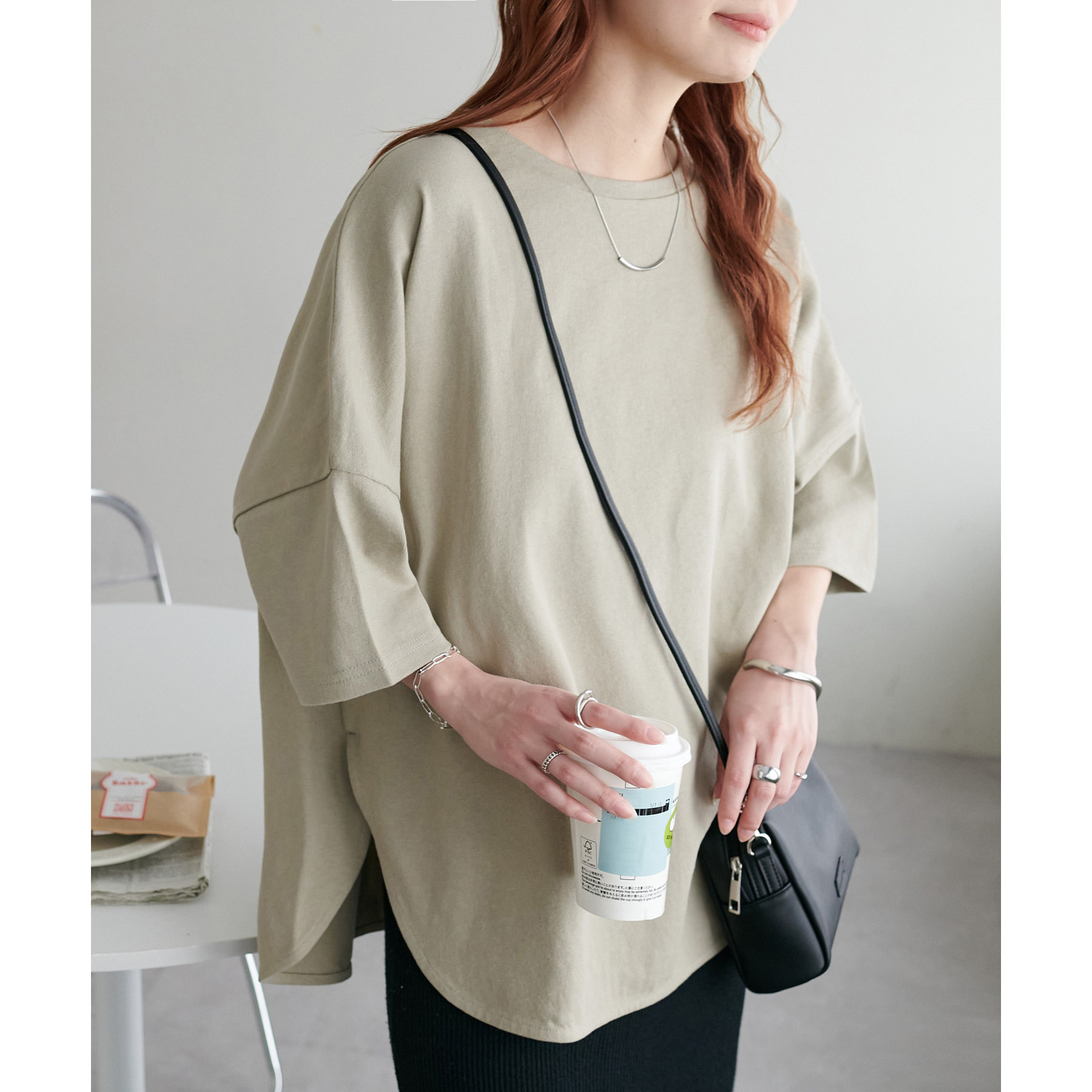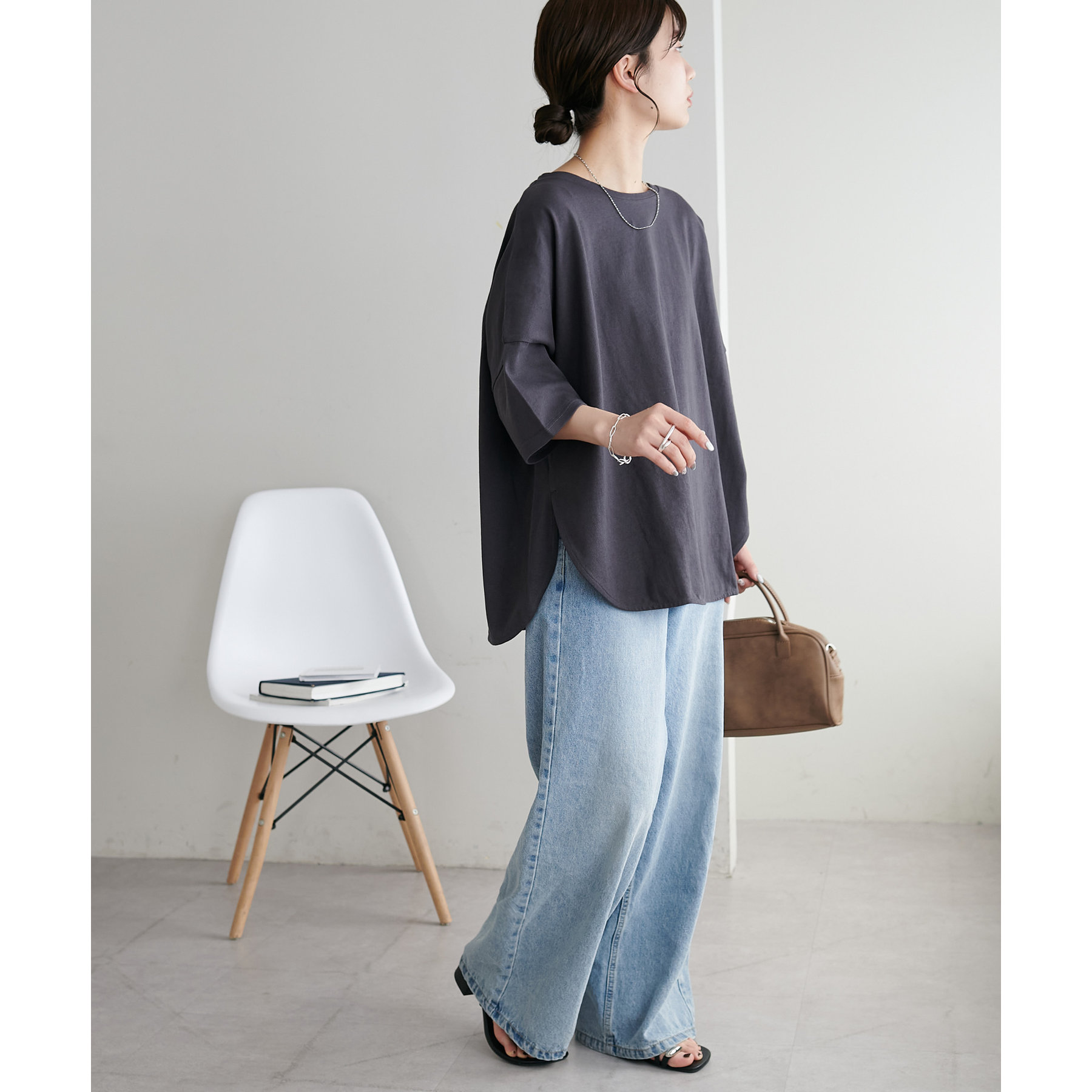 155cmスタッフ:裾のラウンドカットで腰回りもカバーできて安心。シンプルだからこそ、アクセやボトム次第でいろんな印象が楽しめます◎