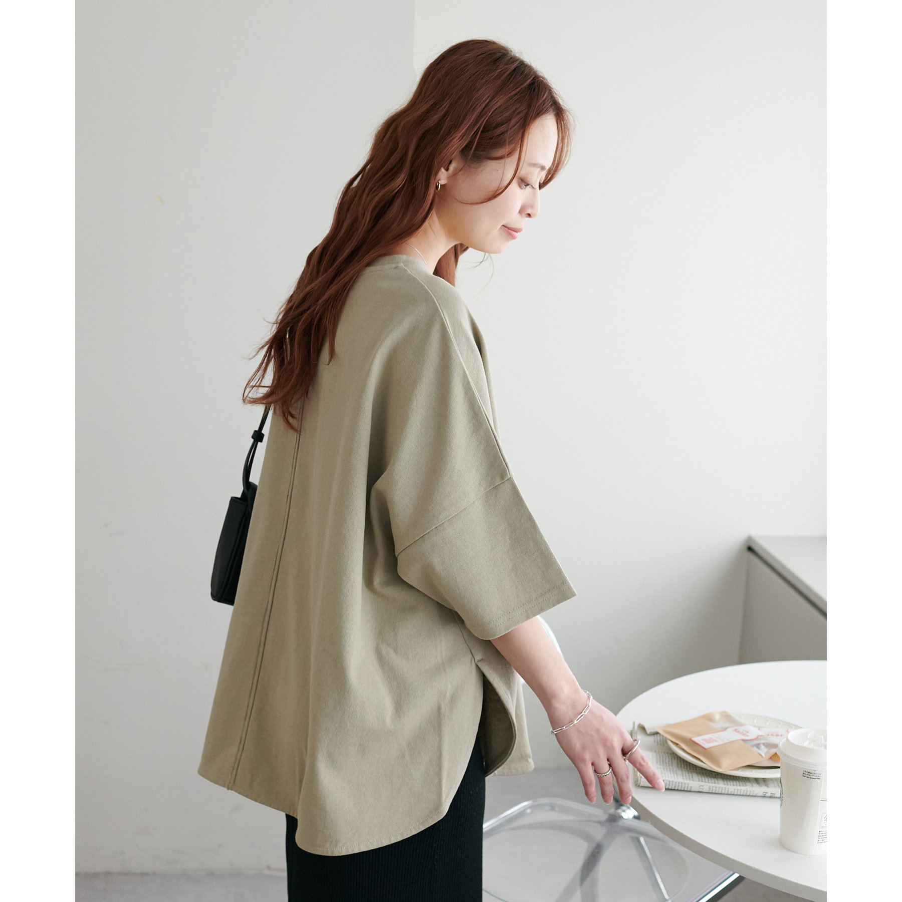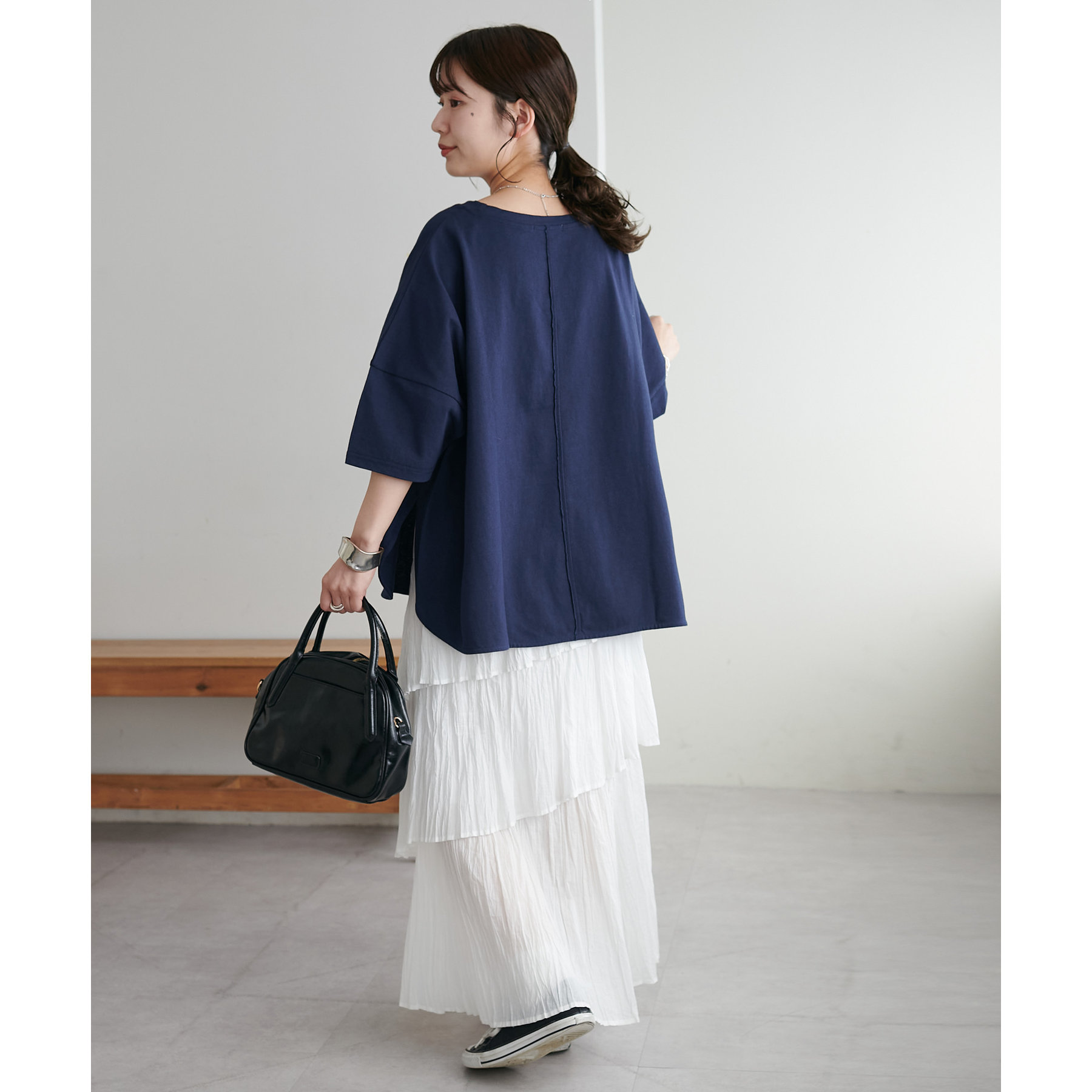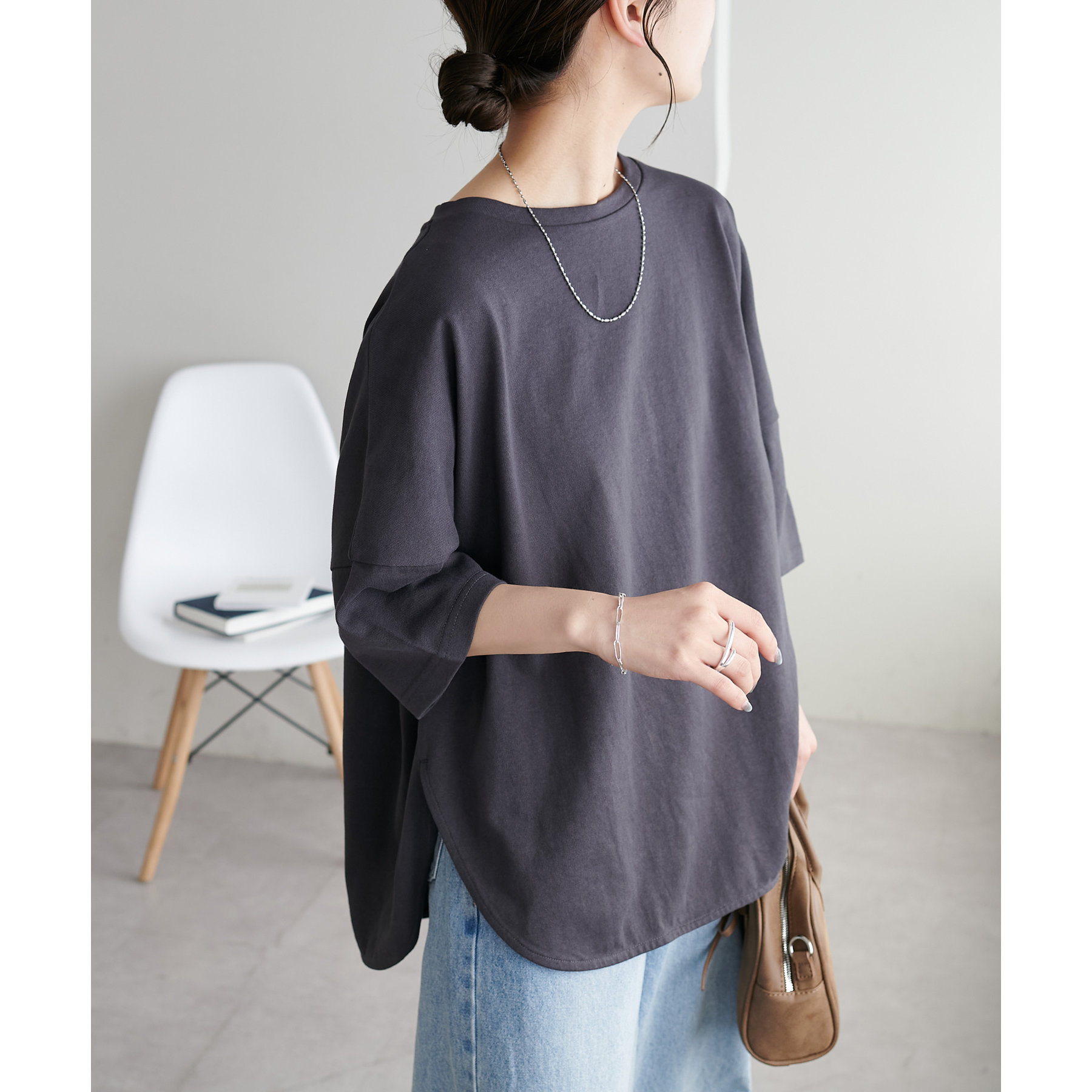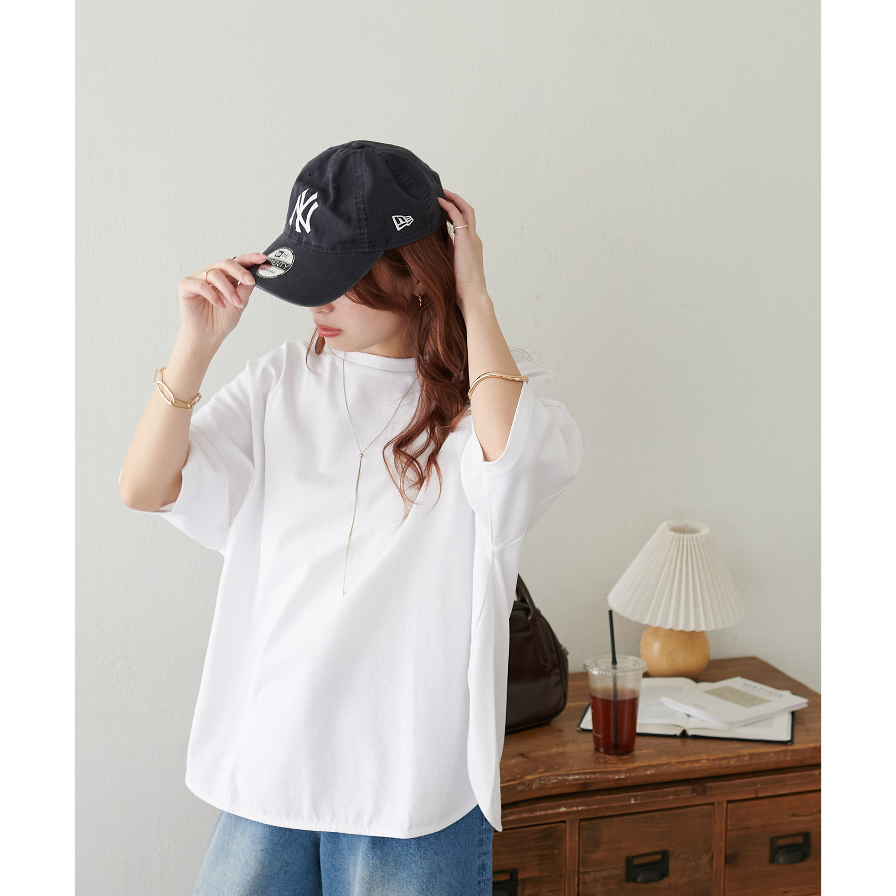 155cmスタッフ:裾のラウンドカットで腰回りもカバーできて安心。シンプルだからこそ、アクセやボトム次第でいろんな印象が楽しめます◎