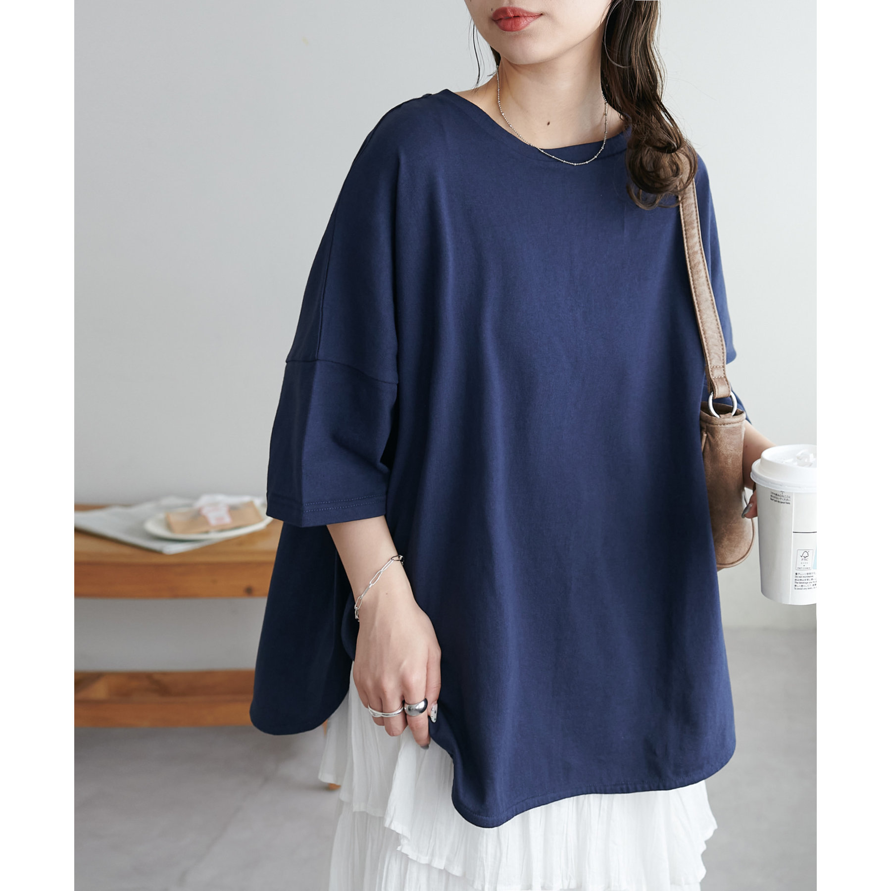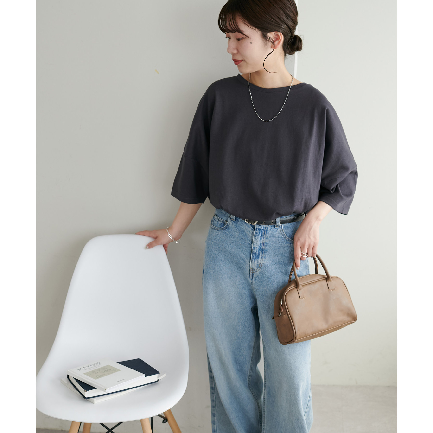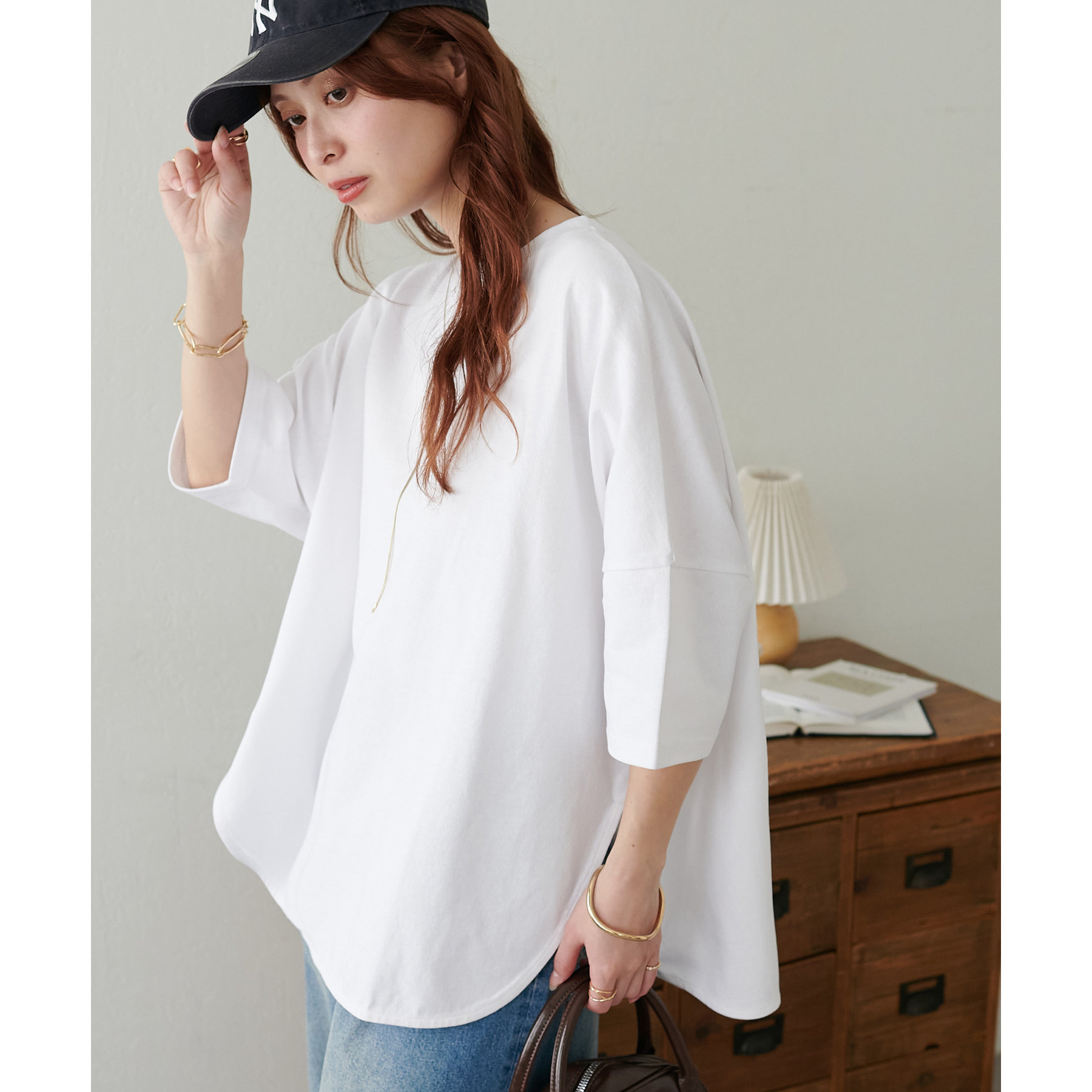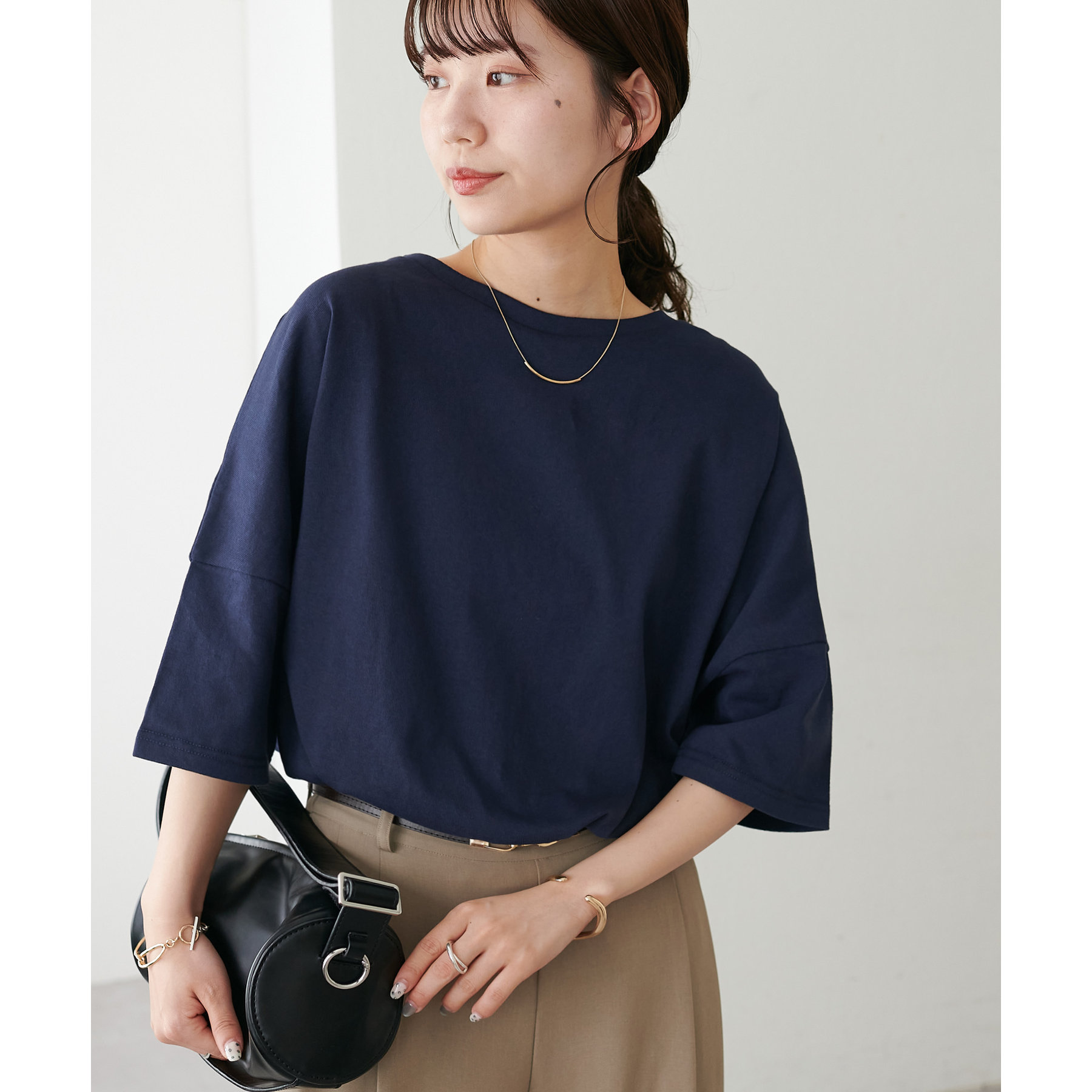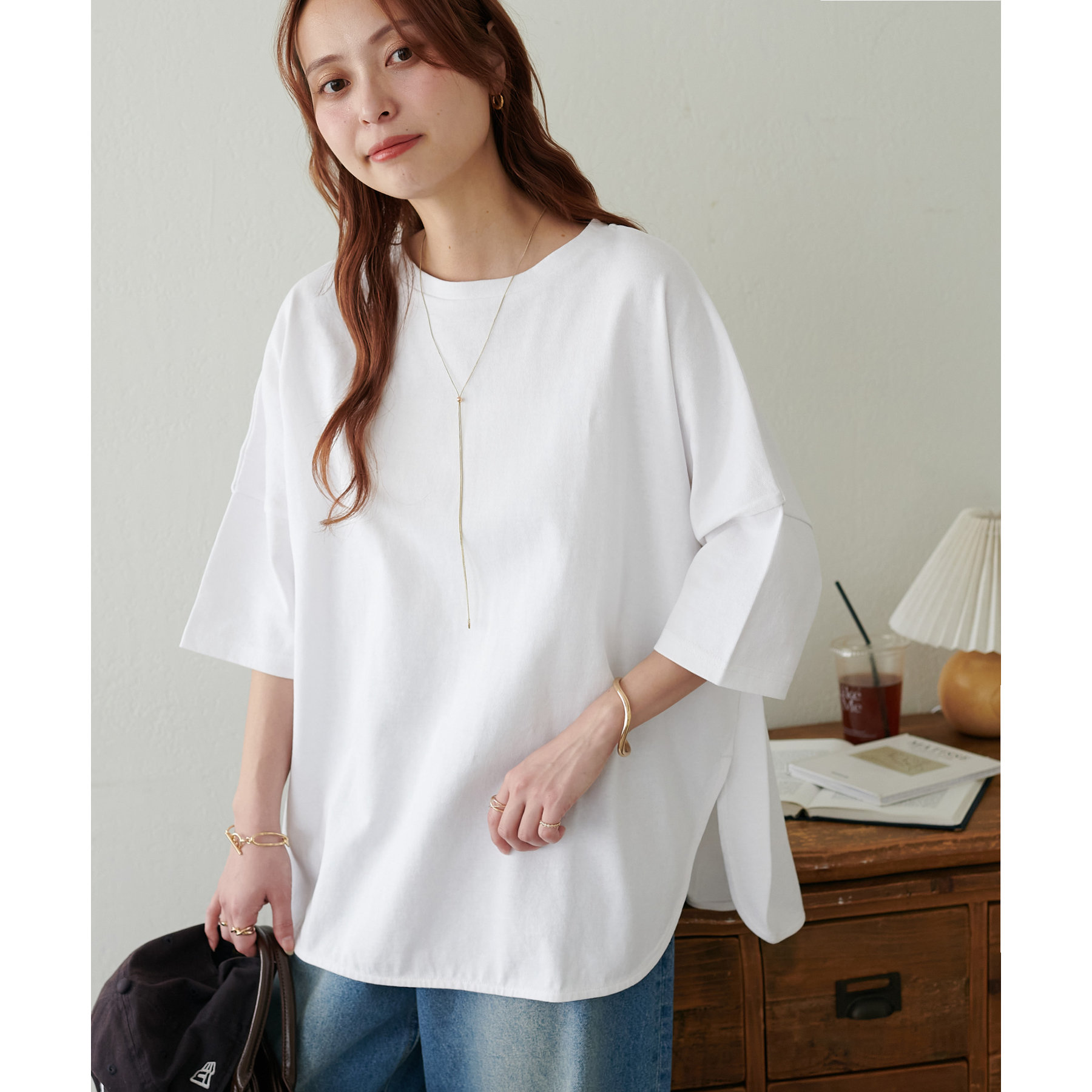 155cmスタッフ:裾のラウンドカットで腰回りもカバーできて安心。シンプルだからこそ、アクセやボトム次第でいろんな印象が楽しめます◎
