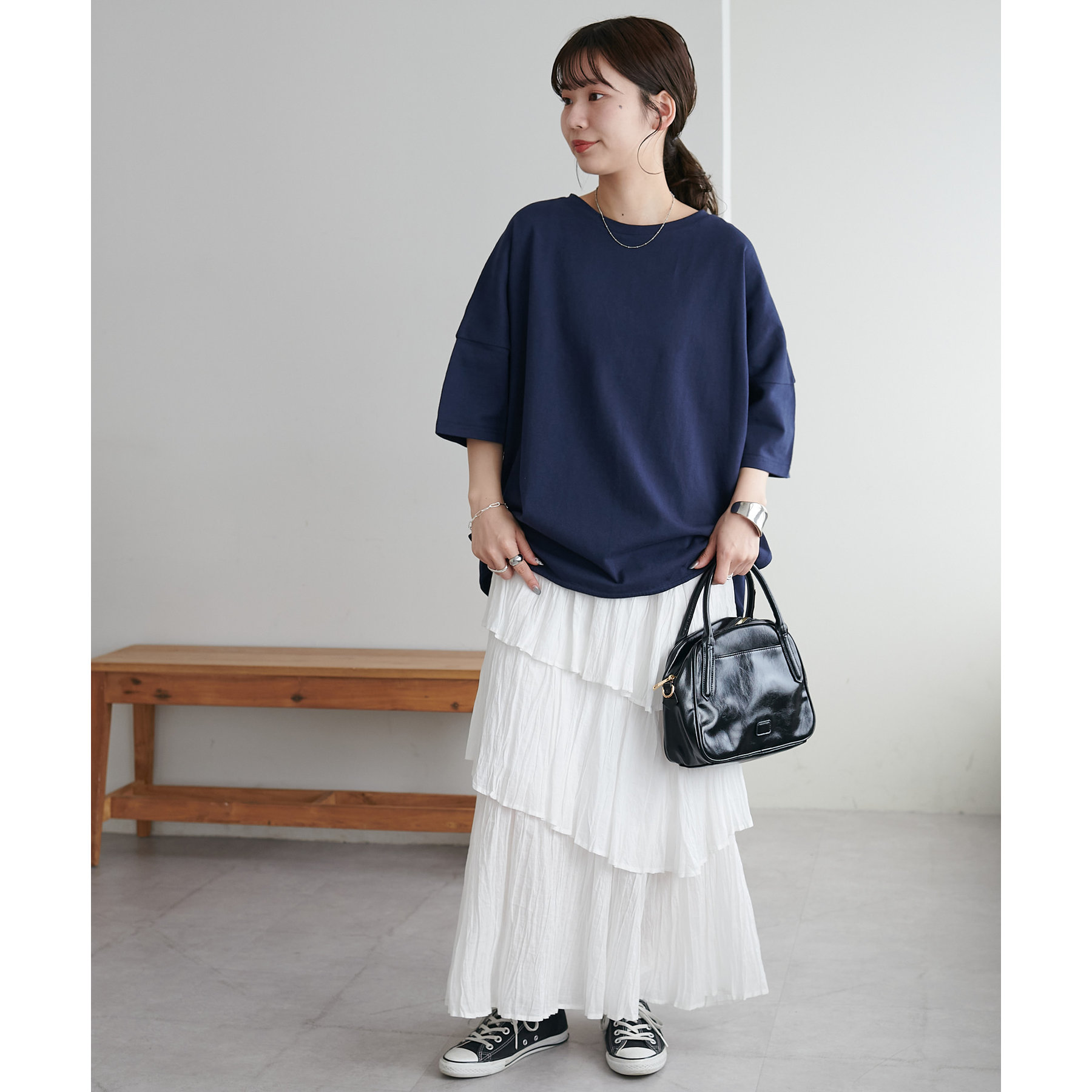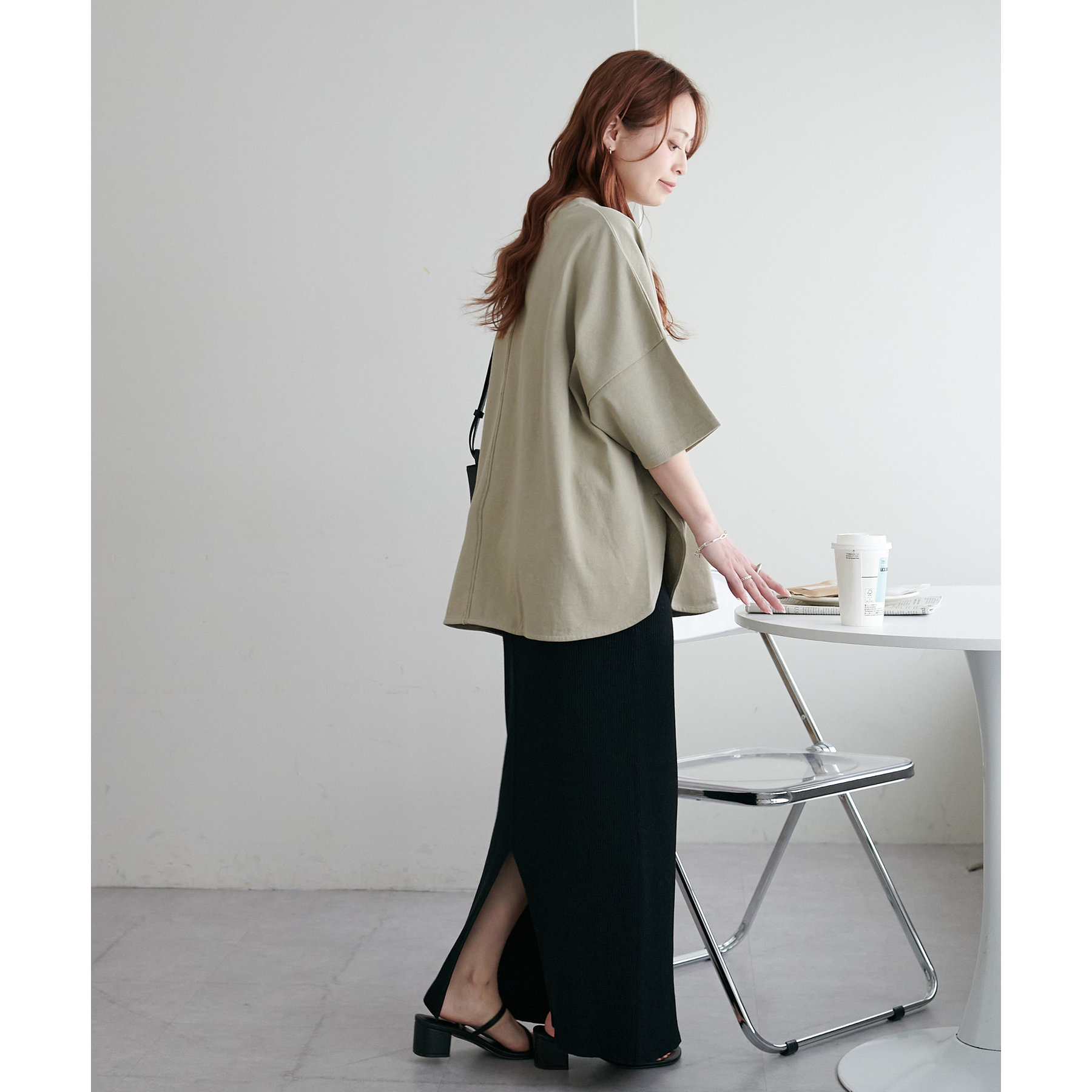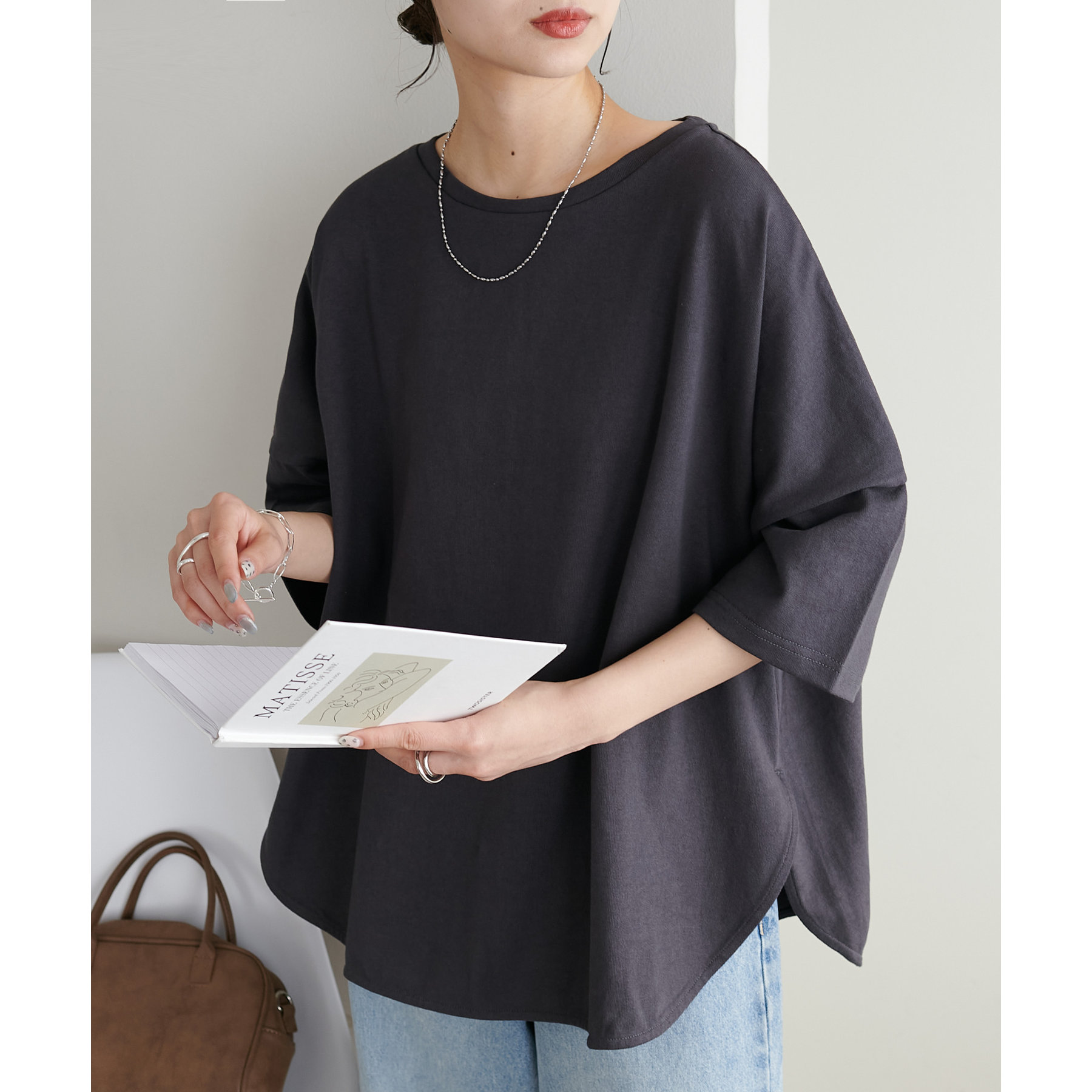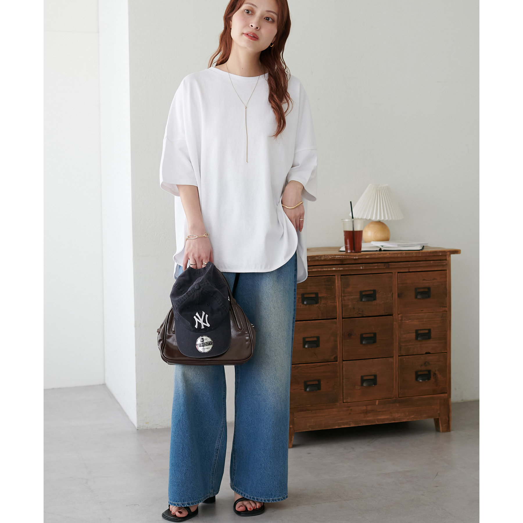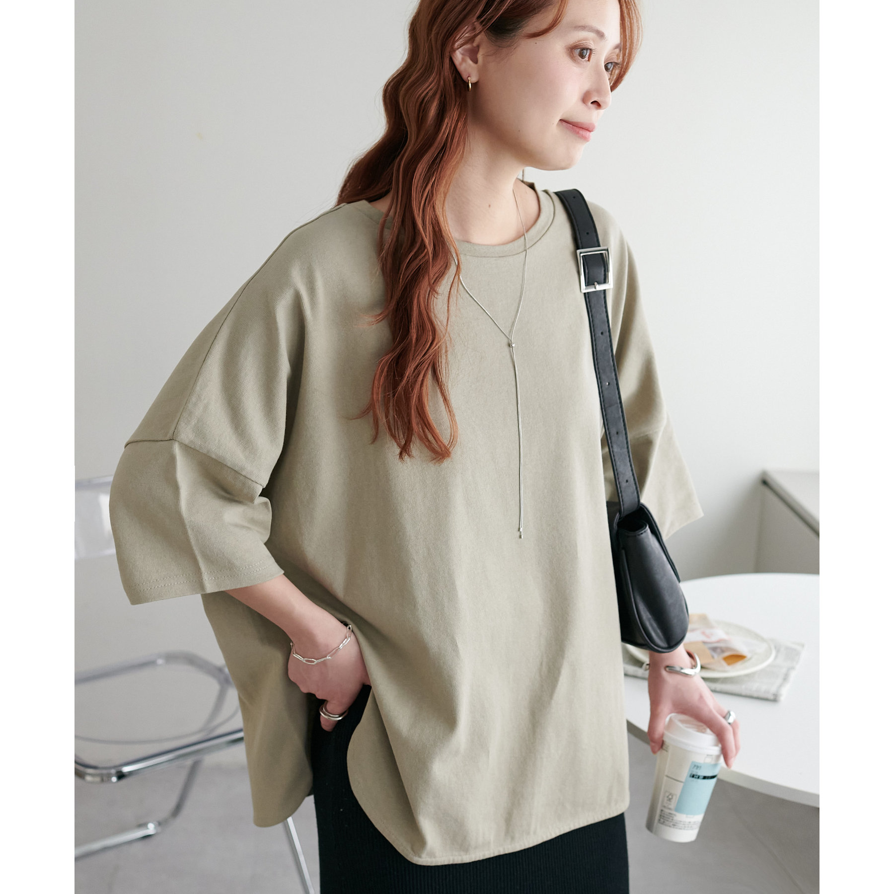 155cmスタッフ:裾のラウンドカットで腰回りもカバーできて安心。シンプルだからこそ、アクセやボトム次第でいろんな印象が楽しめます◎