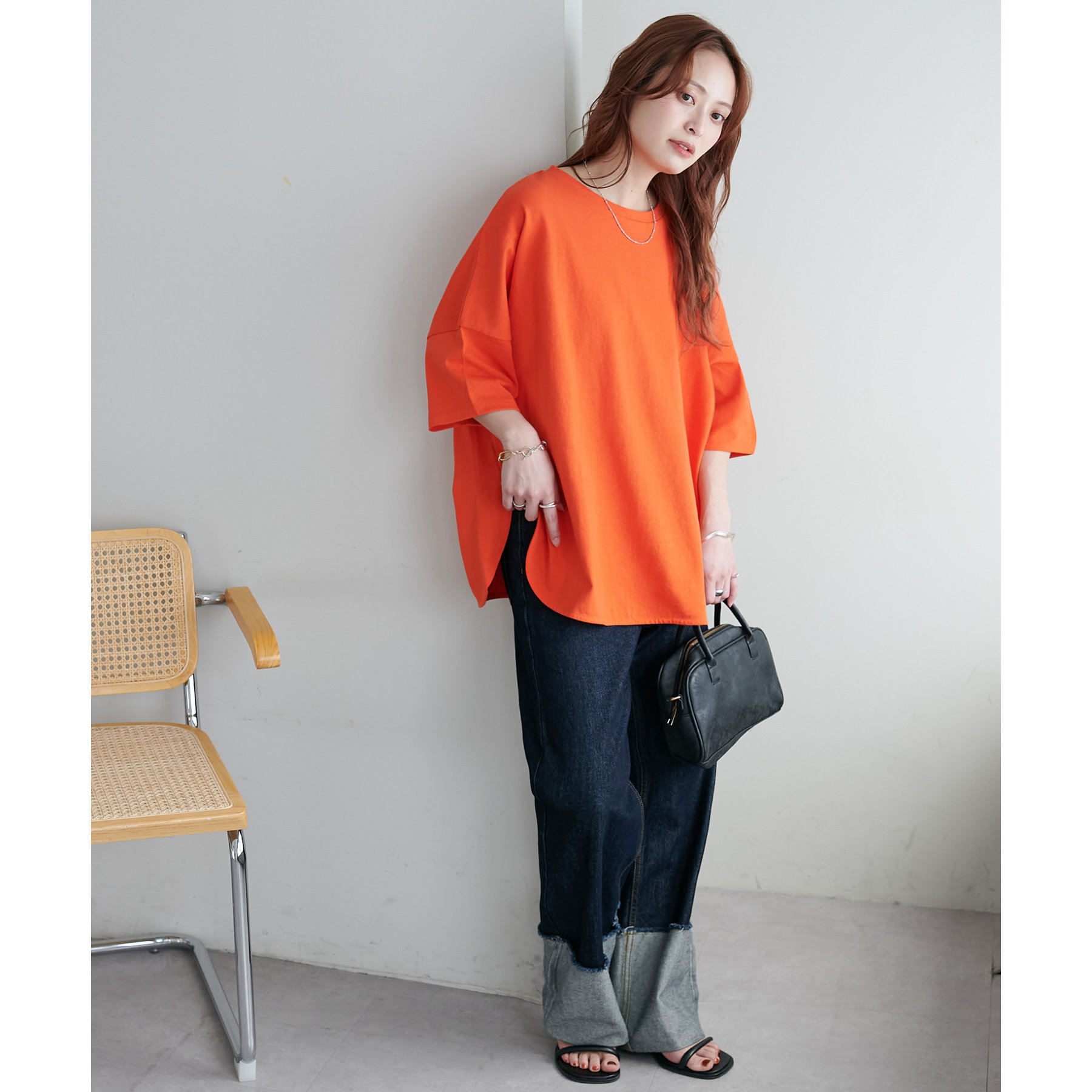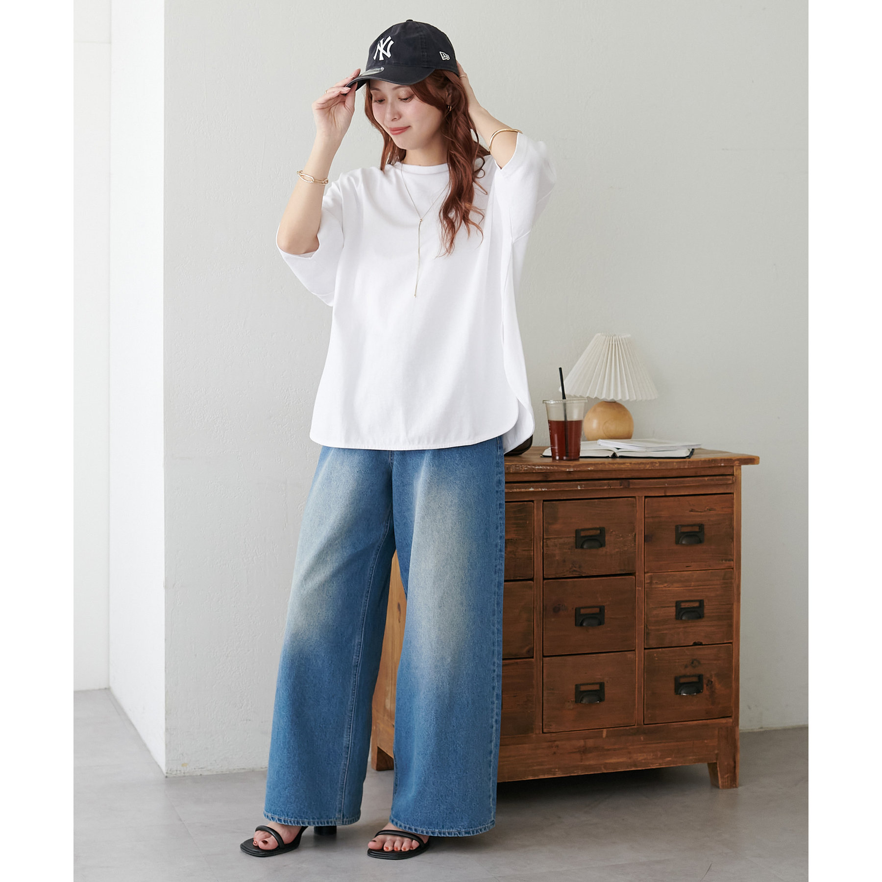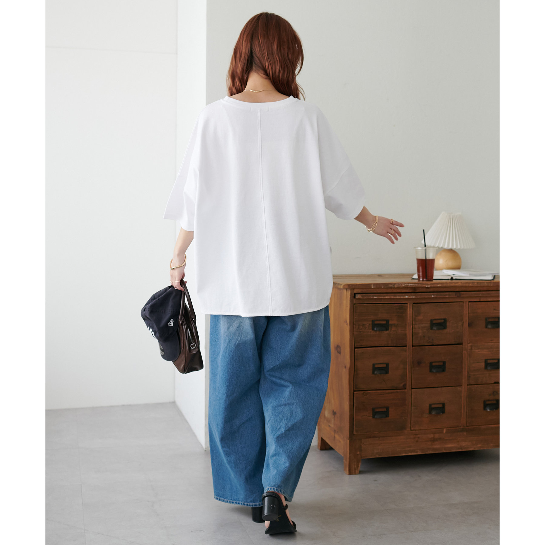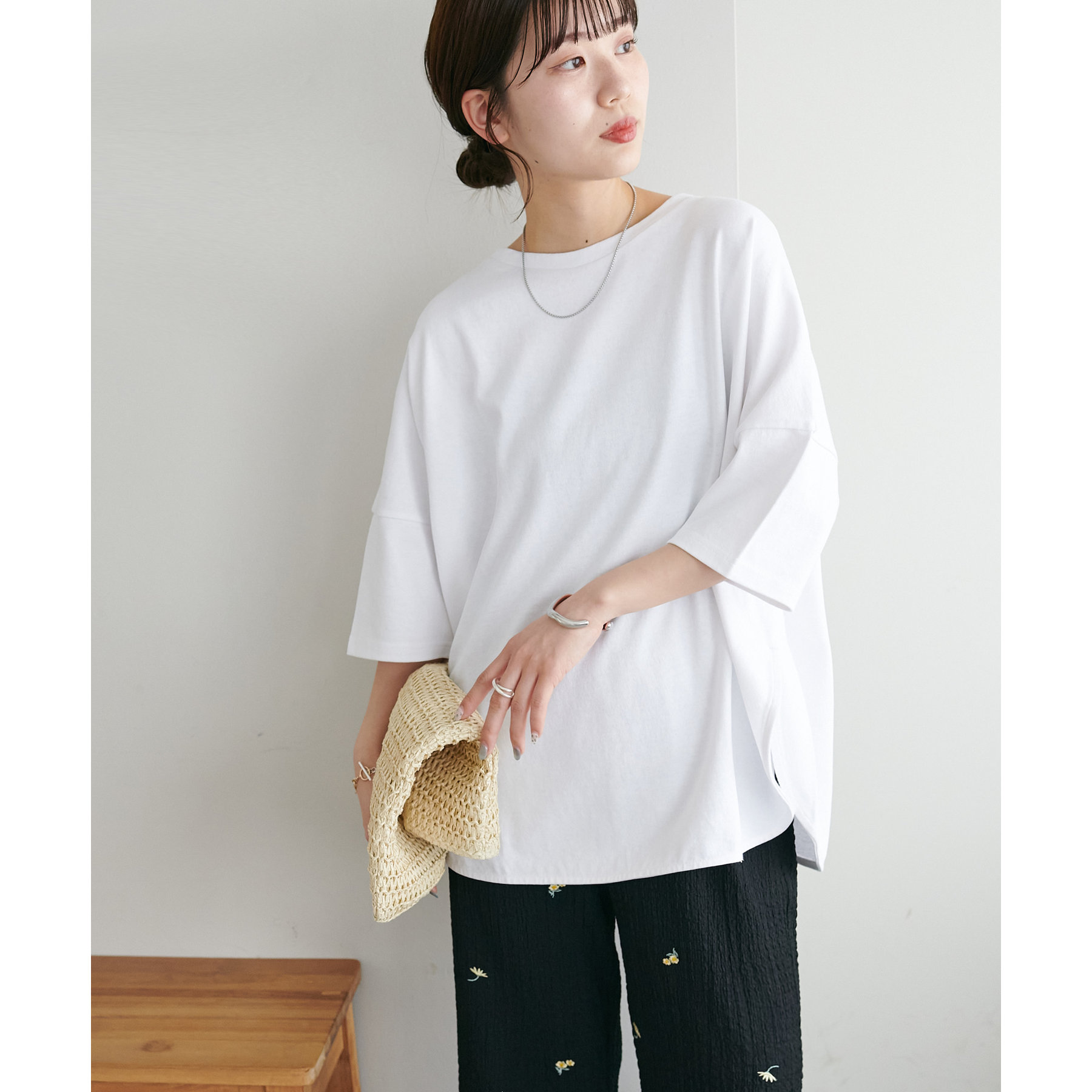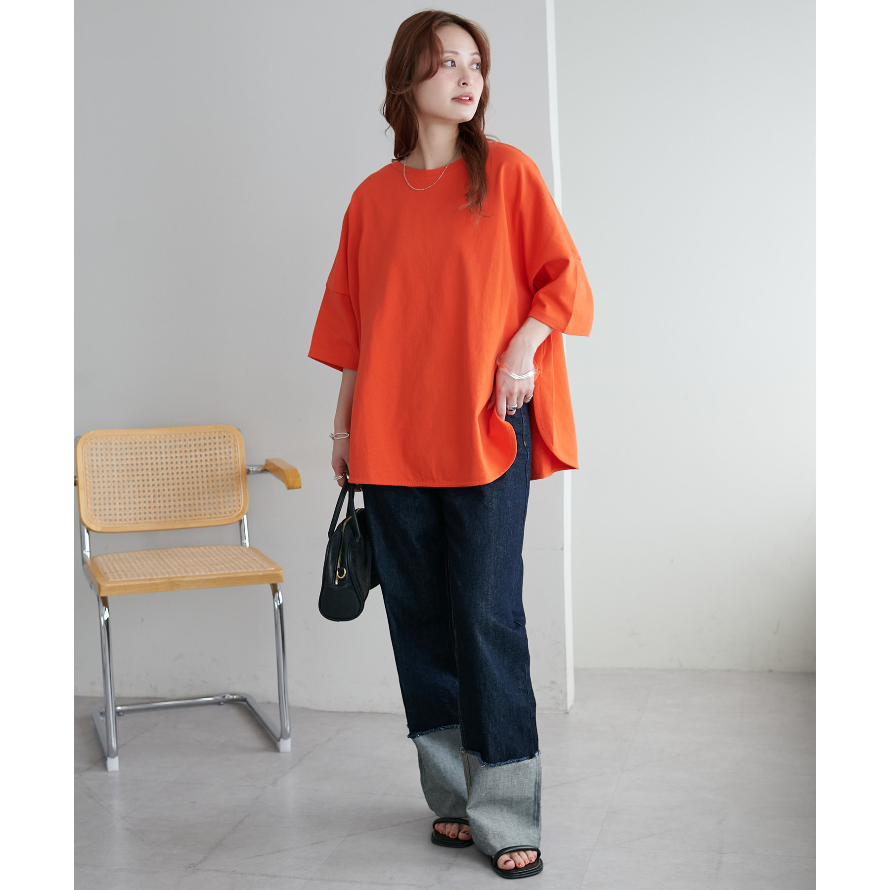 155cmスタッフ:裾のラウンドカットで腰回りもカバーできて安心。シンプルだからこそ、アクセやボトム次第でいろんな印象が楽しめます◎
