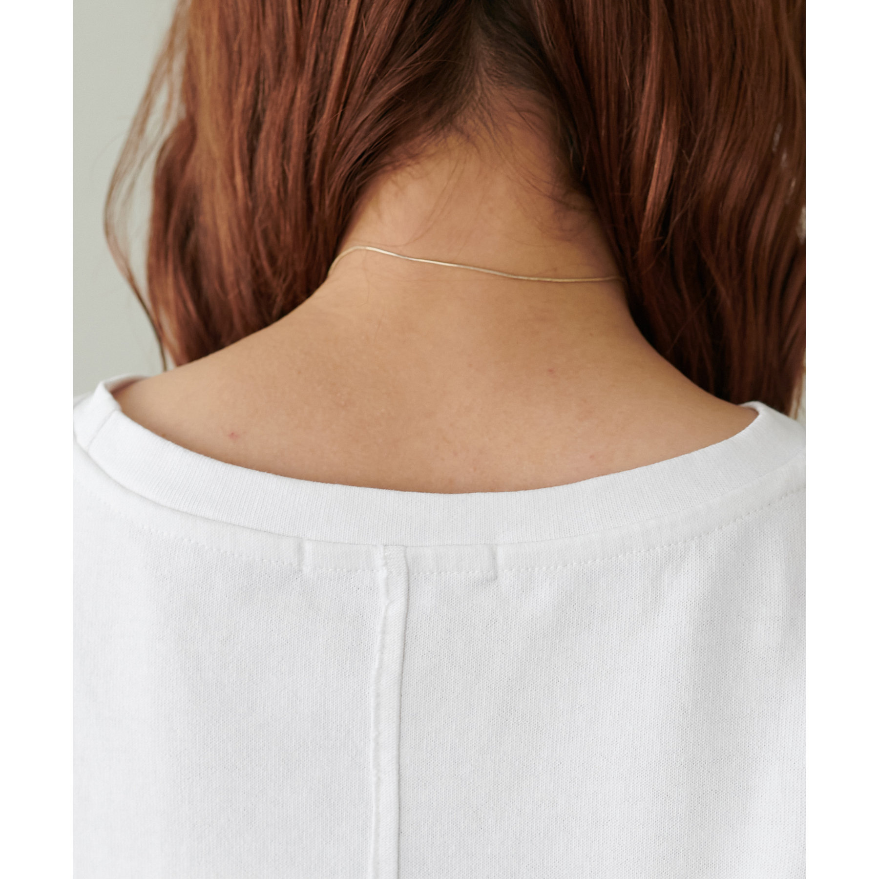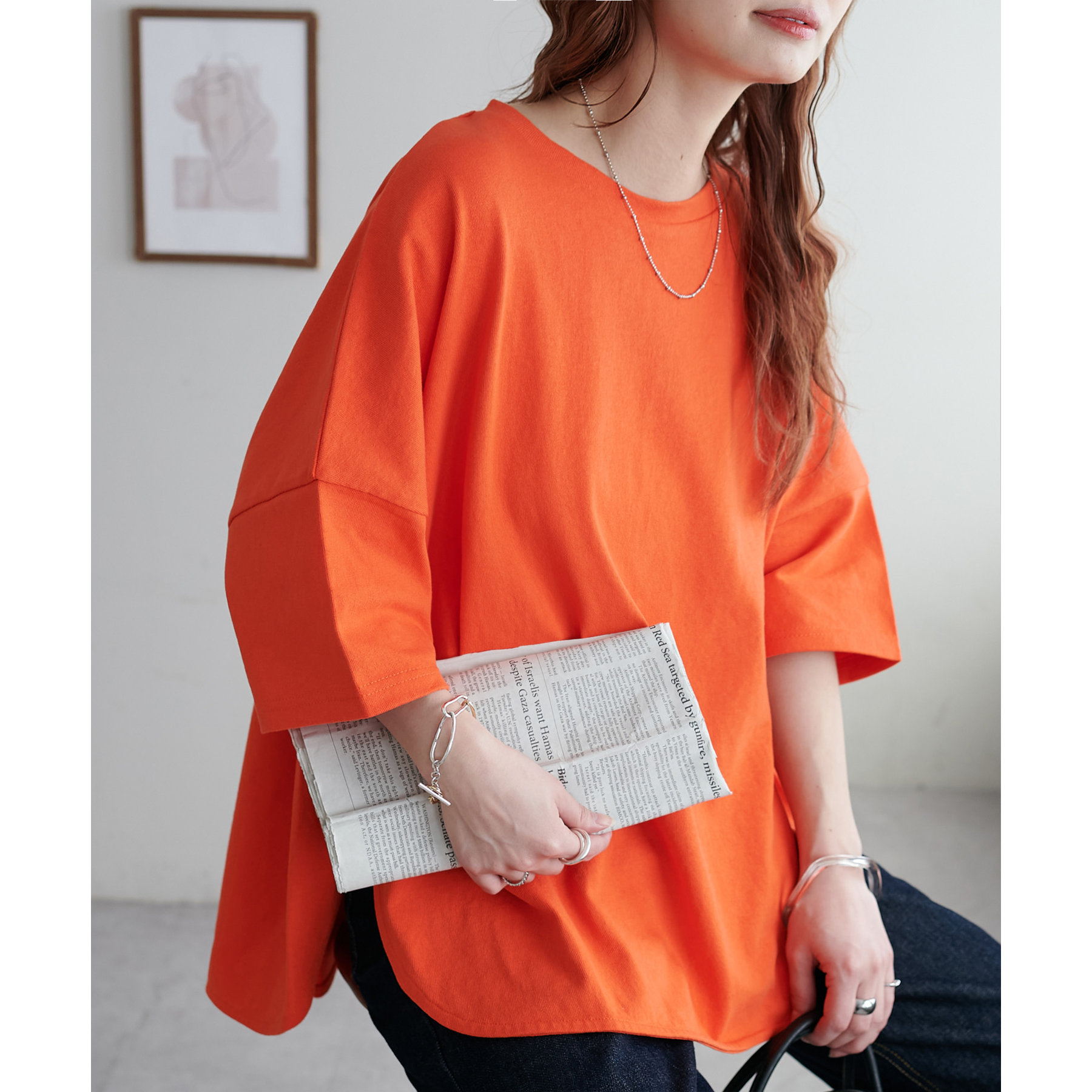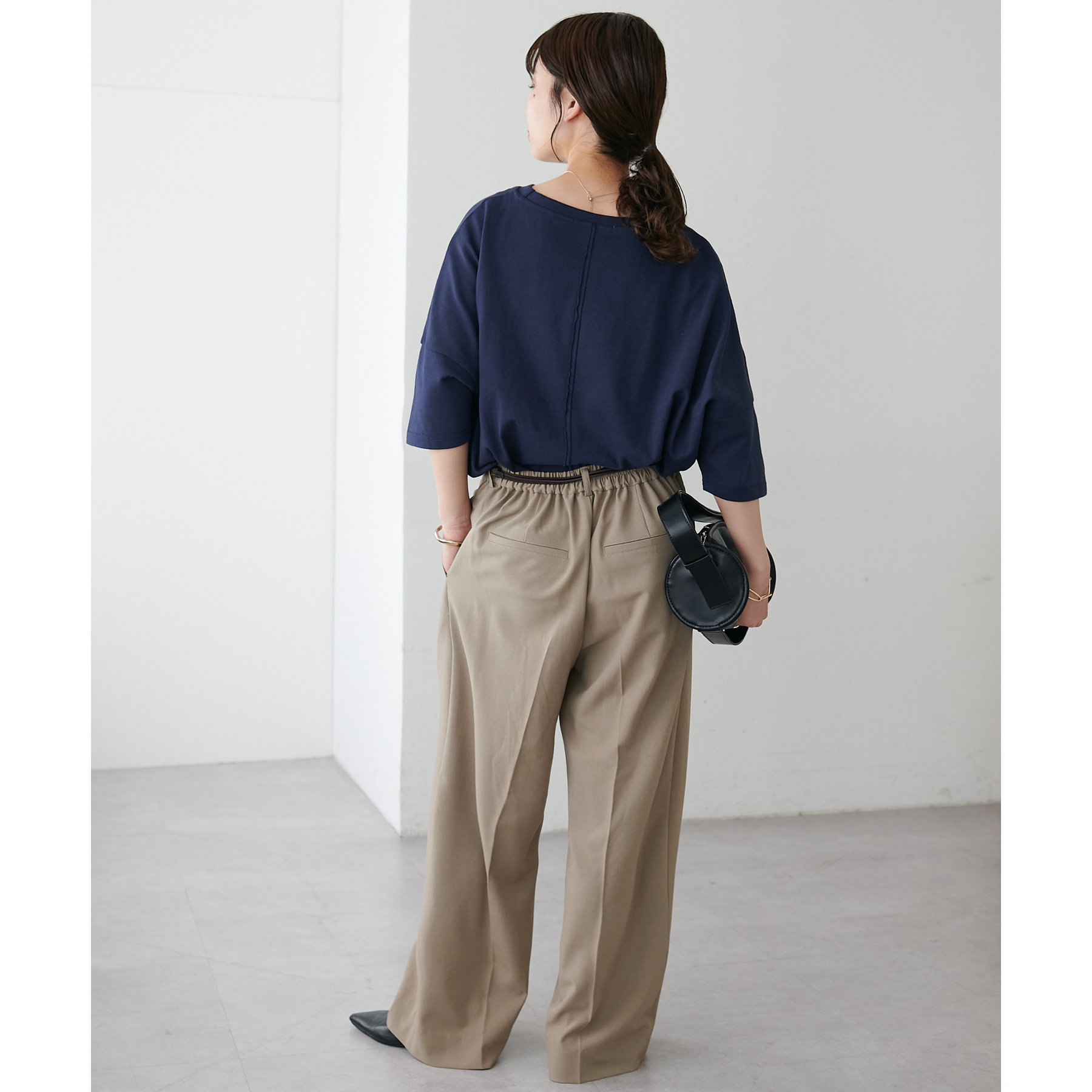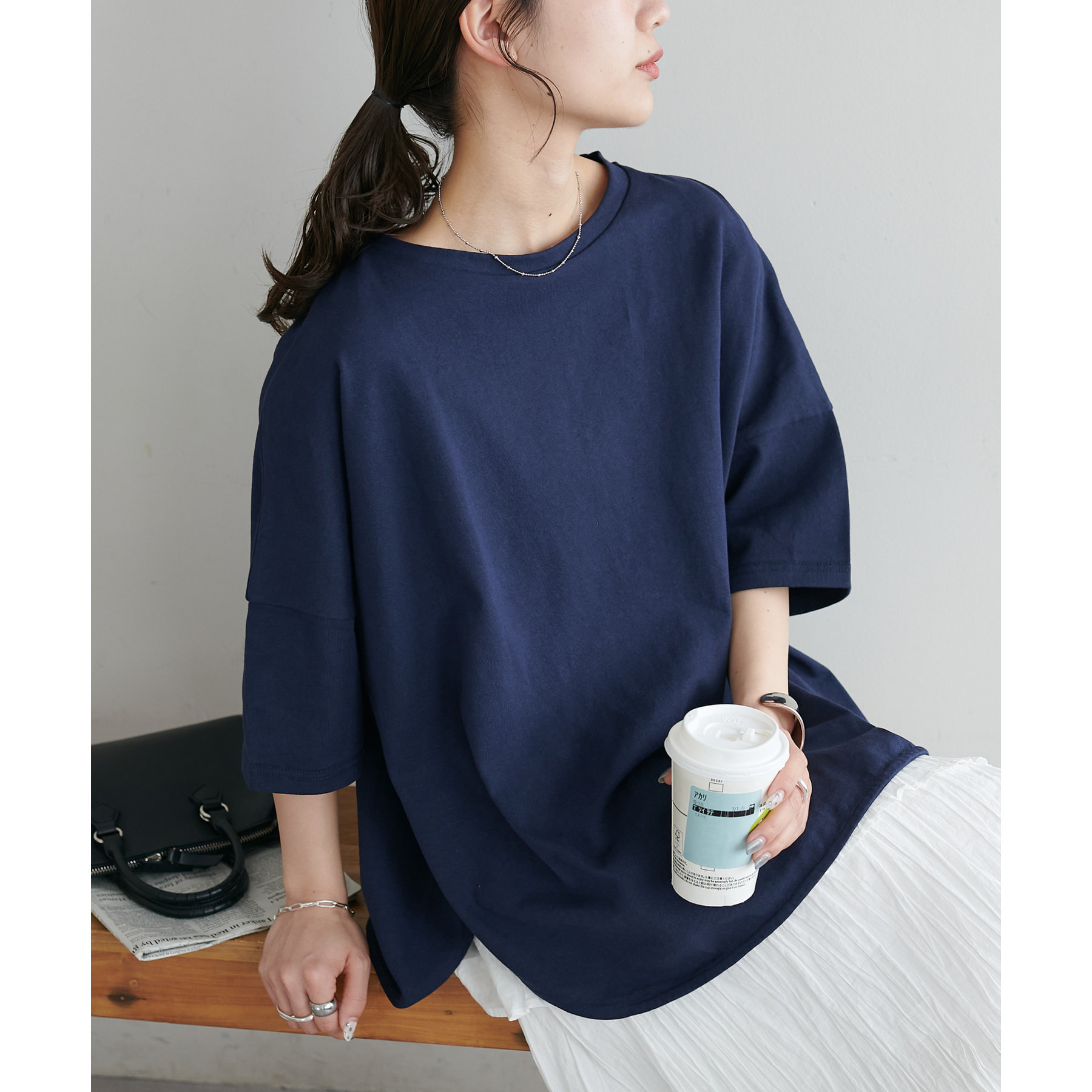 155cmスタッフ:裾のラウンドカットで腰回りもカバーできて安心。シンプルだからこそ、アクセやボトム次第でいろんな印象が楽しめます◎