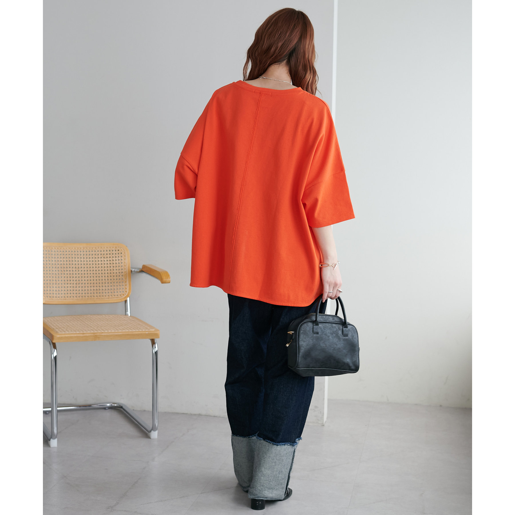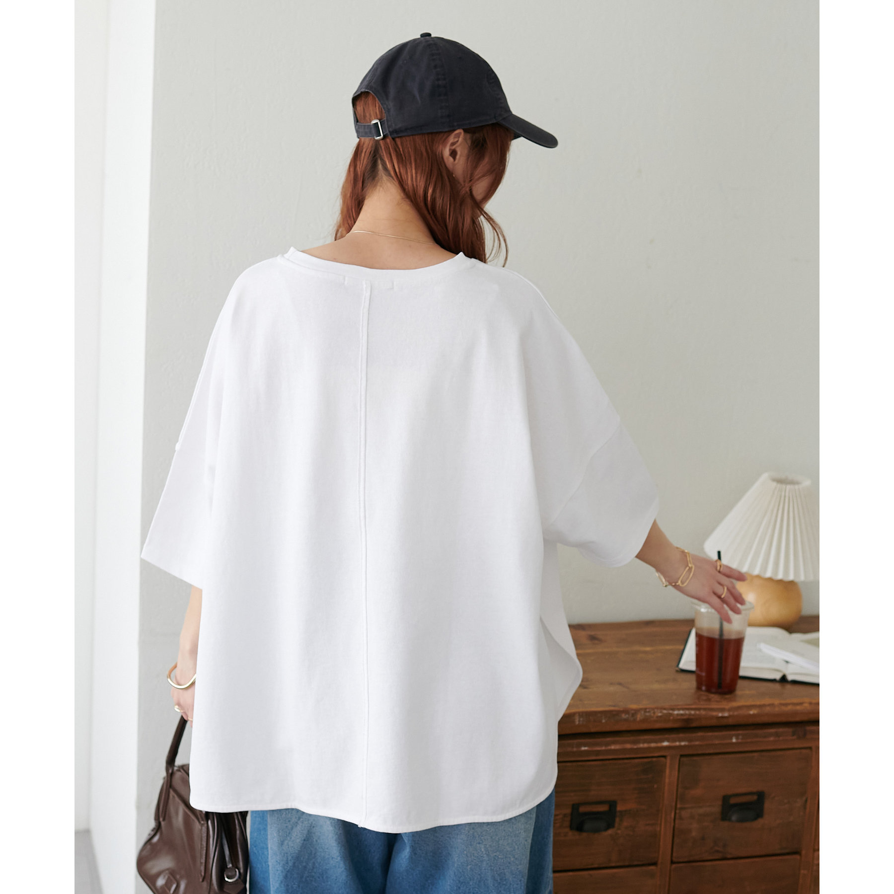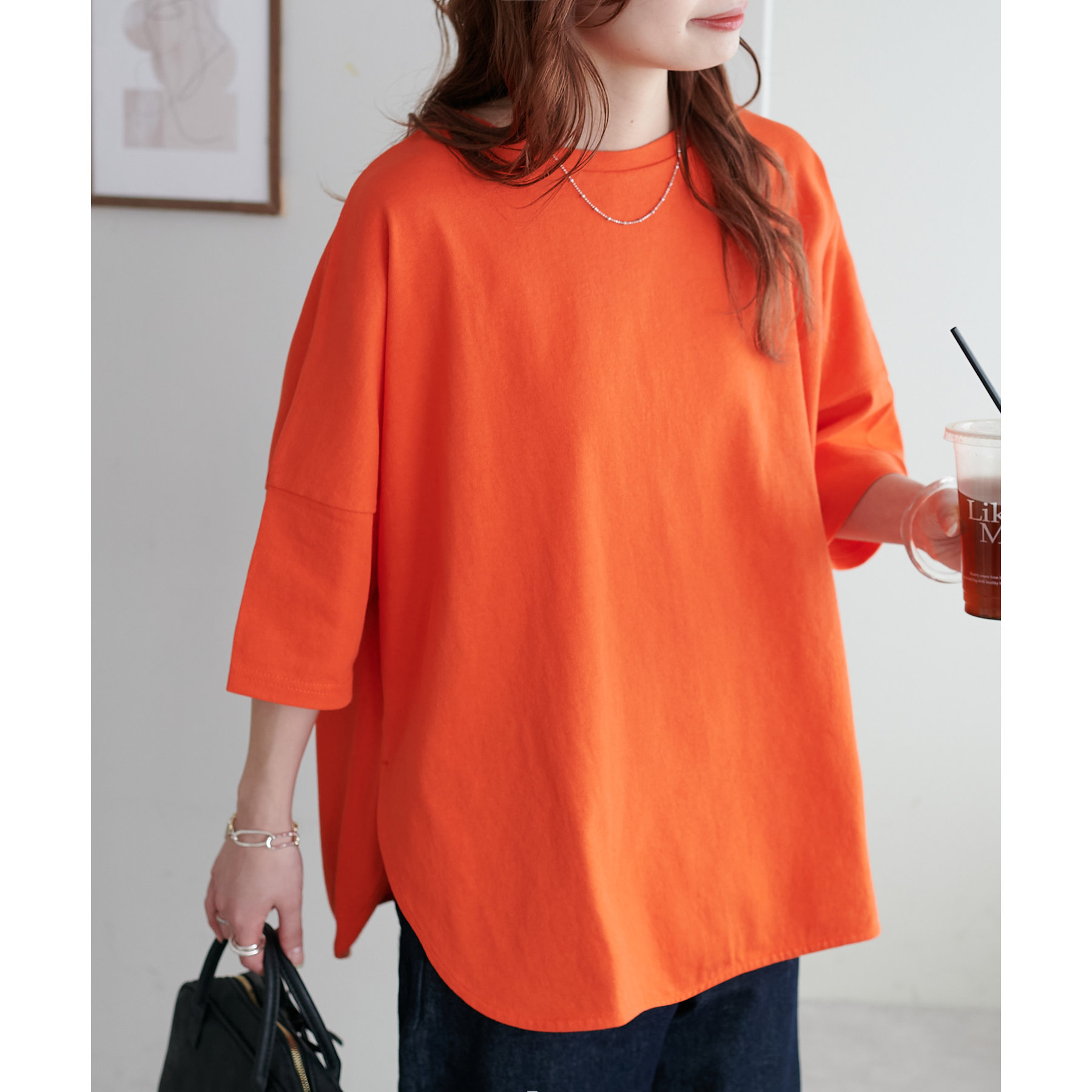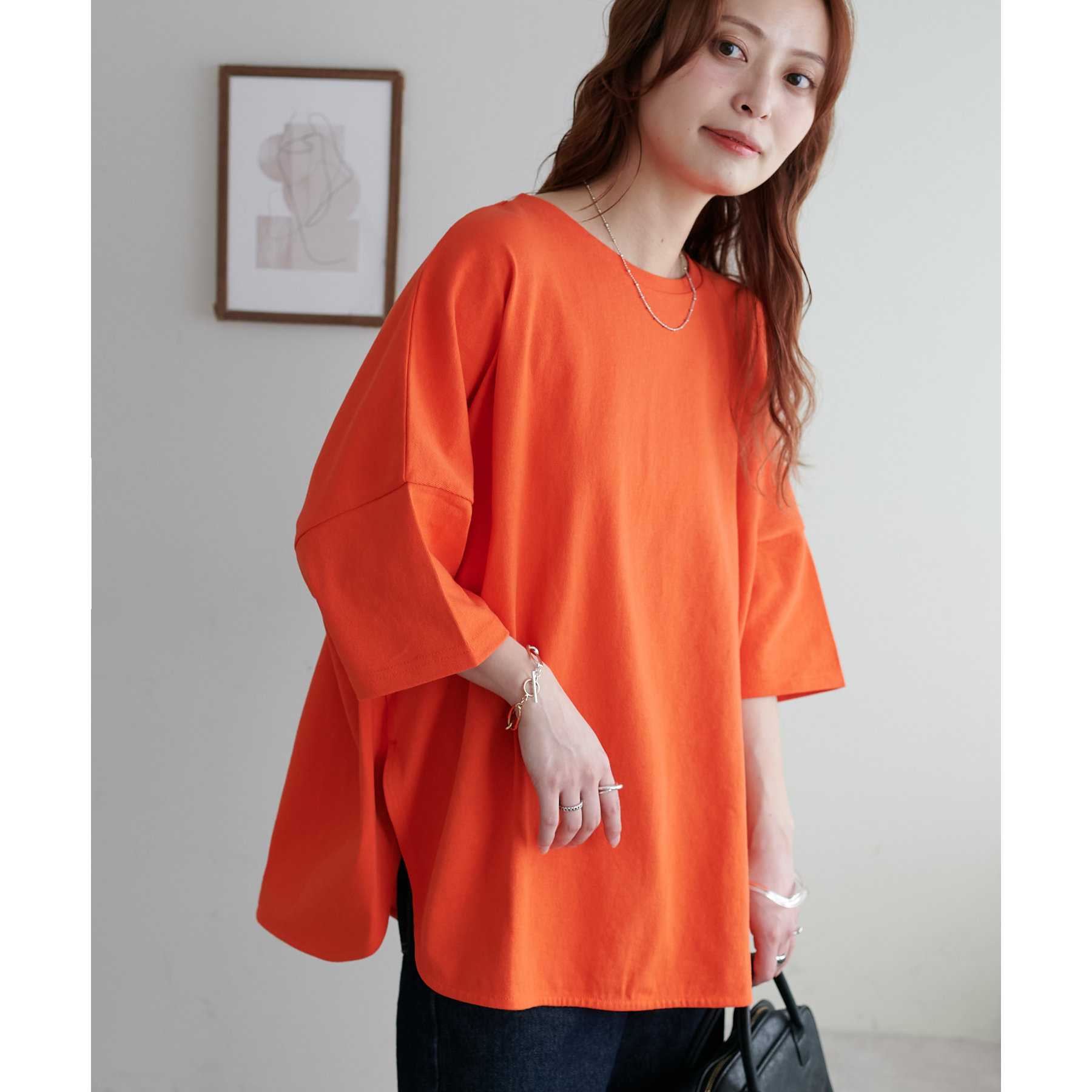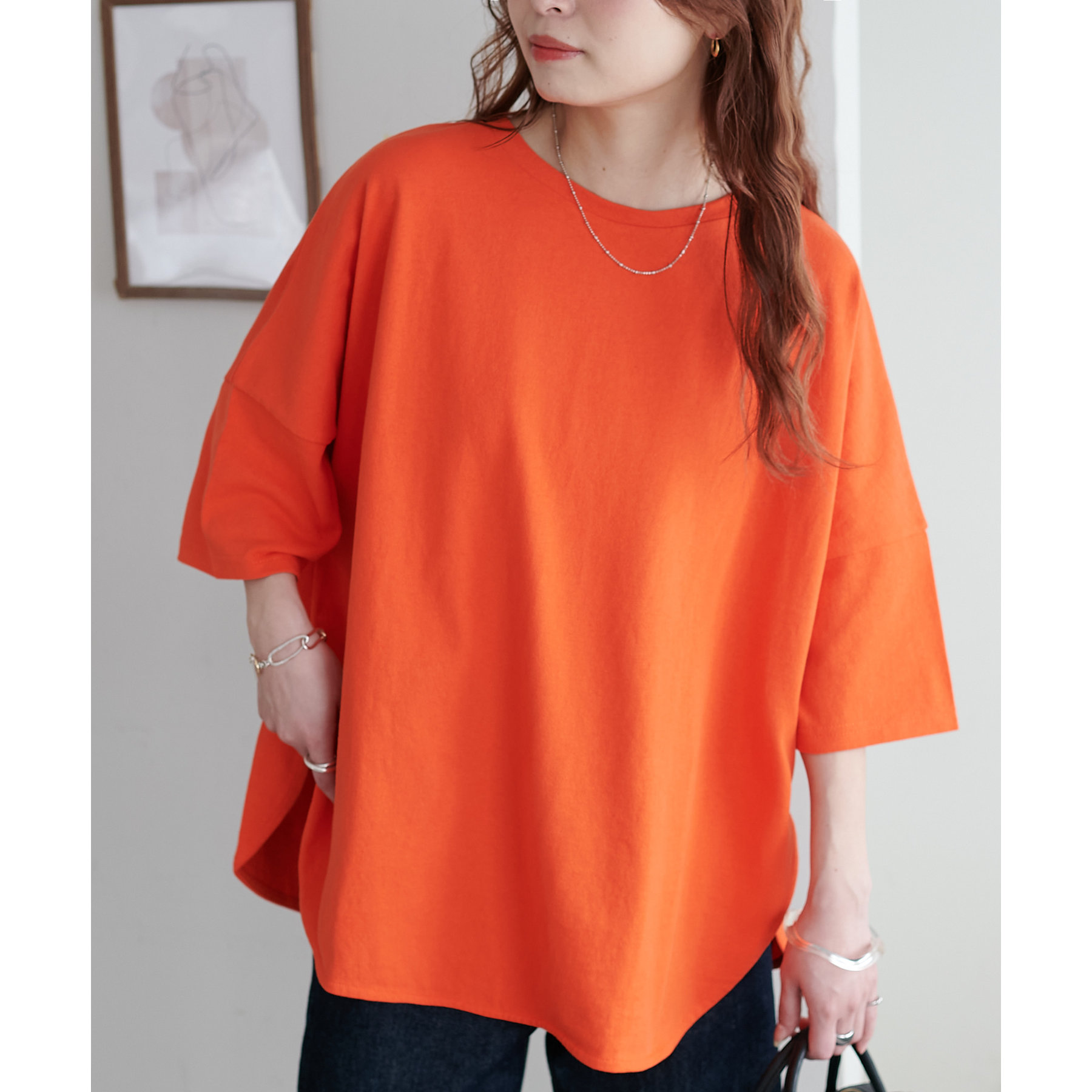 155cmスタッフ:裾のラウンドカットで腰回りもカバーできて安心。シンプルだからこそ、アクセやボトム次第でいろんな印象が楽しめます◎