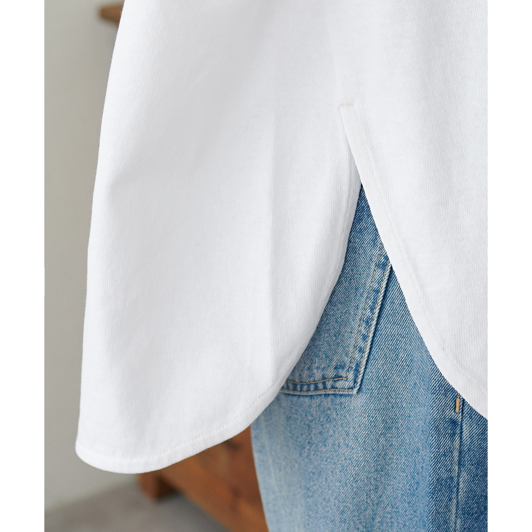 前後差のある裾デザインで、タックイン・アウトどちらでもバランスよく着られるのもポイント。