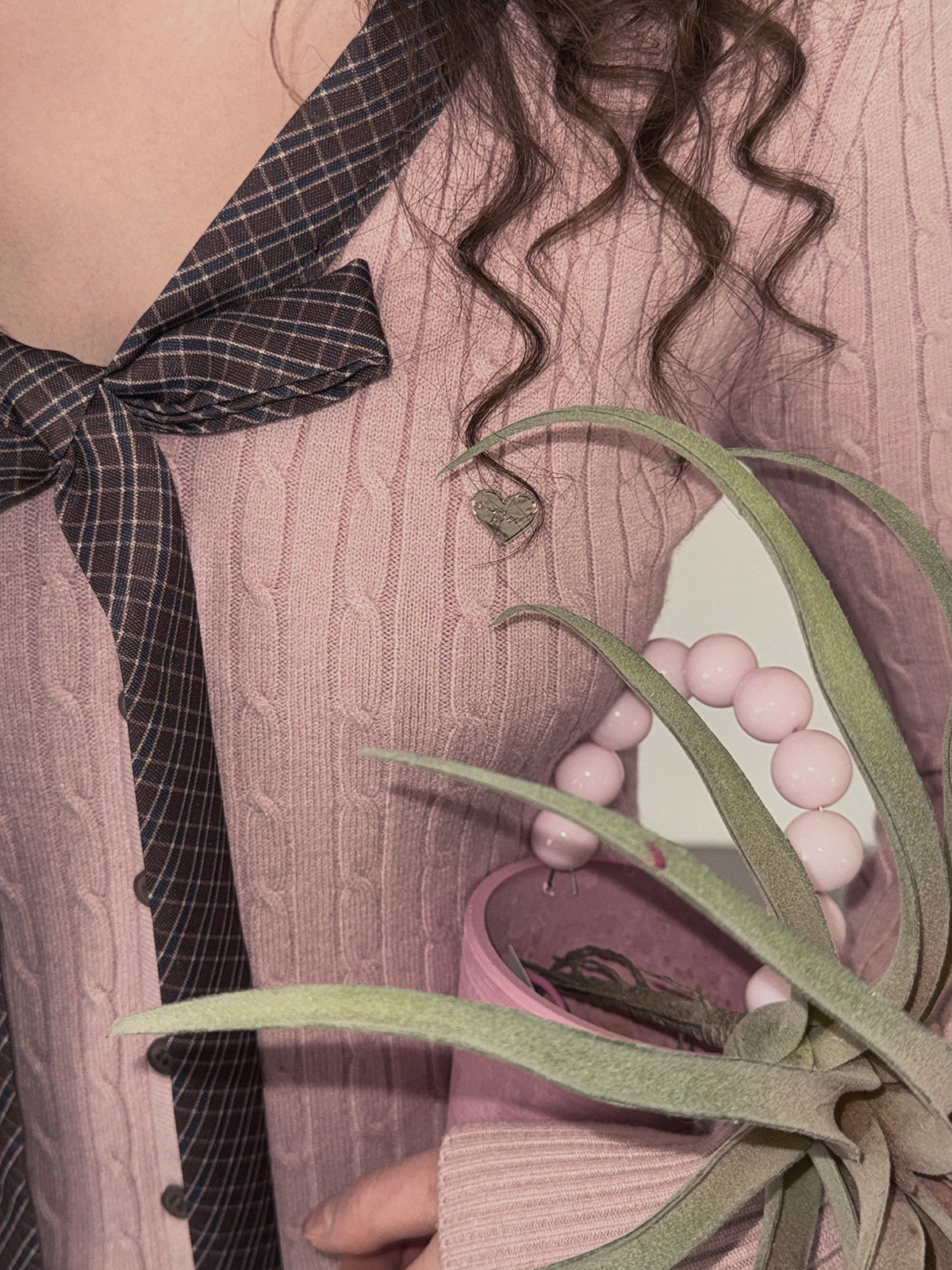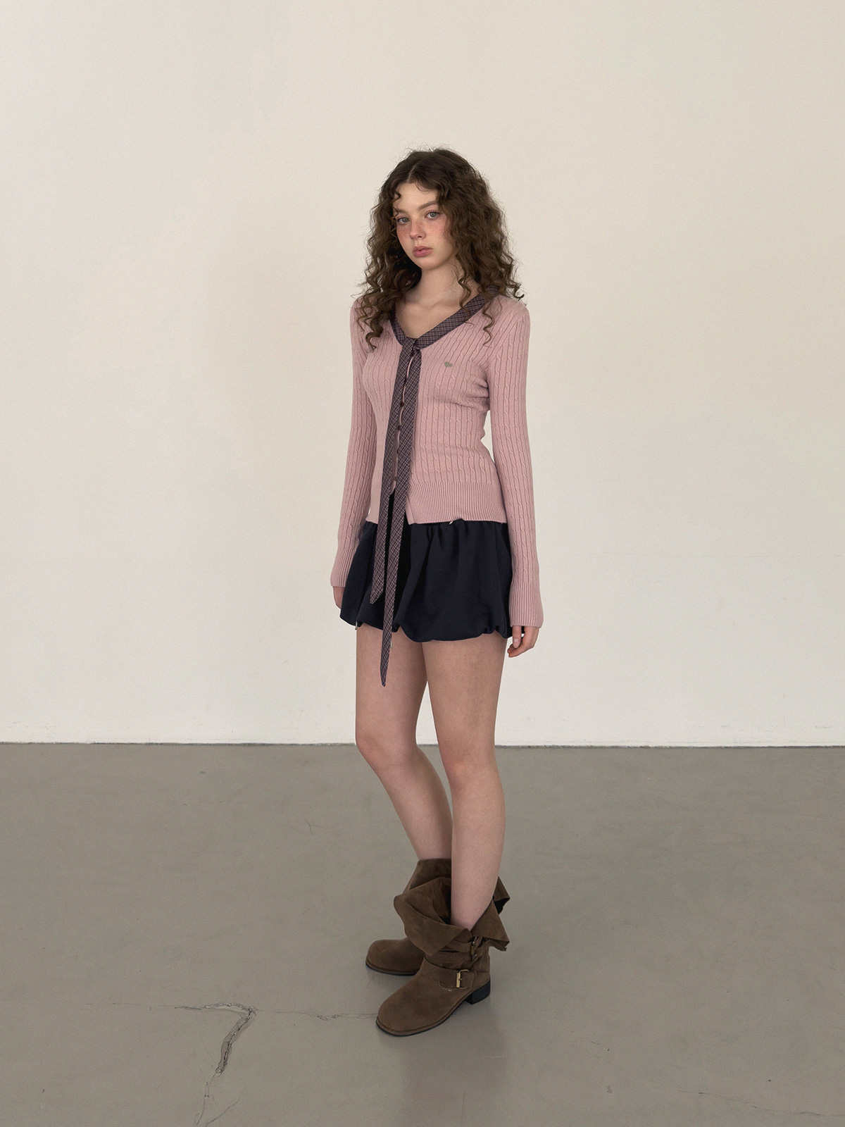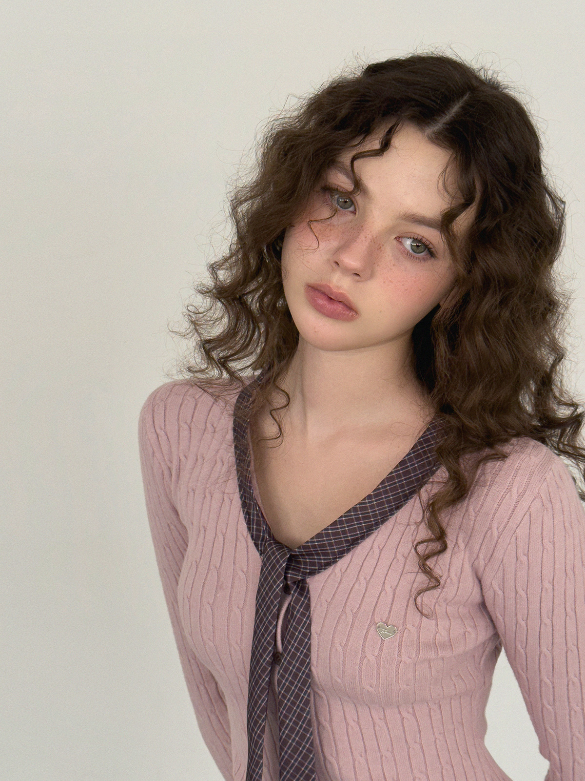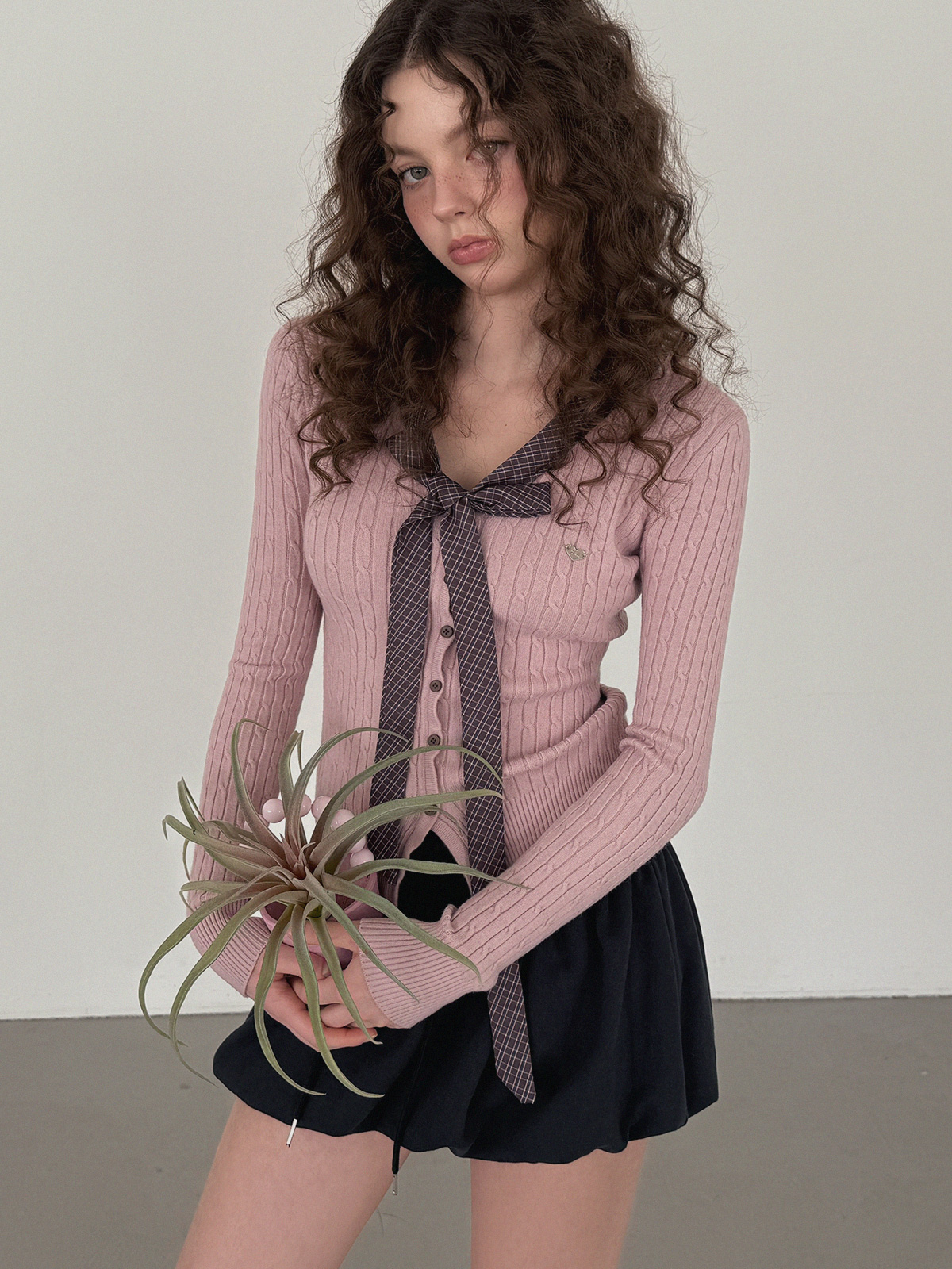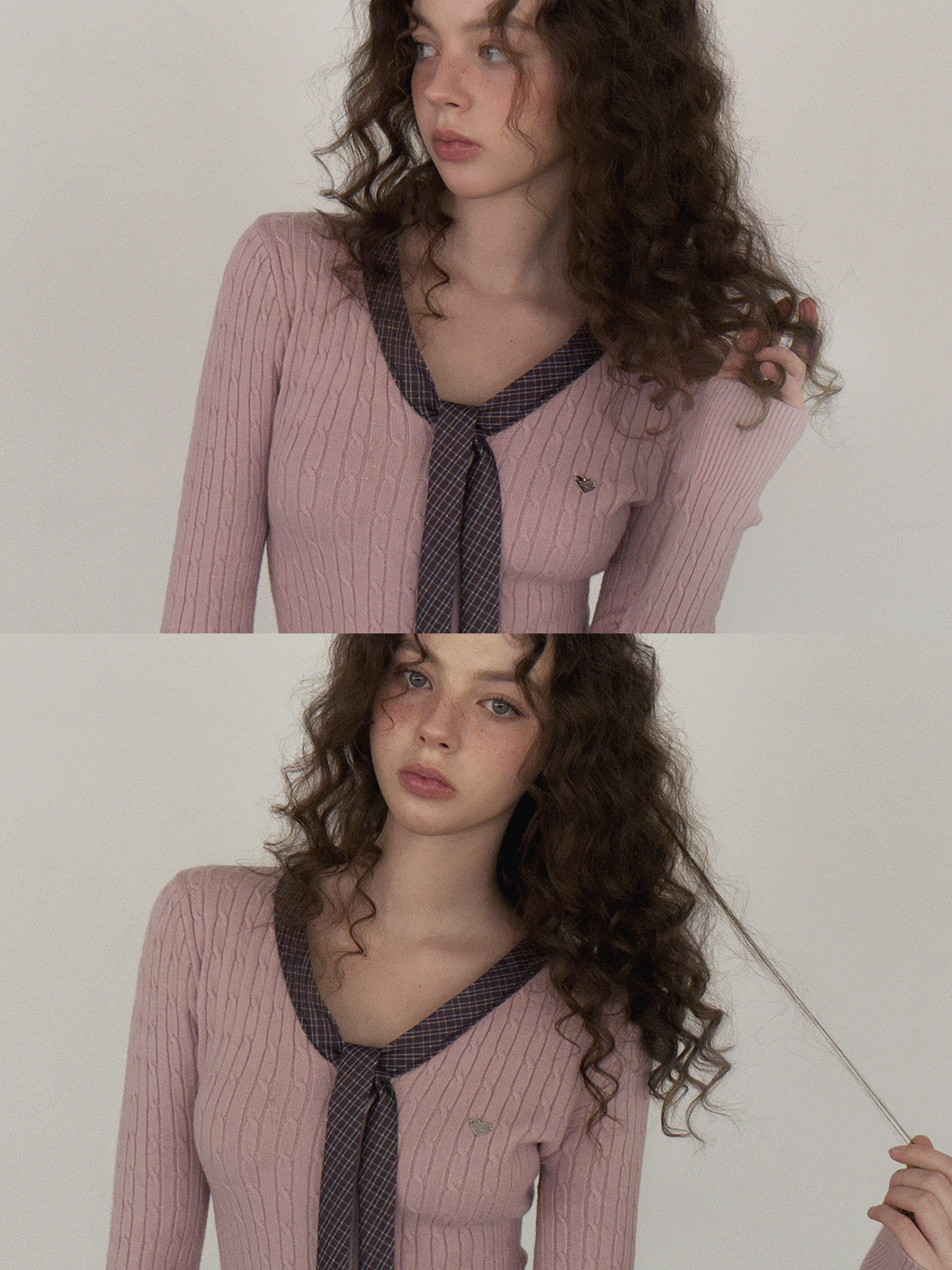 Coron Check Ribbon V-neck Long Sleeve Knit