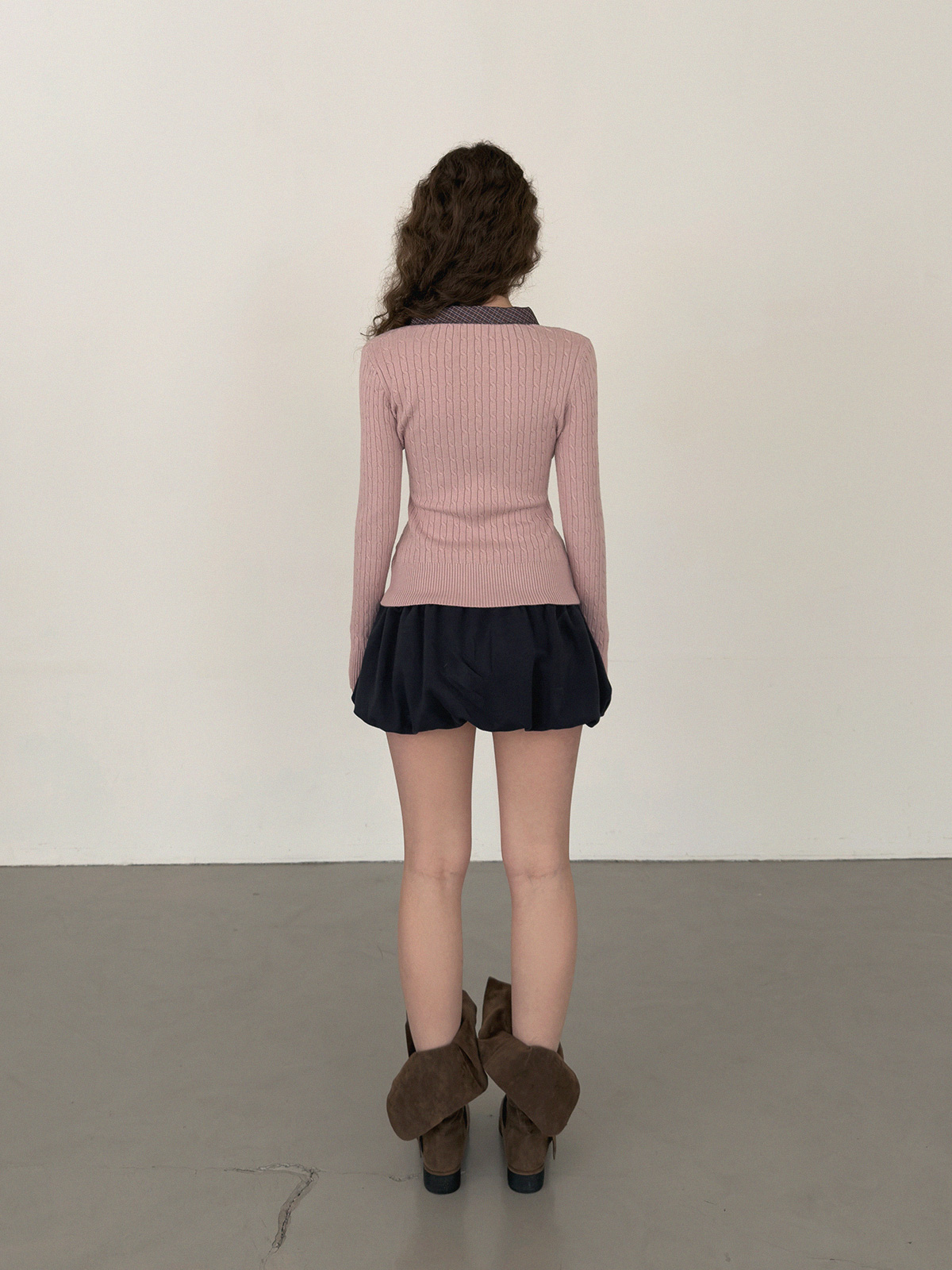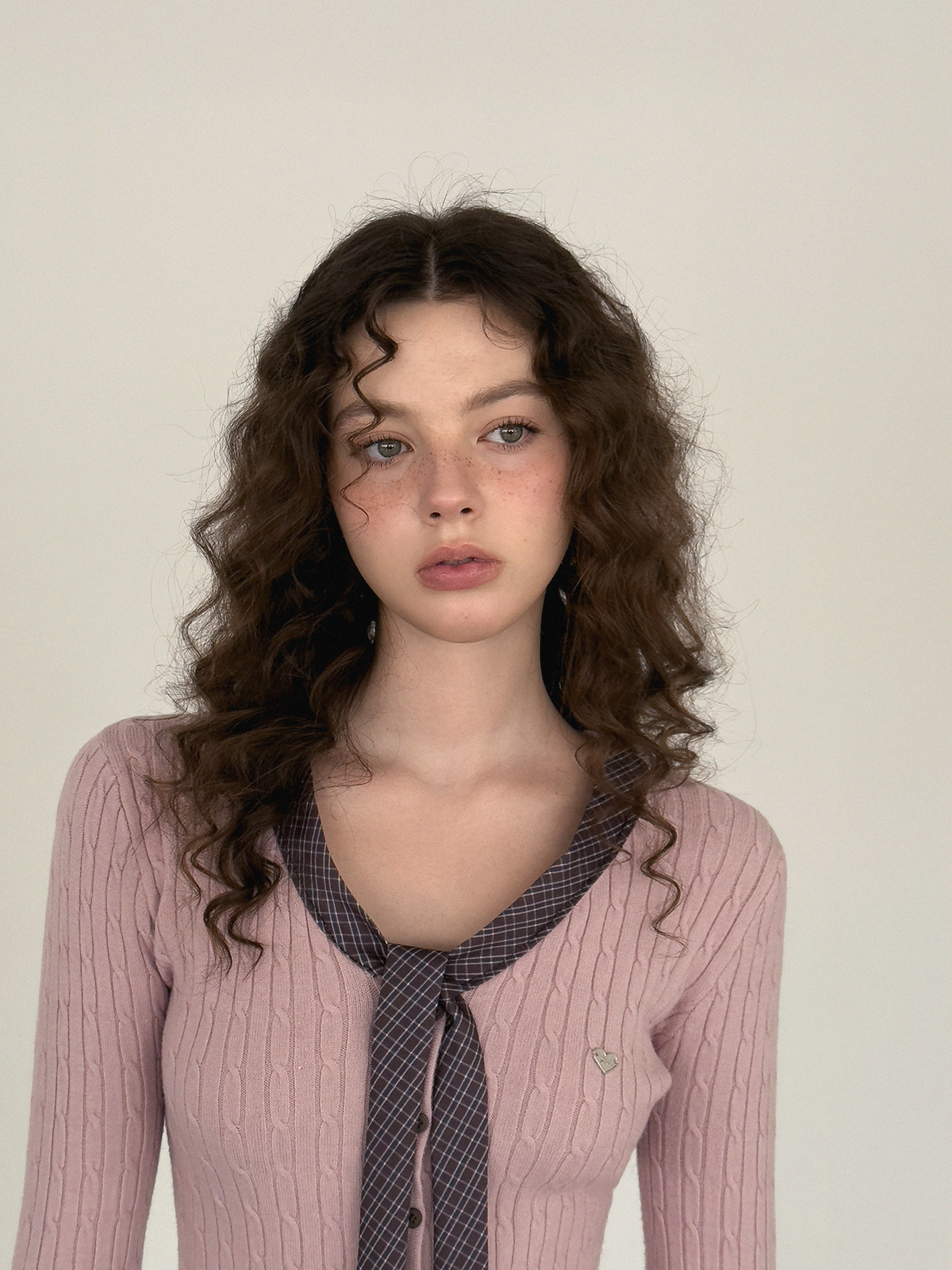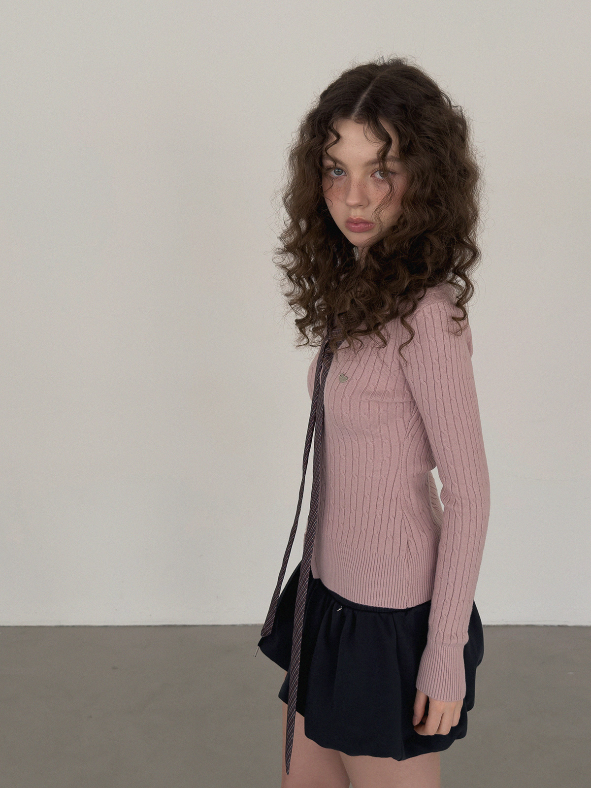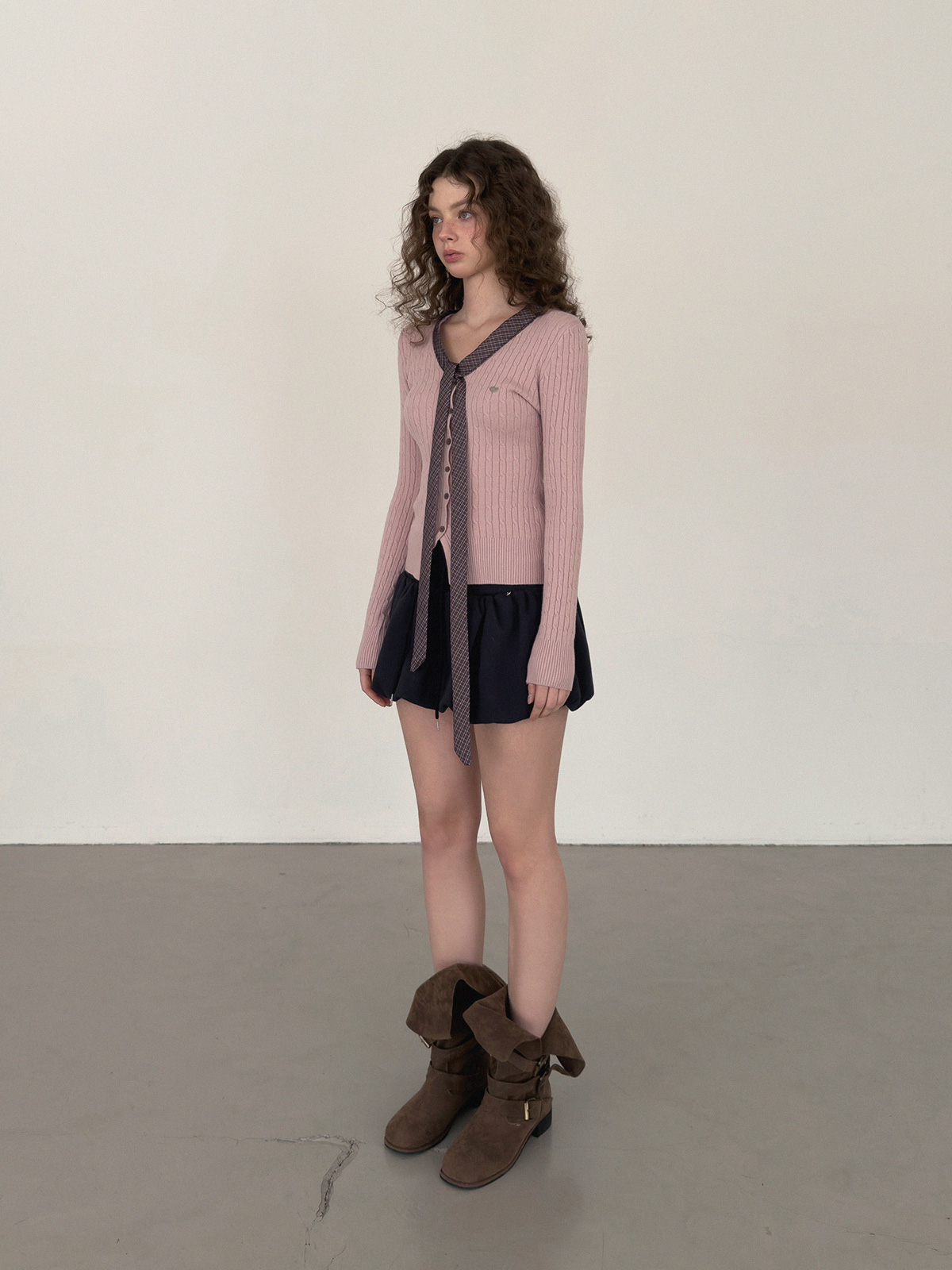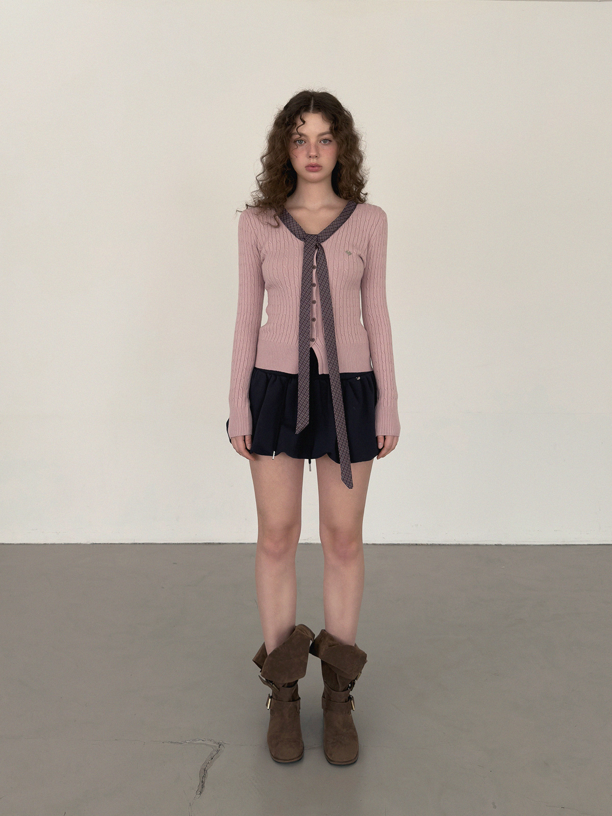 Coron Check Ribbon V-neck Long Sleeve Knit