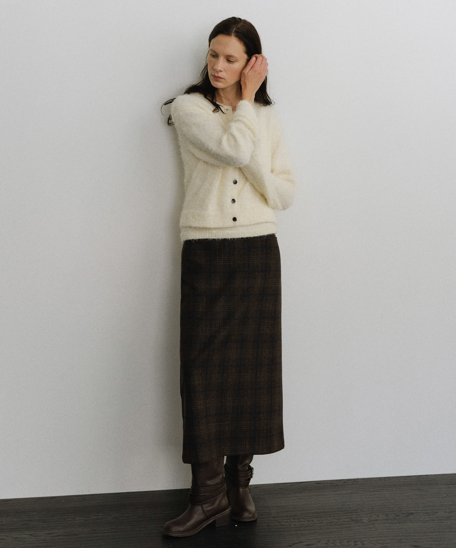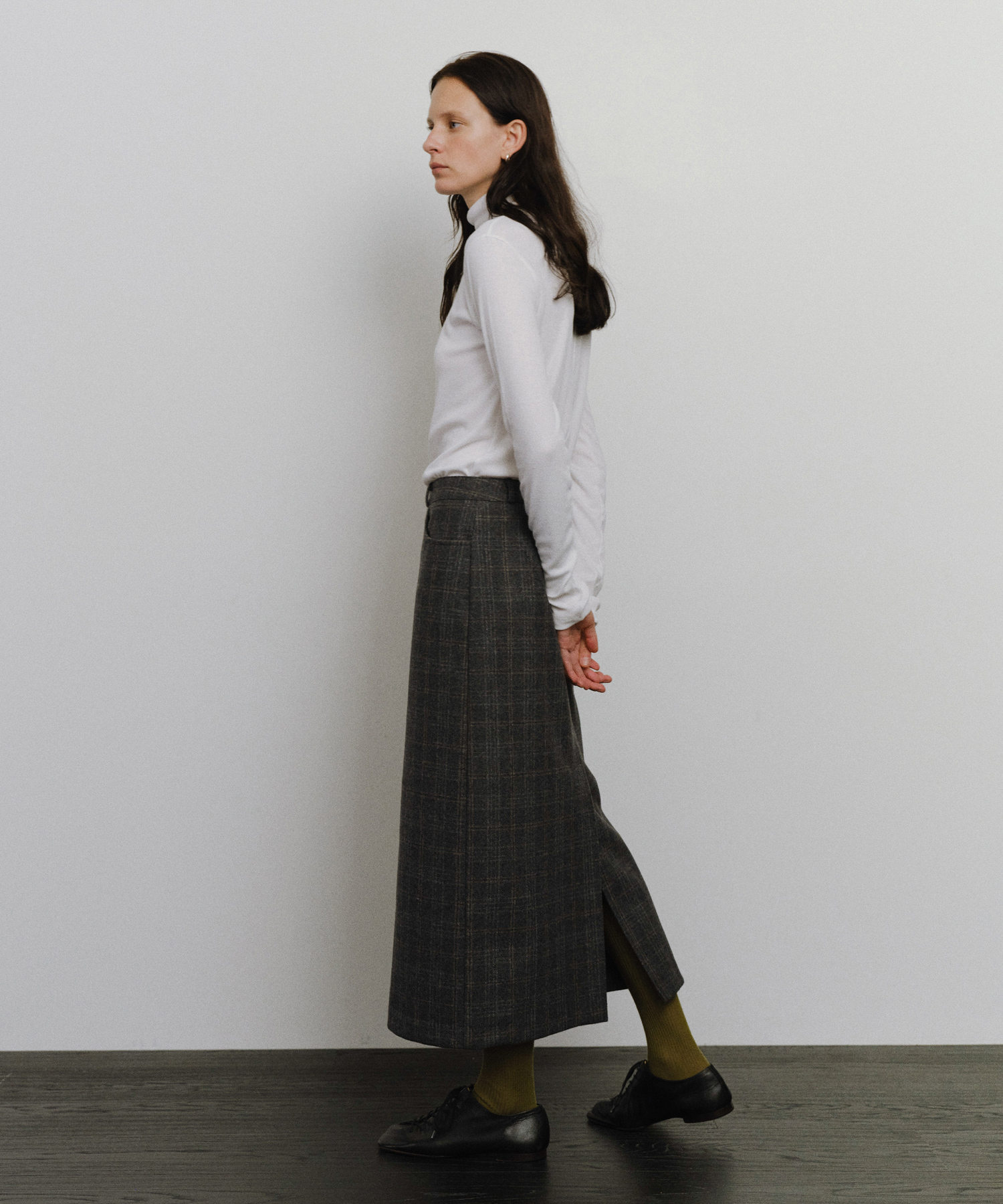 - ヘリテージ感のあるチェック柄がニット、シャツ、アウターと調和し、クラシックでありながら飽きのこないパターンが秋冬シーズンの温かなアクセントに。URAGOならではの感性を宿したスカートです。
