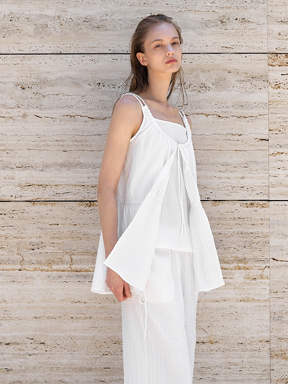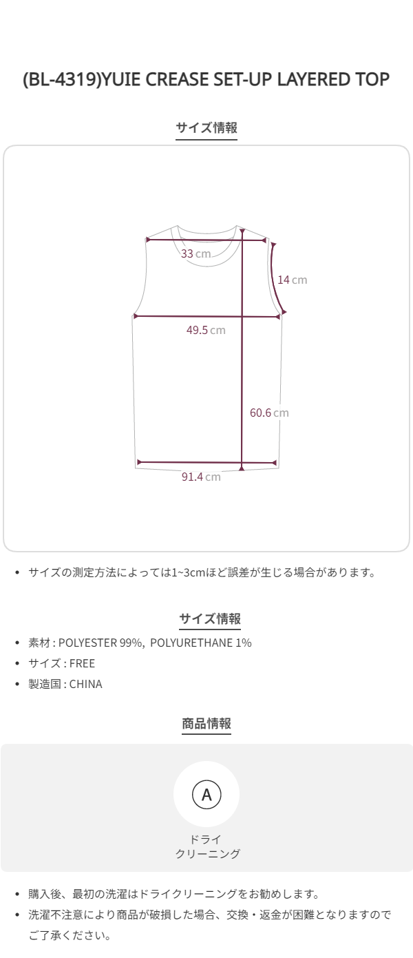 クリンクル素材が際立つレイヤードデザインのノースリーブトップスです。