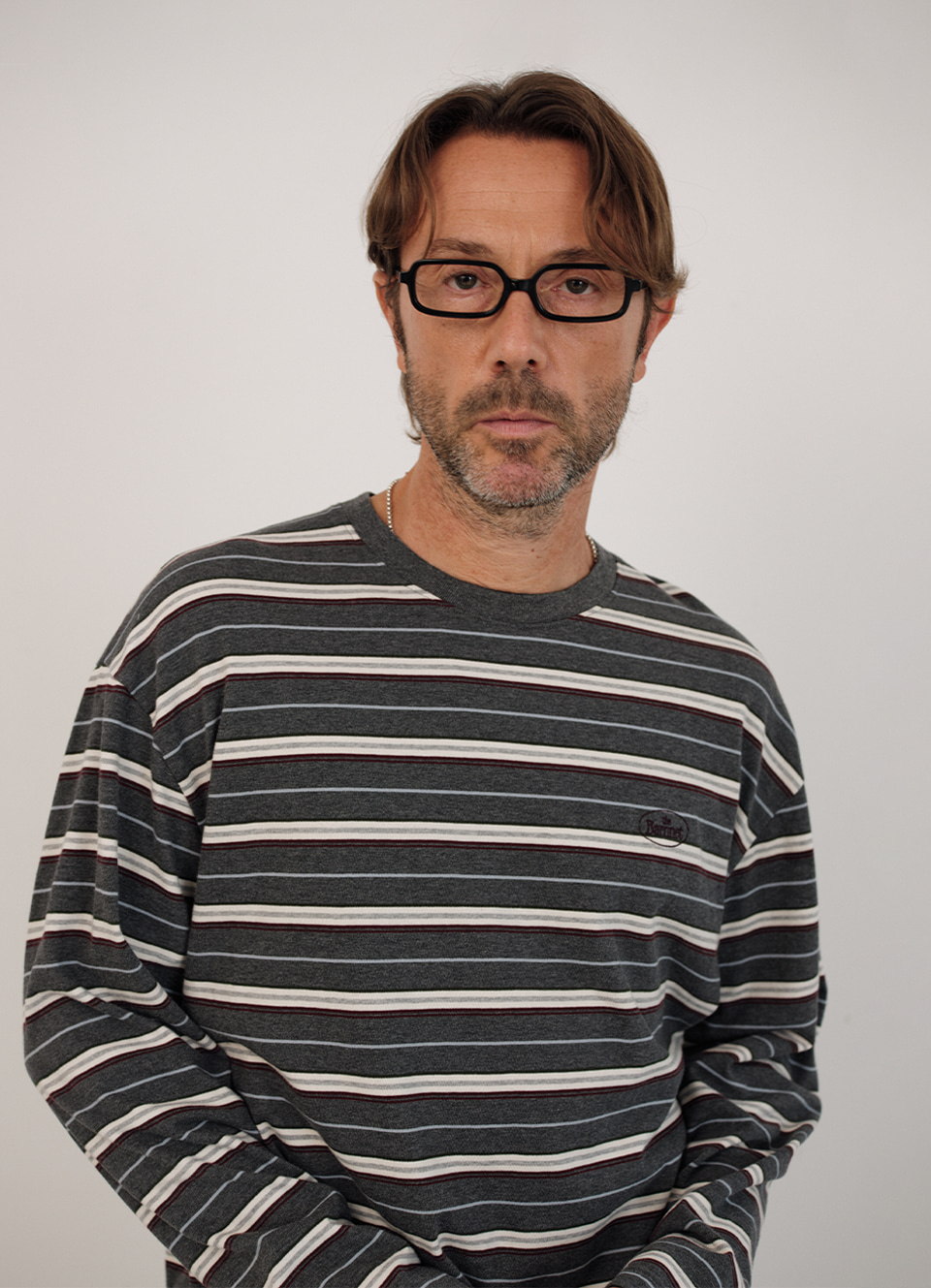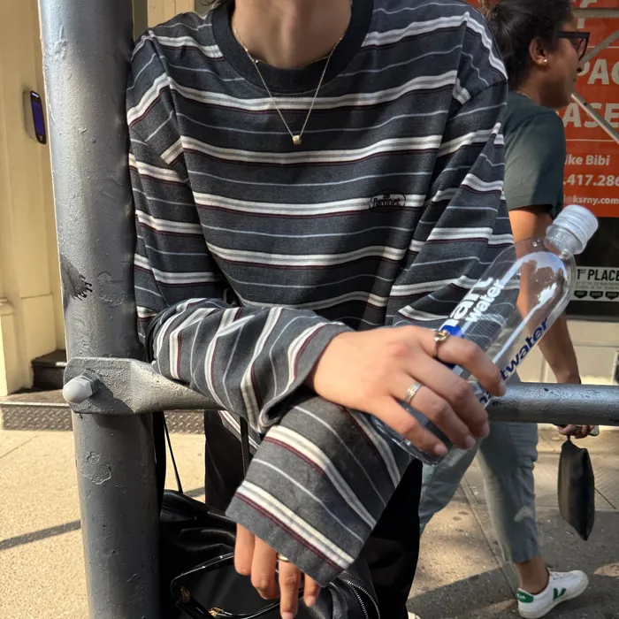 ネックライン部分にしっかりとした仕上げのリブディテールと、フロントのロゴ刺繍がポイント