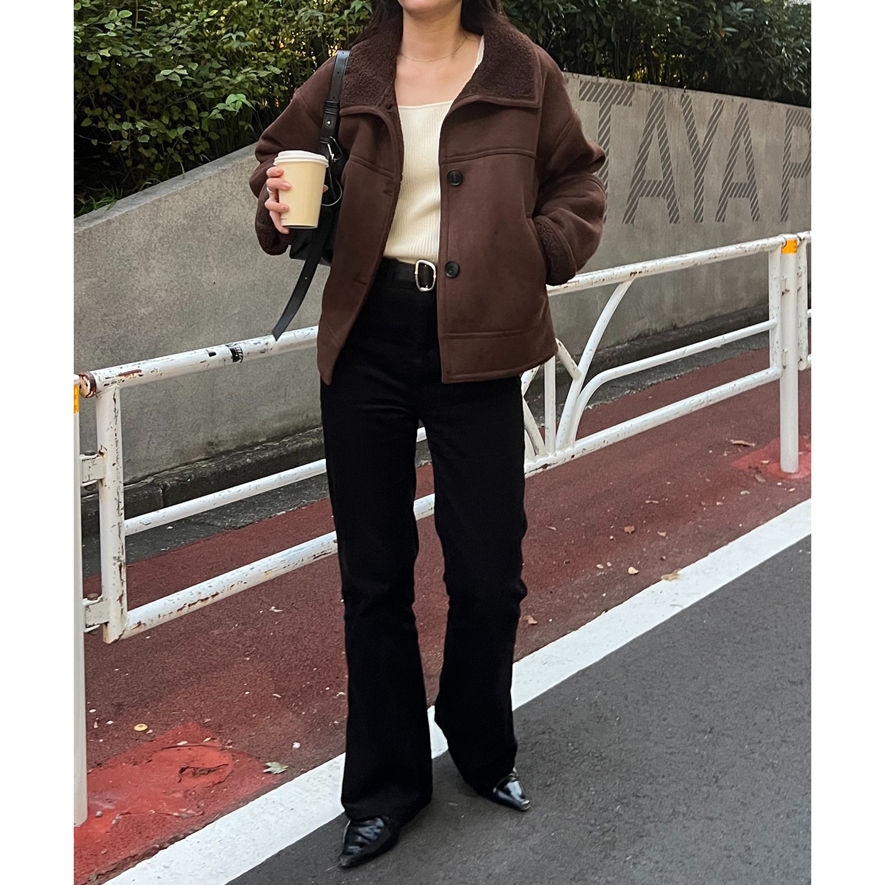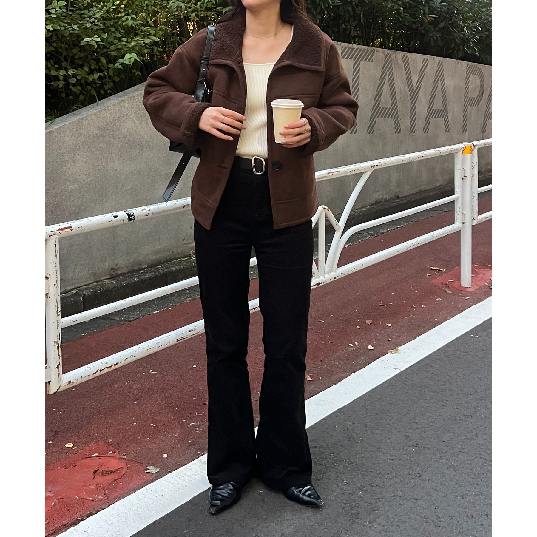 【オフホワイト着用アイテム②】outer:スエードボアミドルコート・pants:コーデュロイフレアパンツ