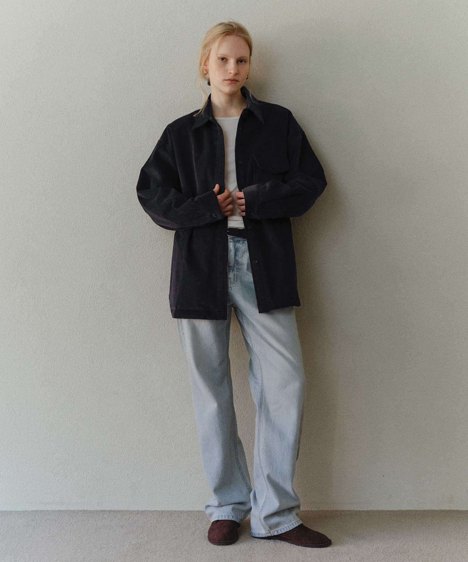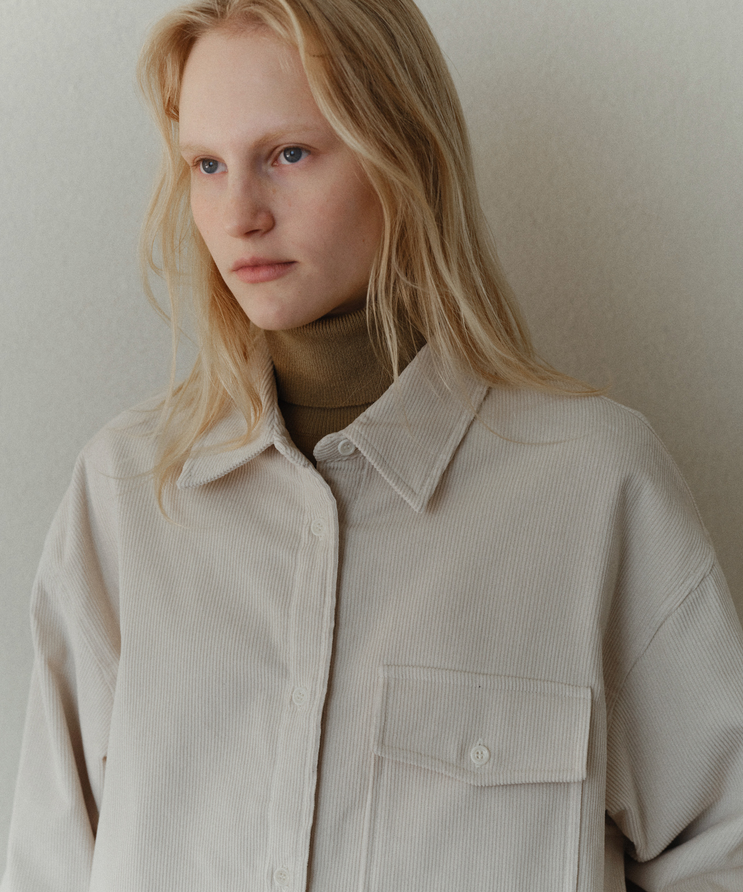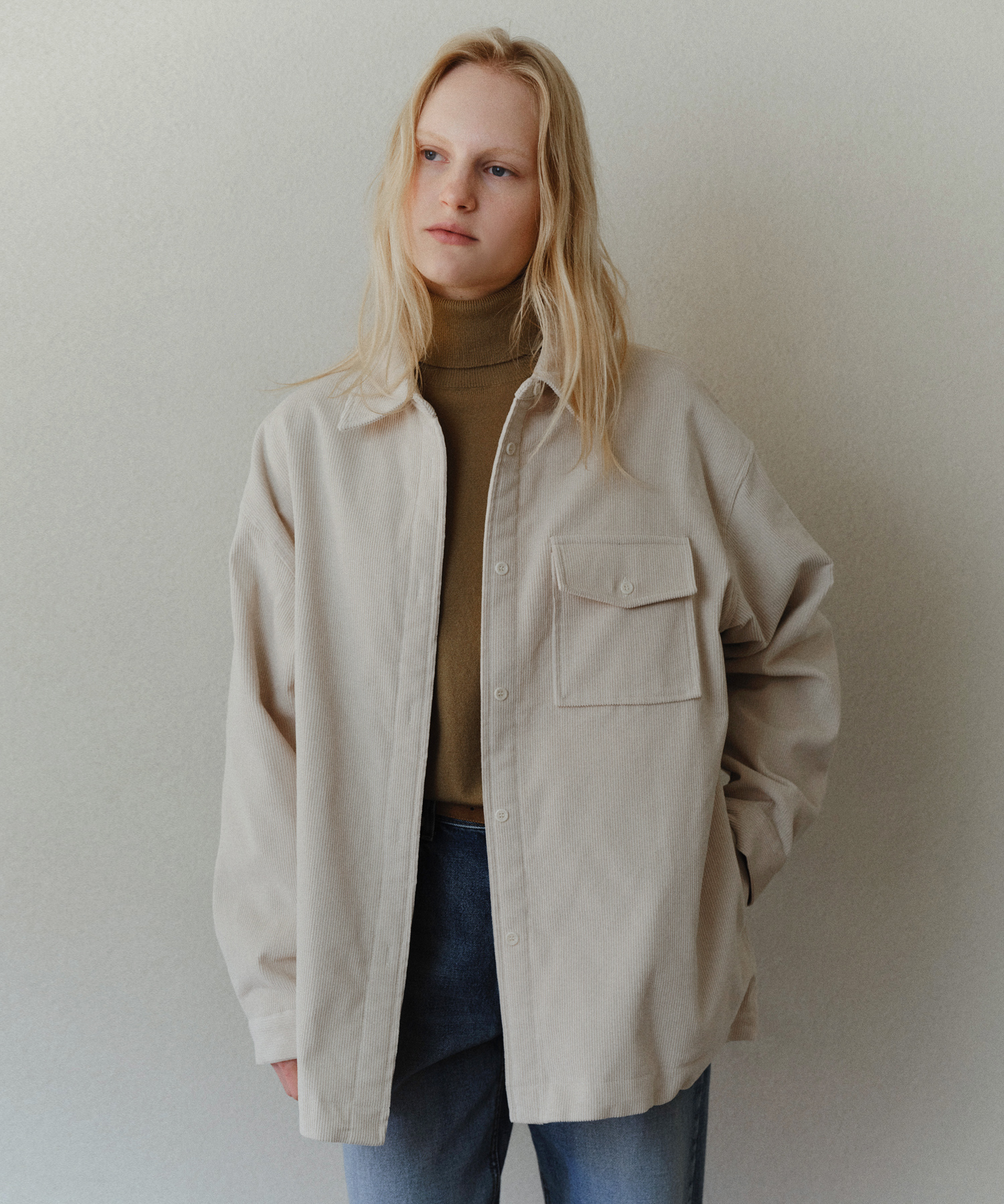 - 表面はクラシックなコーデュロイの風合いを活かしつつ、内側にはやわらかな裏地と軽量中綿を加えて暖かさをキープ。シャツとアウターの長所を自然に融合したデザインです。