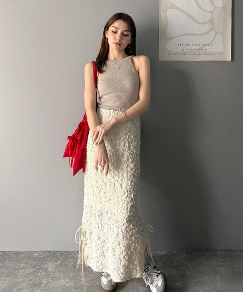 縦ラインを強調するリブ素材がスタイルアップを叶え、