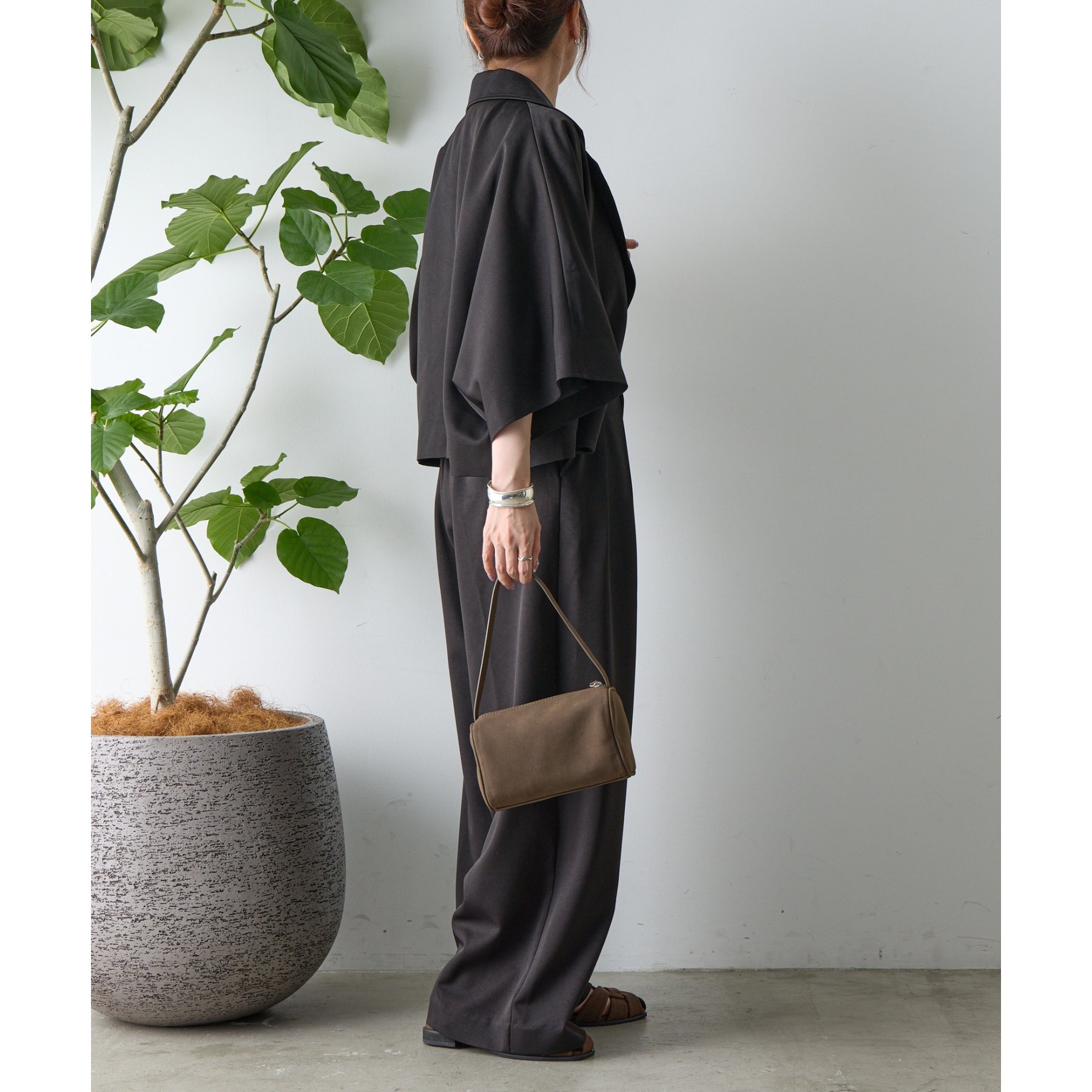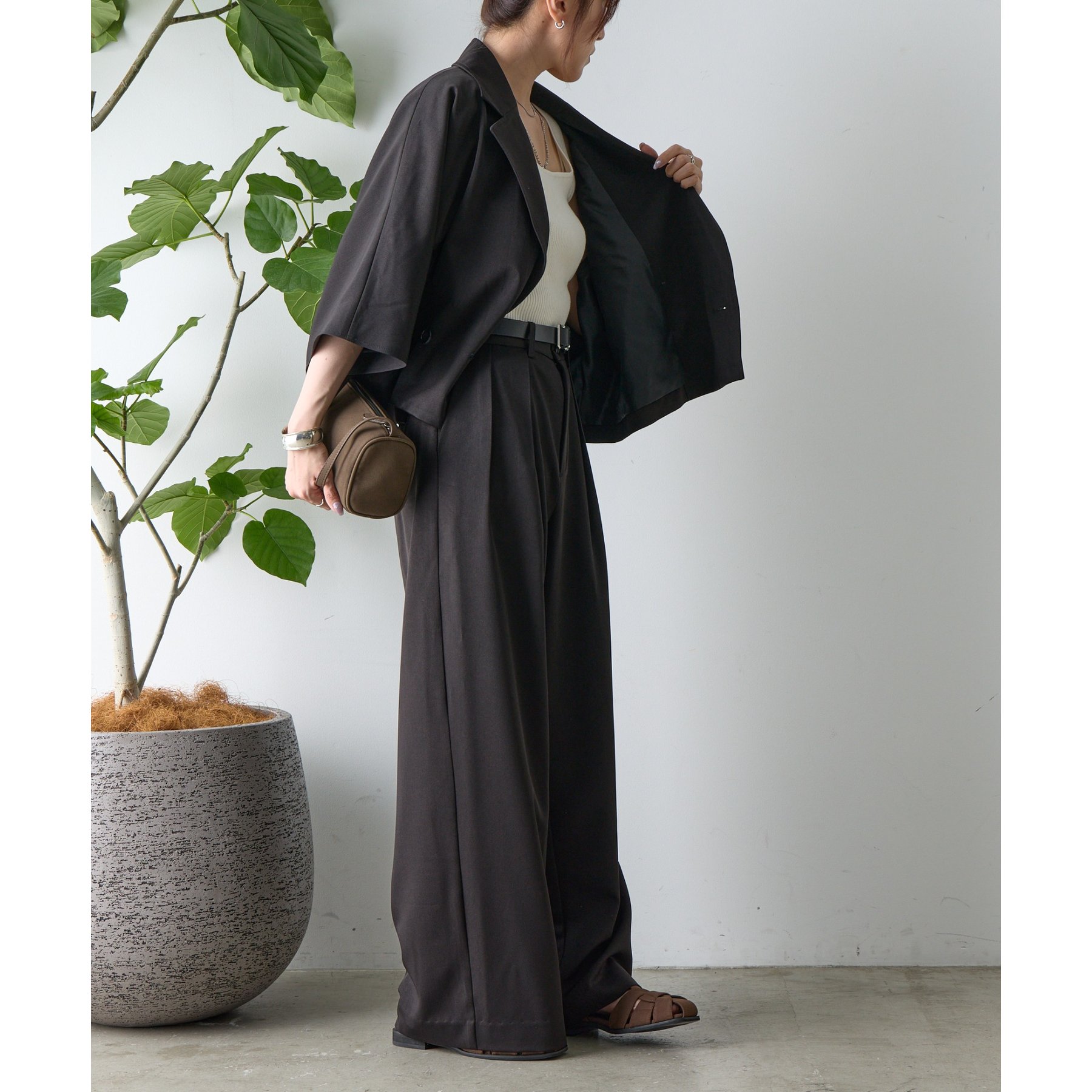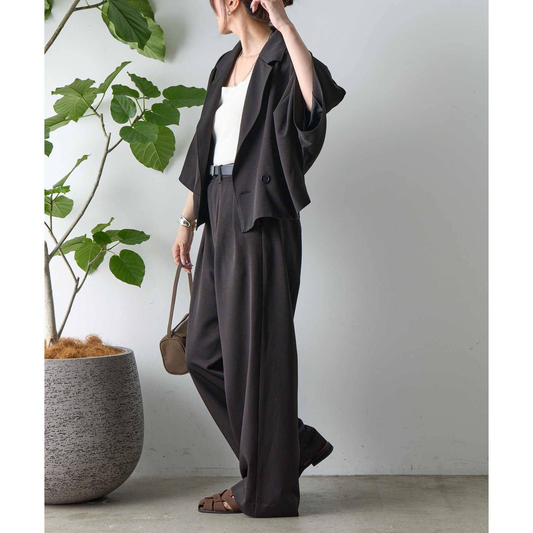 同素材のアイテムとセットアップで合わせるスタイルもおすすめです。