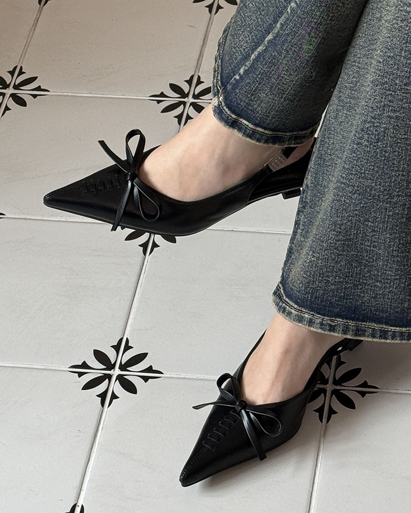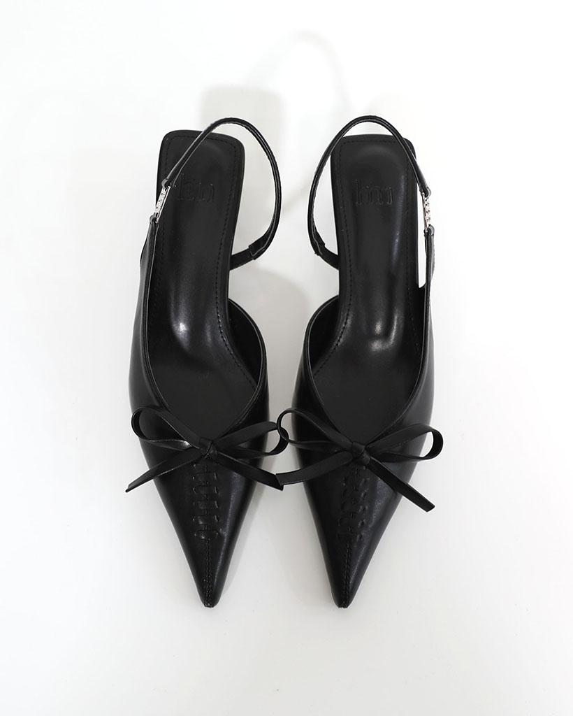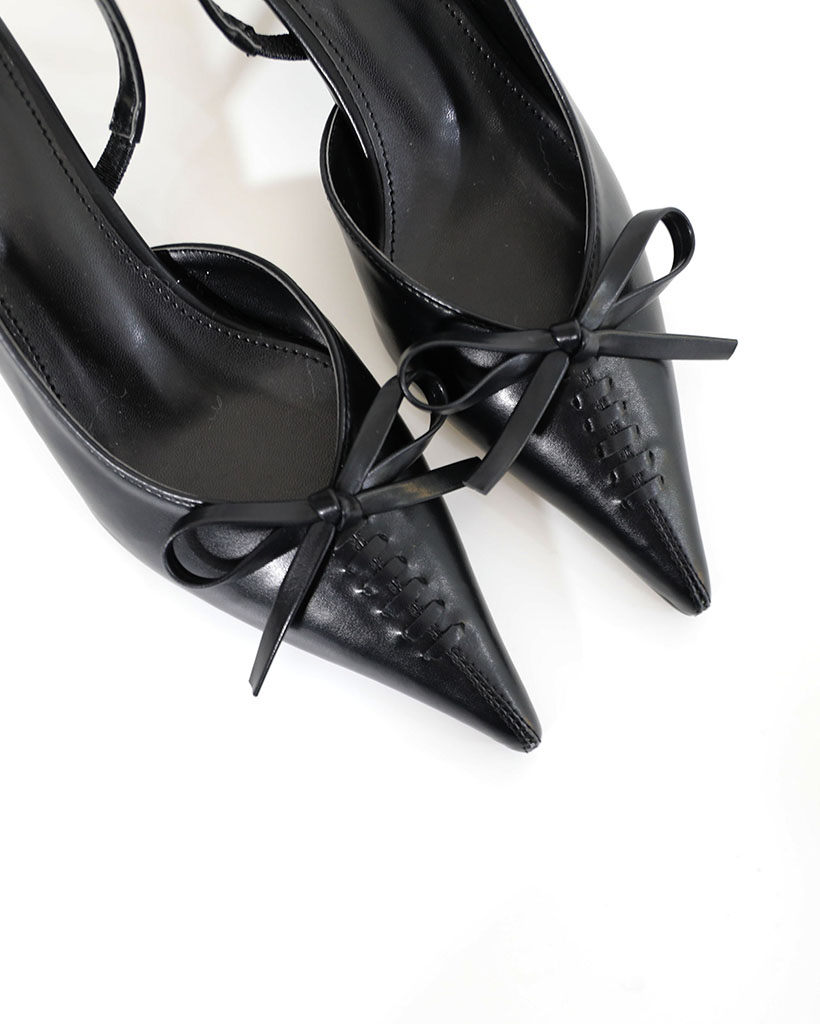 シャープなポインテッドトゥに、コルセット風のリボンディテールをあしらったスリングバックシューズ。