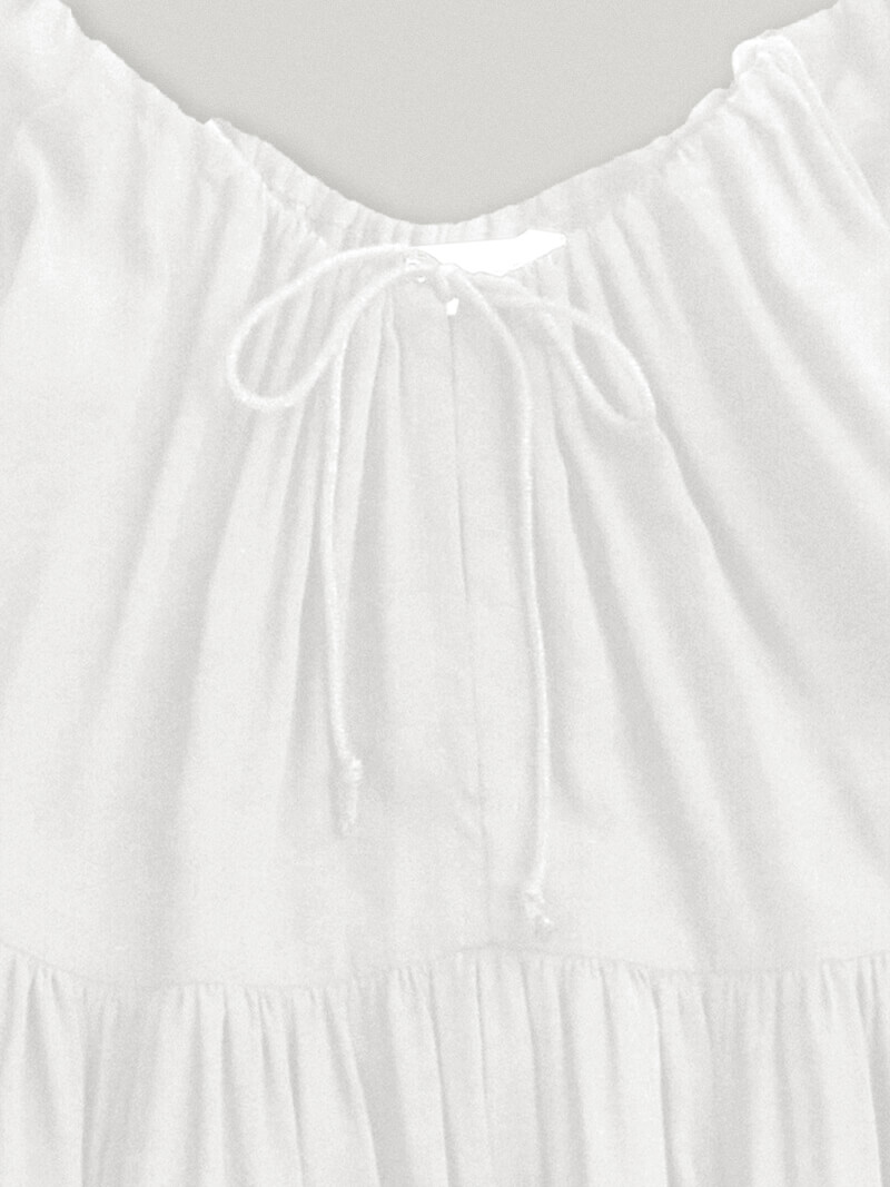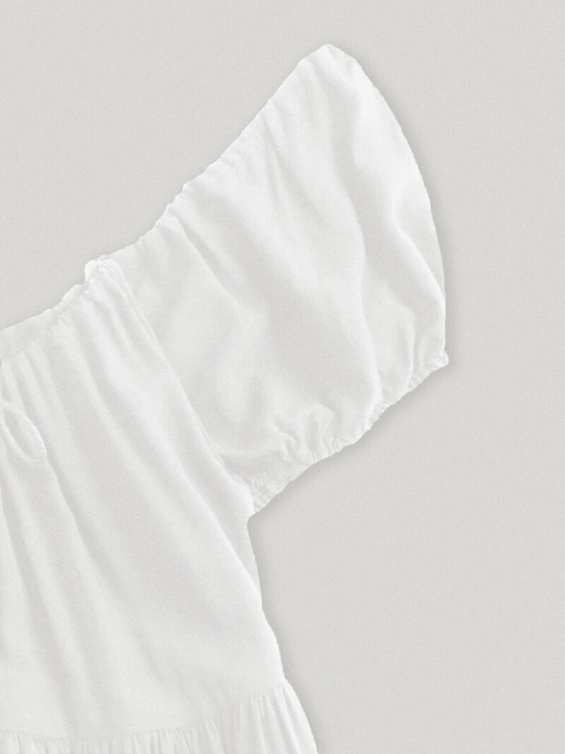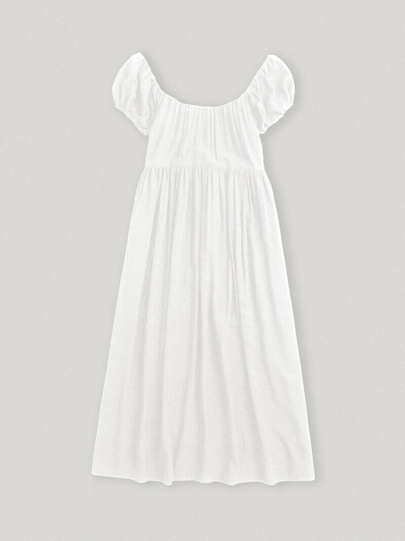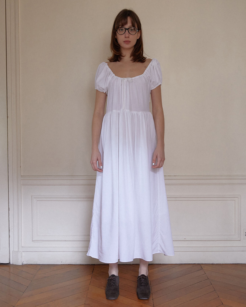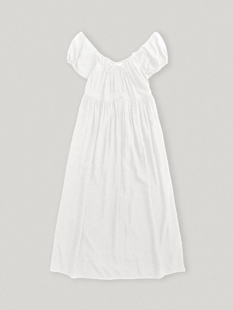 自然に流れるシルエットはロマンチックなルチアのロングドレスです。これは女性らしい魅力を最大限に引き出すドレスアイテムです。純白のカラーはよりクリーンでドラマチックな魅力を感じさせます。軽量のレーヨンとテンセルの混織生地で夏のシーズンにぴったりで、ネックラインはエレガントにドレープし、細いストラップでラインを軽く調整できます。バンド入りの袖デザインはふっくらとした肩のラインを作り出し、自由にデザインされているため、時にはオフショルダーのように見えます。自然な垂れ下がるシルエットは長くスリムに見え、側面には隠しファスナーが付いていて簡単に外せます。 ドレスの裾のサイドラインには赤い線刺繍が施されています。これはレイジーデイジーステッチに触発された、母が子供の頃に服に印をつけていた小さくて貴重なフランスの刺繍で、私だけが知る印のような雰囲気を加えています。ルチアのドレスの魅力を感じて、私だけが持つ魅力を存分に表現します。パフスリーブ隠しファスナー留め具ストラップデザイン:レイジーデイジーステッチ レーヨン 65% テンセル 35%