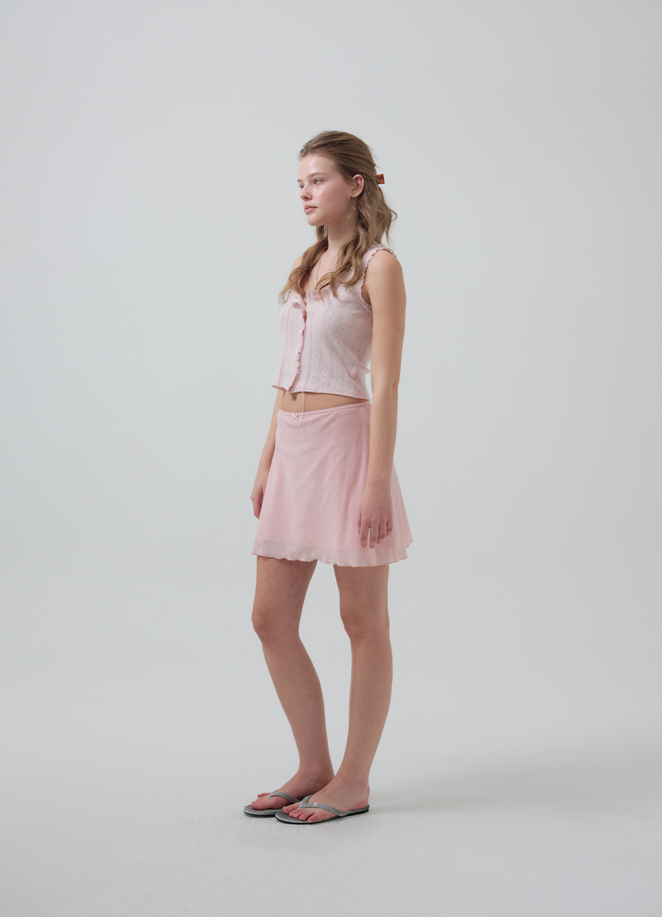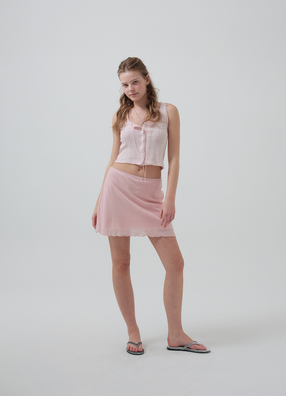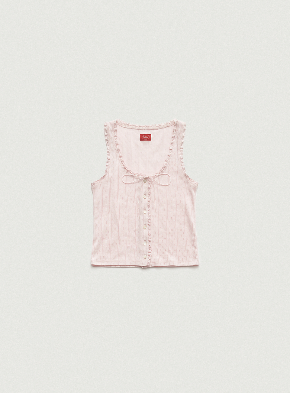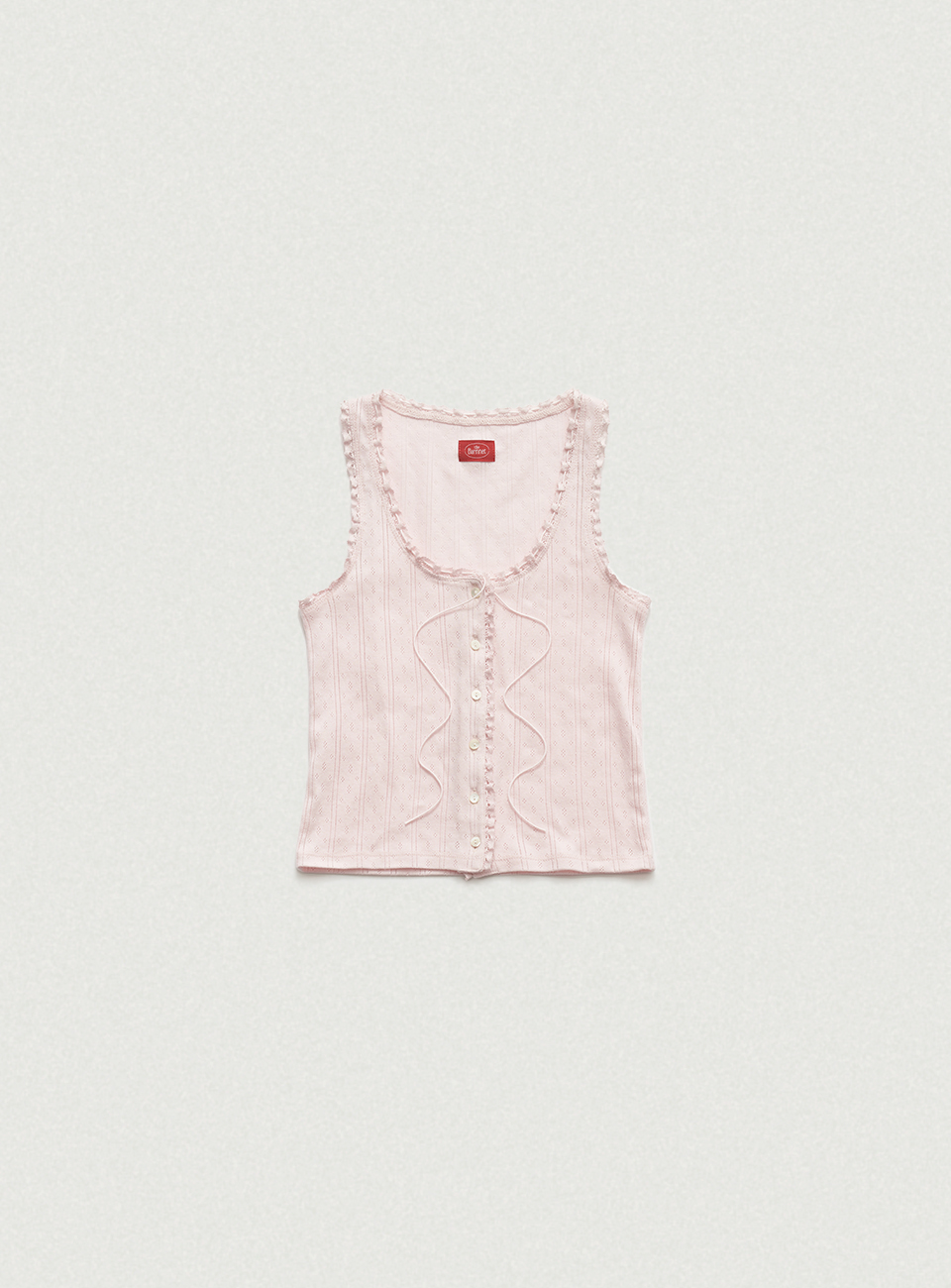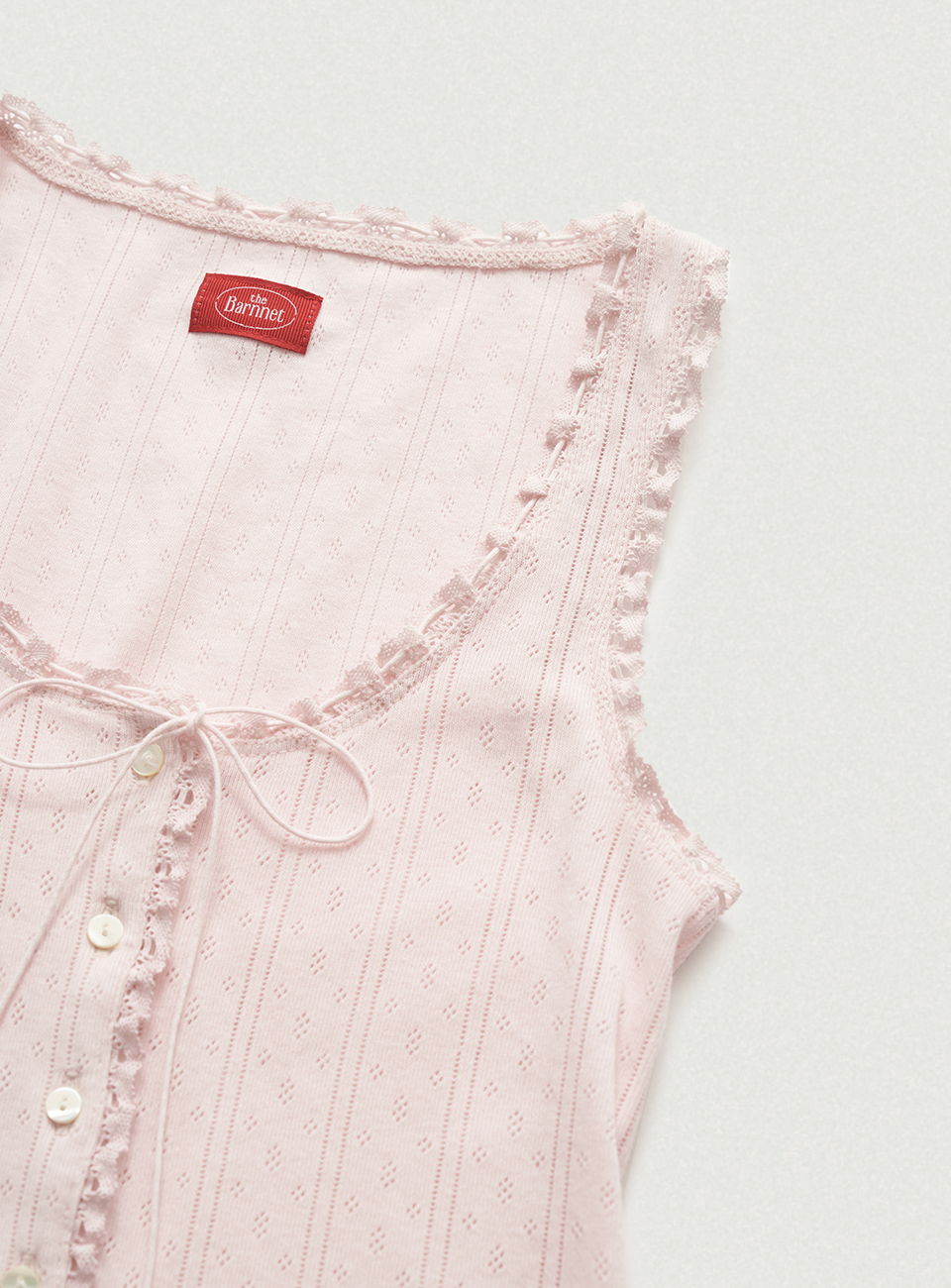 女性らしいUネックとフルオープン仕様のボタンディテールを備えたスリーブレスデザイン