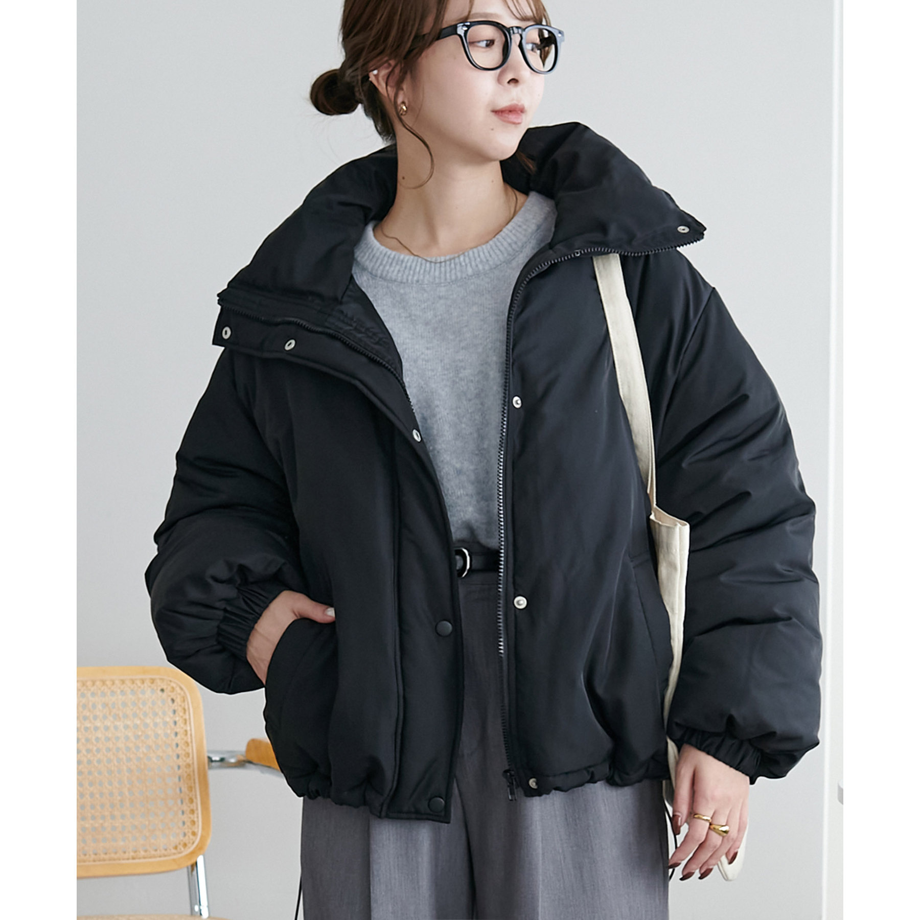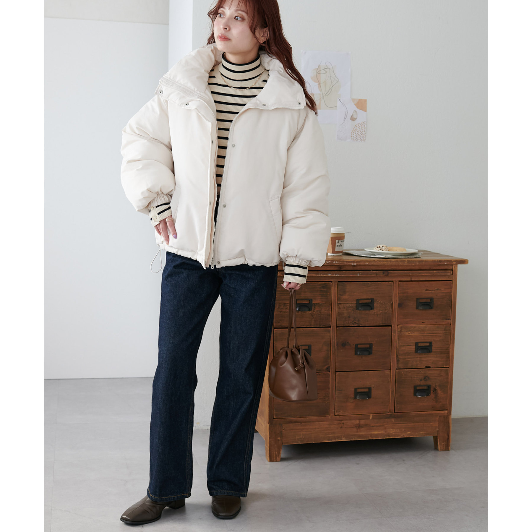 ・160cmスタッフ(Mサイズ着用):ボリューム感たっぷりなのに、軽くて暖かいアイテム!シンプルなので、カジュアルから甘めなスタイリングまでテイストを問わず着用できますよ◎