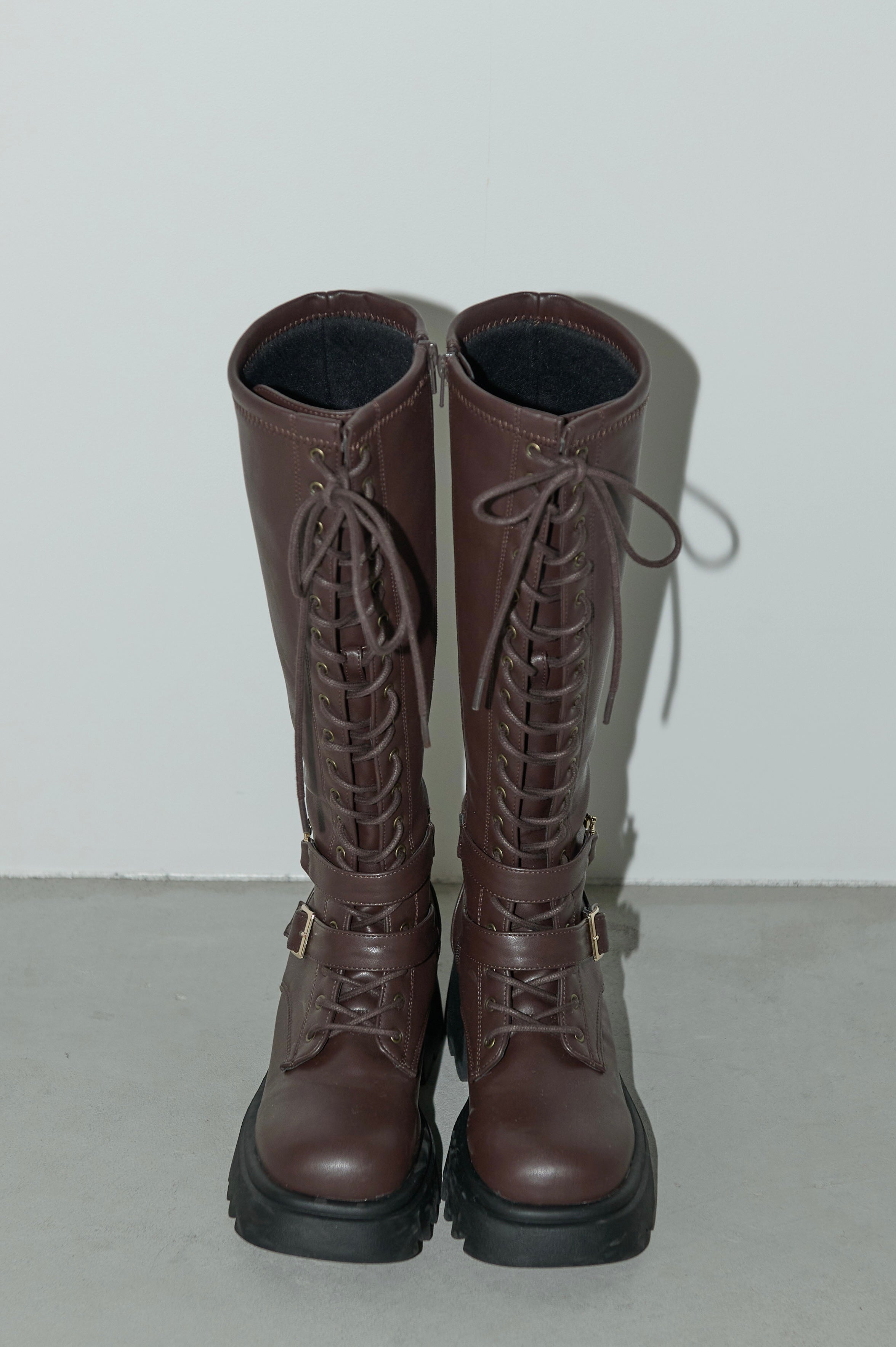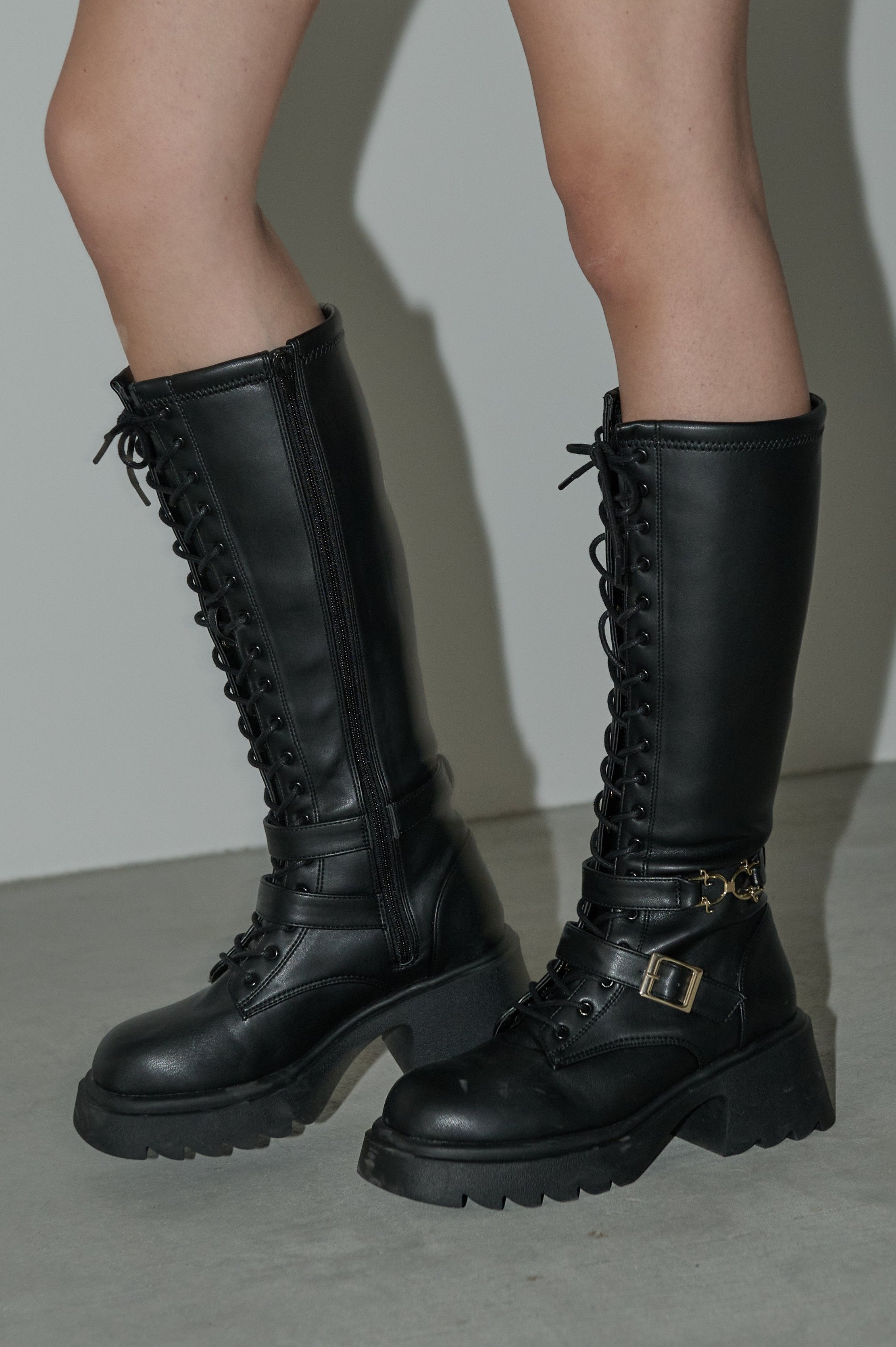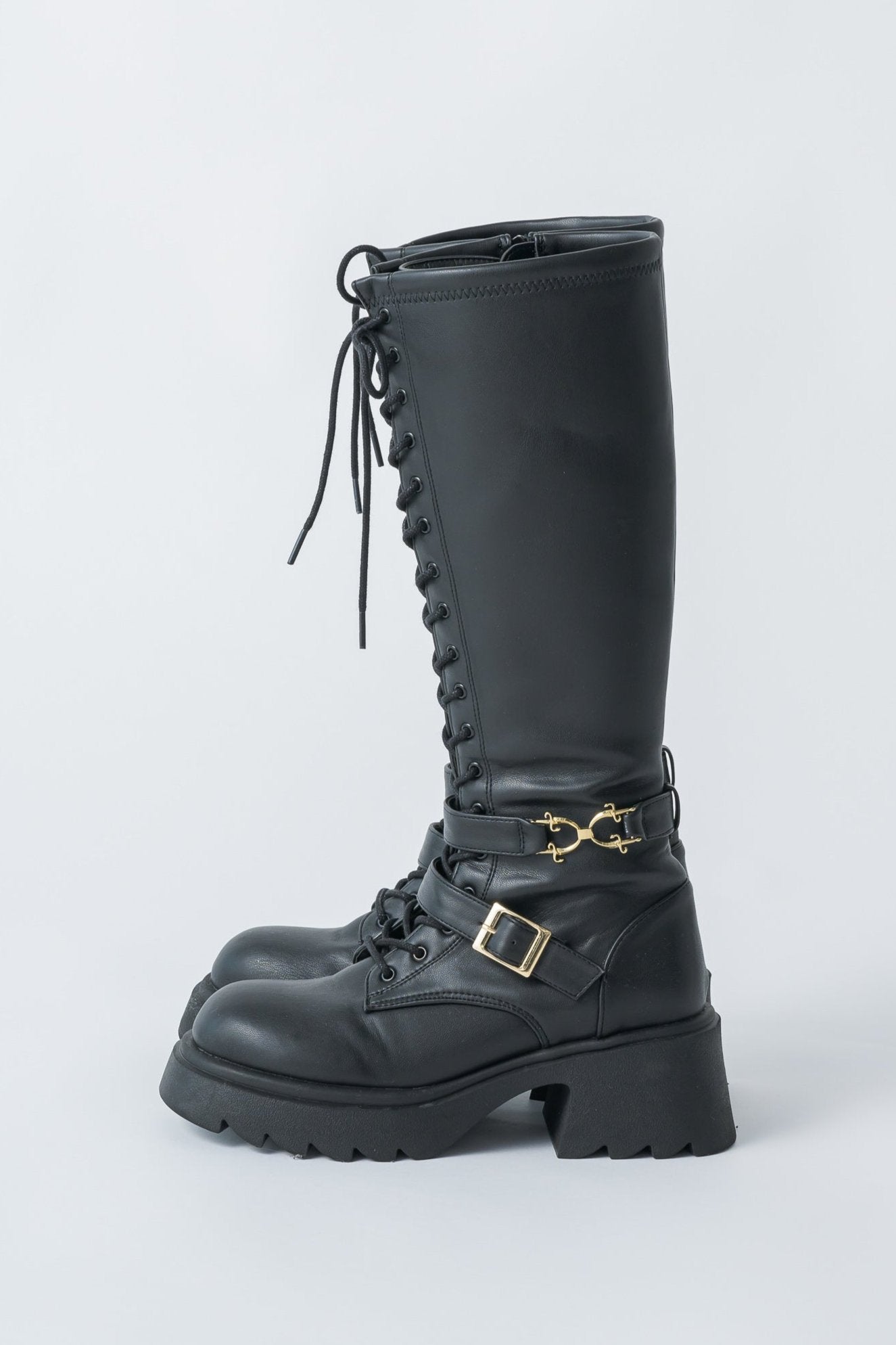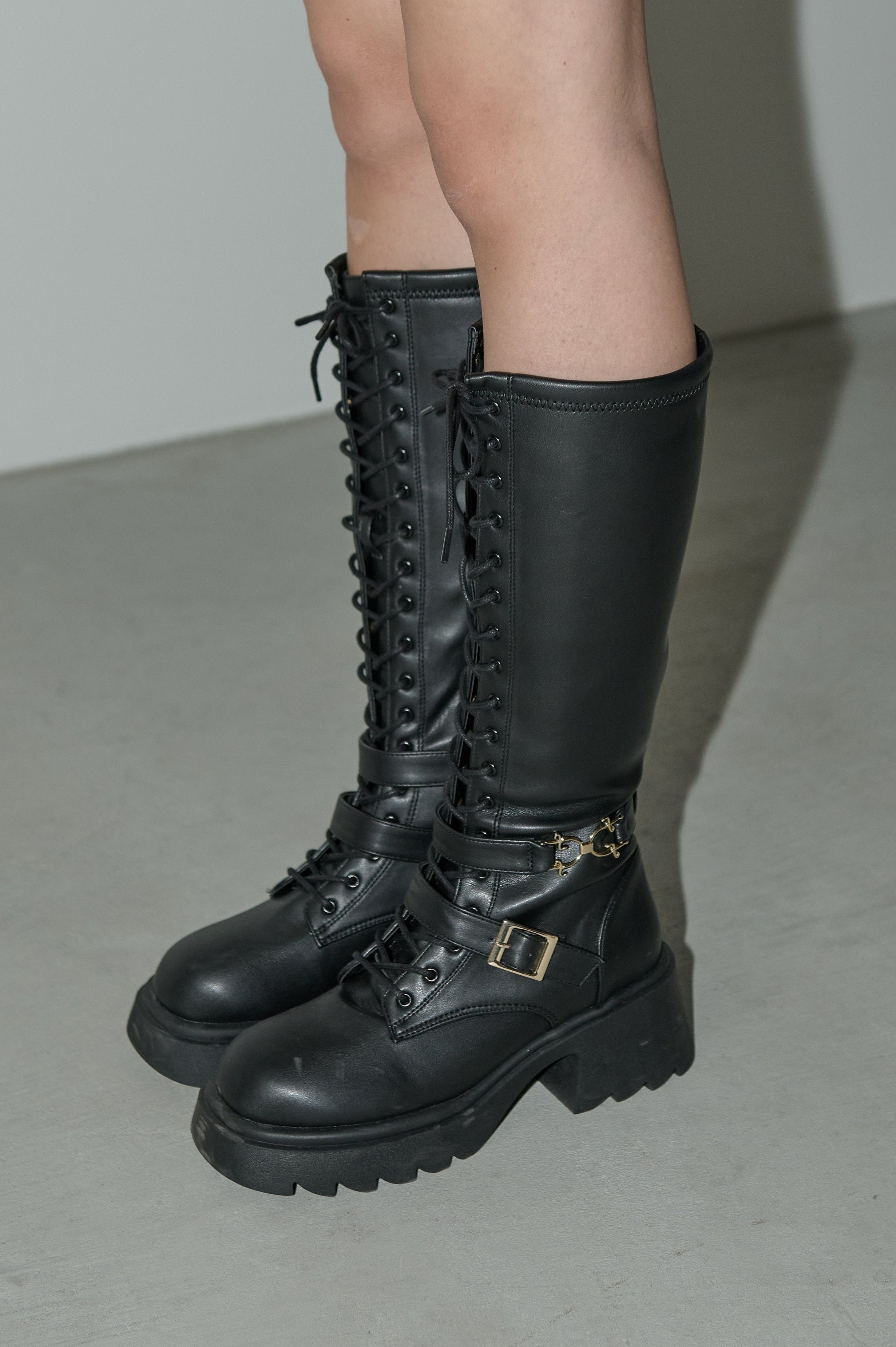 サイドにデザインバックルがポイントのレースアップロングブーツ