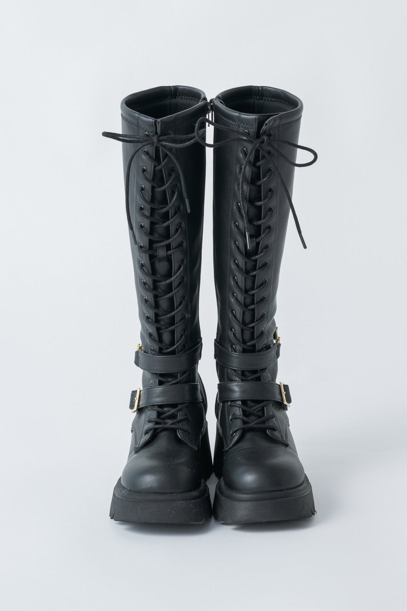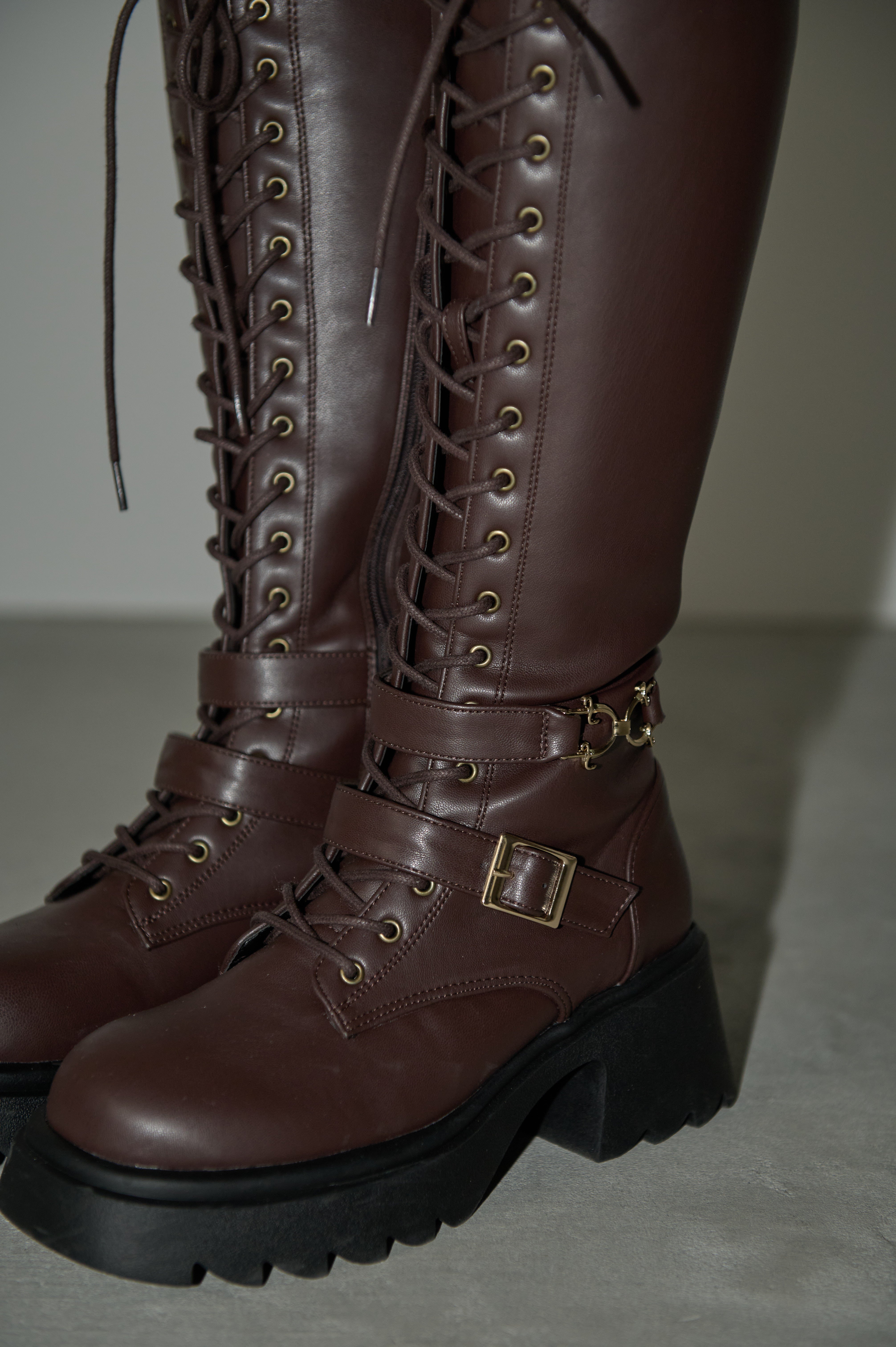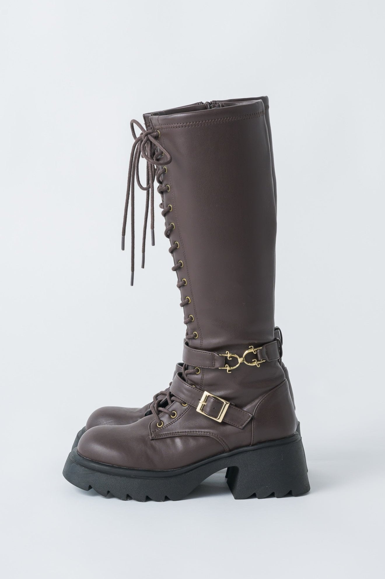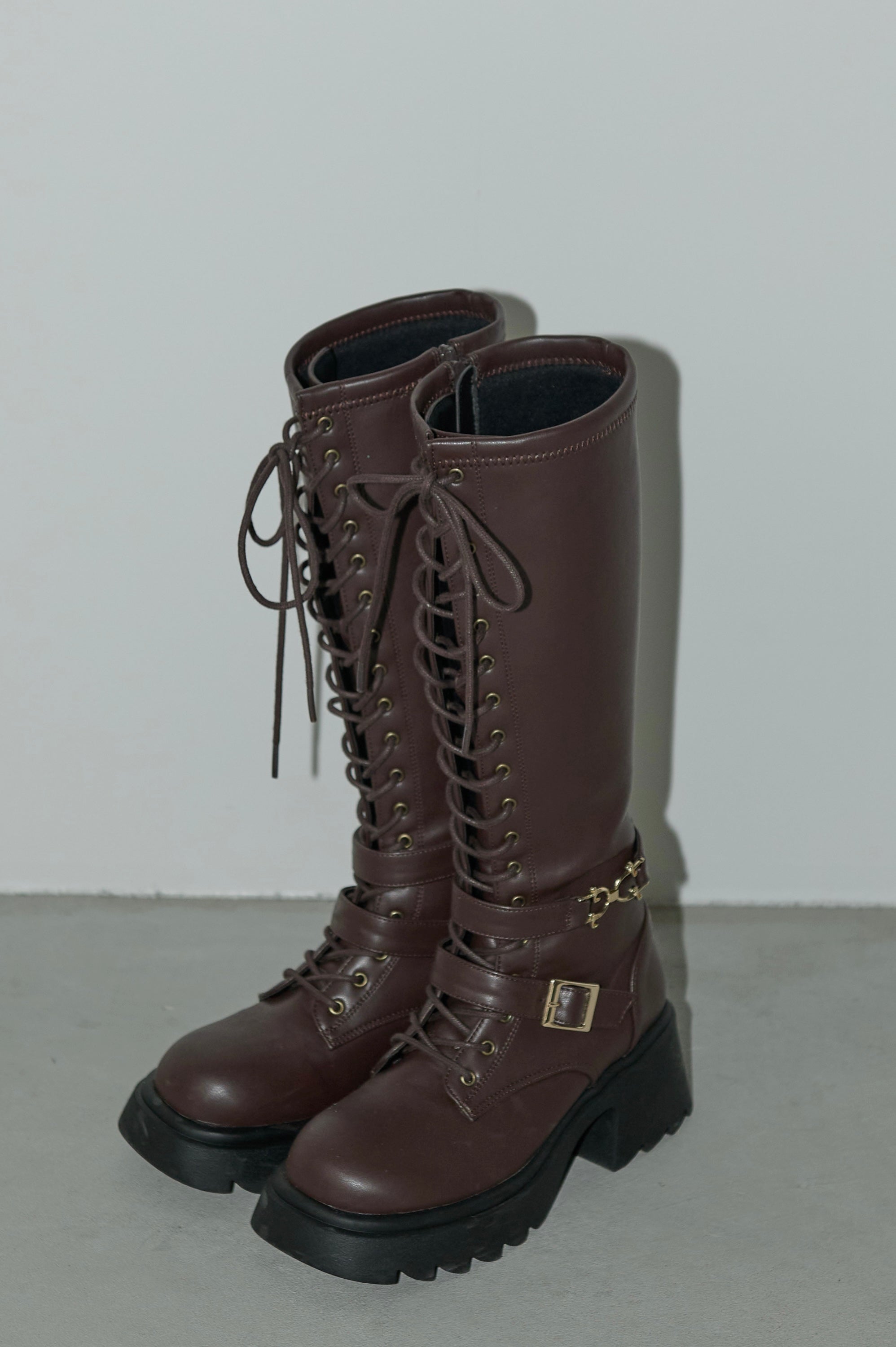 サイドにデザインバックルがポイントのレースアップロングブーツ