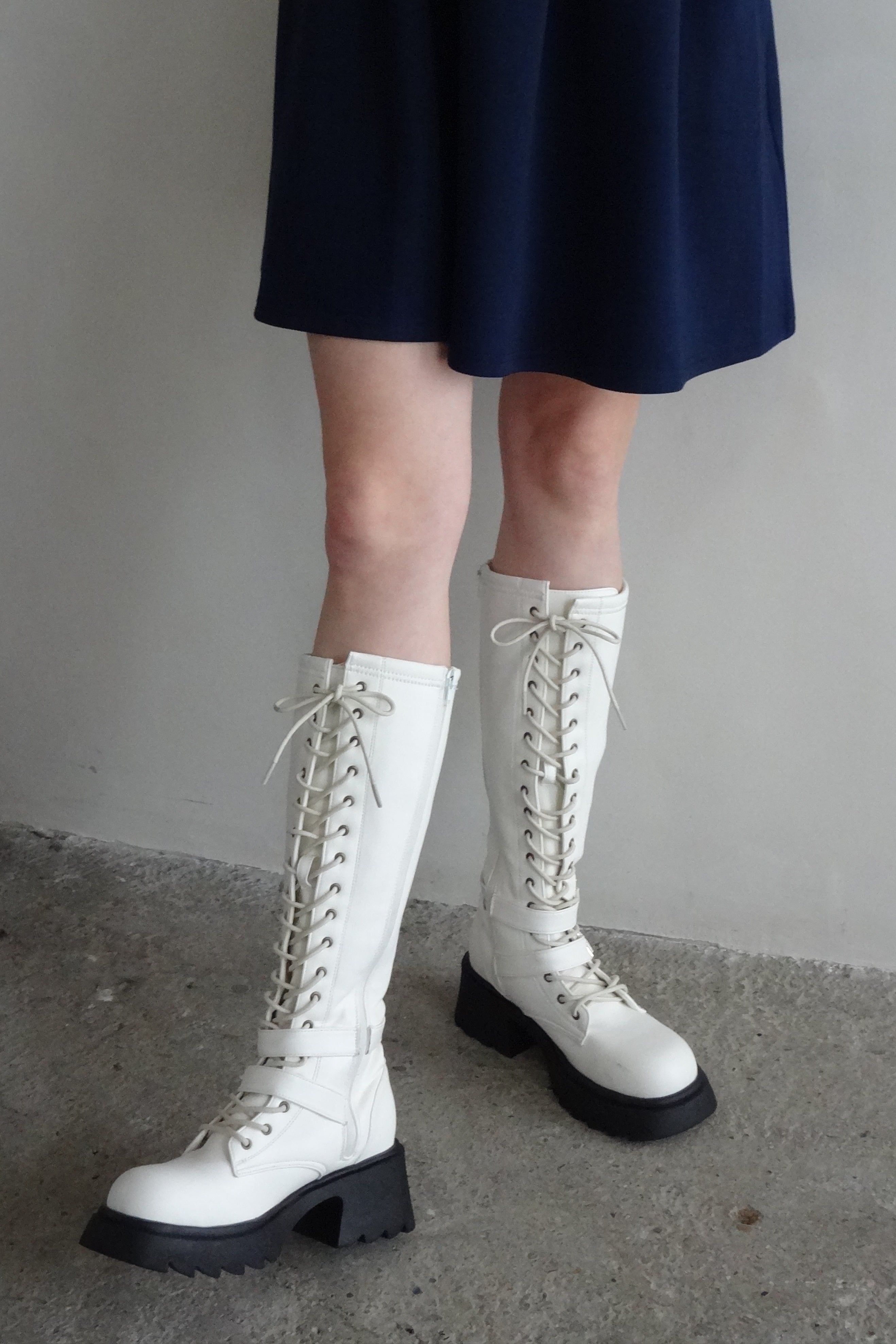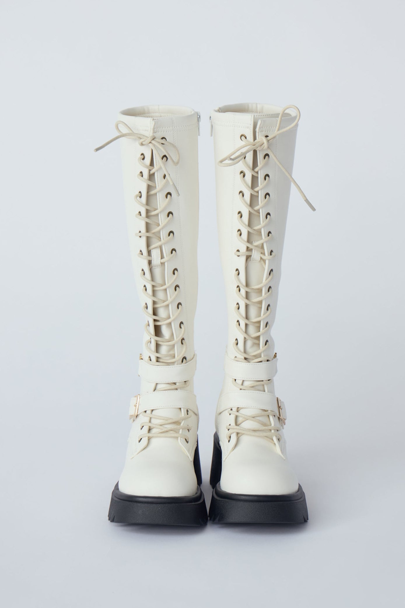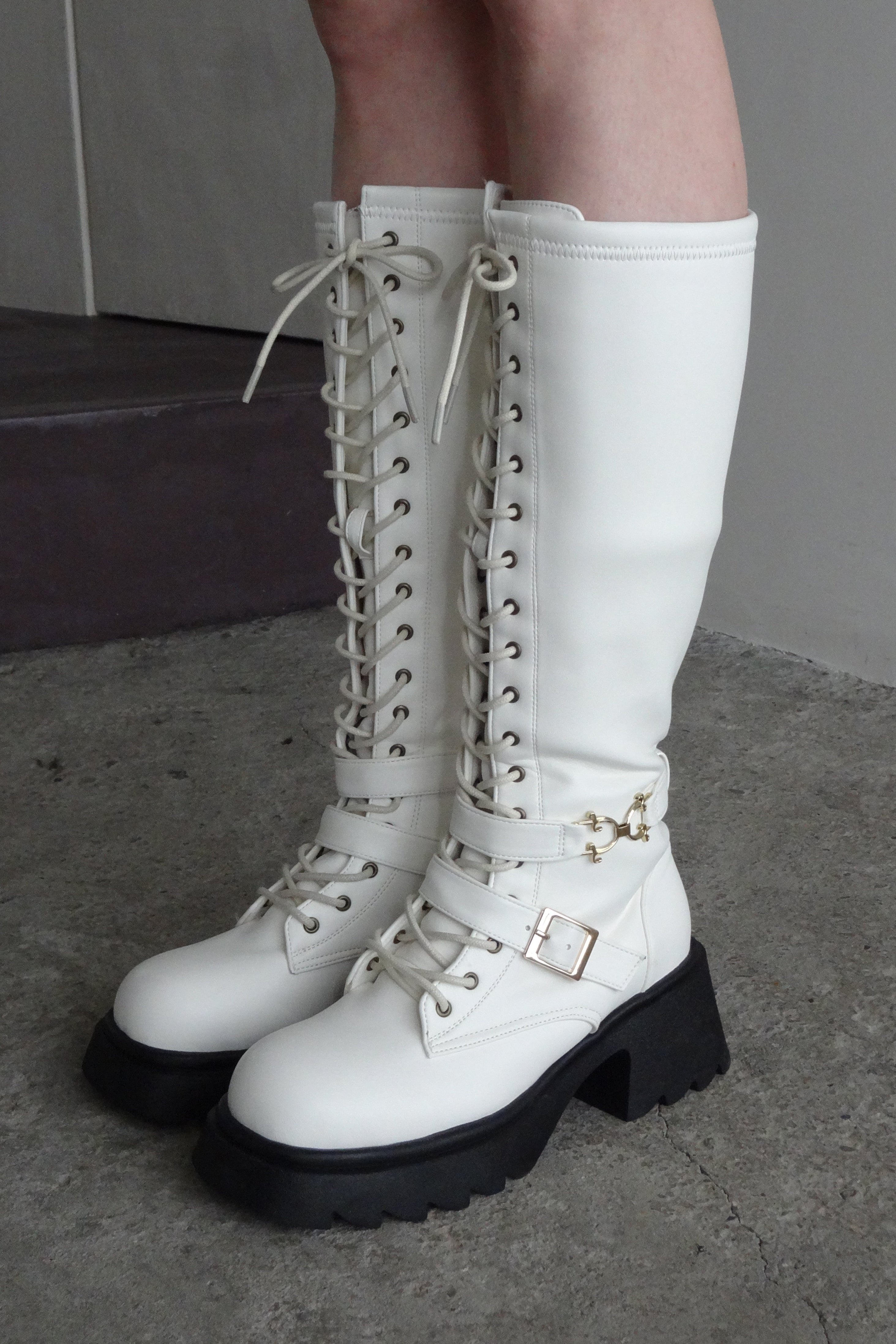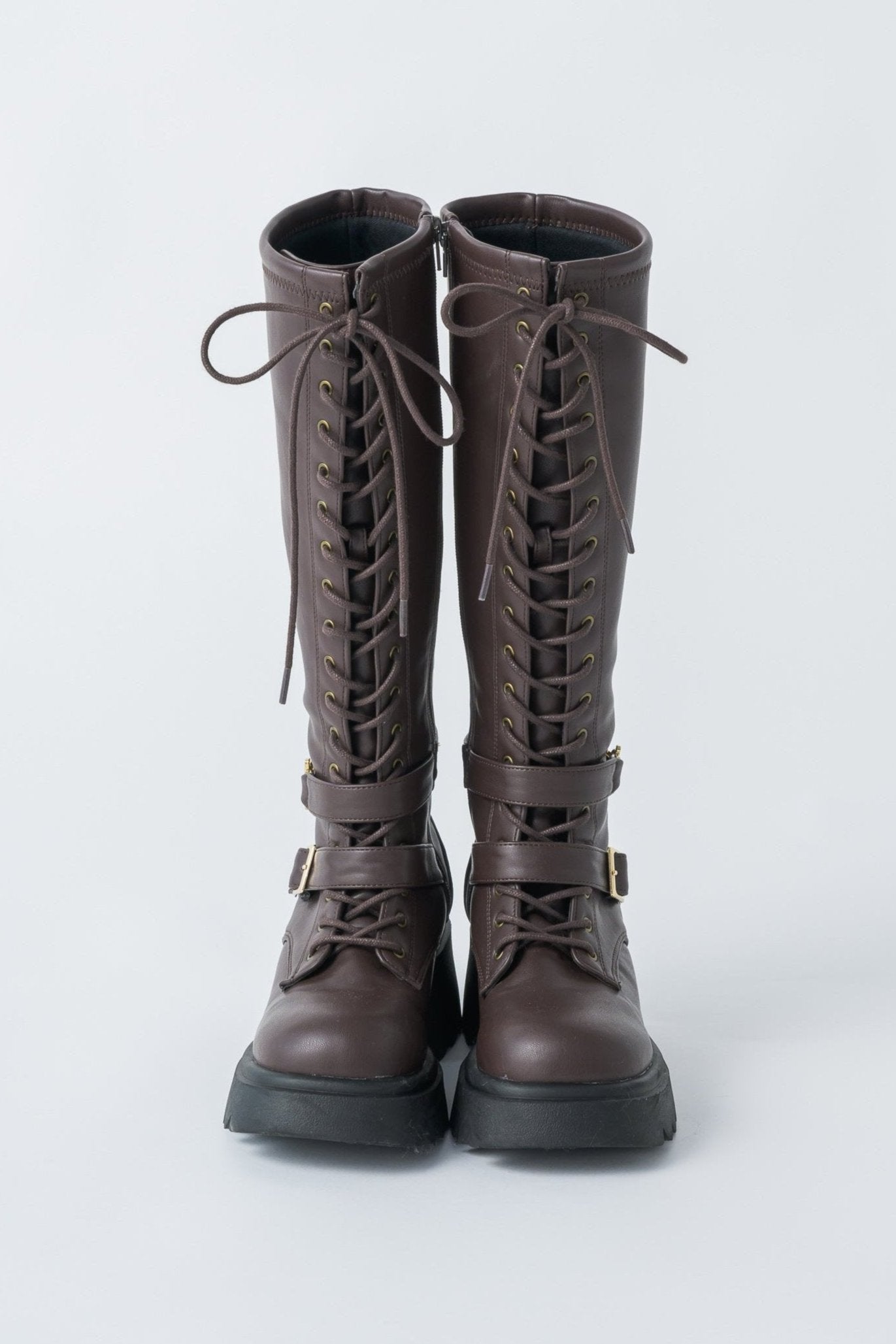 サイドにデザインバックルがポイントのレースアップロングブーツ