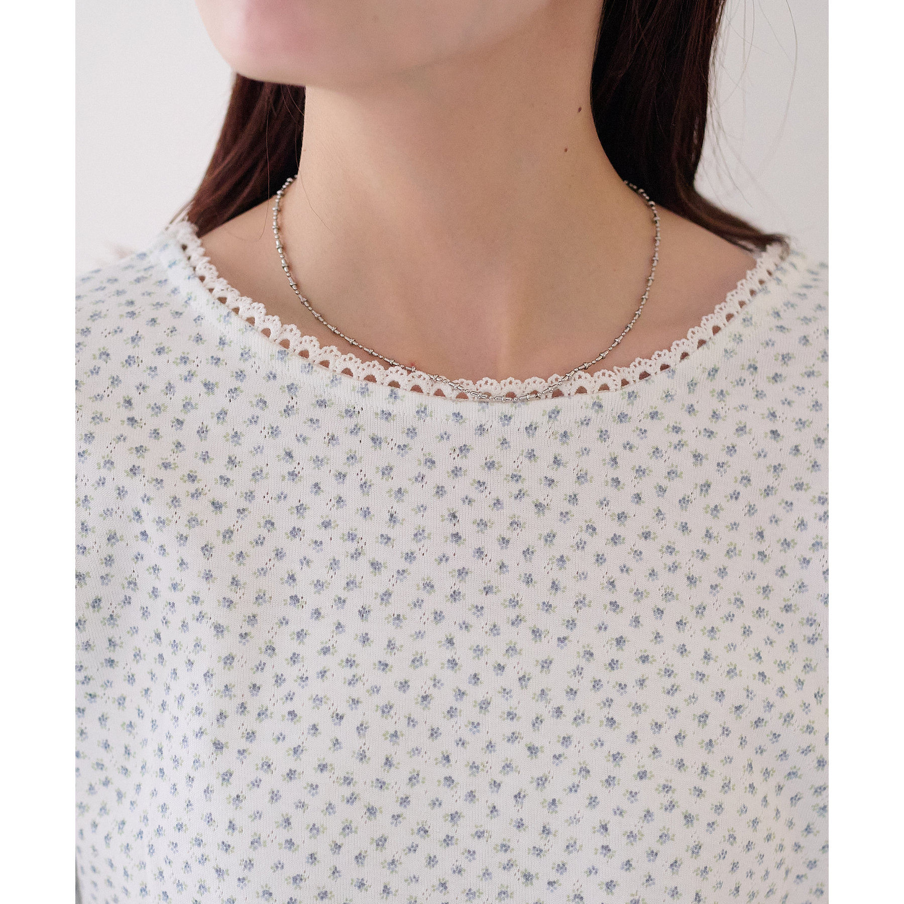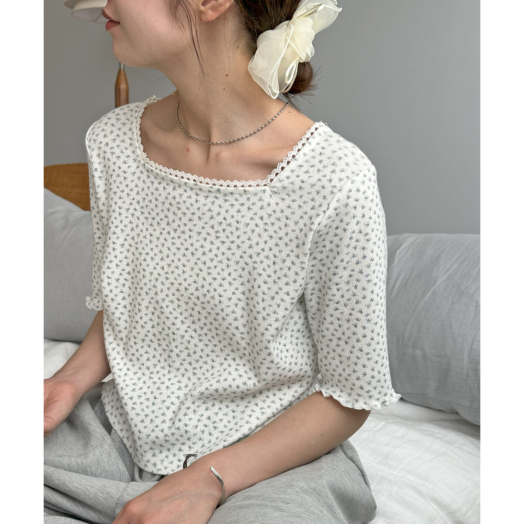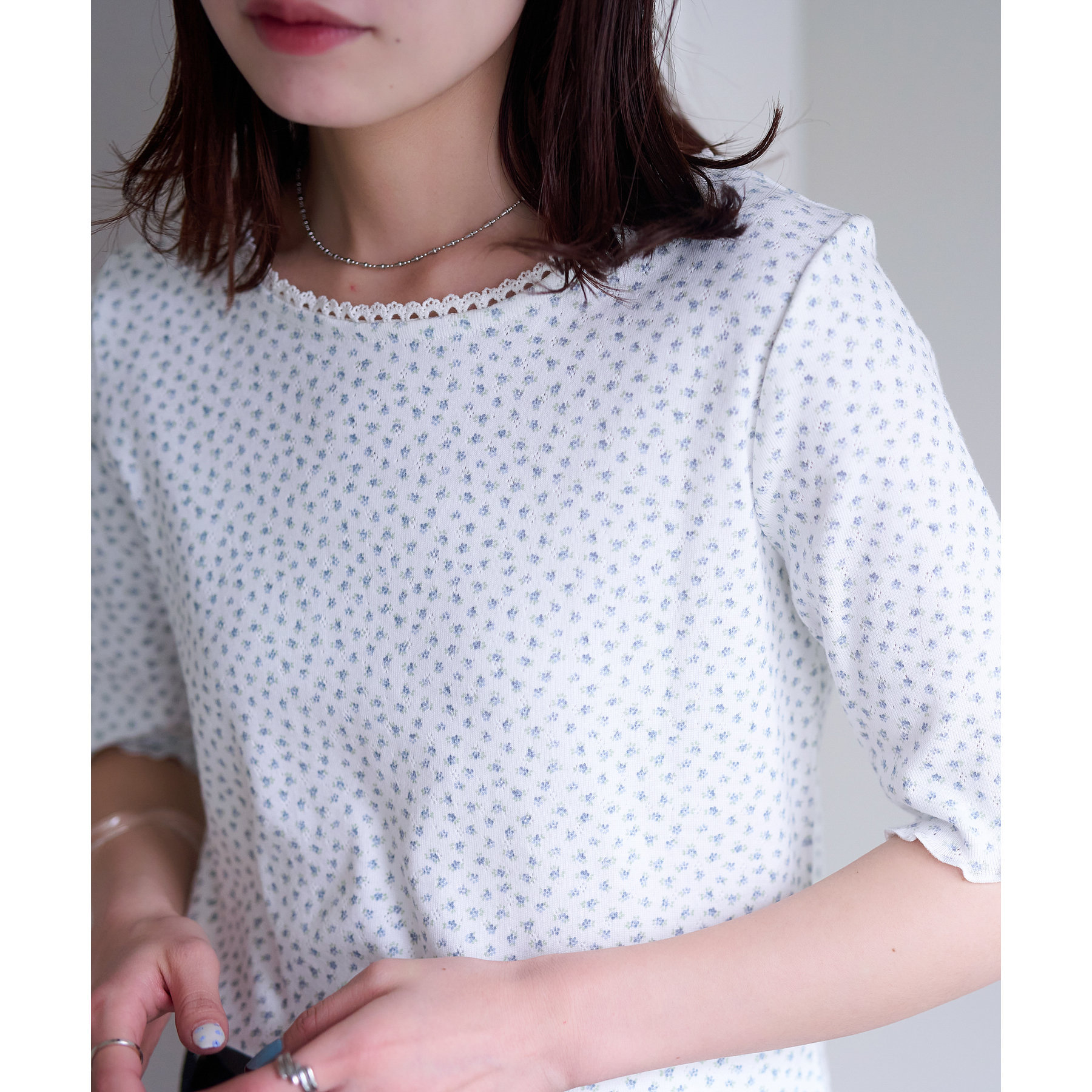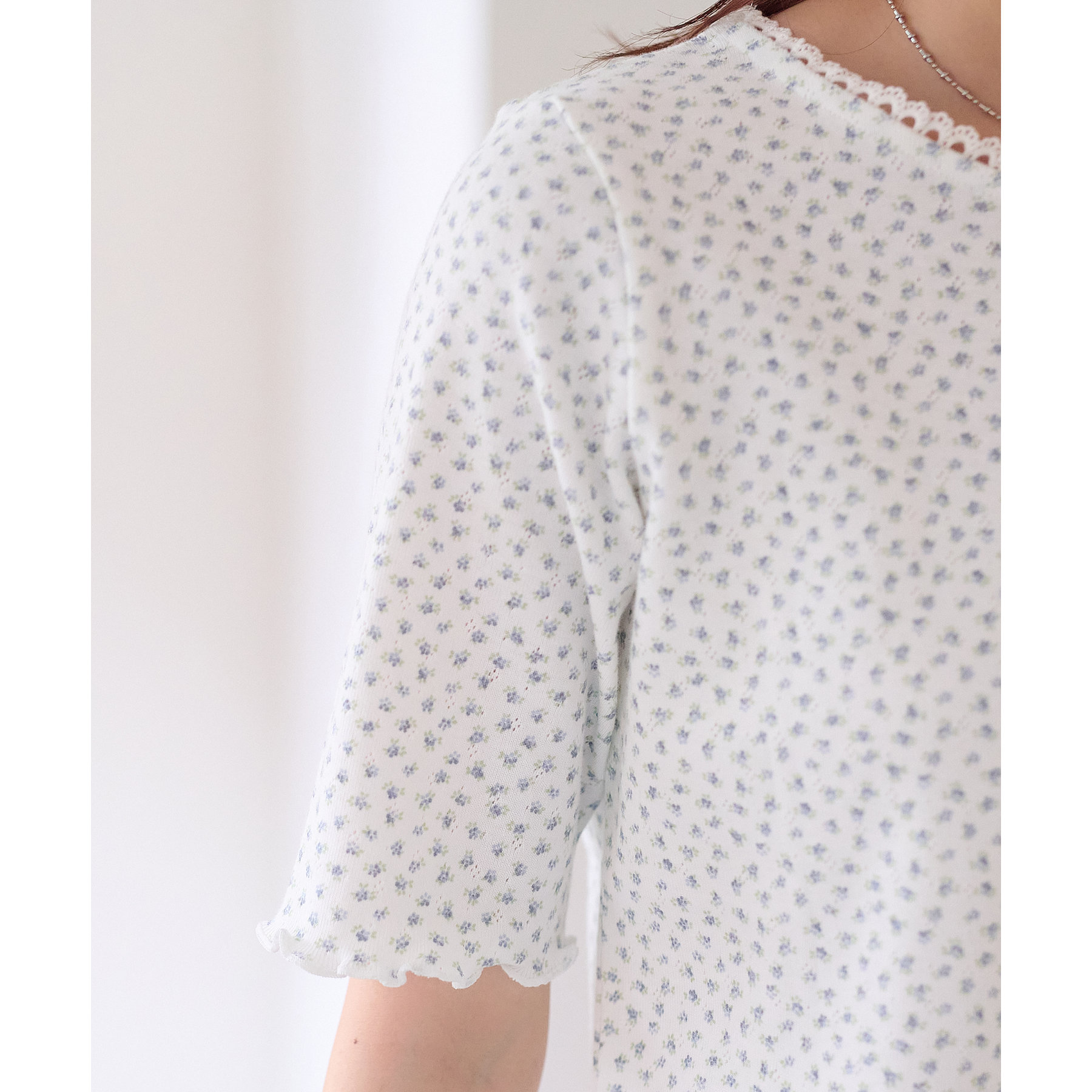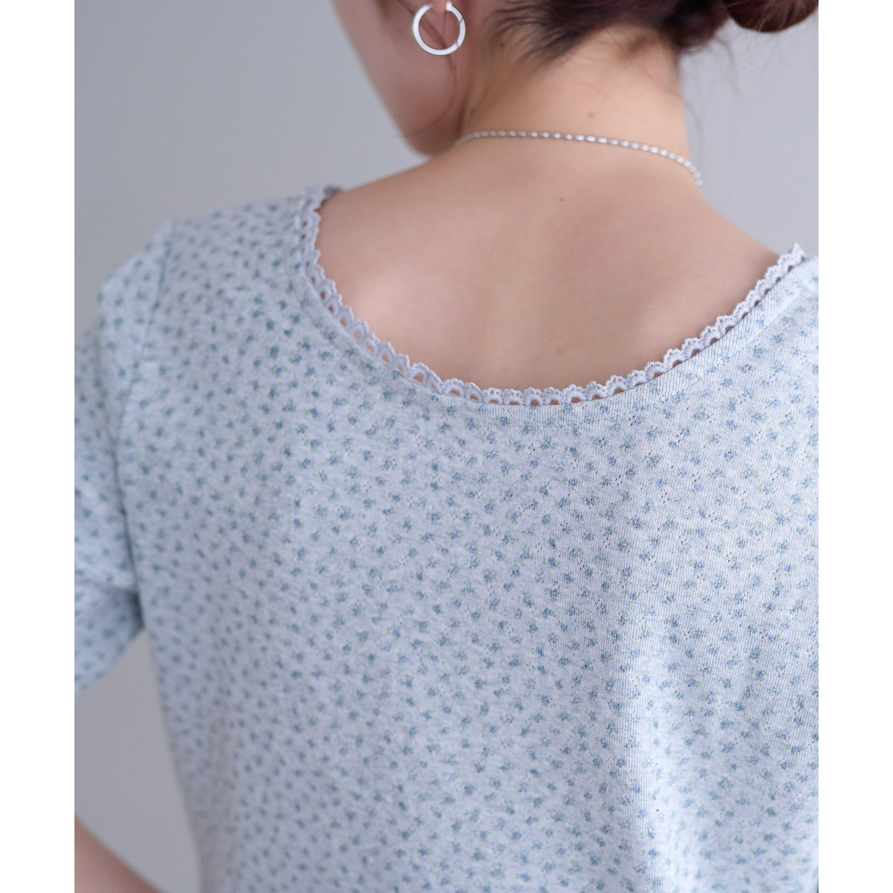 また、ネックラインには繊細なレースをあしらっており、ジャケットなどの羽織りものとの相性も◎