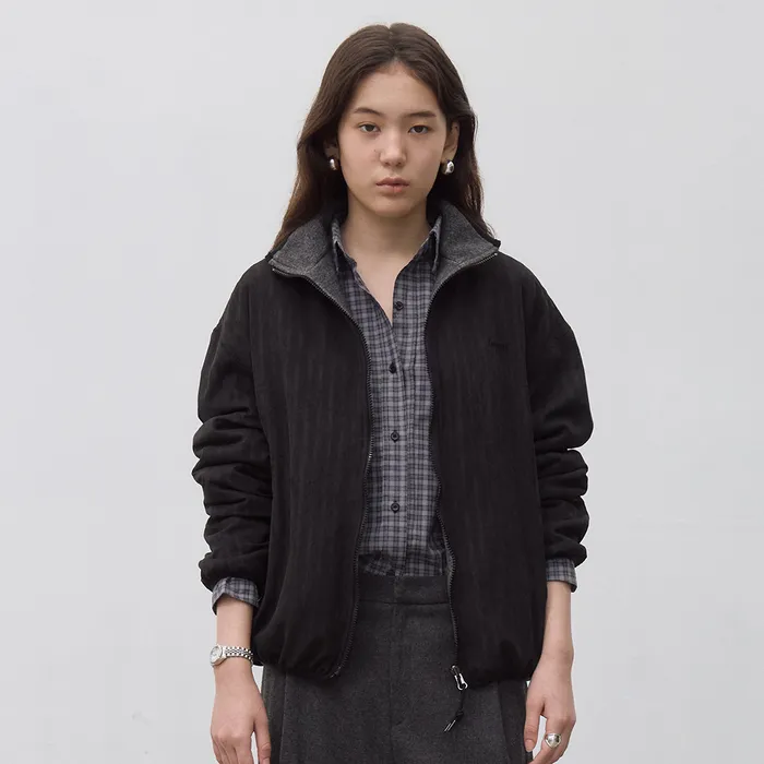 片面はあたたかくボリューム感のあるフリース素材で構成され、高い保温性を発揮し、反対側はほのかな光沢を帯びたストライプパターンの生地を採用し、カジュアルでありながらも洗練されたムードをプラスします。1着で二つの異なる表情を楽しめる、汎用性の高いアイテムです。