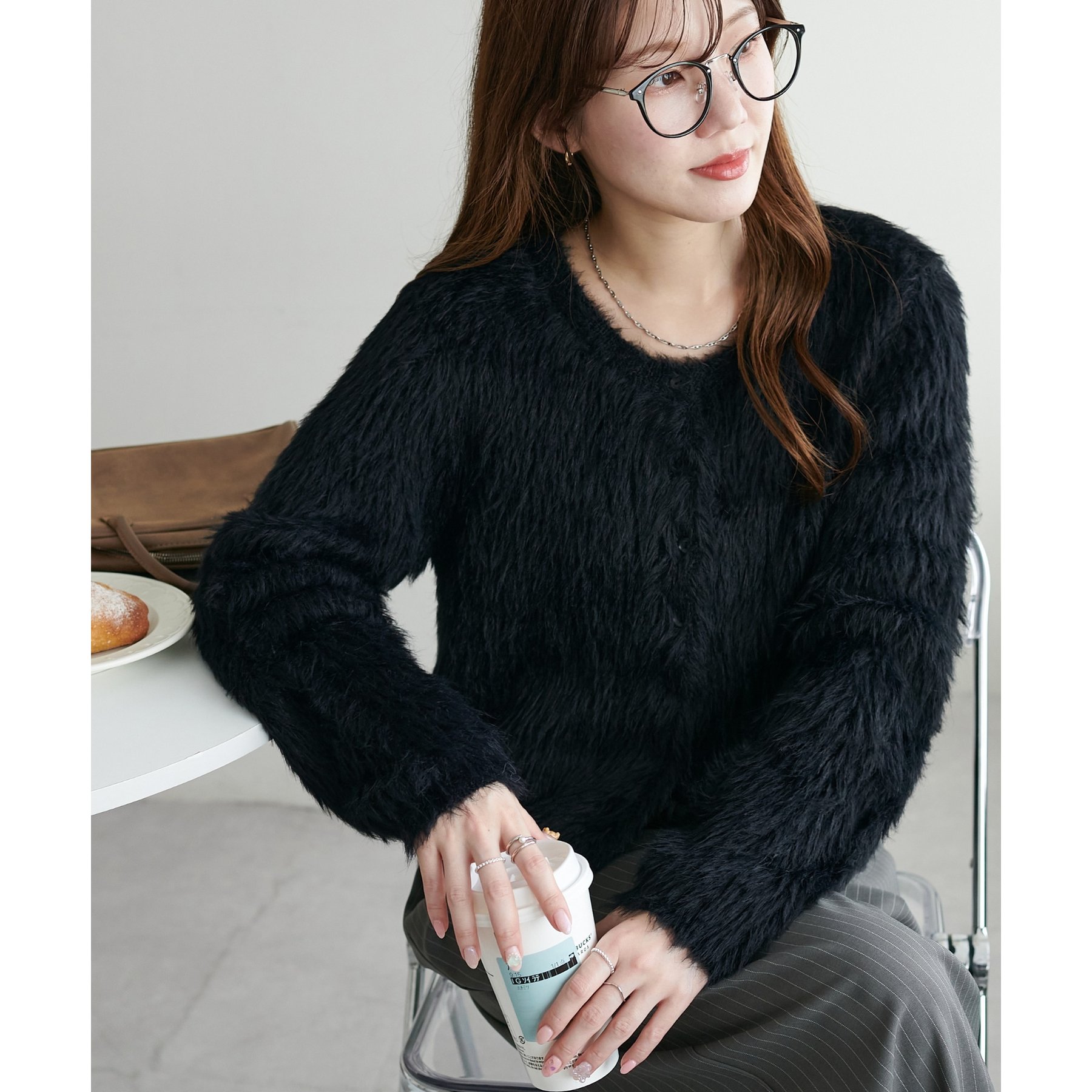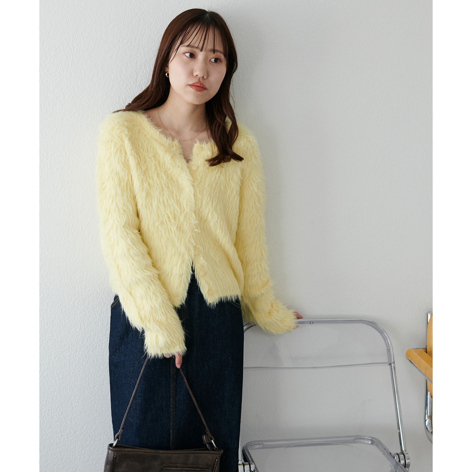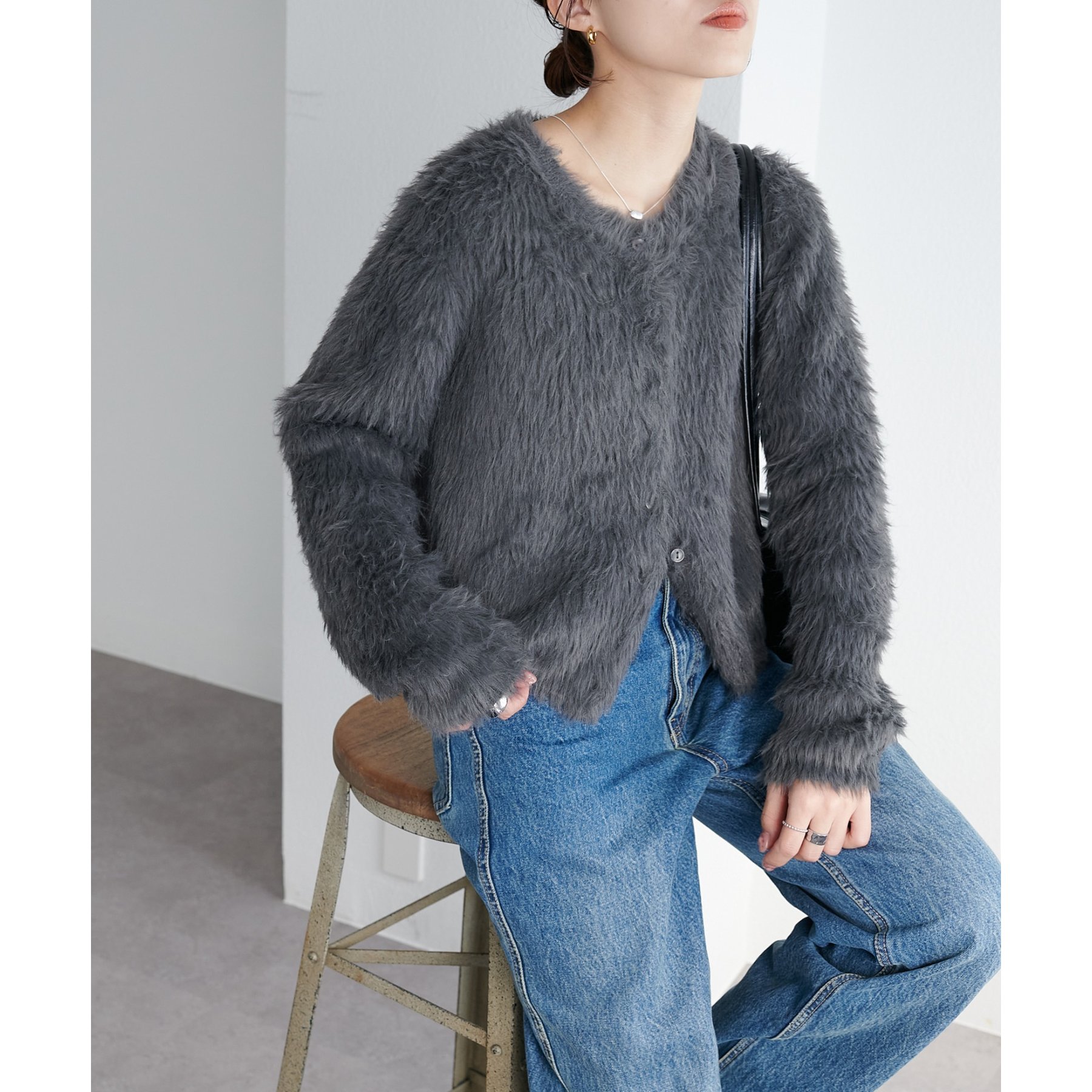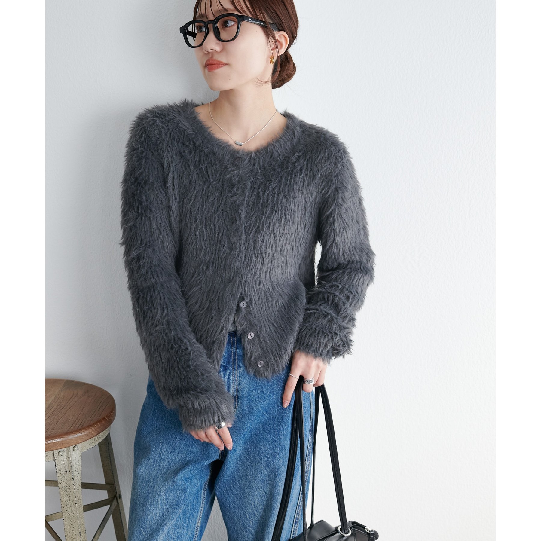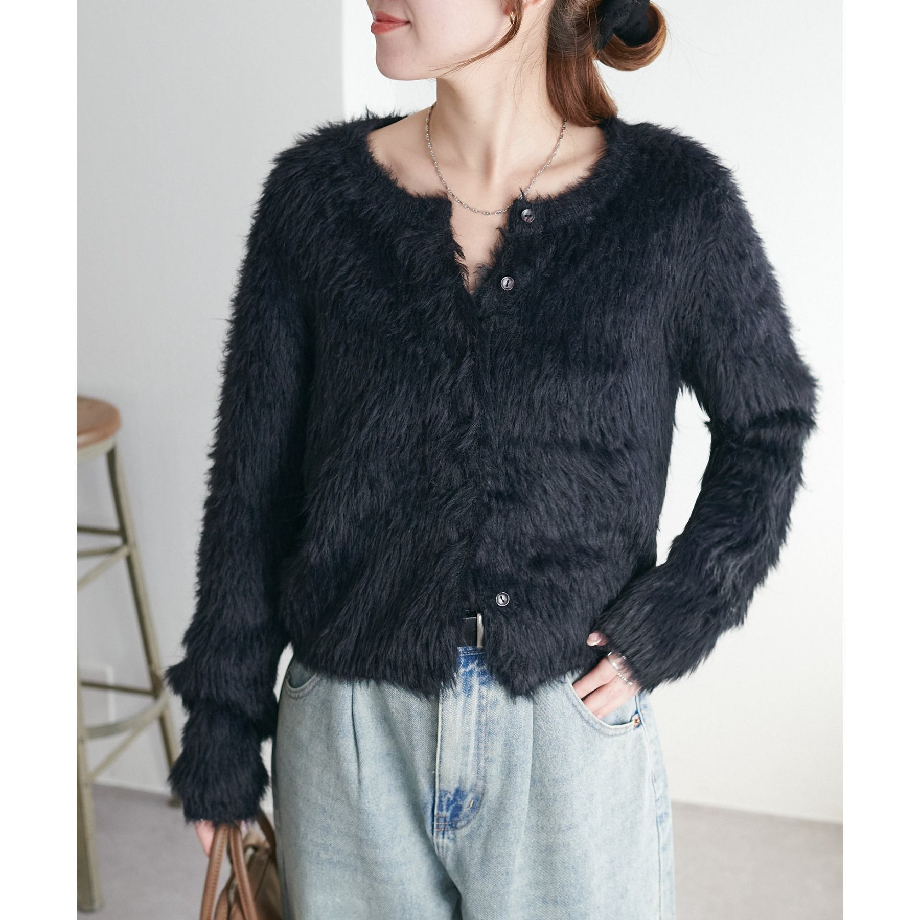 全体に毛足の長いロングフェザーヤーンを贅沢に使用した、ふんわりとした質感が魅力のカーディガン。