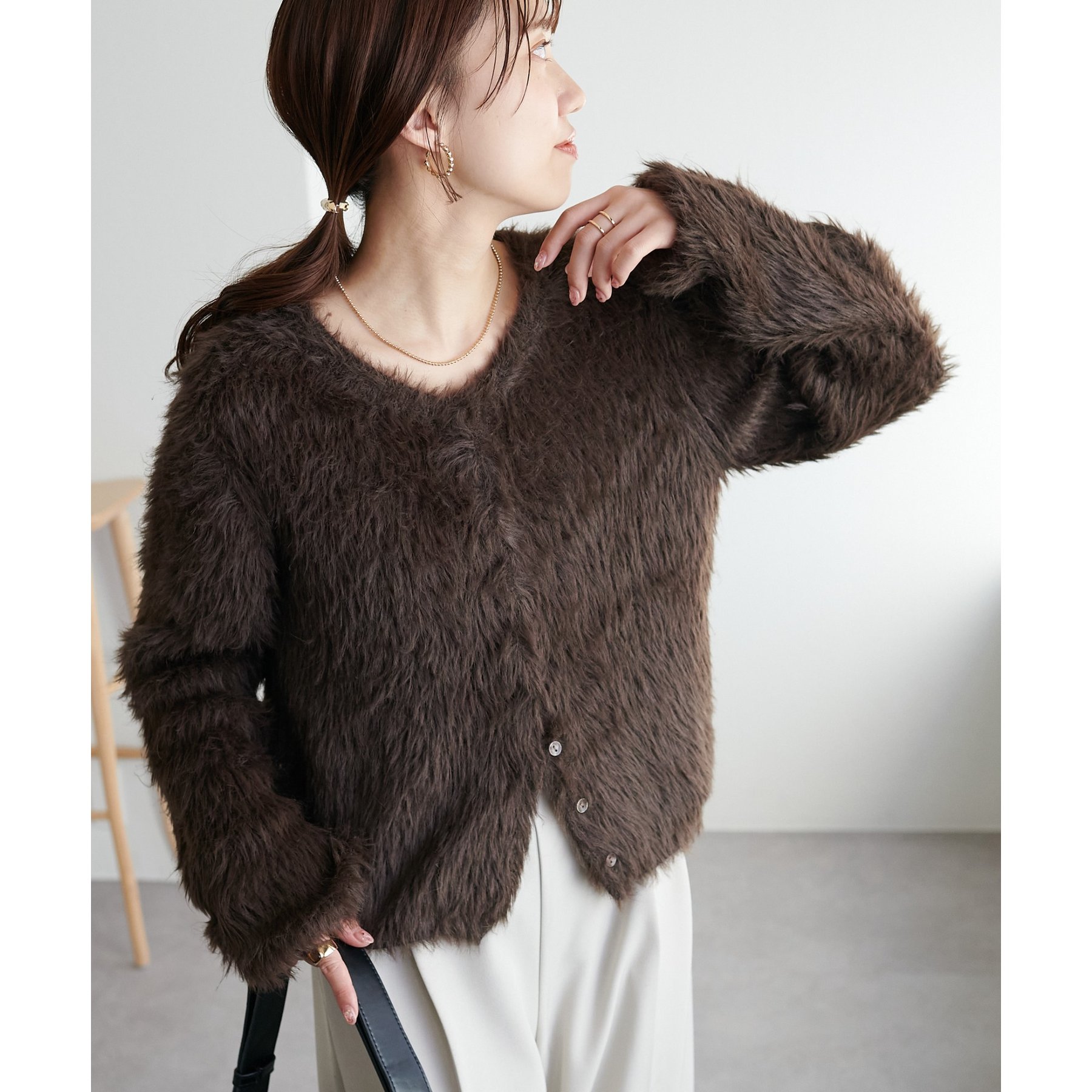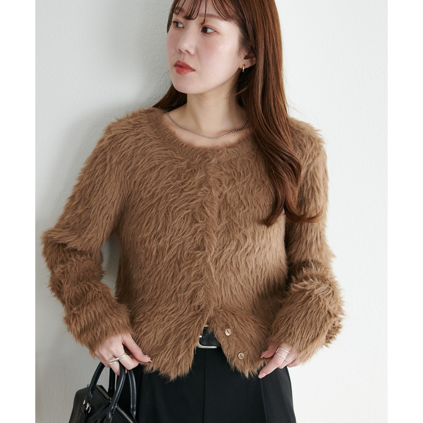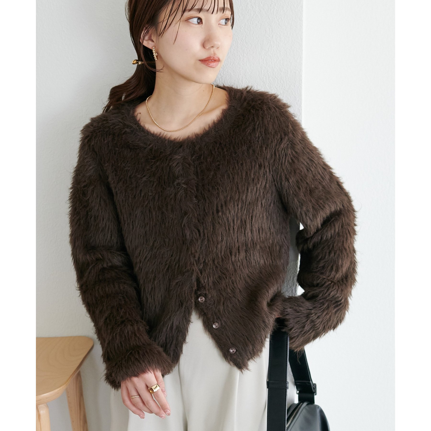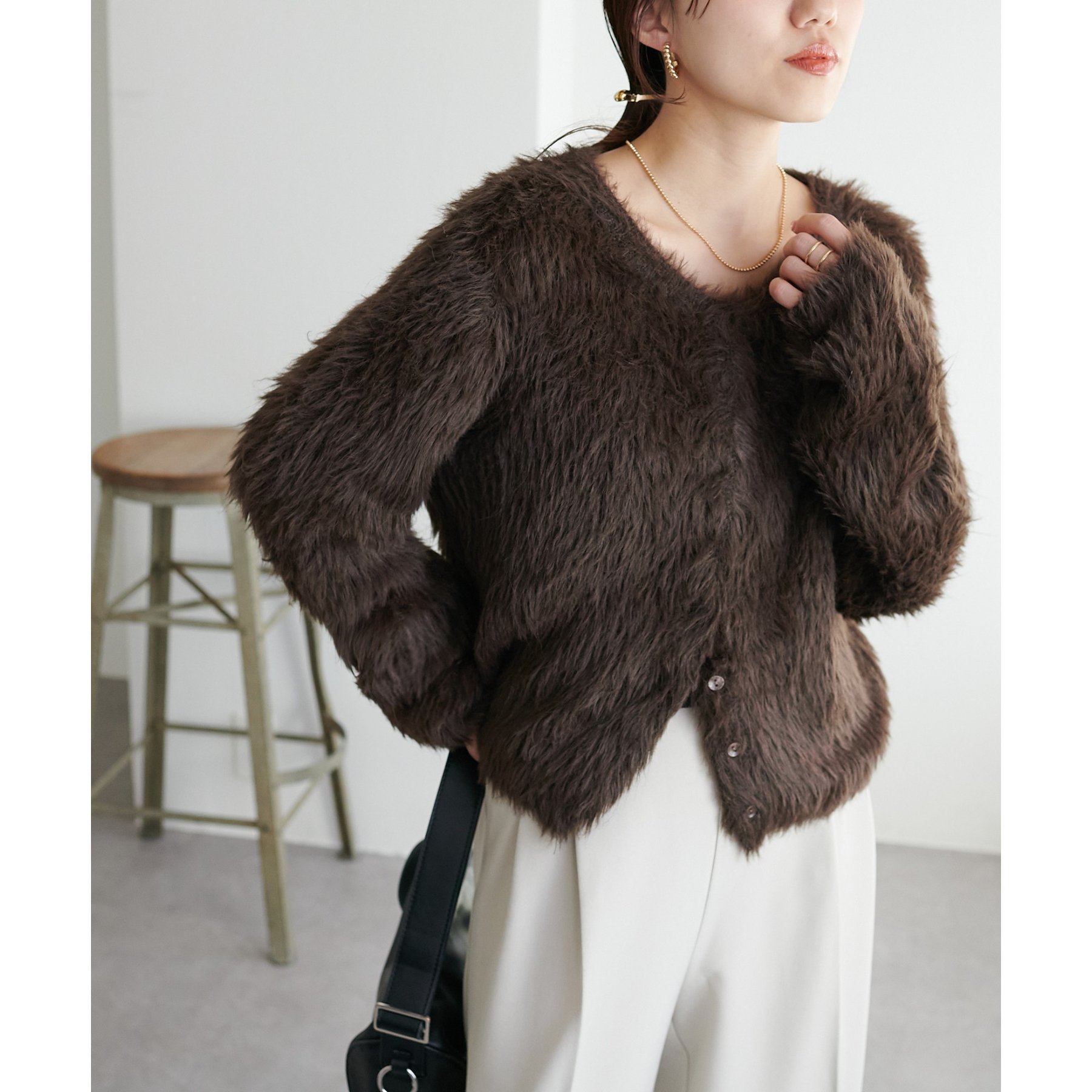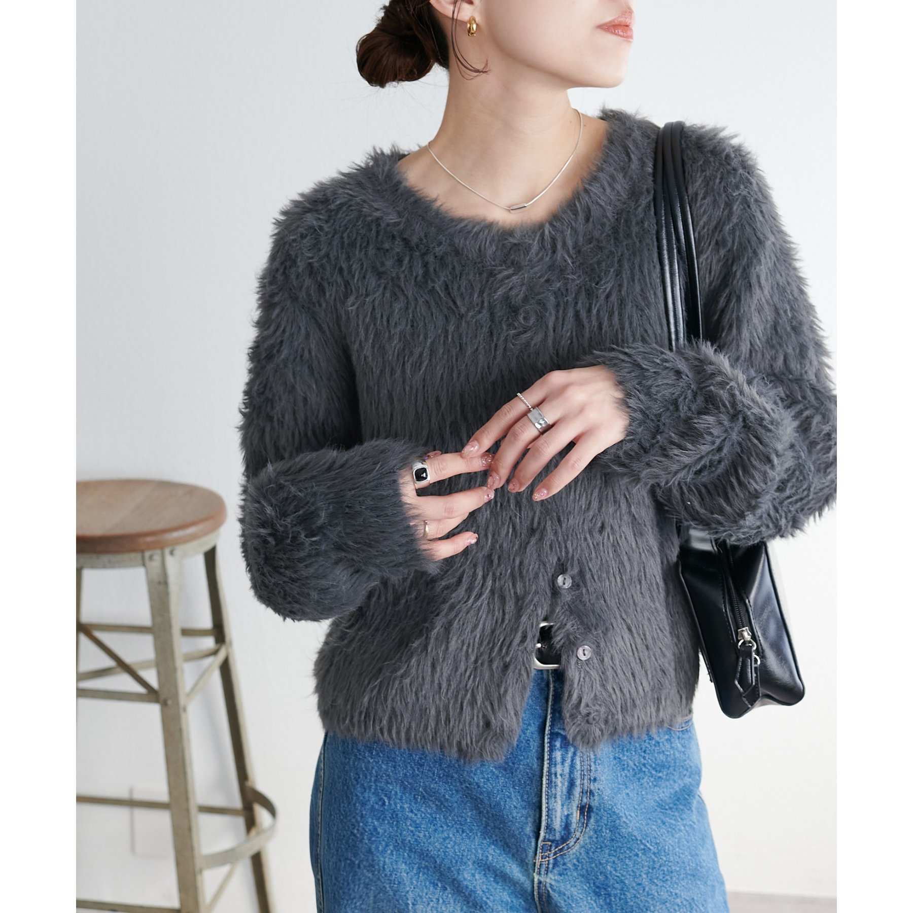 全体に毛足の長いロングフェザーヤーンを贅沢に使用した、ふんわりとした質感が魅力のカーディガン。