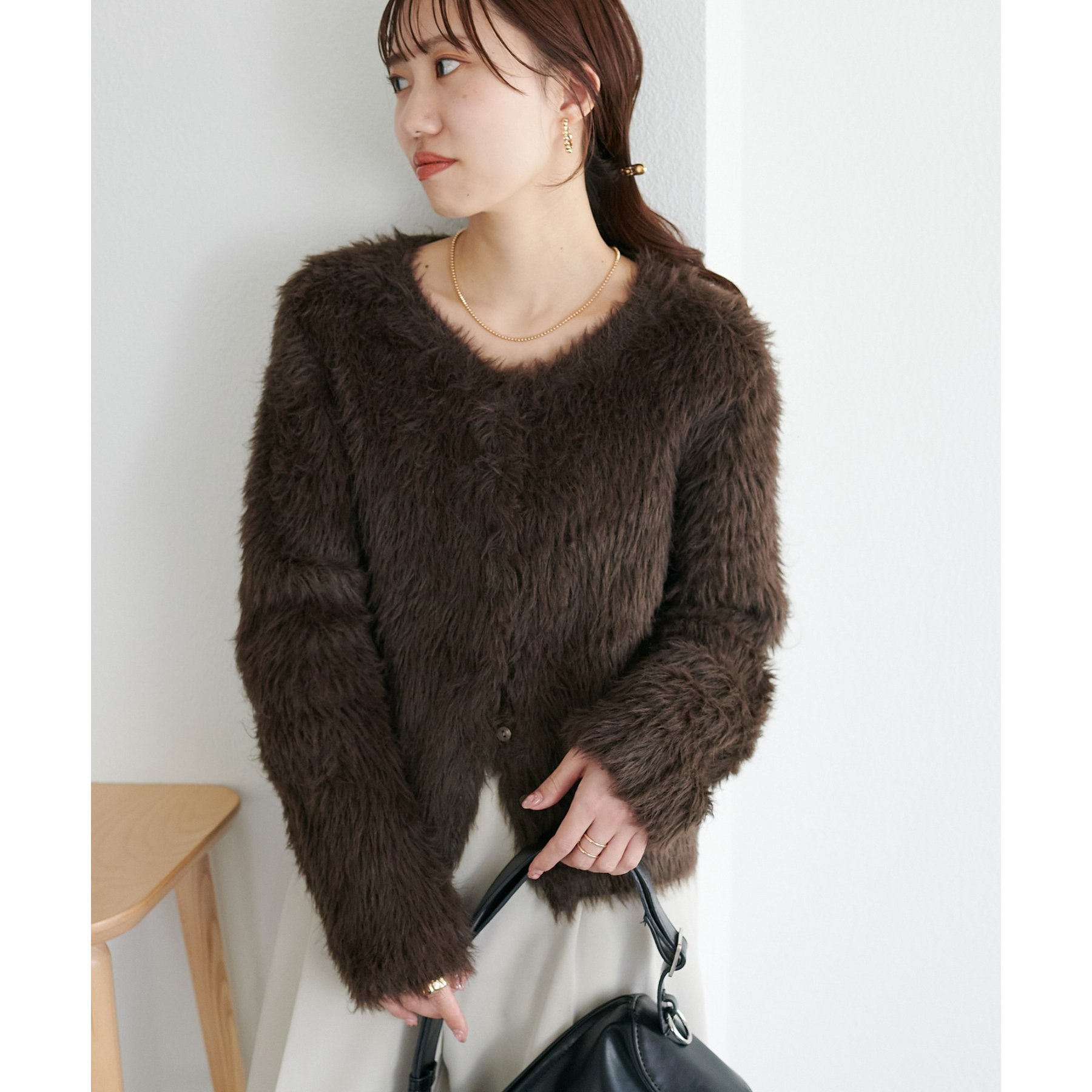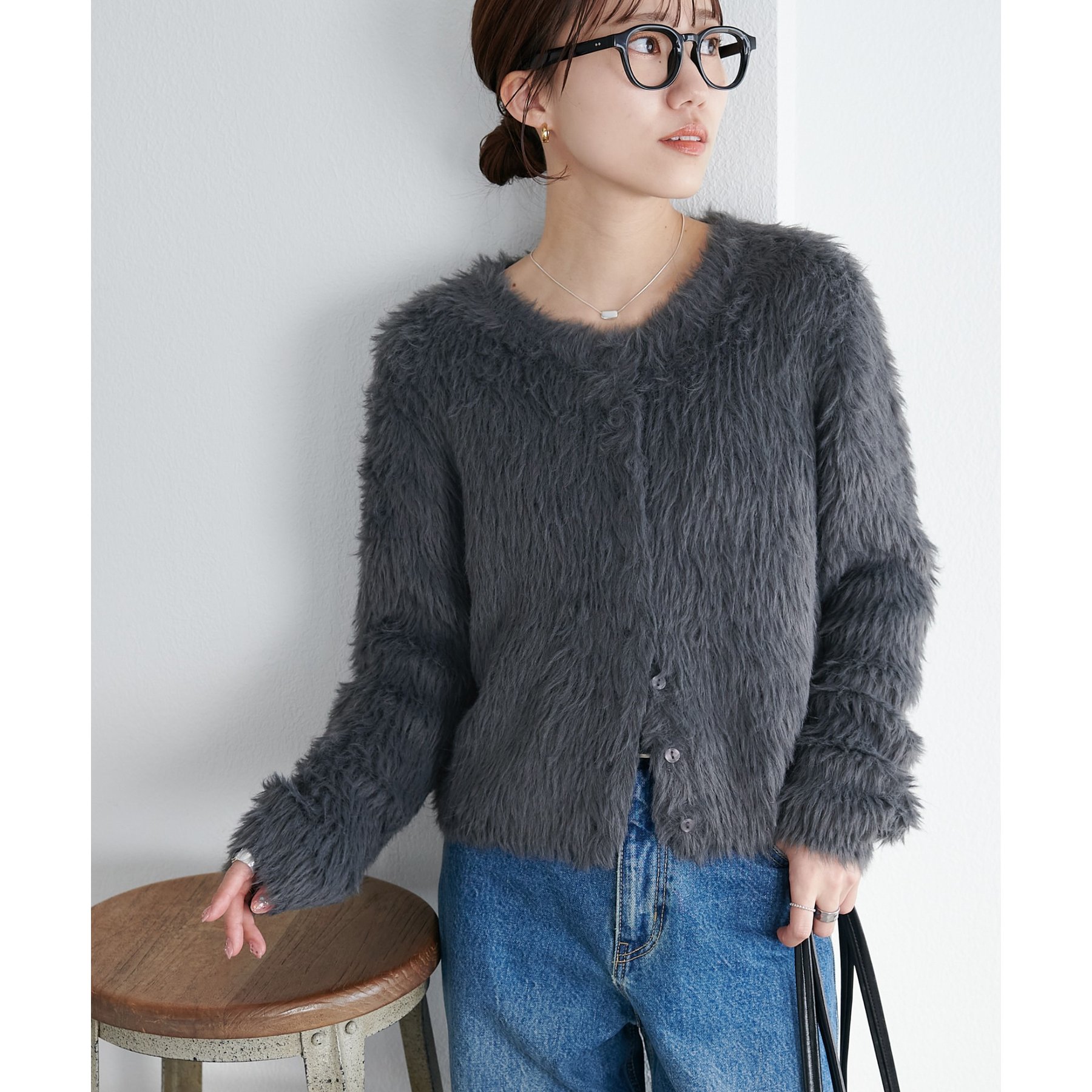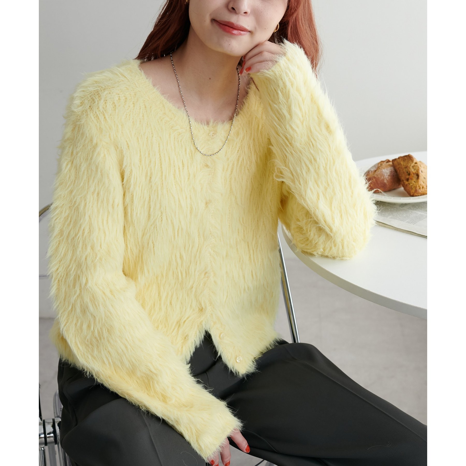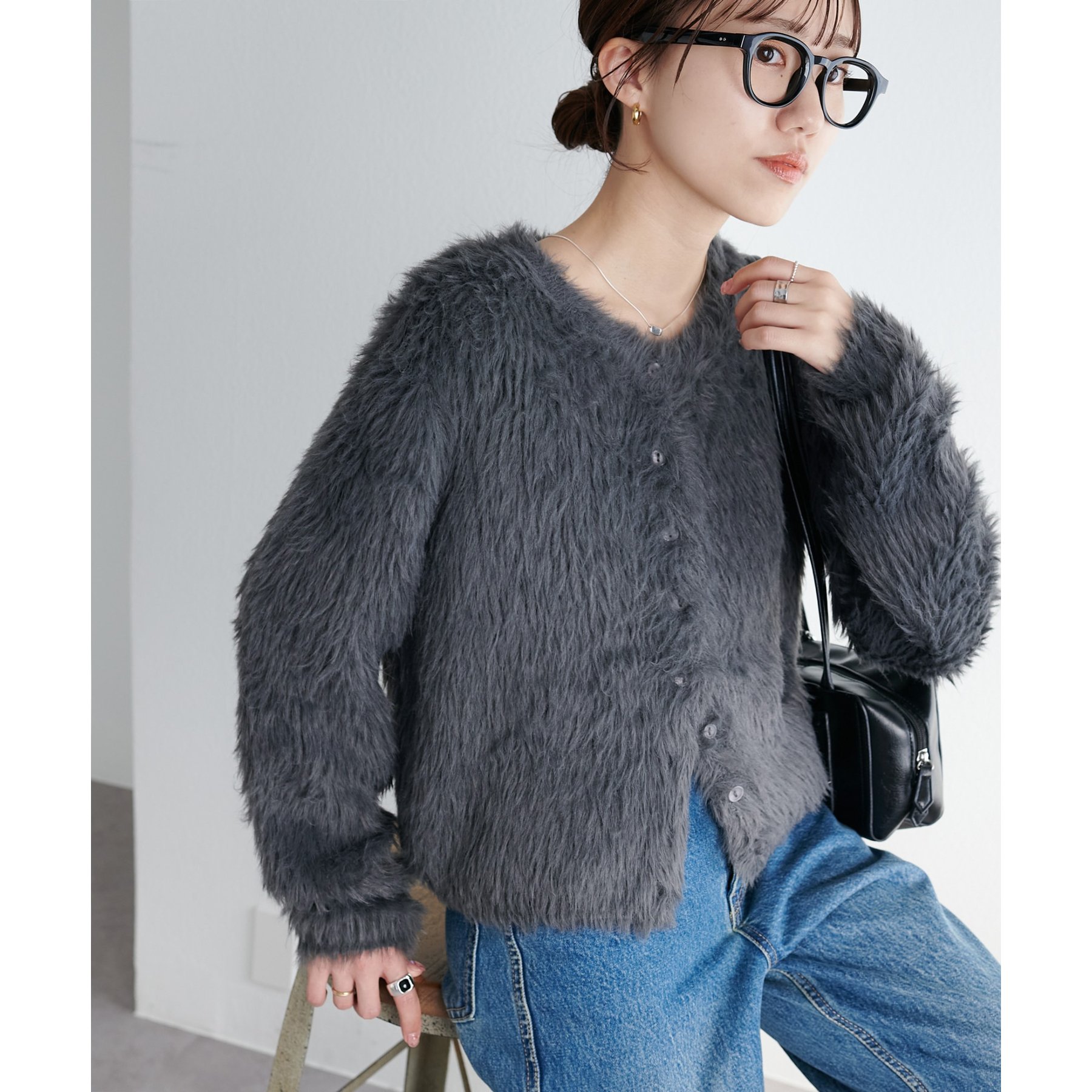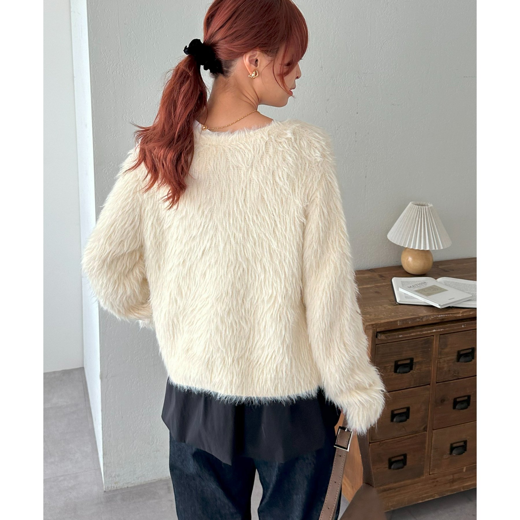 全体に毛足の長いロングフェザーヤーンを贅沢に使用した、ふんわりとした質感が魅力のカーディガン。