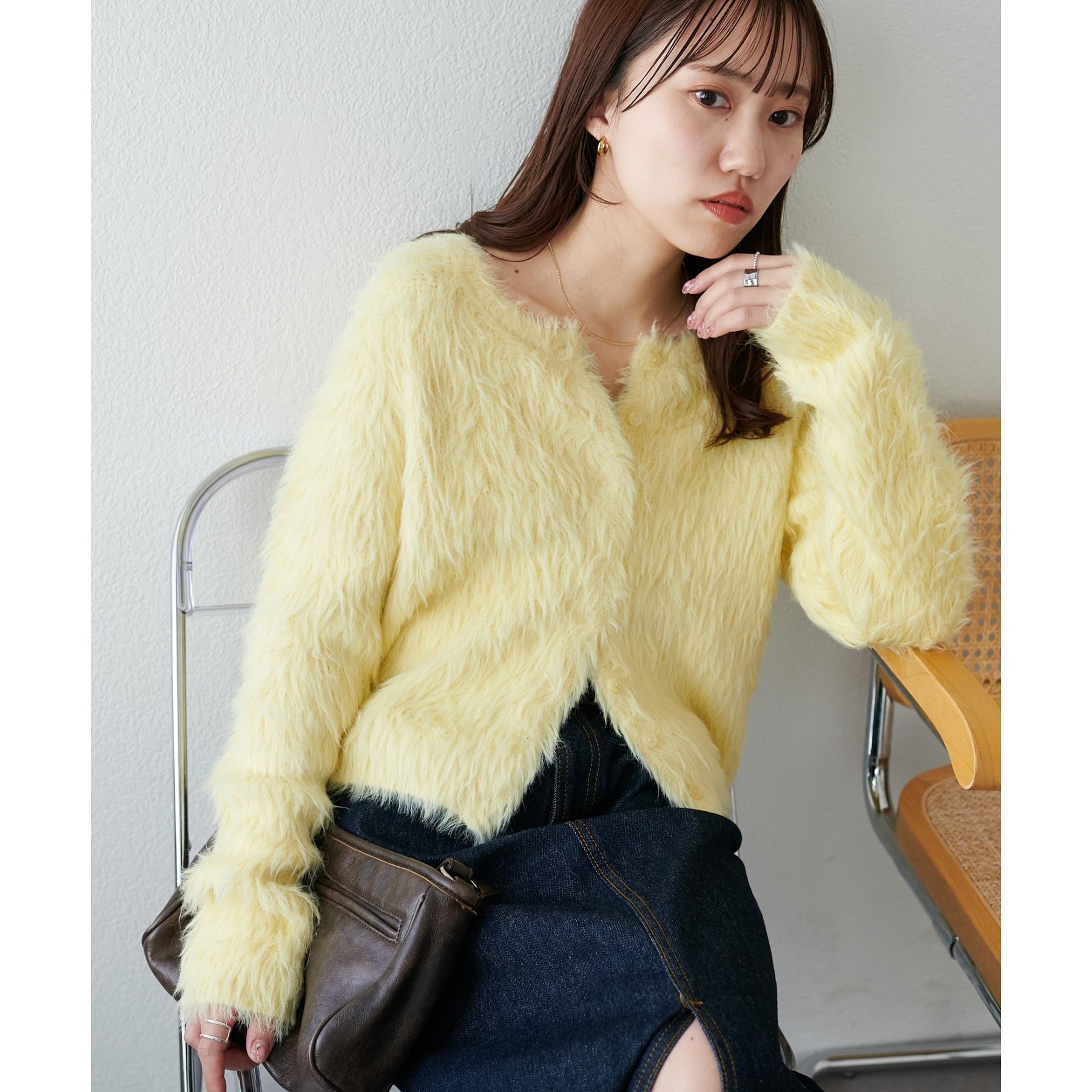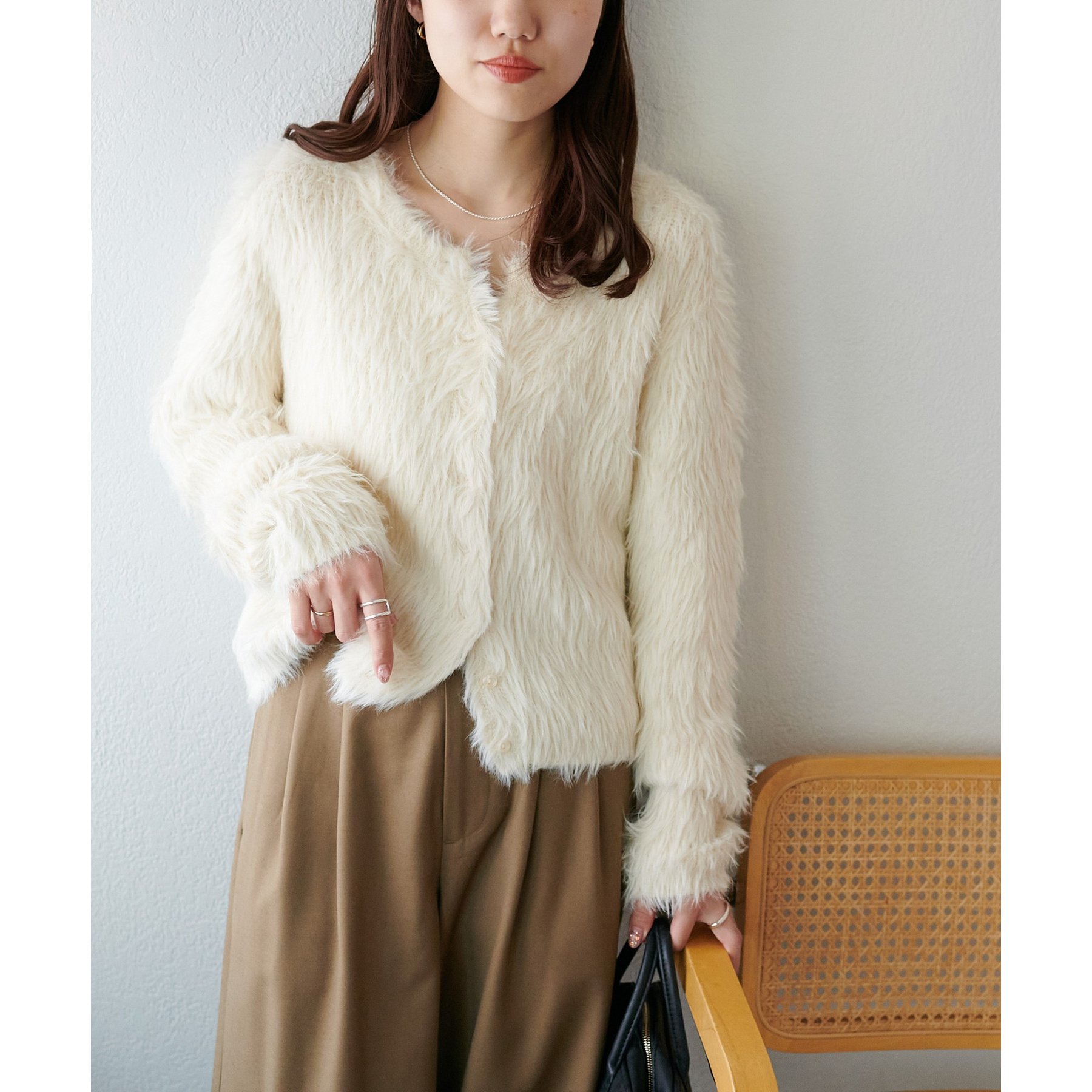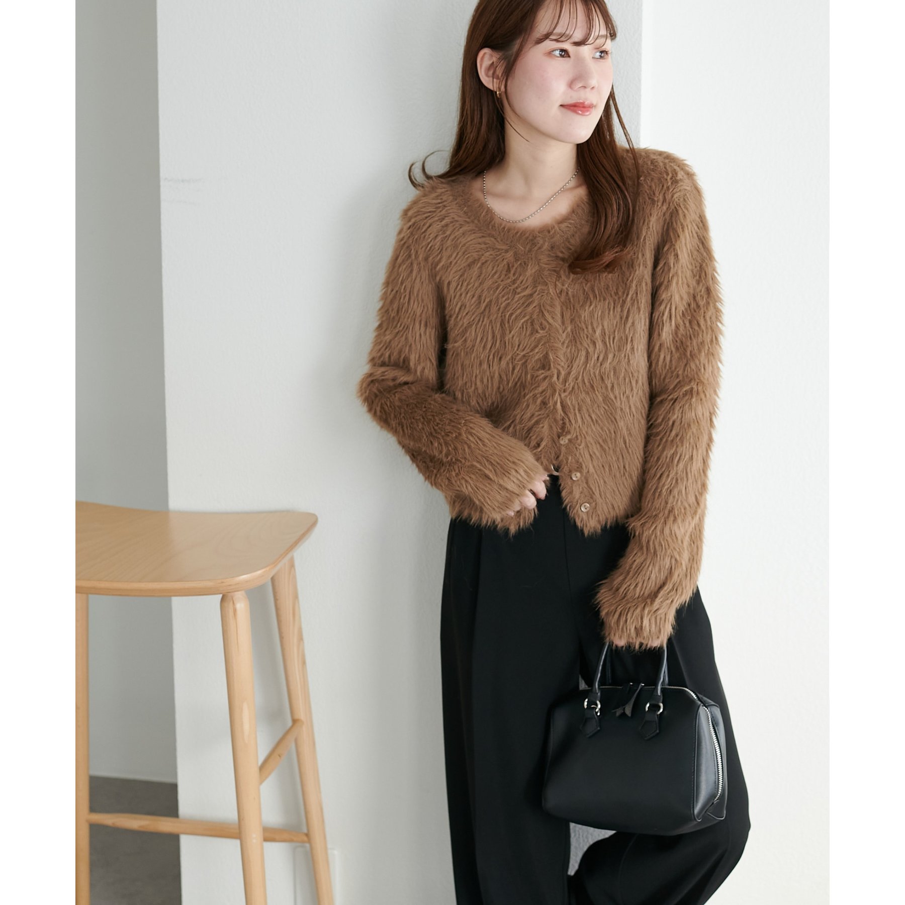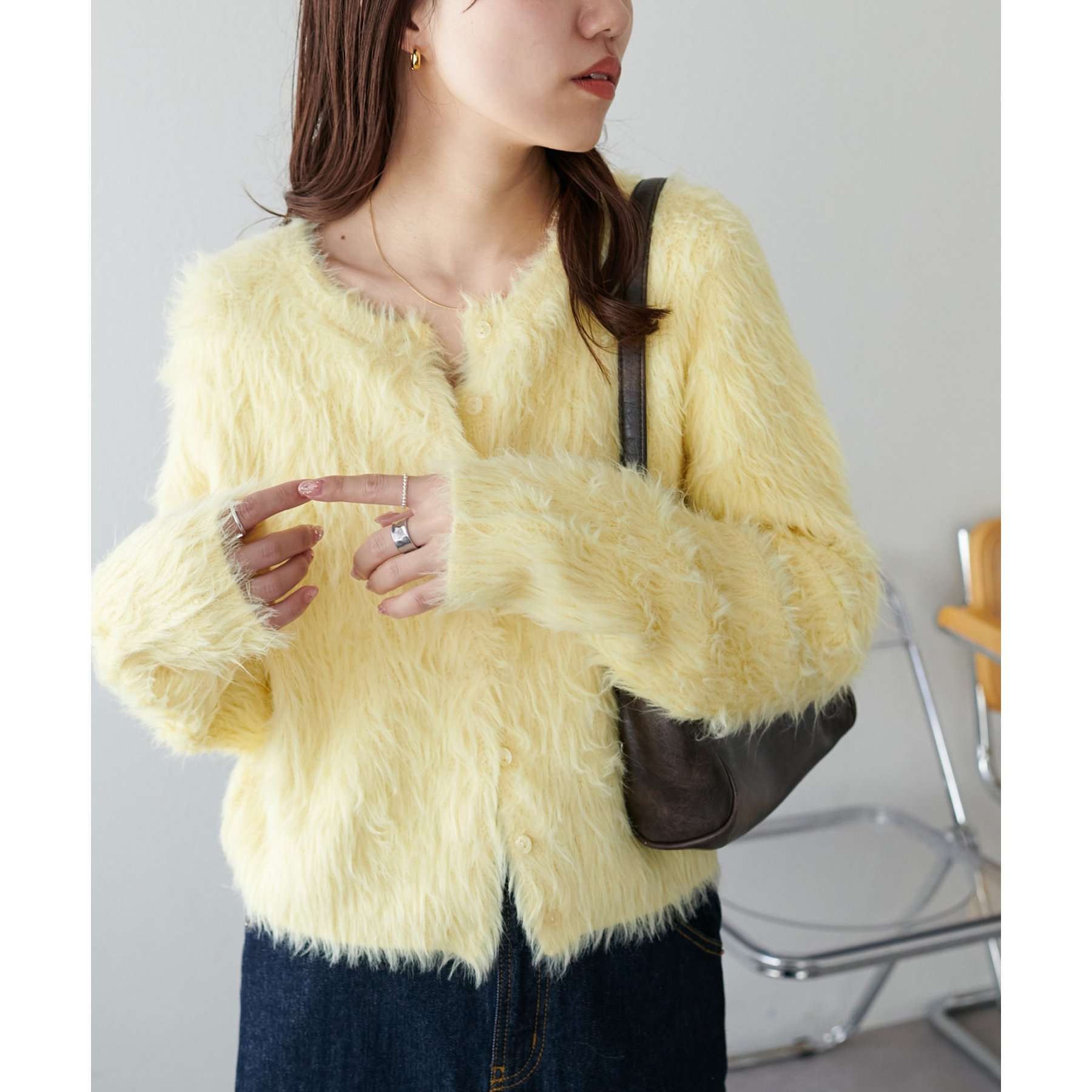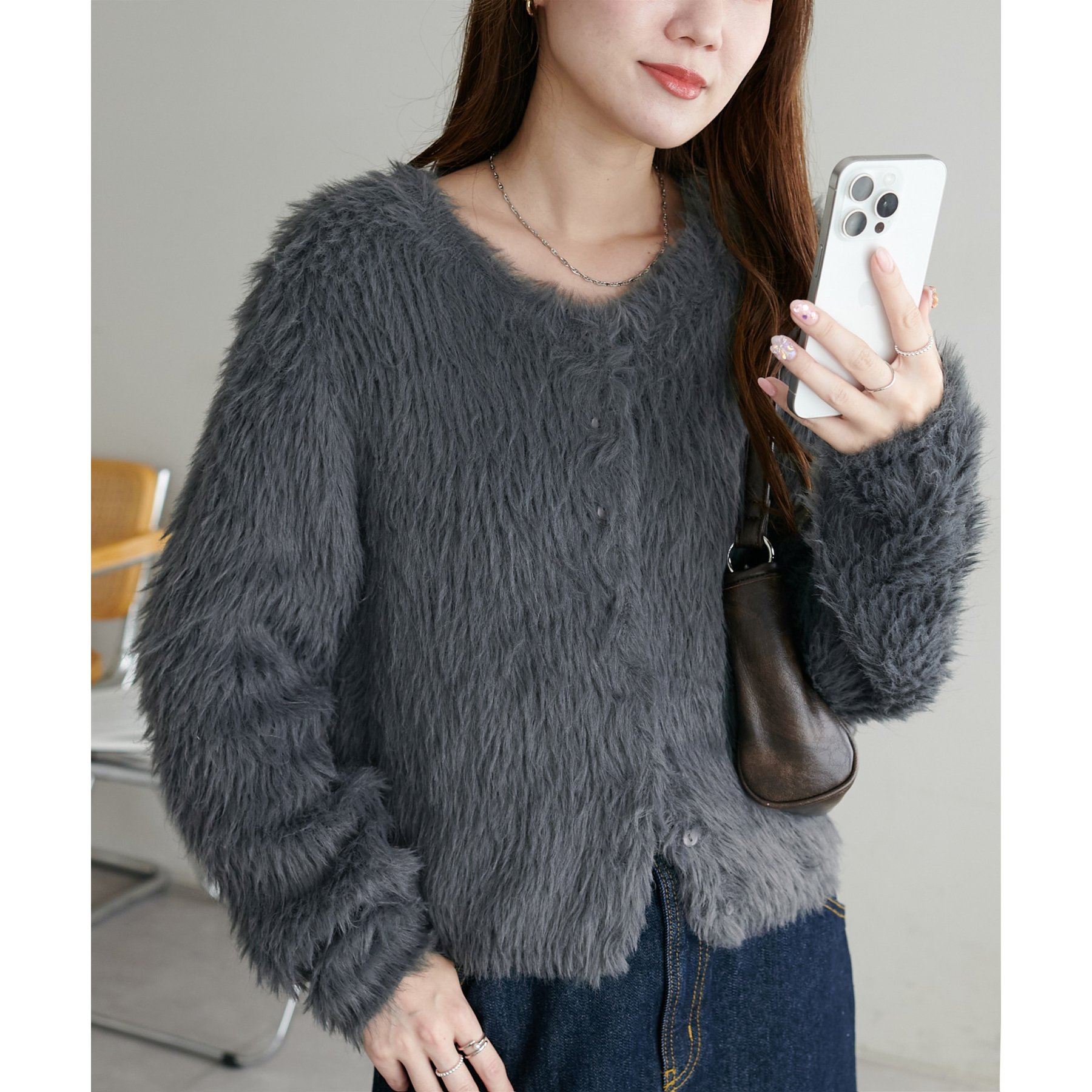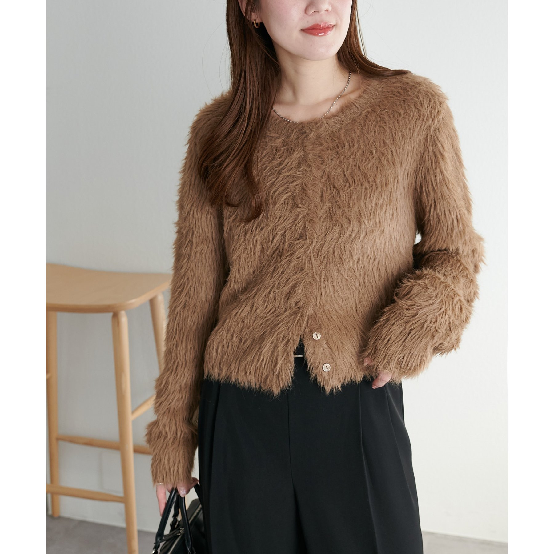 全体に毛足の長いロングフェザーヤーンを贅沢に使用した、ふんわりとした質感が魅力のカーディガン。