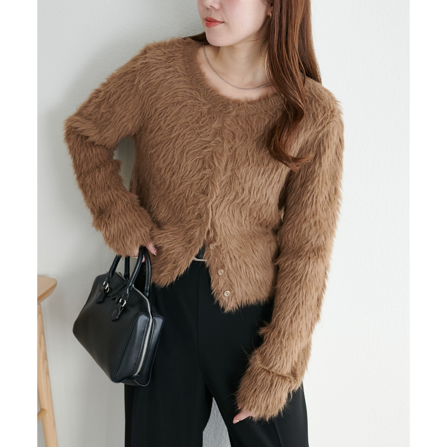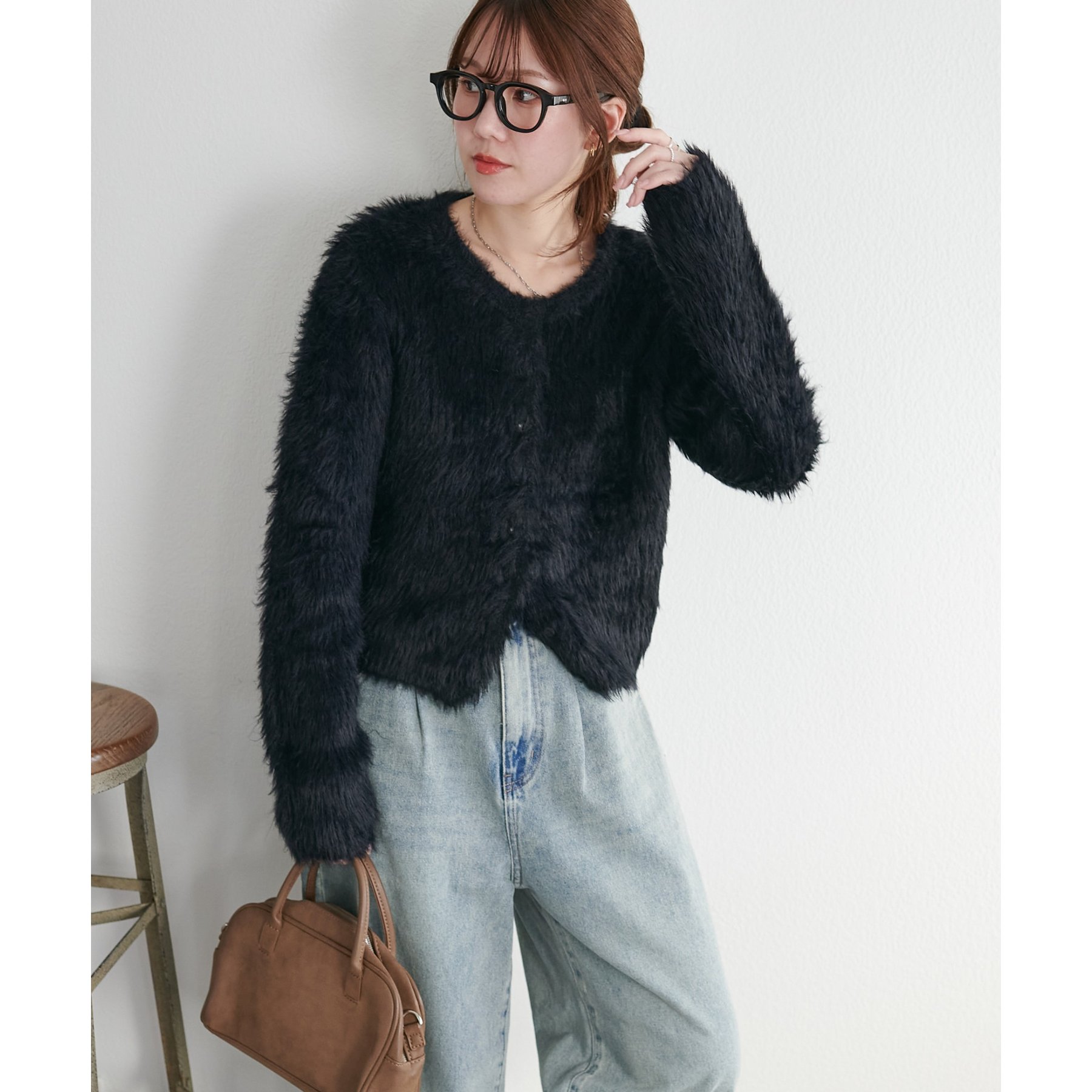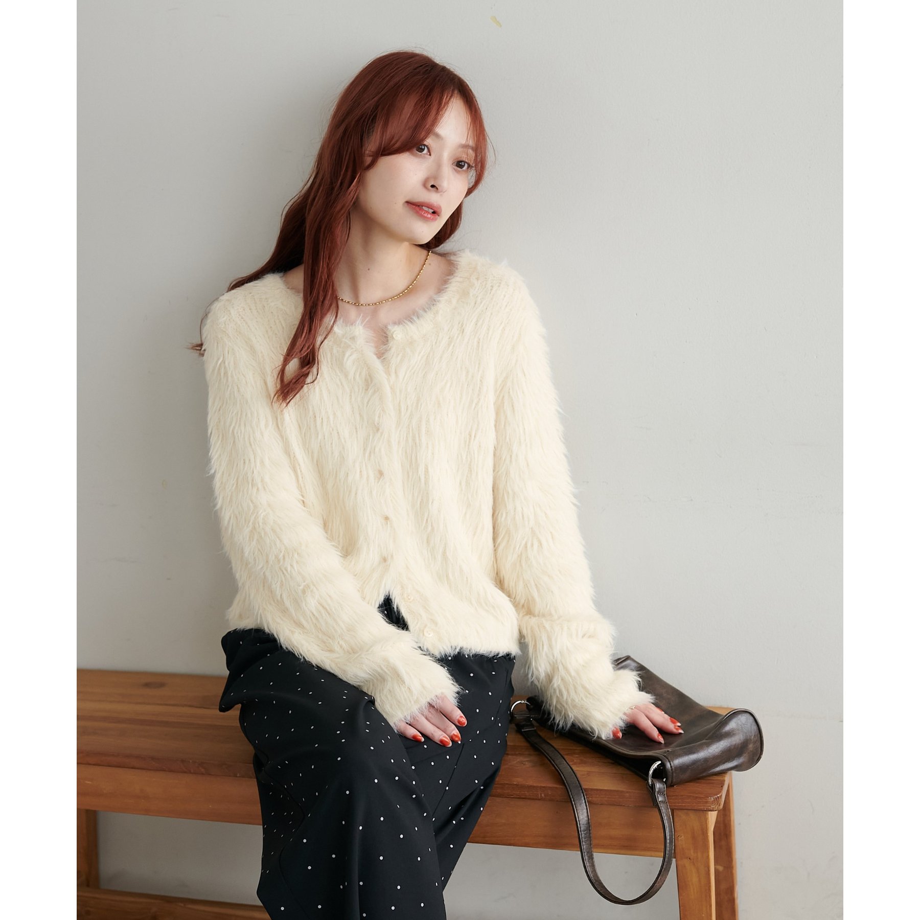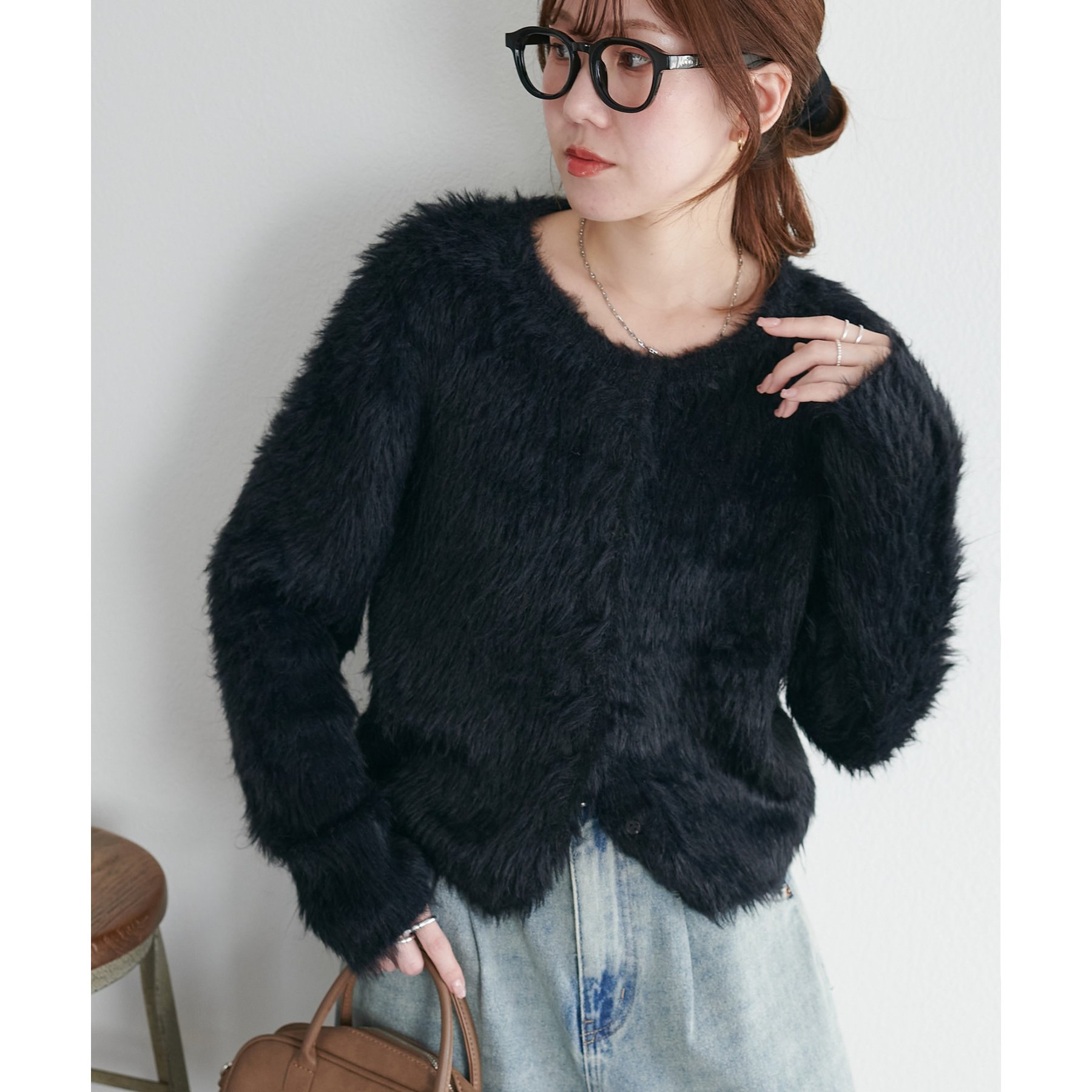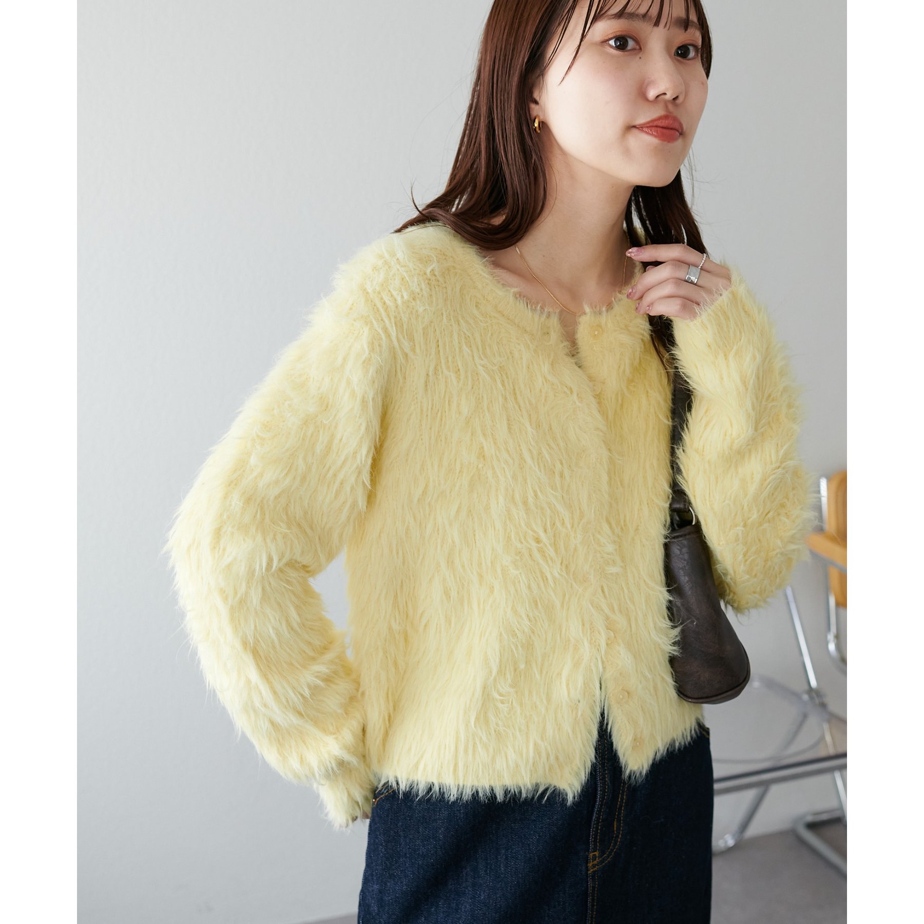 全体に毛足の長いロングフェザーヤーンを贅沢に使用した、ふんわりとした質感が魅力のカーディガン。