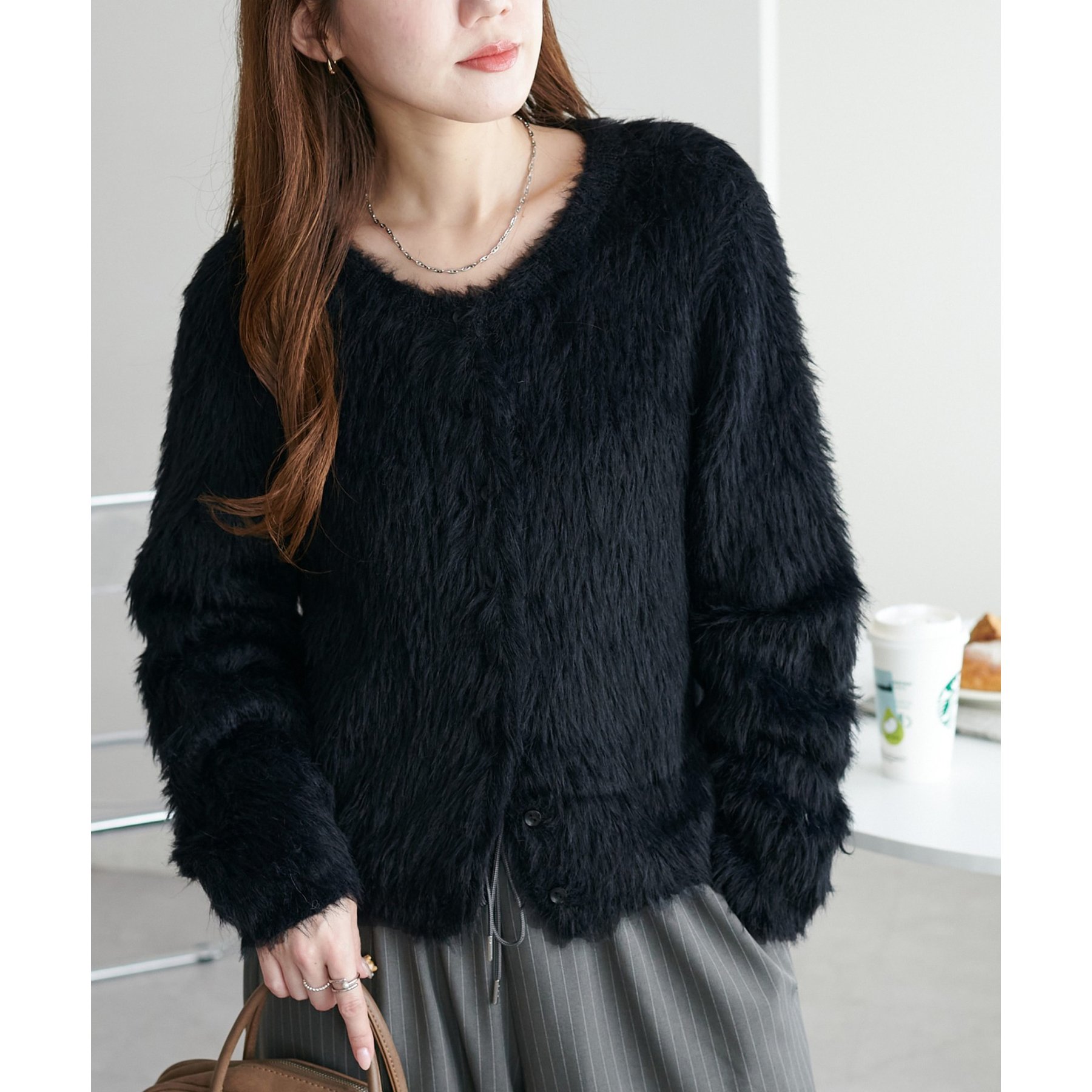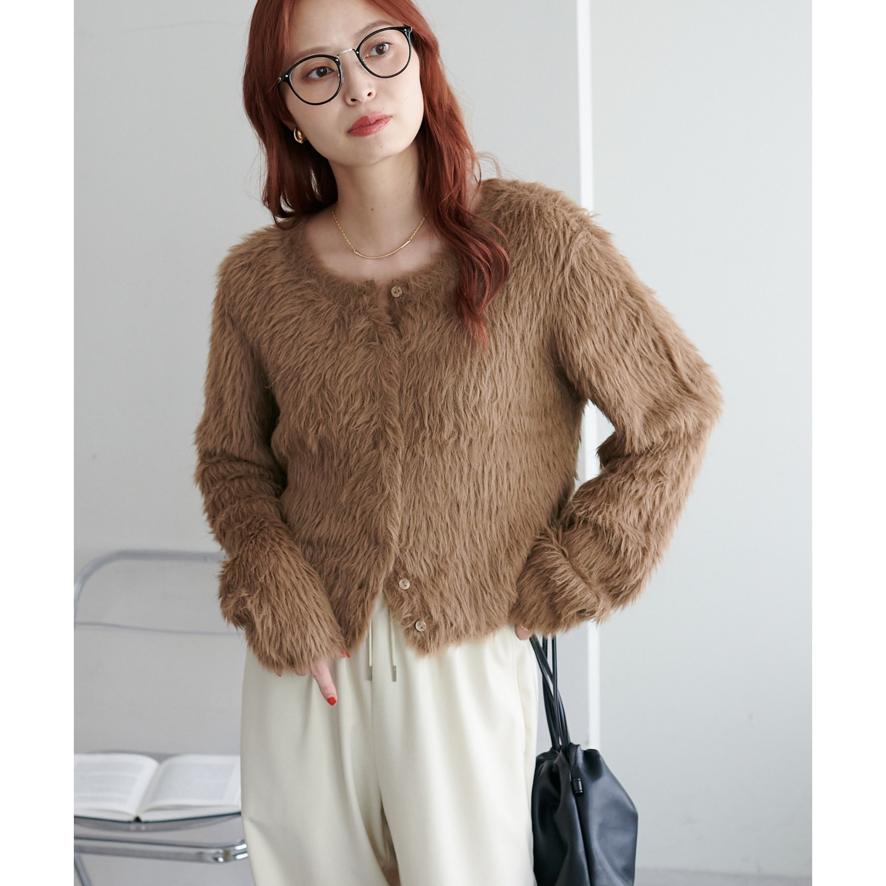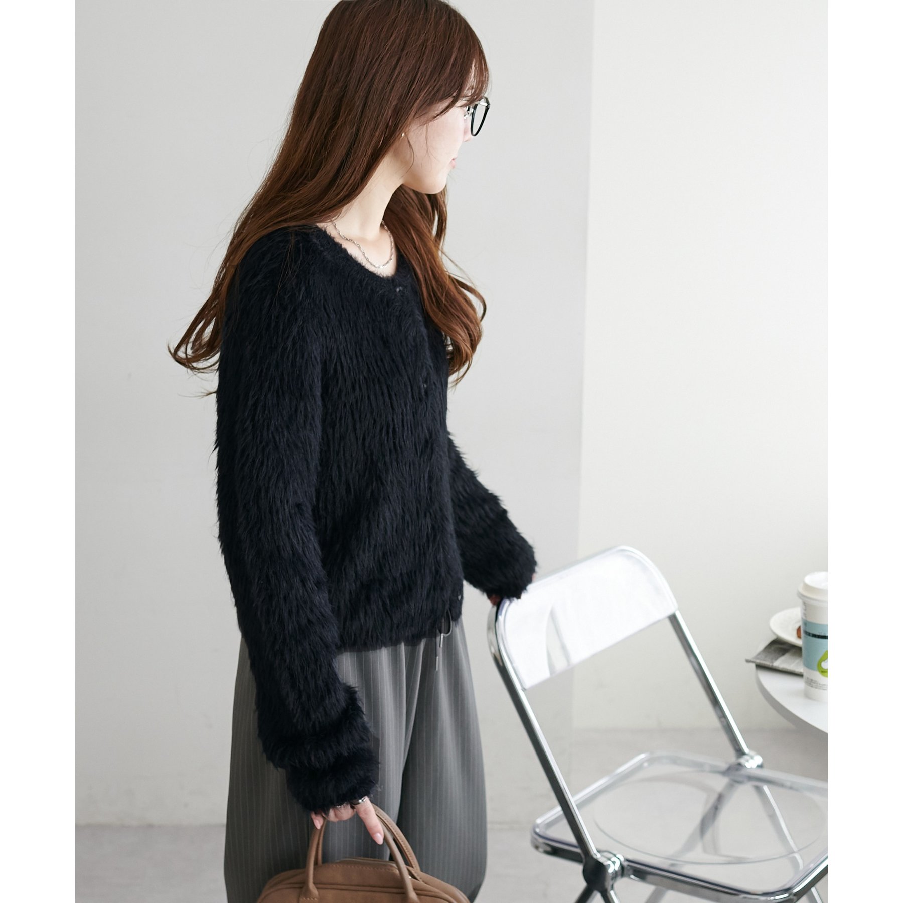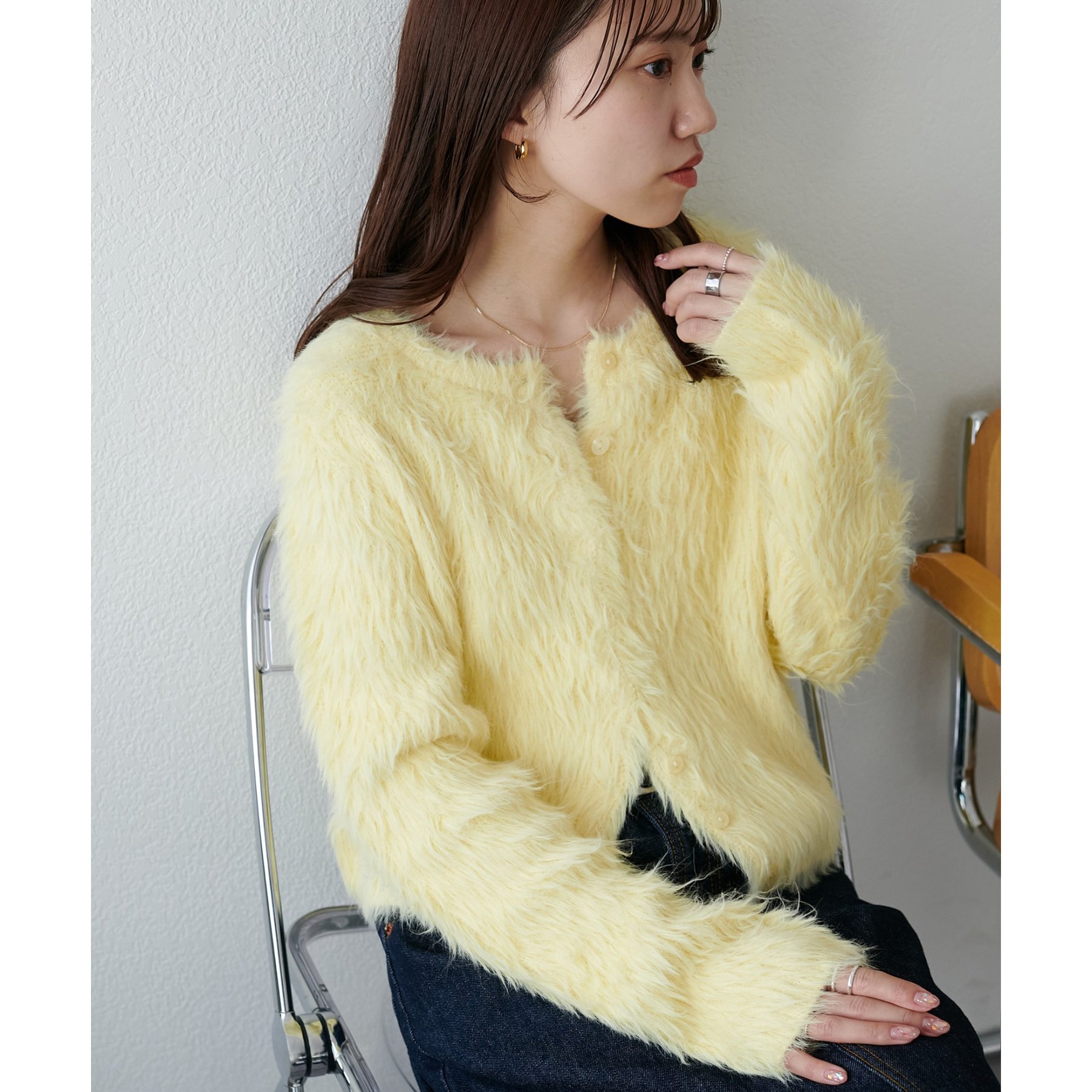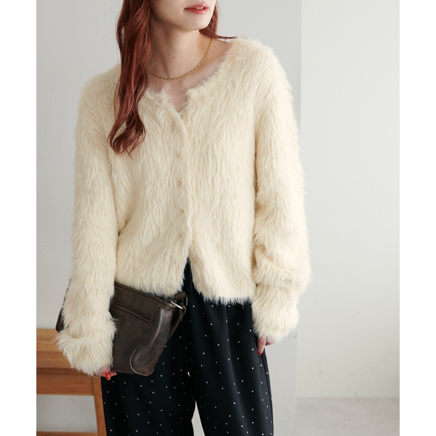 全体に毛足の長いロングフェザーヤーンを贅沢に使用した、ふんわりとした質感が魅力のカーディガン。
